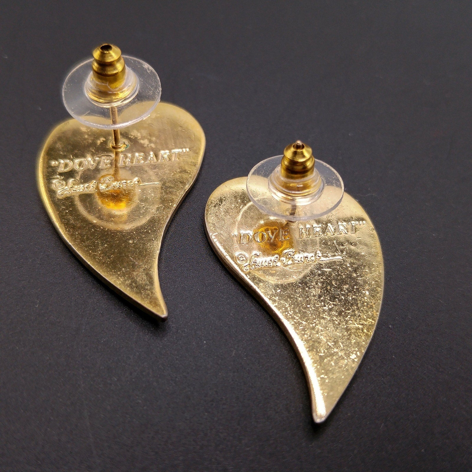 *Description: This is a great pair of Laurel Burch bird theme earrings entitled "Dove Heart" from the 1980s. The earrings are curved white enamel hearts with a dove in red, purple and blue enamel, outlined in gold plated cloisonne design. They are both stamped DOVE HEART on the back with gold filled ear posts. This would be a great addition to your vintage jewelry collection or make a great vintage gift!