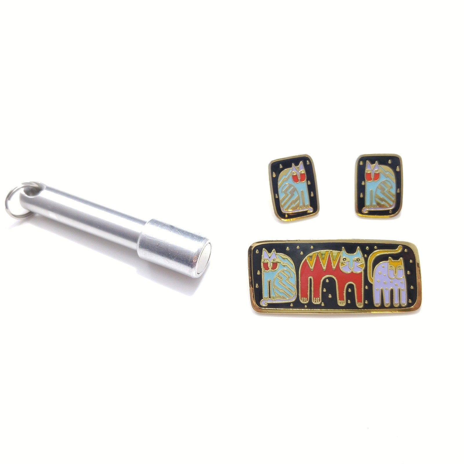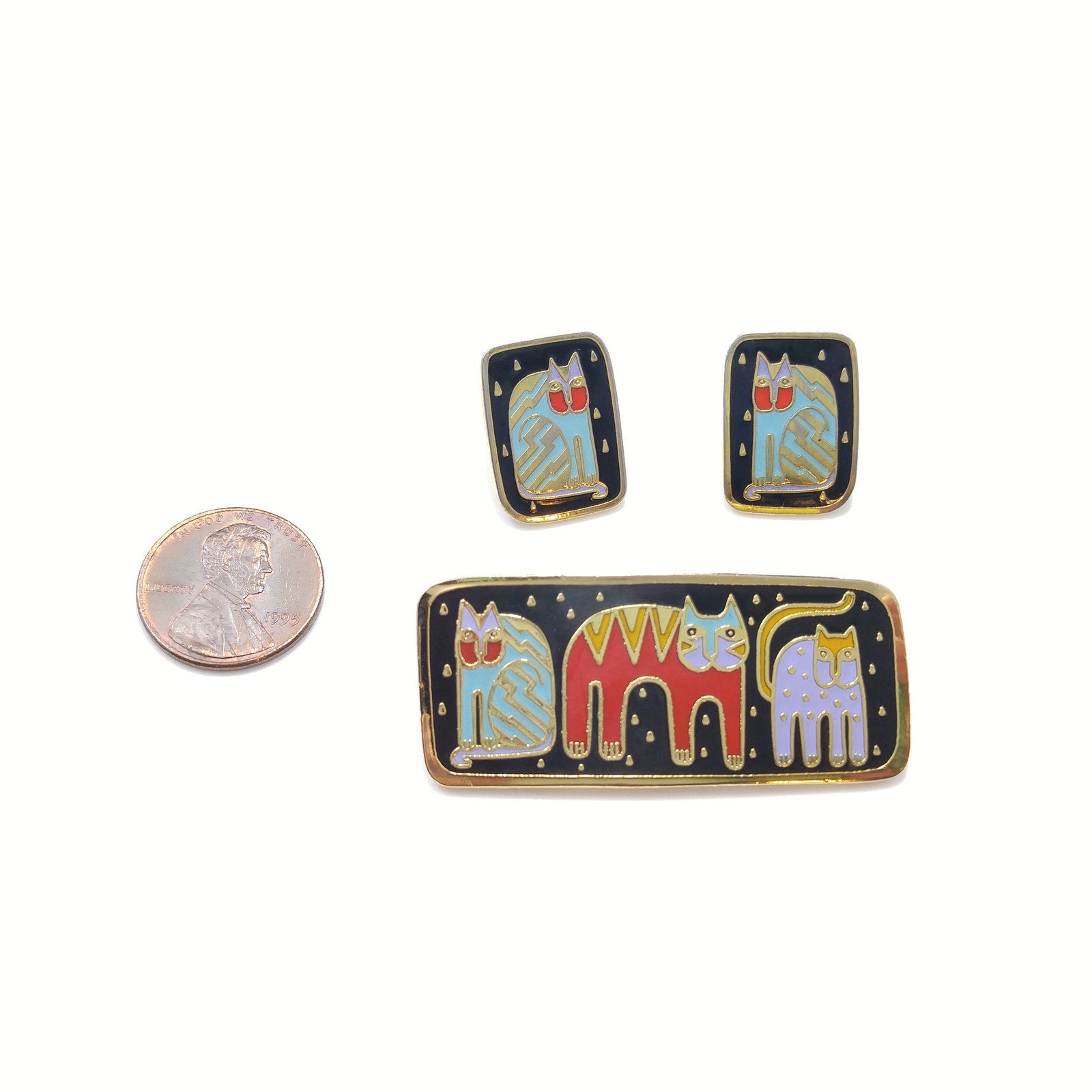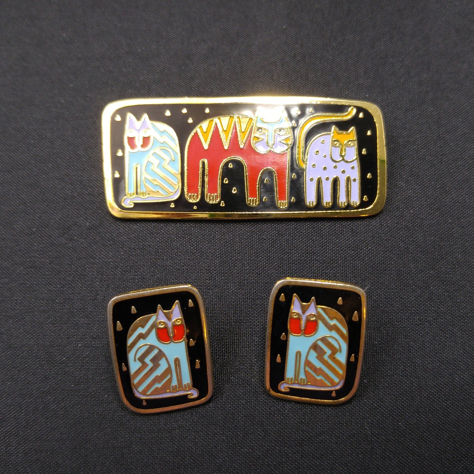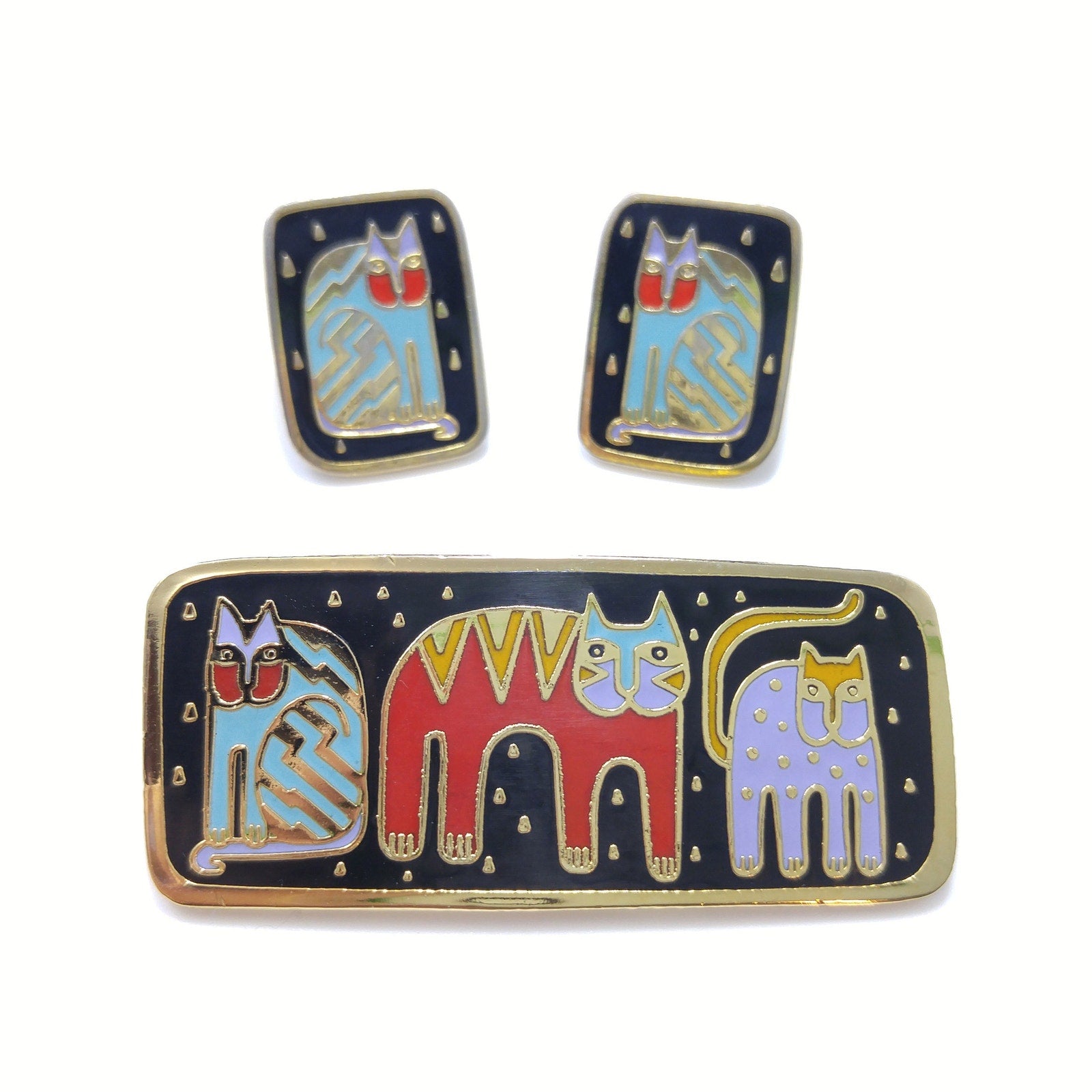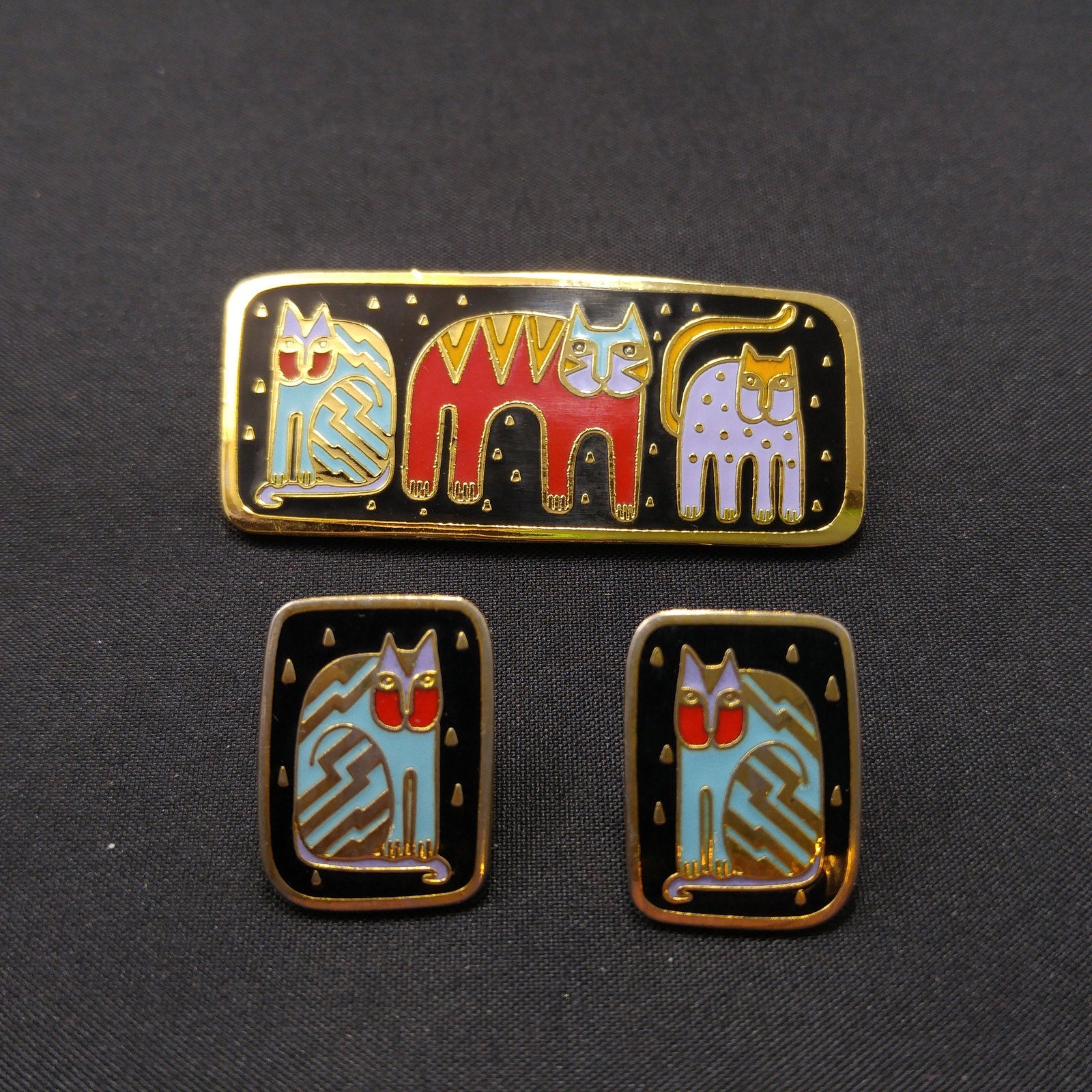 *Description: Vintage Laurel Burch Brooch Pin and Earrings entitled "Fantastic Felines". The brooch features three cats with a red cat in the center with teal and lavender cats on each side; three cats total. The matching post earrings are the teal cat with red cheeks. The earrings and brooch both have the gold dots in the background which remind me of stars. The brooch set can be use with any outfit and the brooch may be placed on a hat, scarf, or bag. The background is a black enamel with gold dots. The gold cloisonne is 10 K Gold Plate. Great vintage cat lover's brooch pin & earrings.