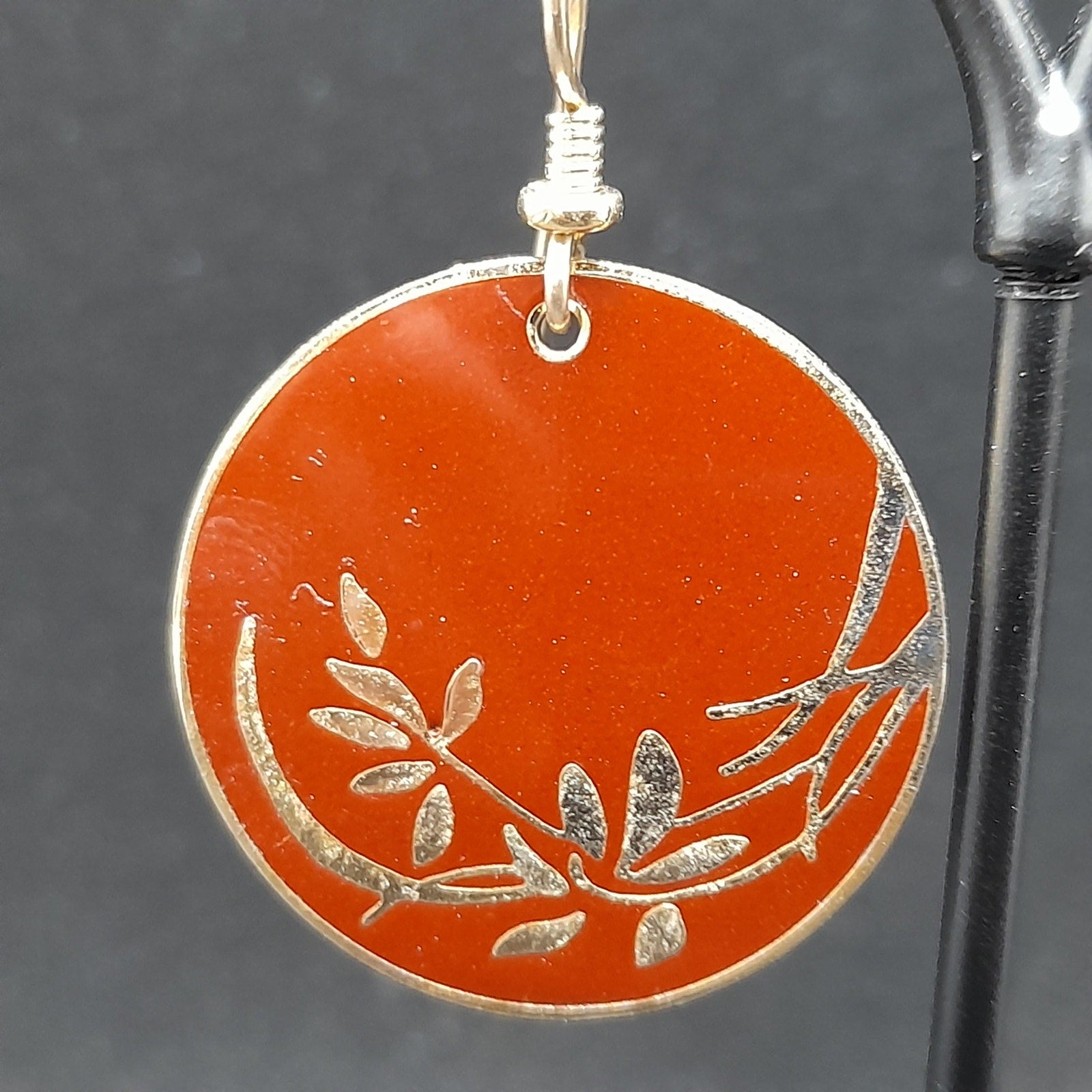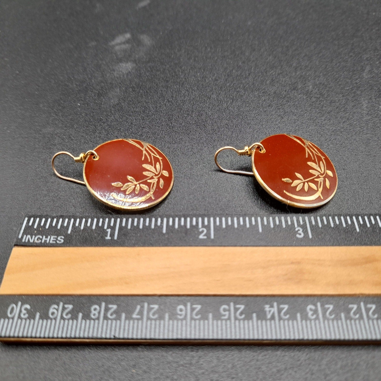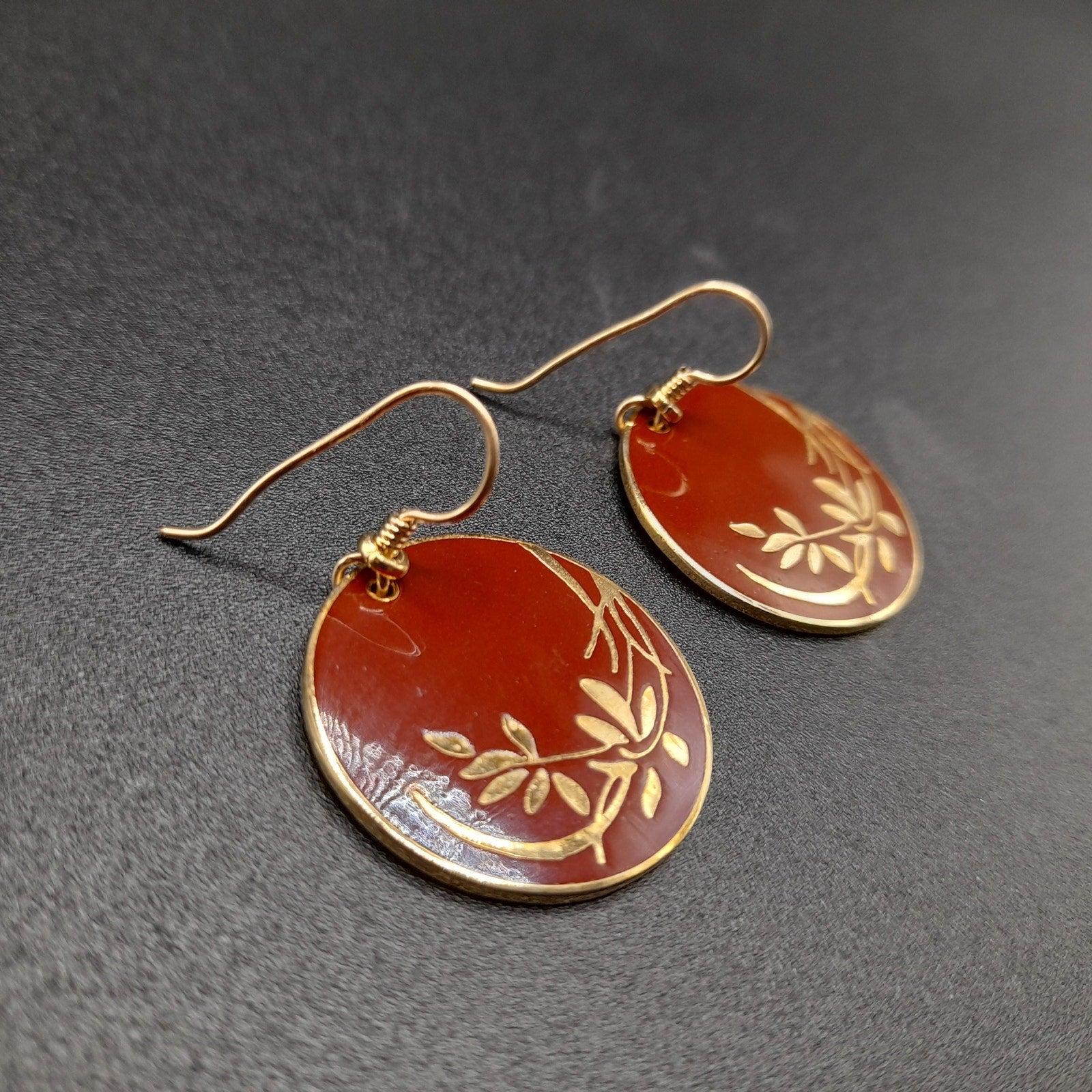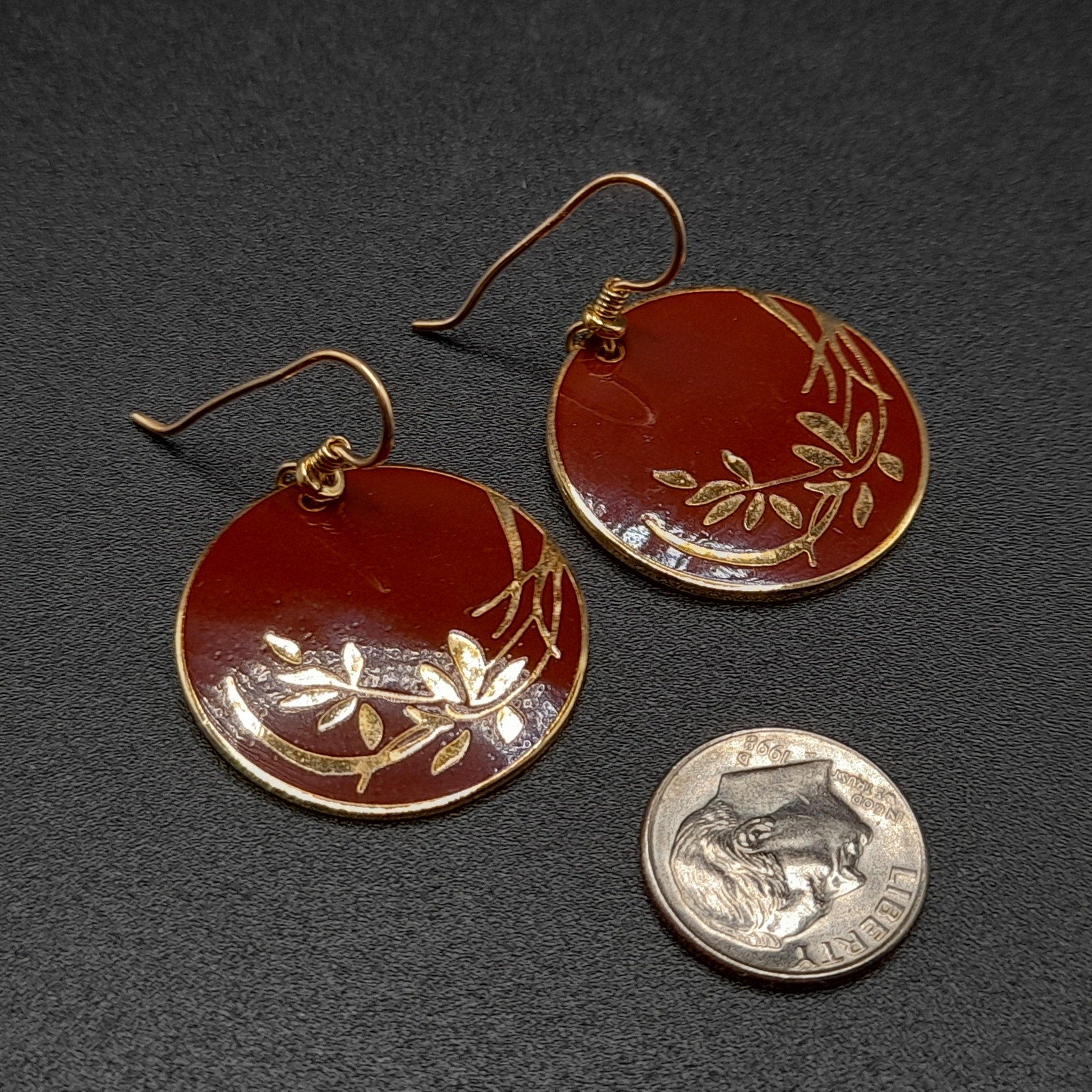 *Description: This is a beautiful pair of vintage Laurel Burch floral drop earrings in a red brown enamel on a gold plated cloisonne background and outlines from the 1980s. The lighting makes the red look lighter but the two photos near the end particularly with the dime or more reminiscent of the correct color in natural light. The ear wires are slightly misshapen but when worn, not noticeable. This design in this color are pretty rare. They usually can be found on black enamel. This would be a great addition to your vintage jewelry collection or make a great vintage gift!