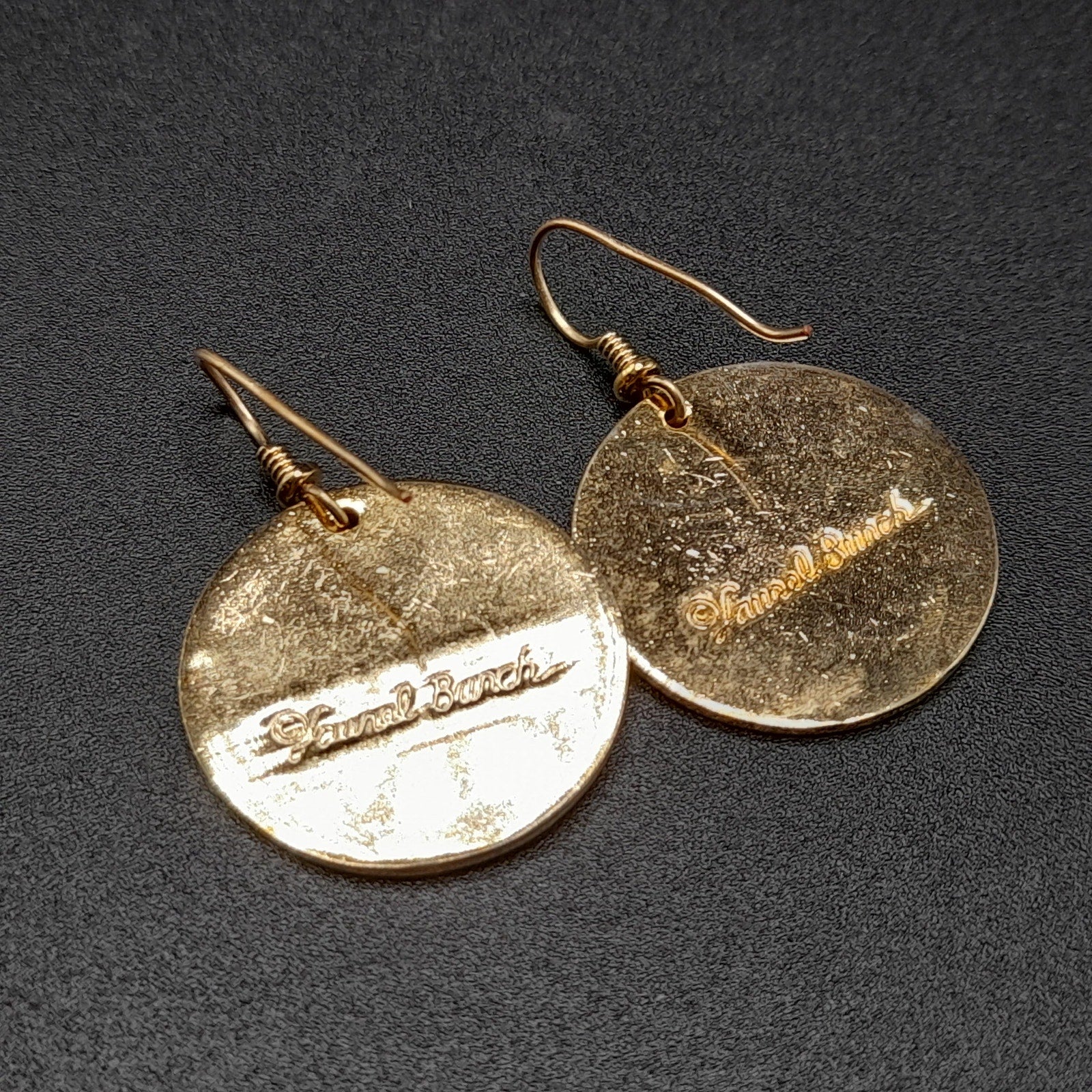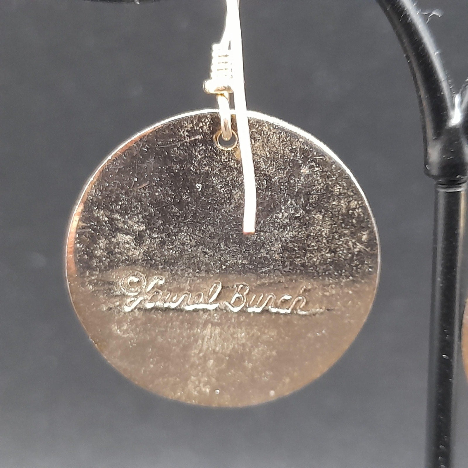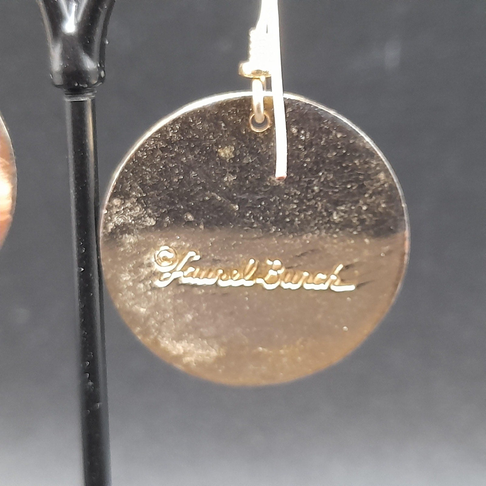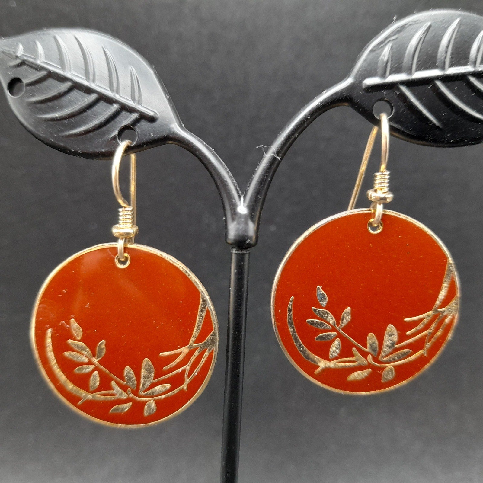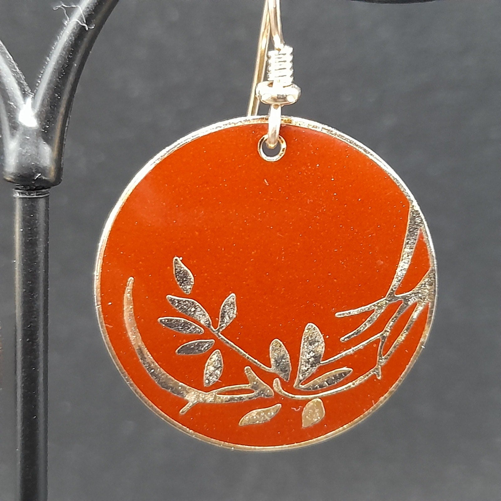 *Description: This is a beautiful pair of vintage Laurel Burch floral drop earrings in a red brown enamel on a gold plated cloisonne background and outlines from the 1980s. The lighting makes the red look lighter but the two photos near the end particularly with the dime or more reminiscent of the correct color in natural light. The ear wires are slightly misshapen but when worn, not noticeable. This design in this color are pretty rare. They usually can be found on black enamel. This would be a great addition to your vintage jewelry collection or make a great vintage gift!