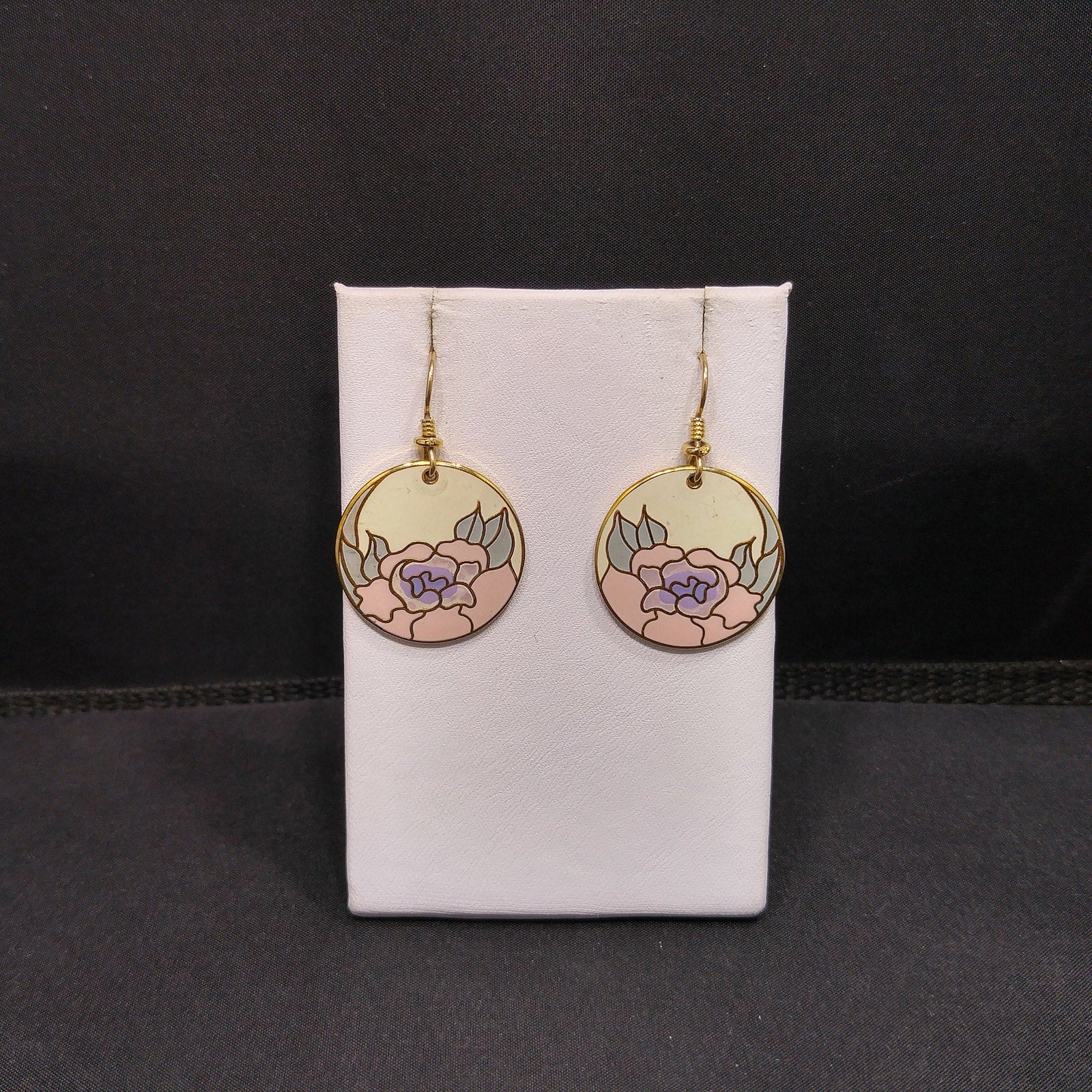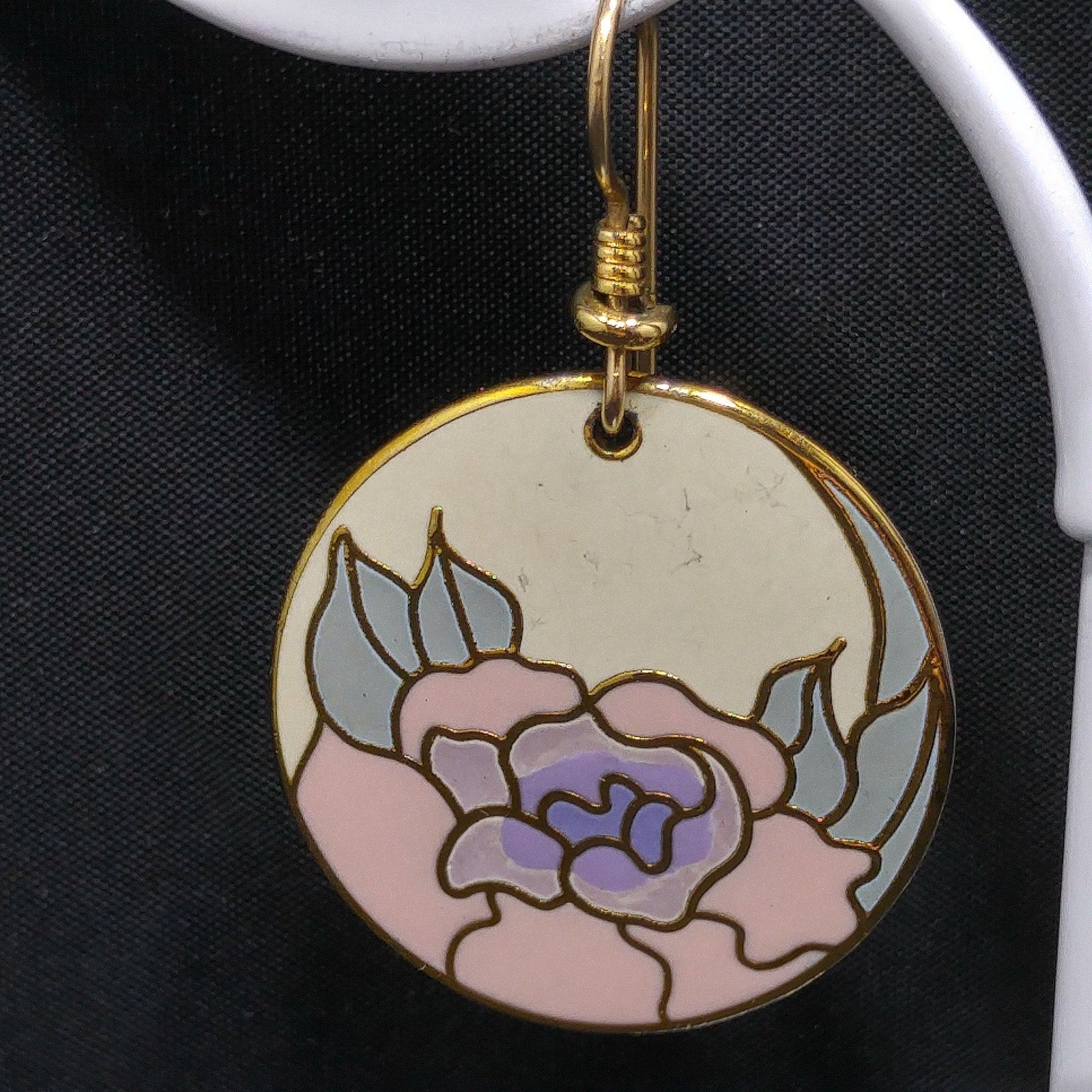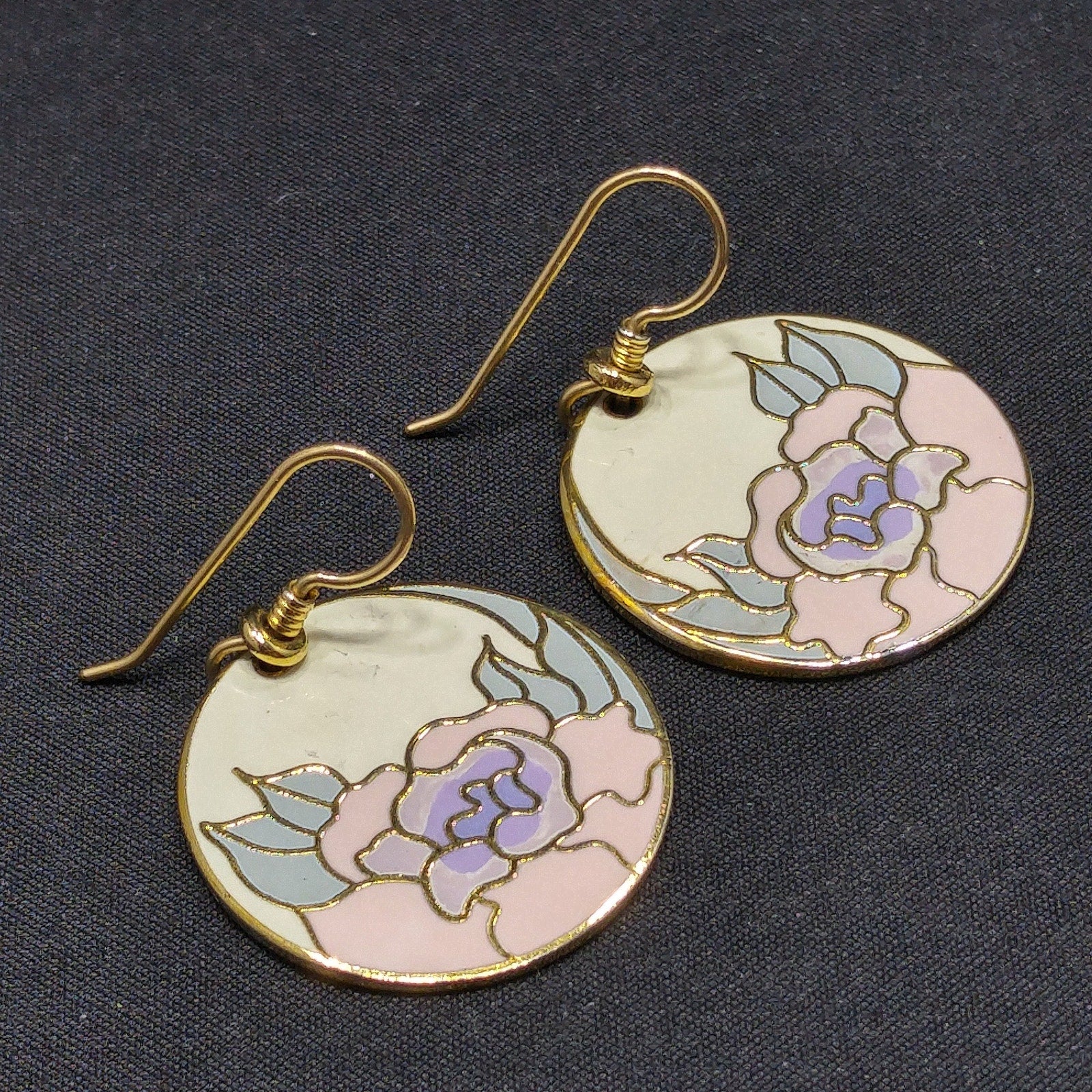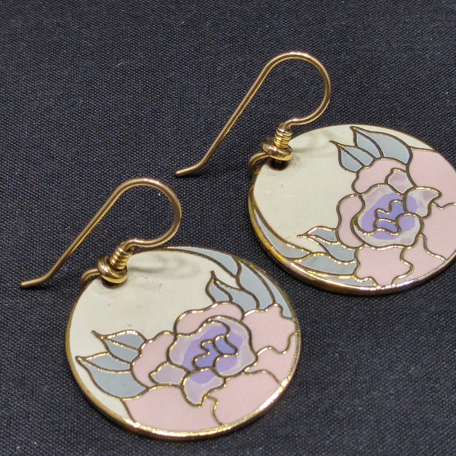 *Description: This is a great pair of vintage Laurel Burch GARDEN ROSE Cloisonné Earrings, circular design, gold plated back and rim with gold filled ear wires from the 1980s. This vintage jewelry is signed by Laurel Burch on the back, along with the design name Garden Rose. The design inside the gold rim is an off white enamel background, pink flower petals, lavender inside petals with mint green leaves. One of my favorite floral pair of Laurel Burch earrings. Beautiful!