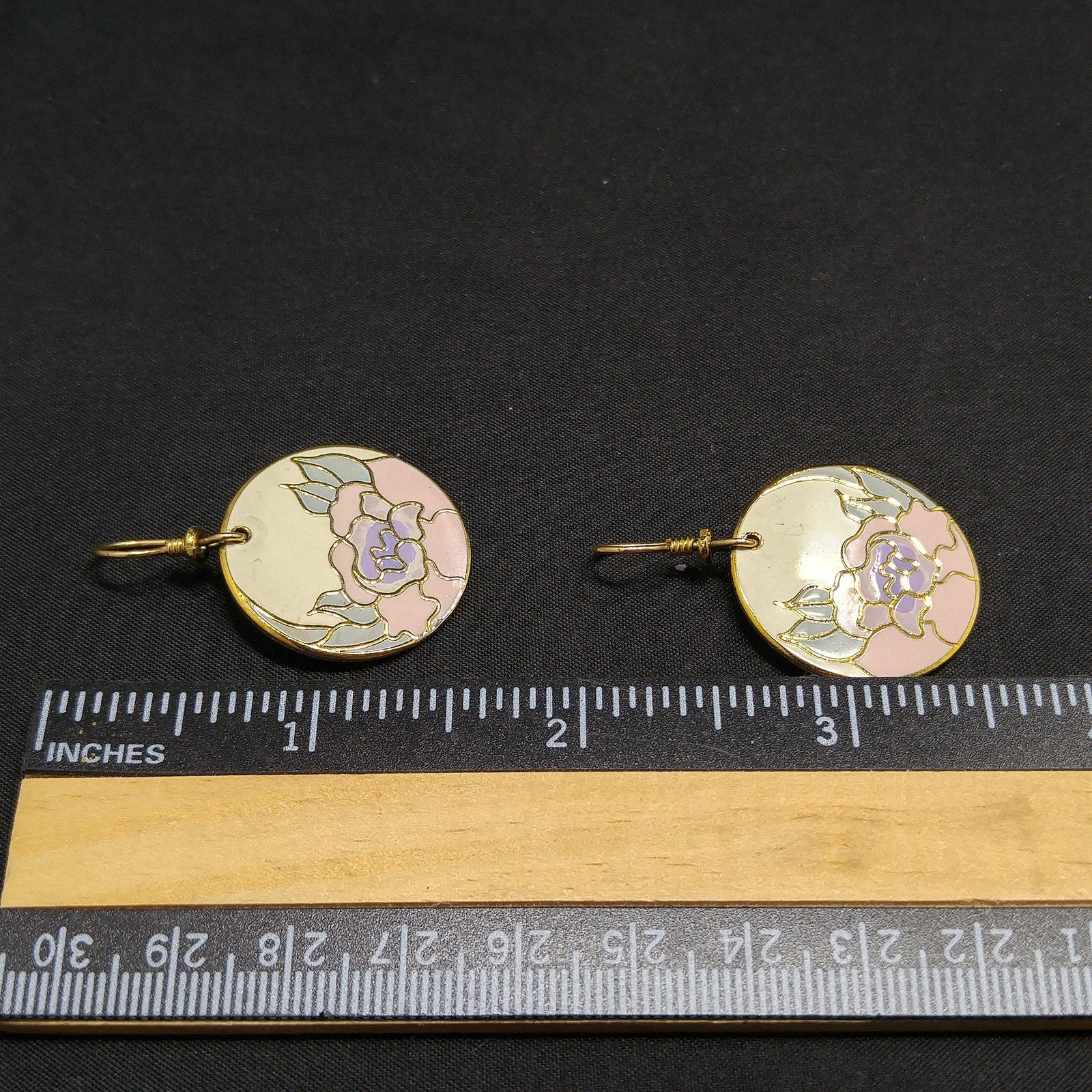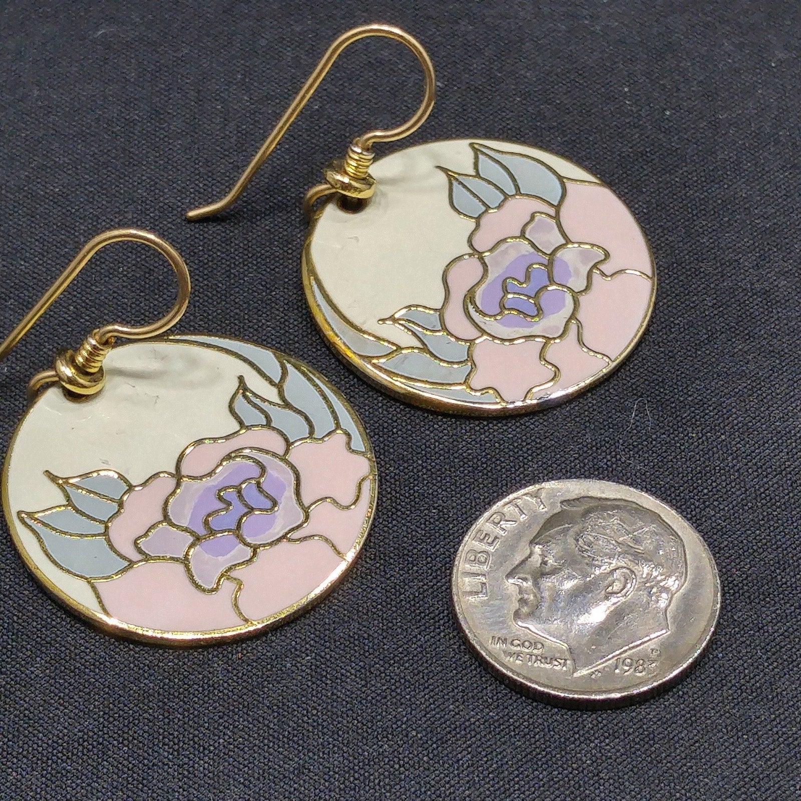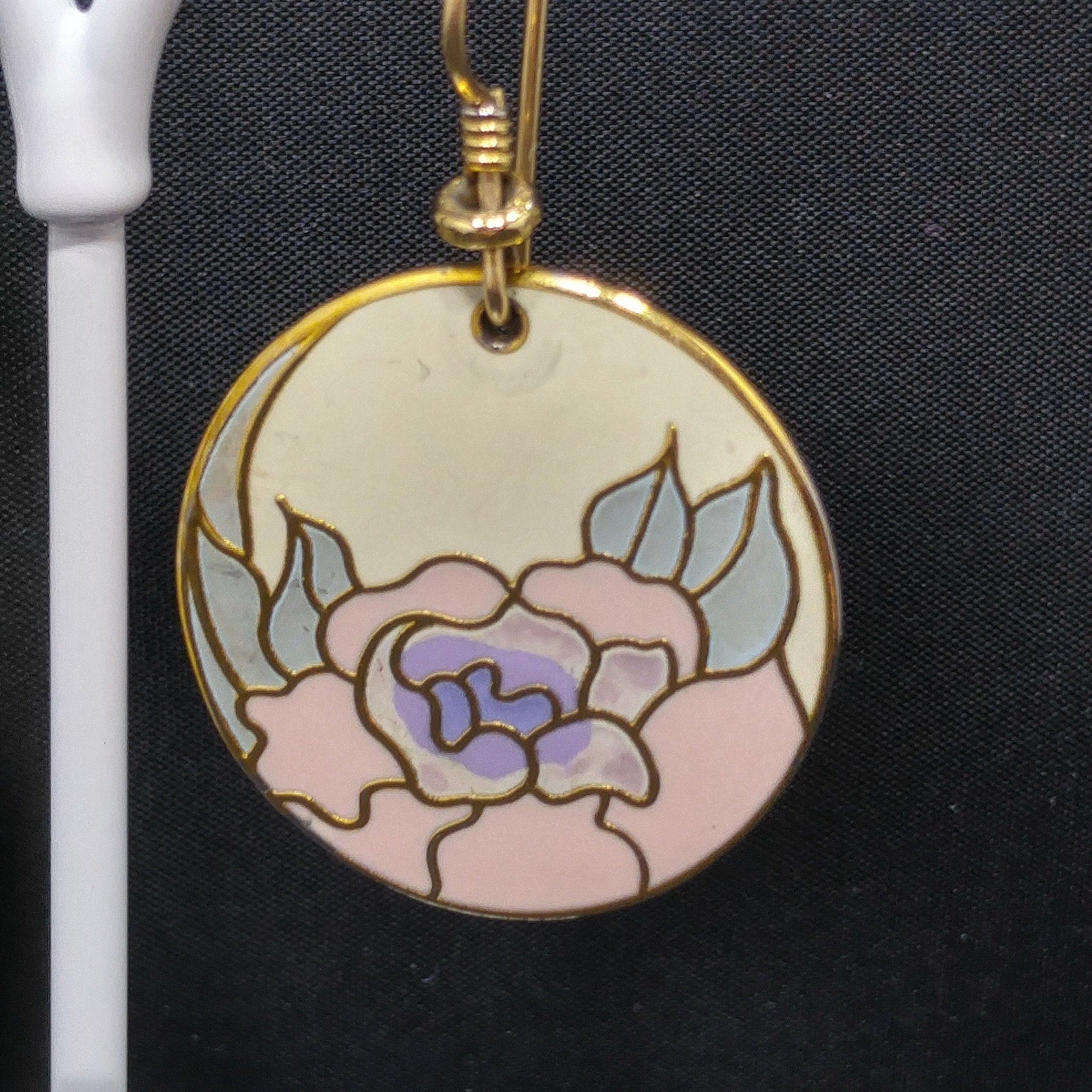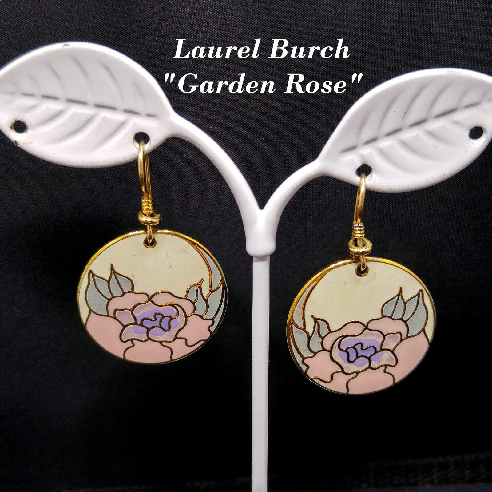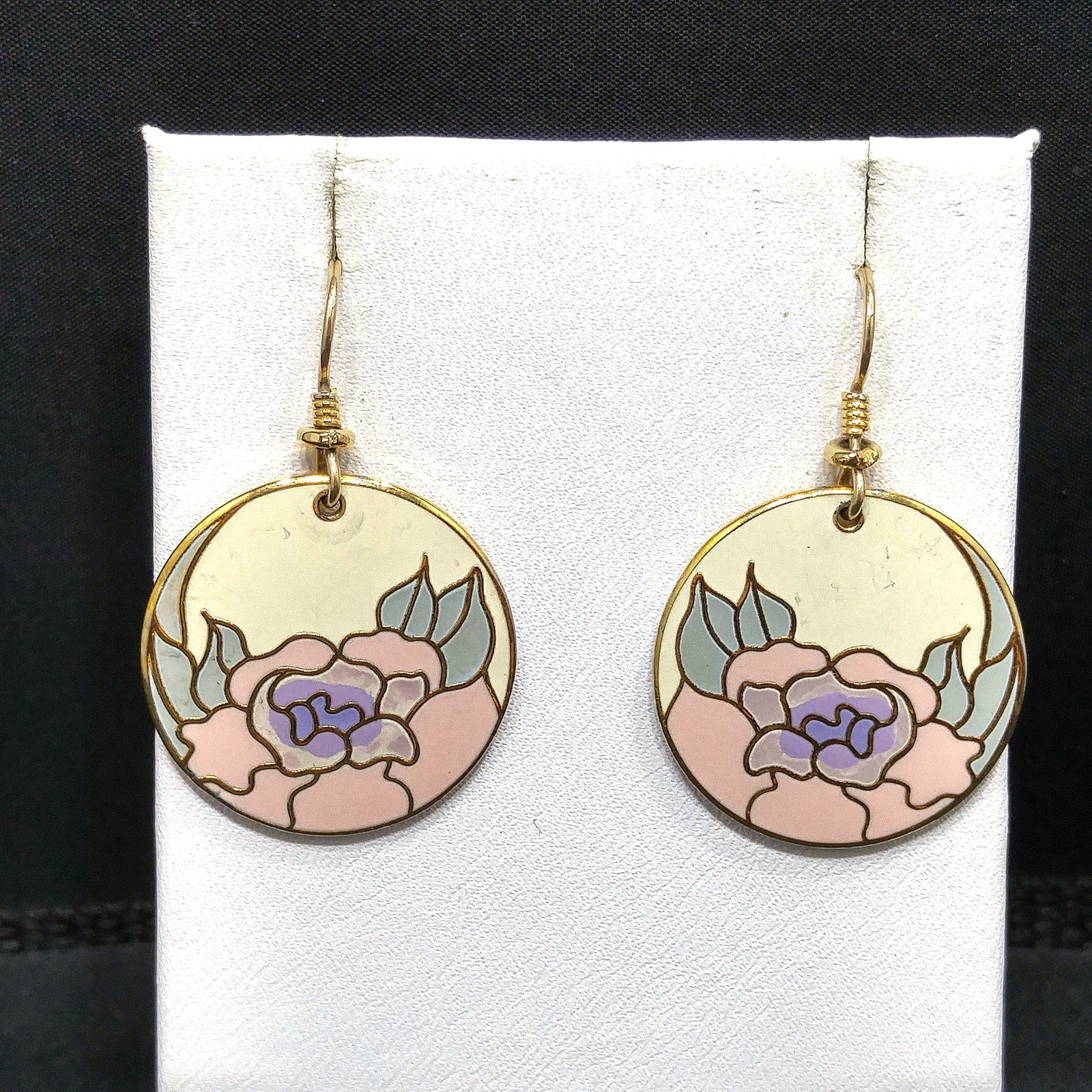 *Description: This is a great pair of vintage Laurel Burch GARDEN ROSE Cloisonné Earrings, circular design, gold plated back and rim with gold filled ear wires from the 1980s. This vintage jewelry is signed by Laurel Burch on the back, along with the design name Garden Rose. The design inside the gold rim is an off white enamel background, pink flower petals, lavender inside petals with mint green leaves. One of my favorite floral pair of Laurel Burch earrings. Beautiful!