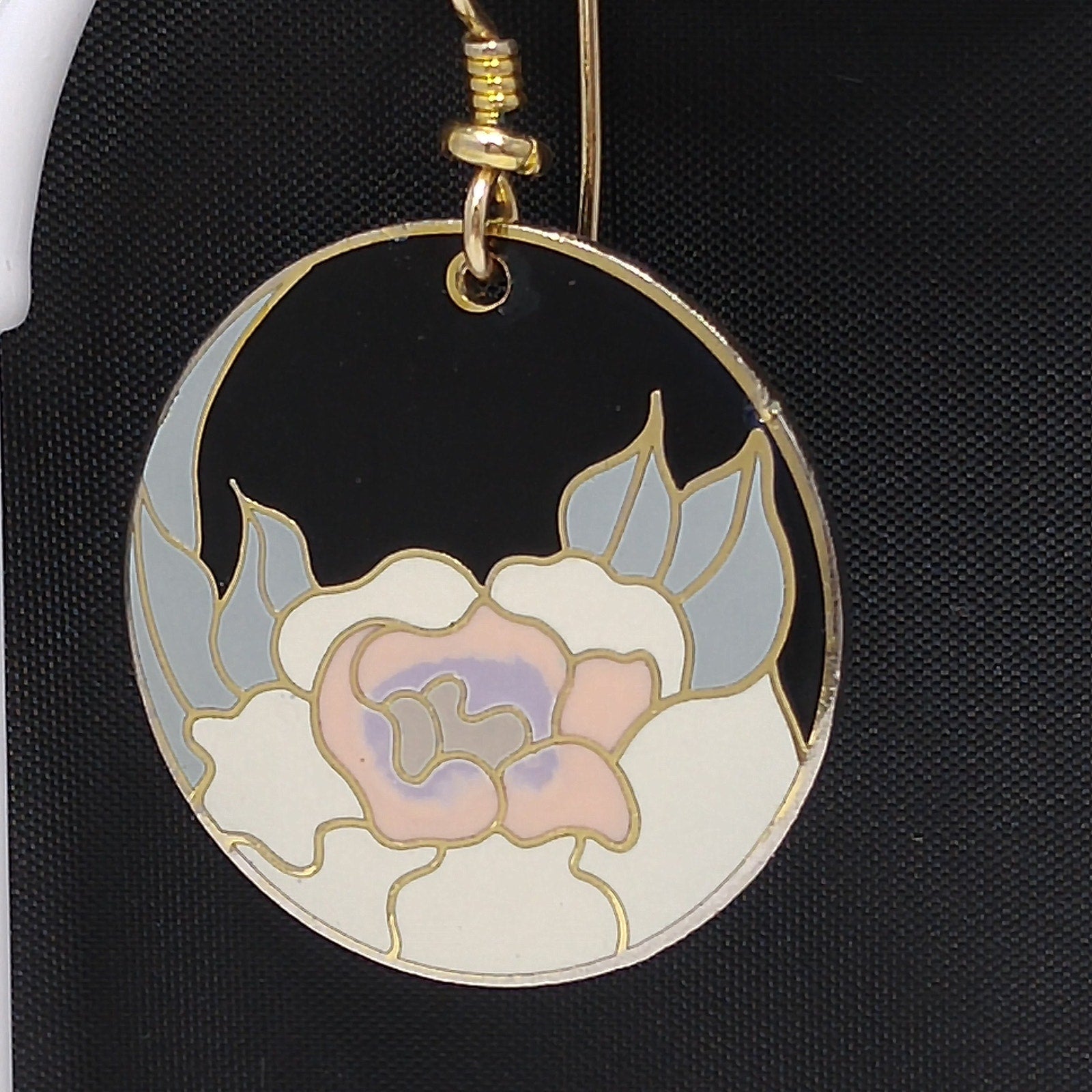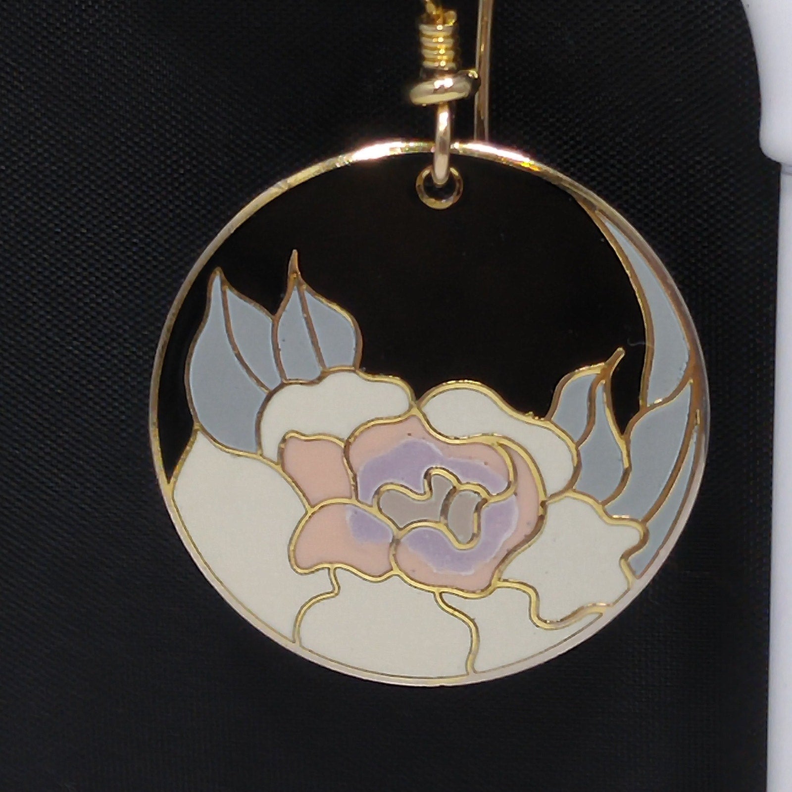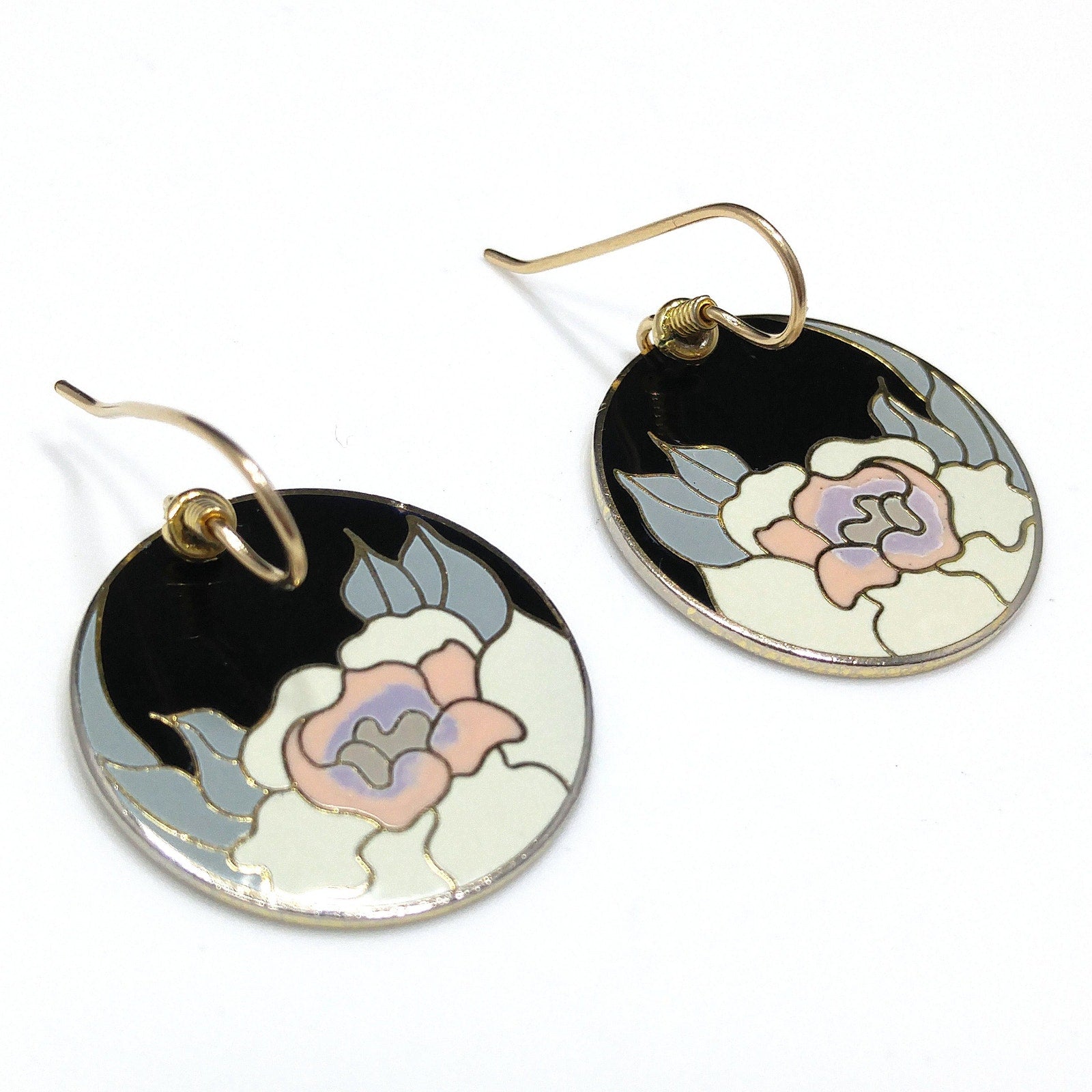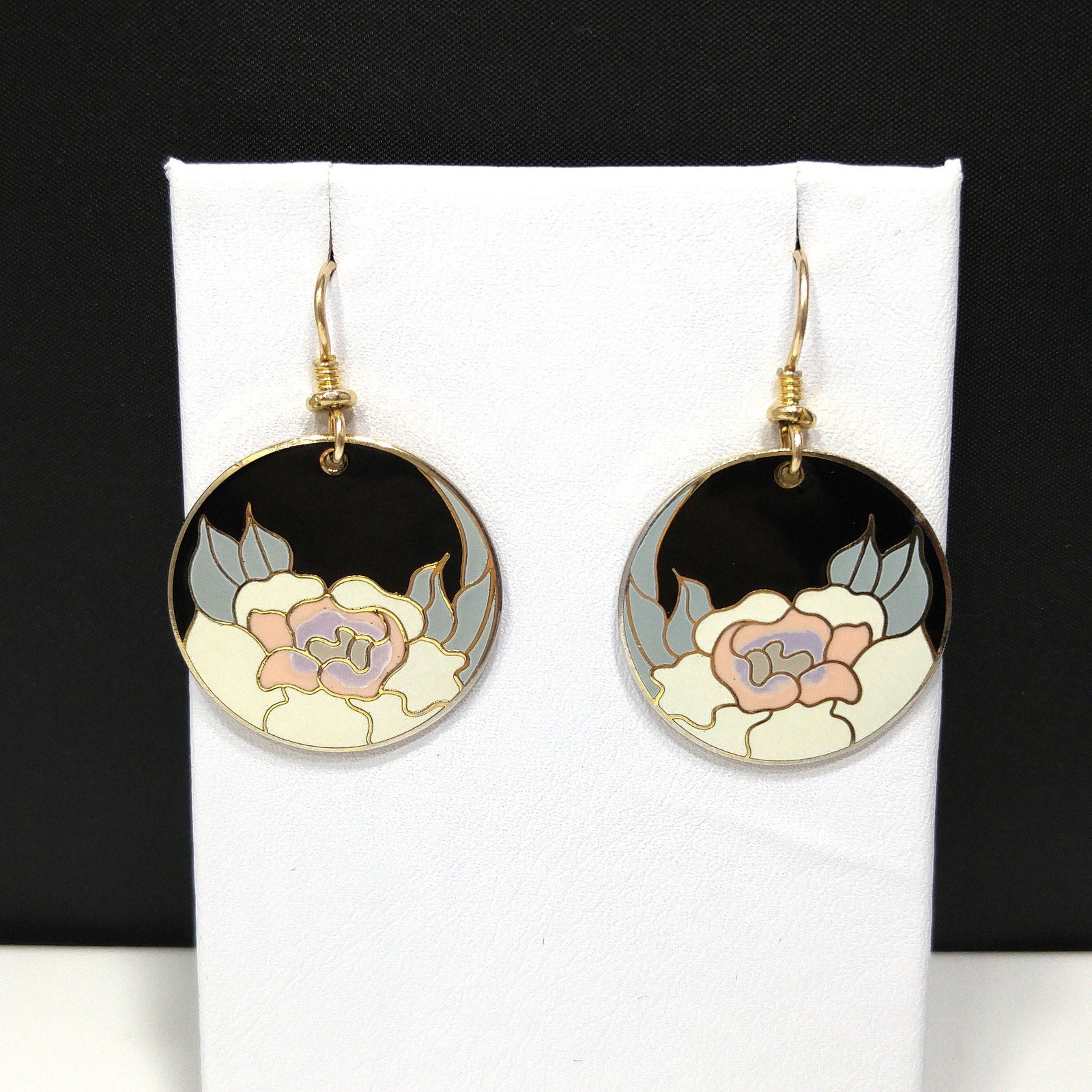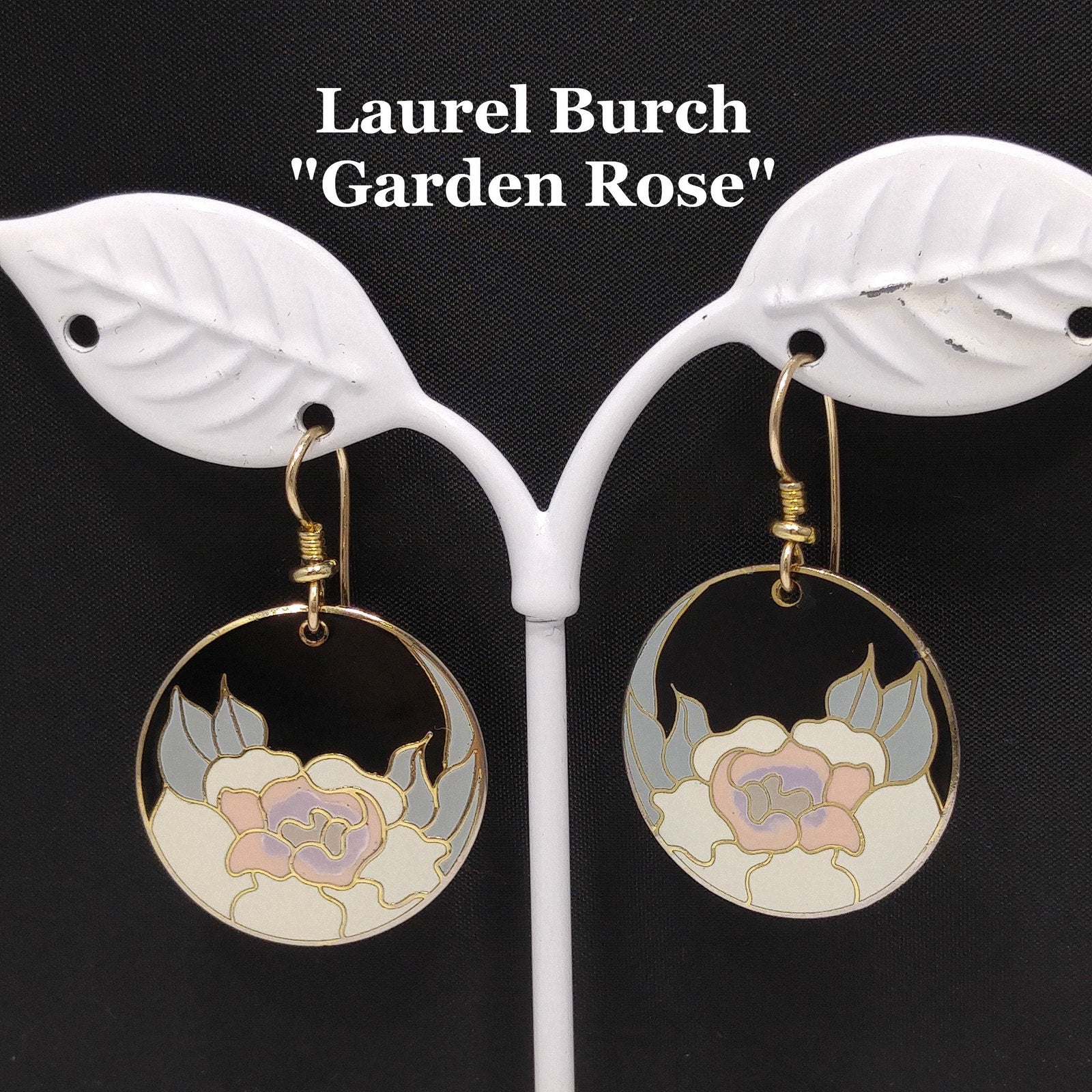 *Description: Vintage Laurel Burch GARDEN ROSE Cloisonné Earrings, circular design, gold plated back and rim with gold filled ear wires. These Laurel Burch earrings are from the 1980's and are signed by Laurel Burch on the back; along with the design name Garden Rose. The design inside the gold rim is a black enamel background, pink flower petals, lavender inside petals with gray leaves. One of my favorite floral pair of Laurel Burch earrings. Beautiful! This would be a great addition to your vintage jewelry collection or make a great vintage gift!