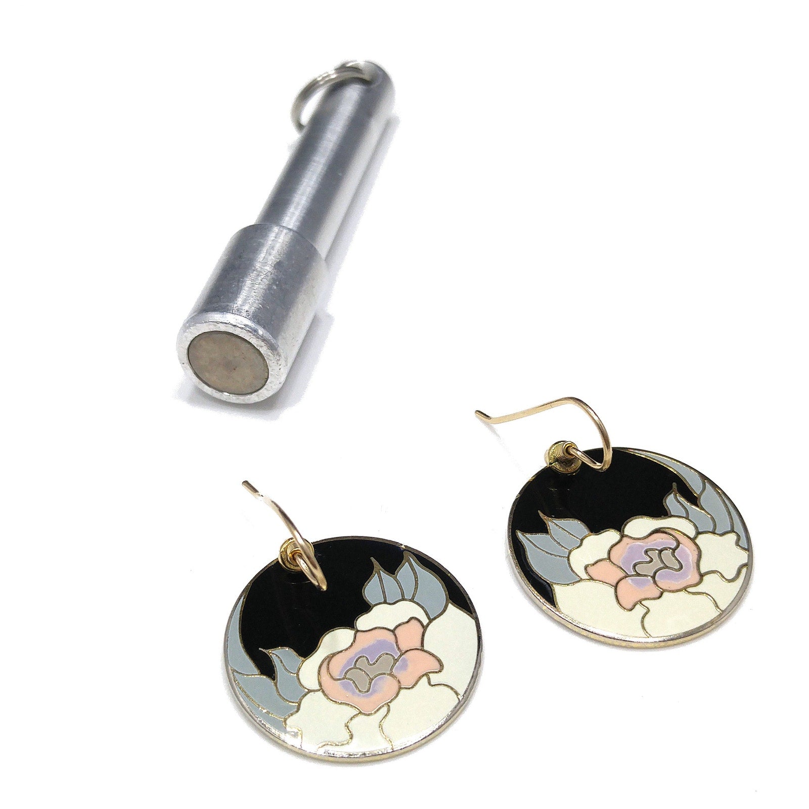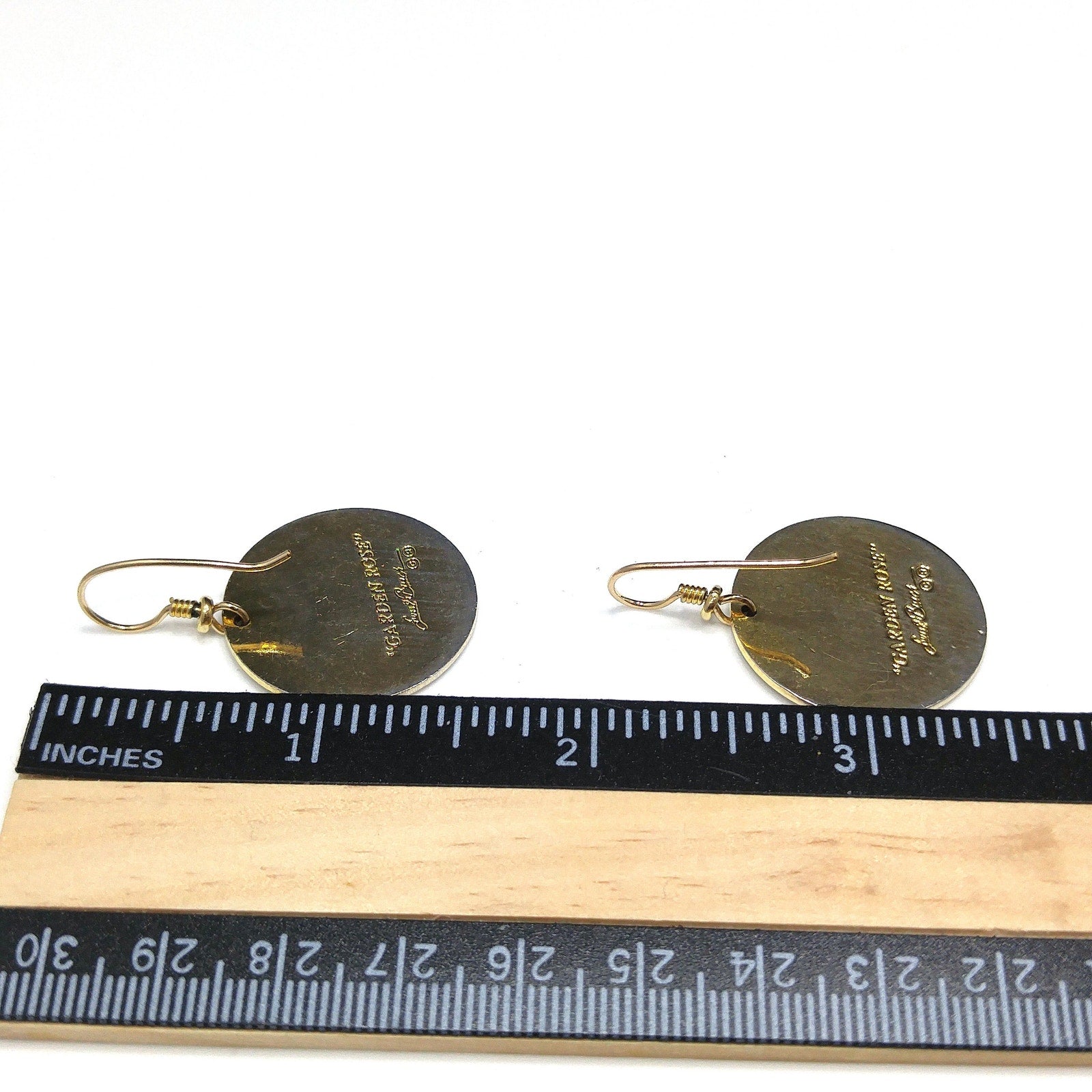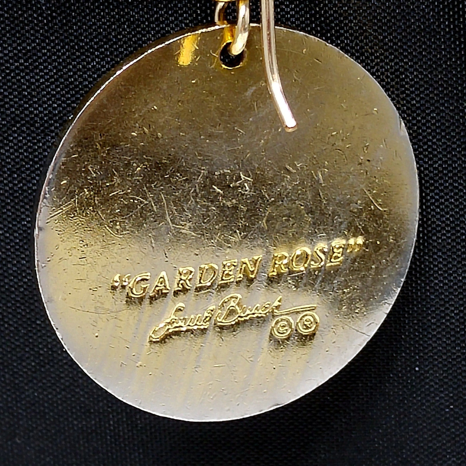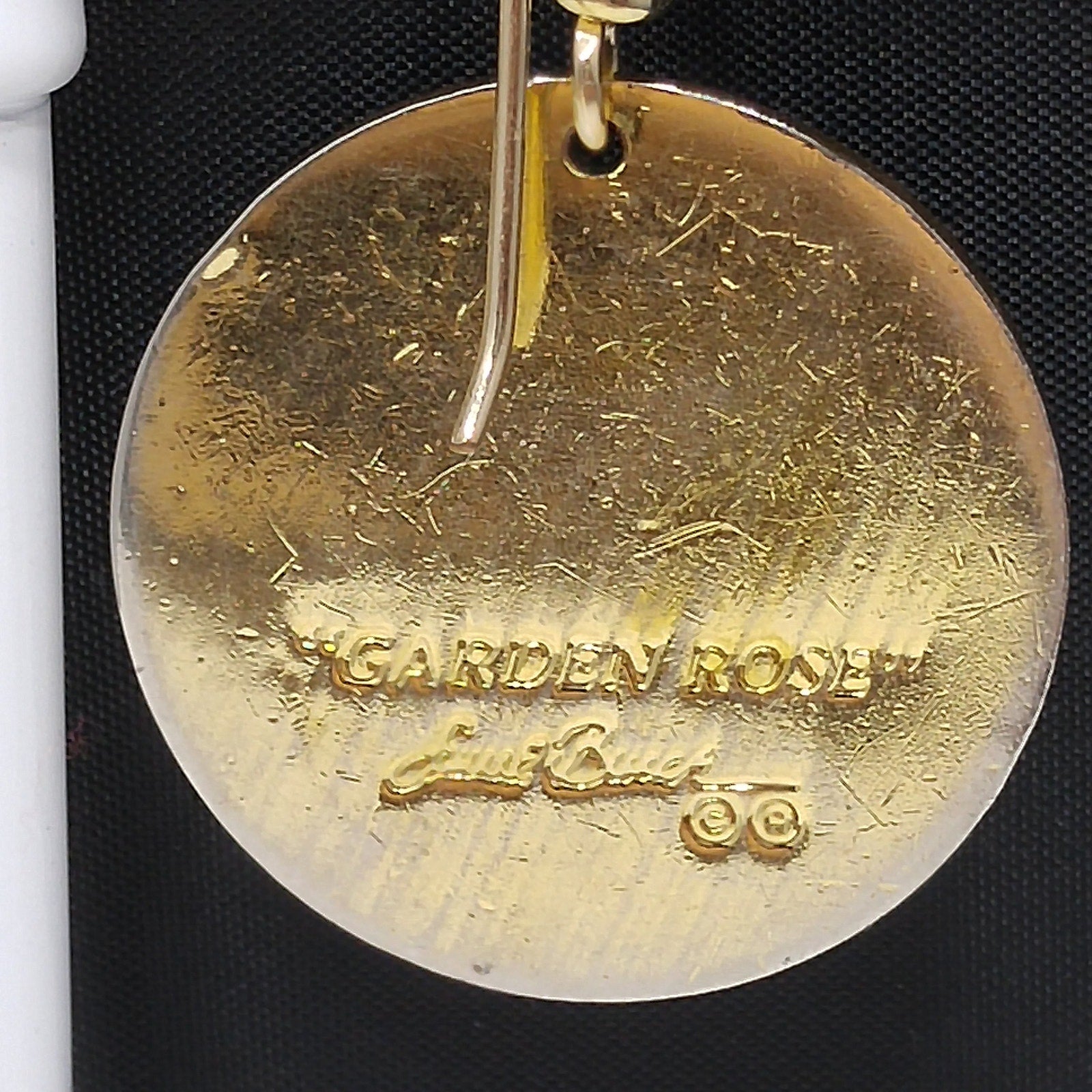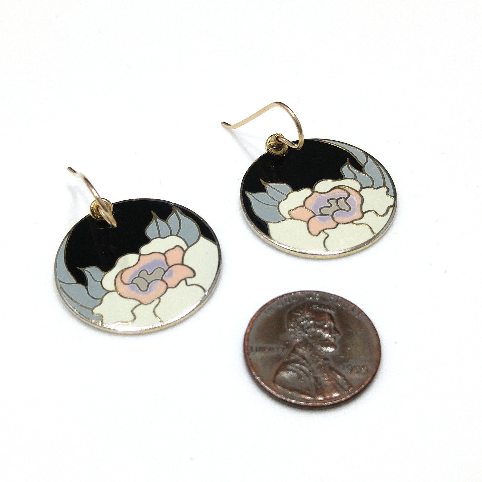 *Description: Vintage Laurel Burch GARDEN ROSE Cloisonné Earrings, circular design, gold plated back and rim with gold filled ear wires. These Laurel Burch earrings are from the 1980's and are signed by Laurel Burch on the back; along with the design name Garden Rose. The design inside the gold rim is a black enamel background, pink flower petals, lavender inside petals with gray leaves. One of my favorite floral pair of Laurel Burch earrings. Beautiful! This would be a great addition to your vintage jewelry collection or make a great vintage gift!