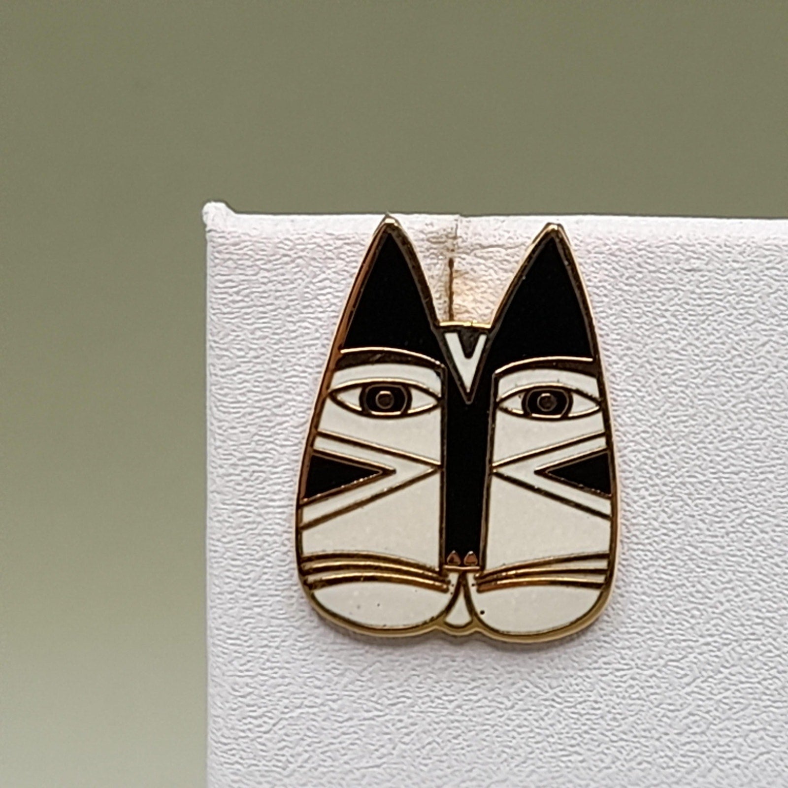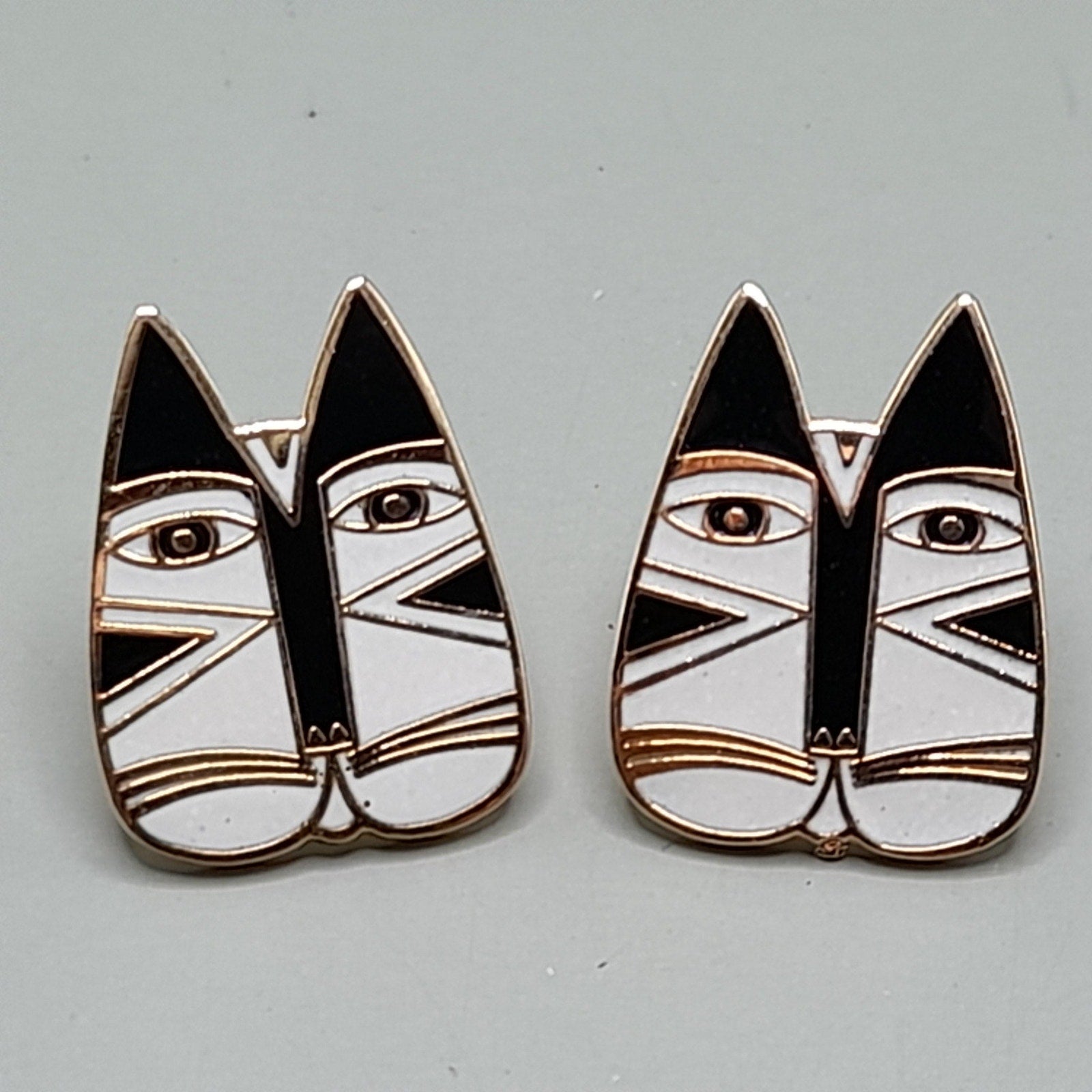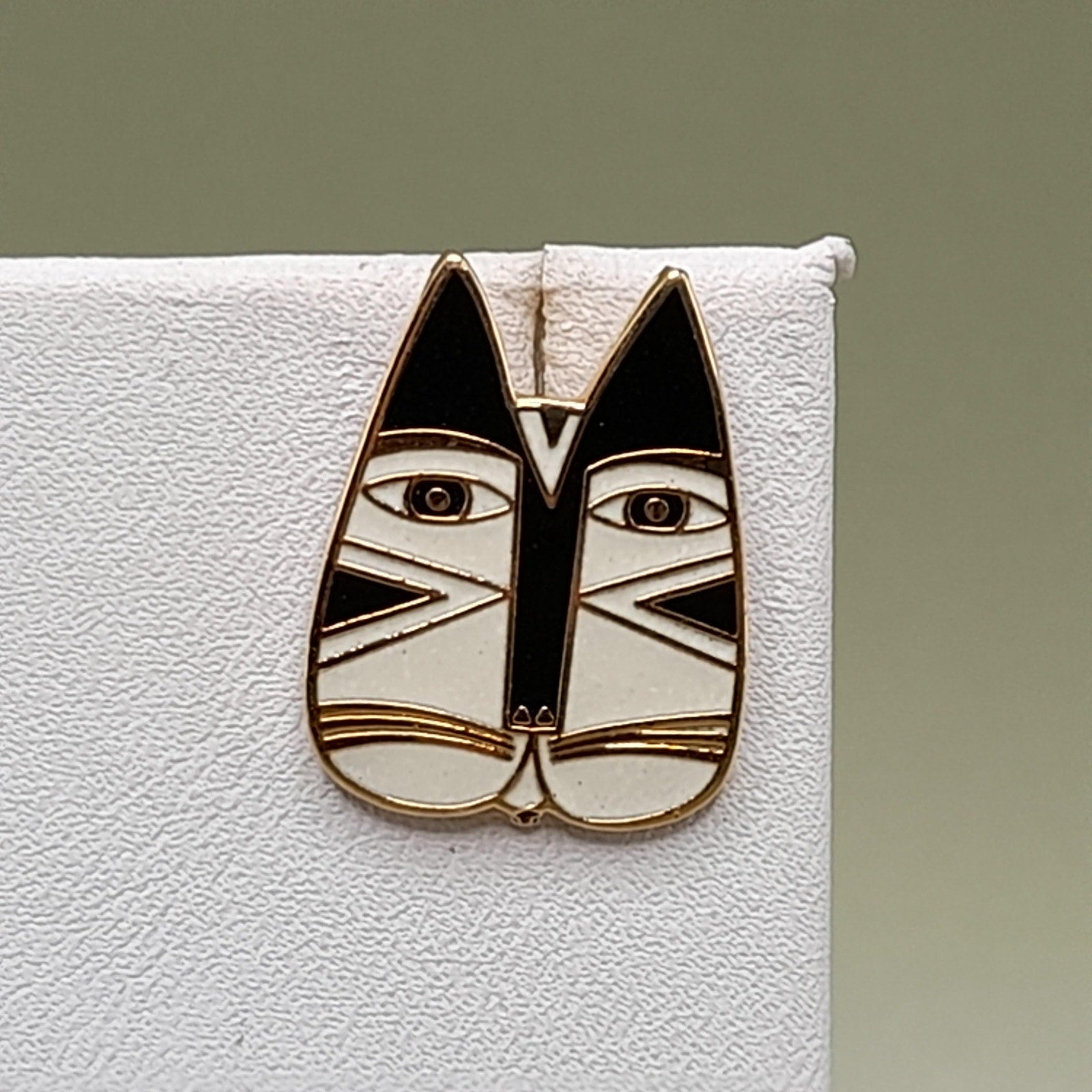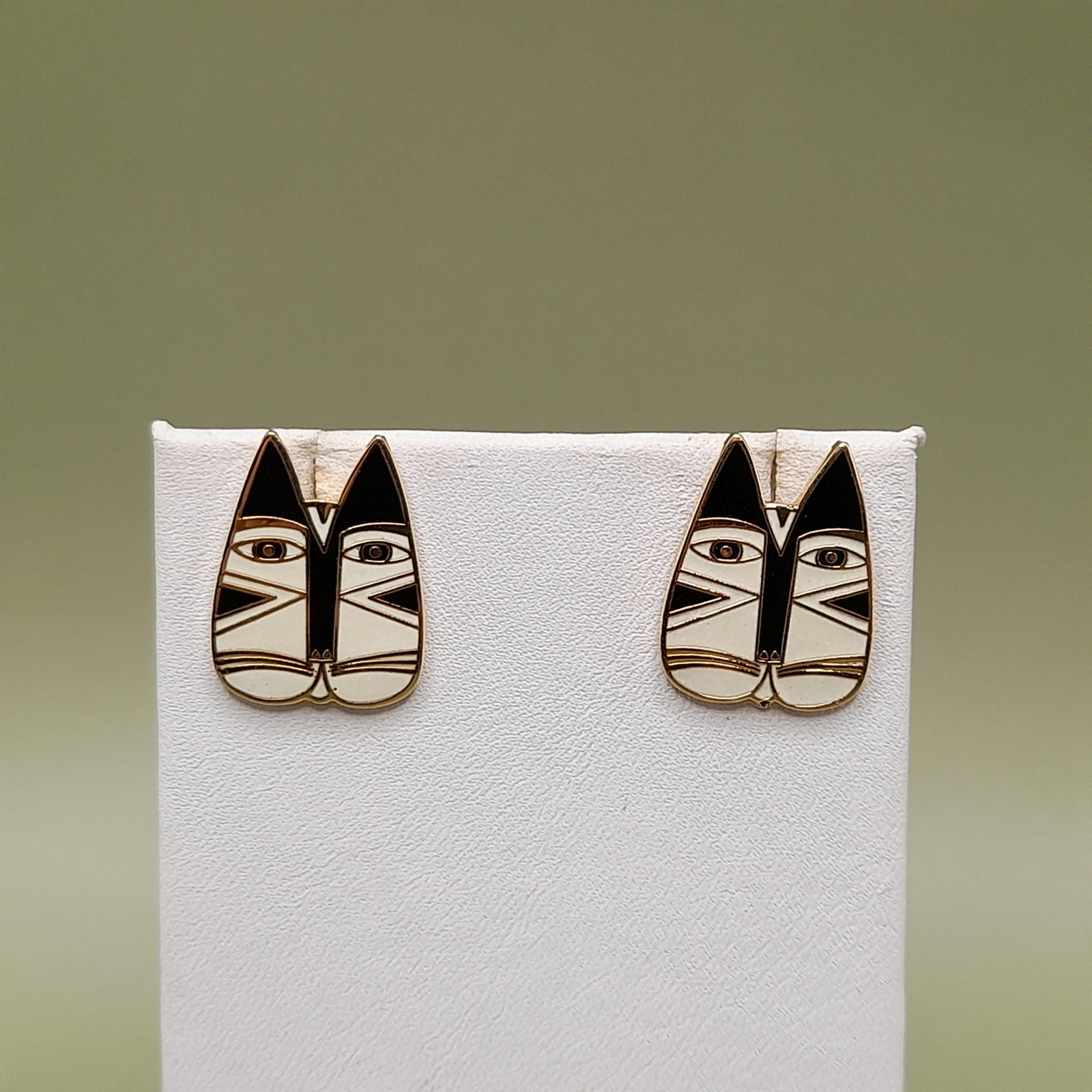 *Description: This is a great pair of Laurel Burch "Gato" Cat post earrings from the 1980s. Each earring is a cat face with gold plated backing and outlines. The cloisonne technique is used with enamel in black and white. This design was more rare in the quantity produced in my findings. This would be a great addition to your vintage jewelry collection or make a great vintage gift!