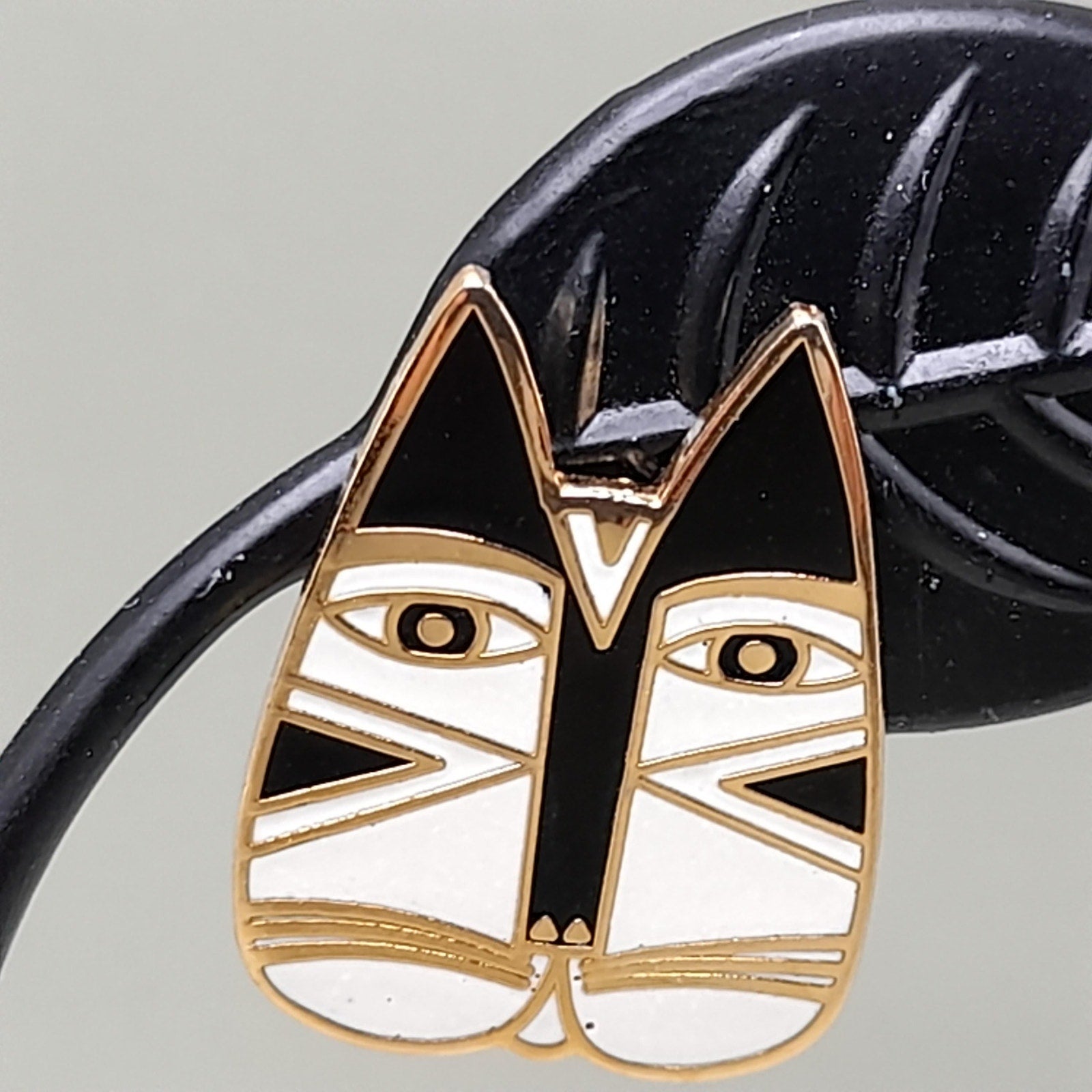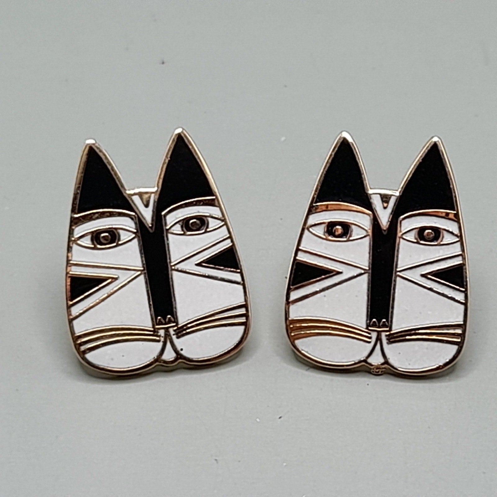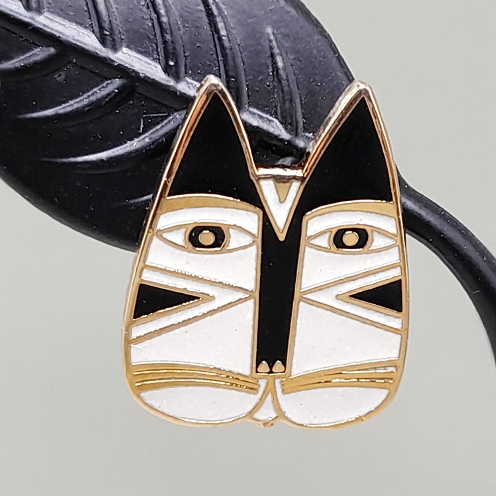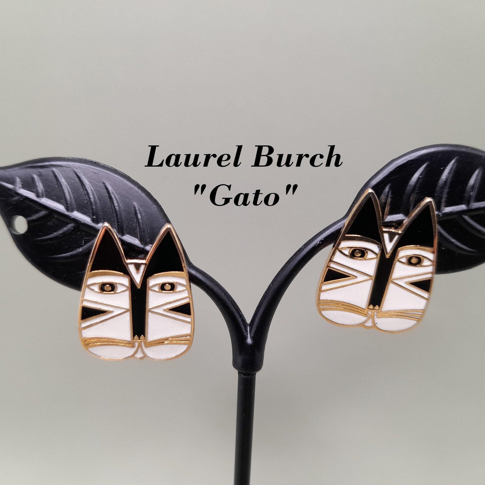 *Description: This is a great pair of Laurel Burch "Gato" Cat post earrings from the 1980s. Each earring is a cat face with gold plated backing and outlines. The cloisonne technique is used with enamel in black and white. This design was more rare in the quantity produced in my findings. This would be a great addition to your vintage jewelry collection or make a great vintage gift!