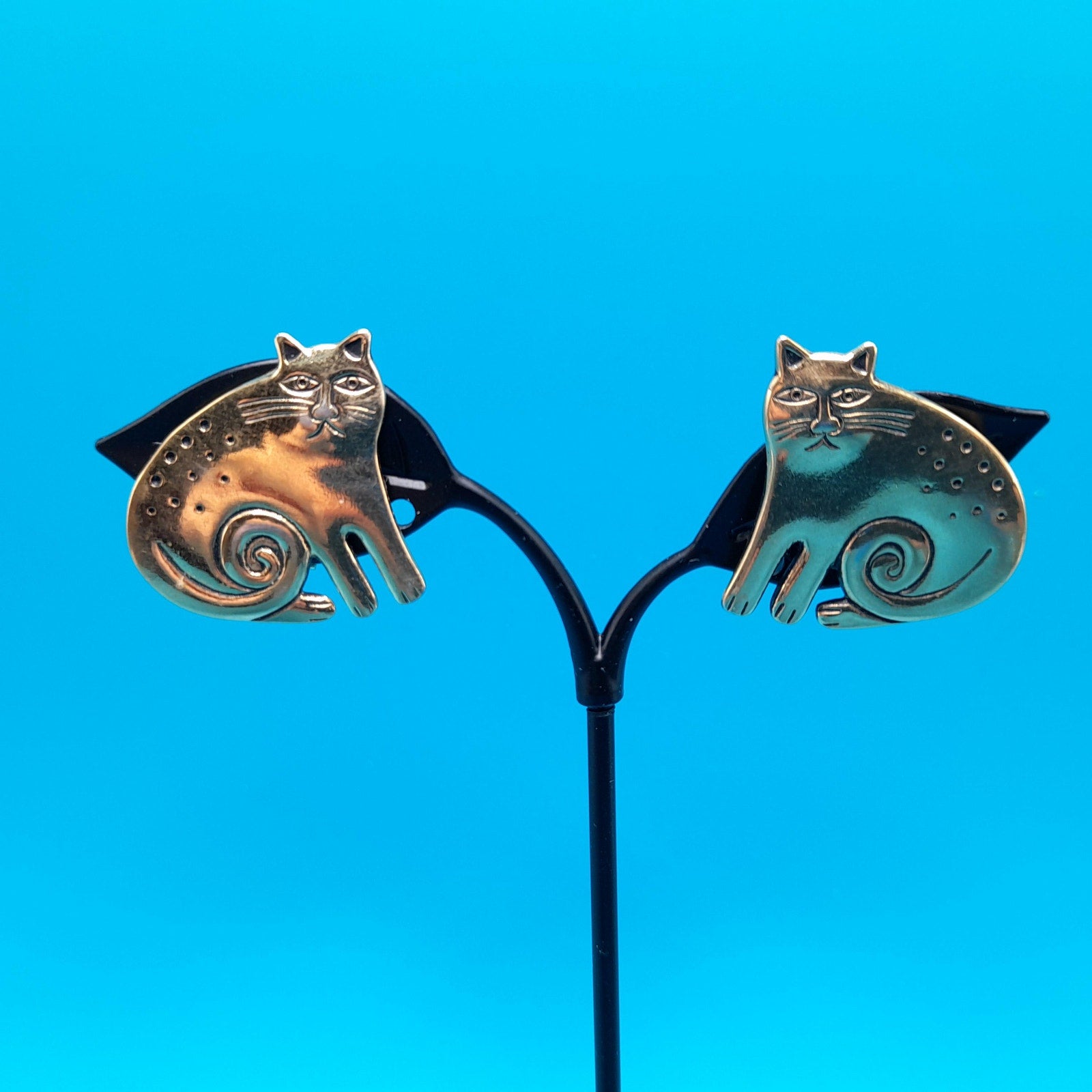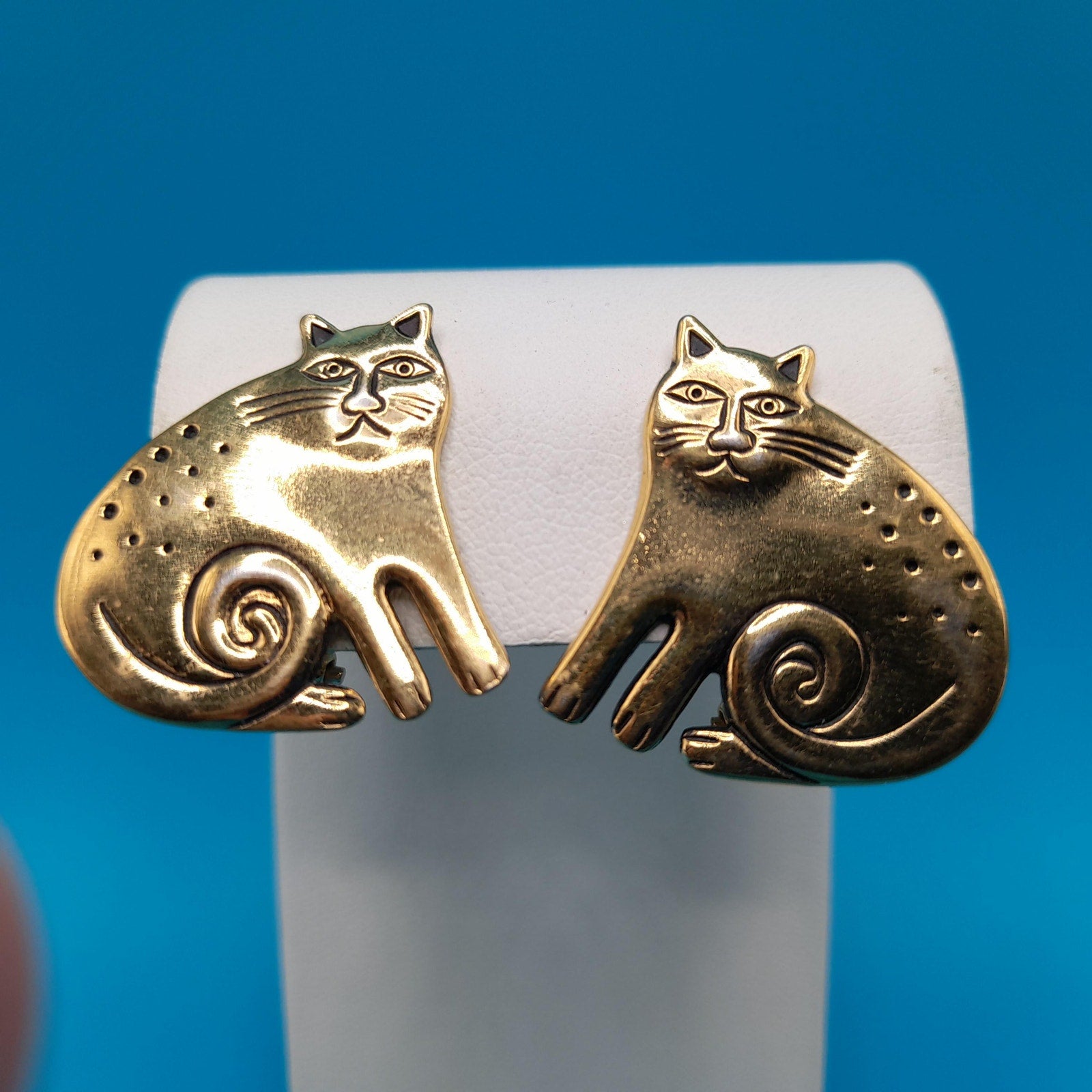 Vintage Laurel Burch Gold Plated Cat Earrings, Clip-on Earrings
