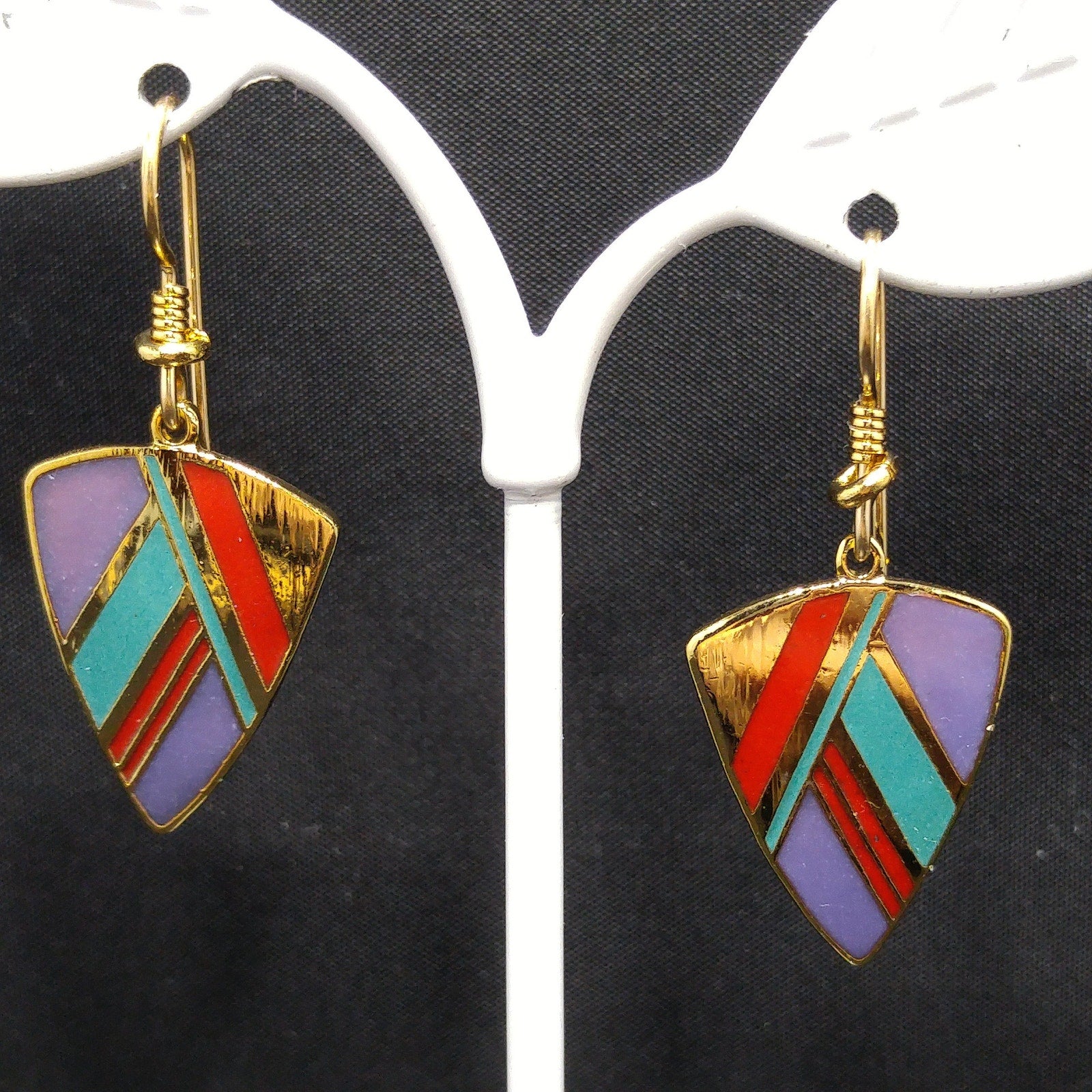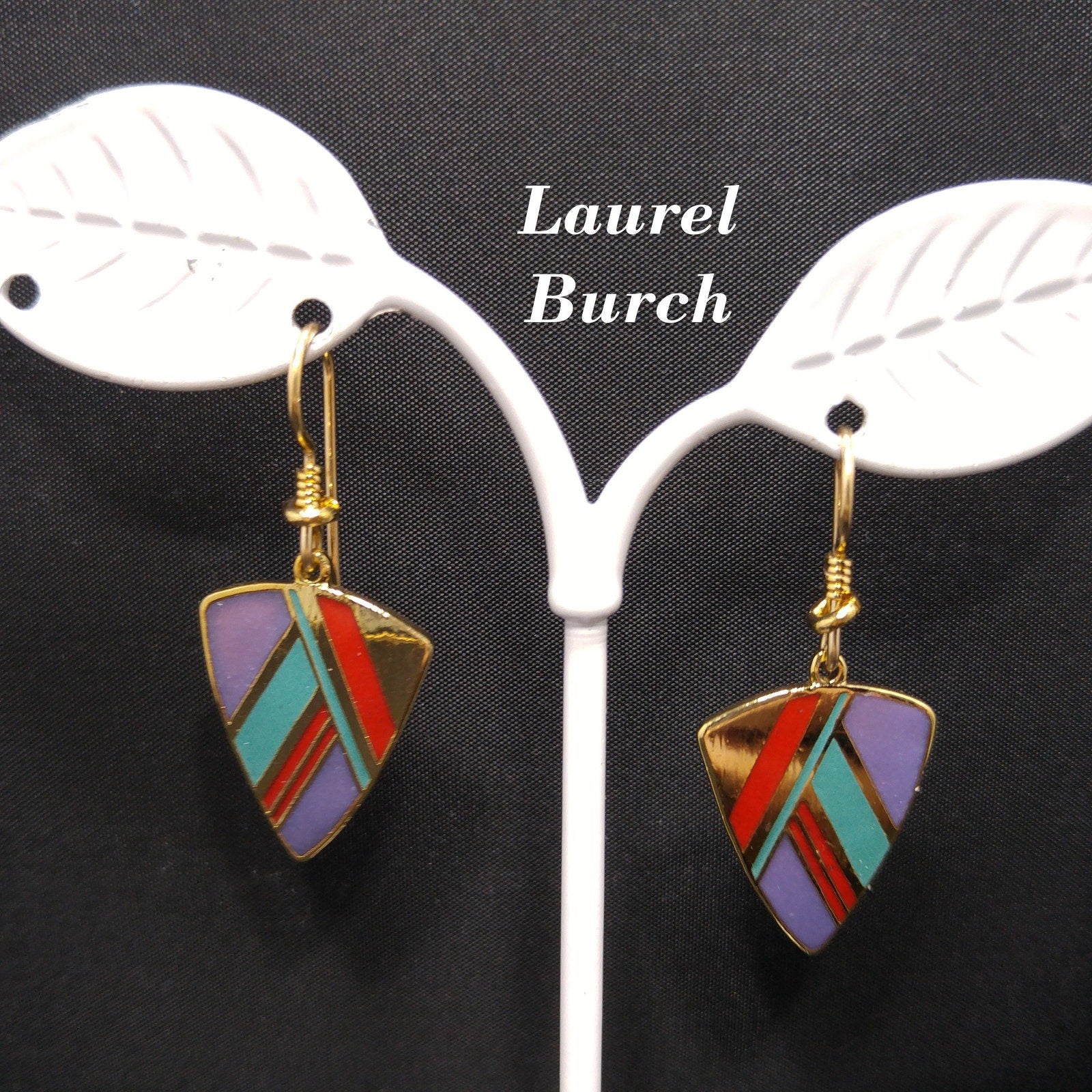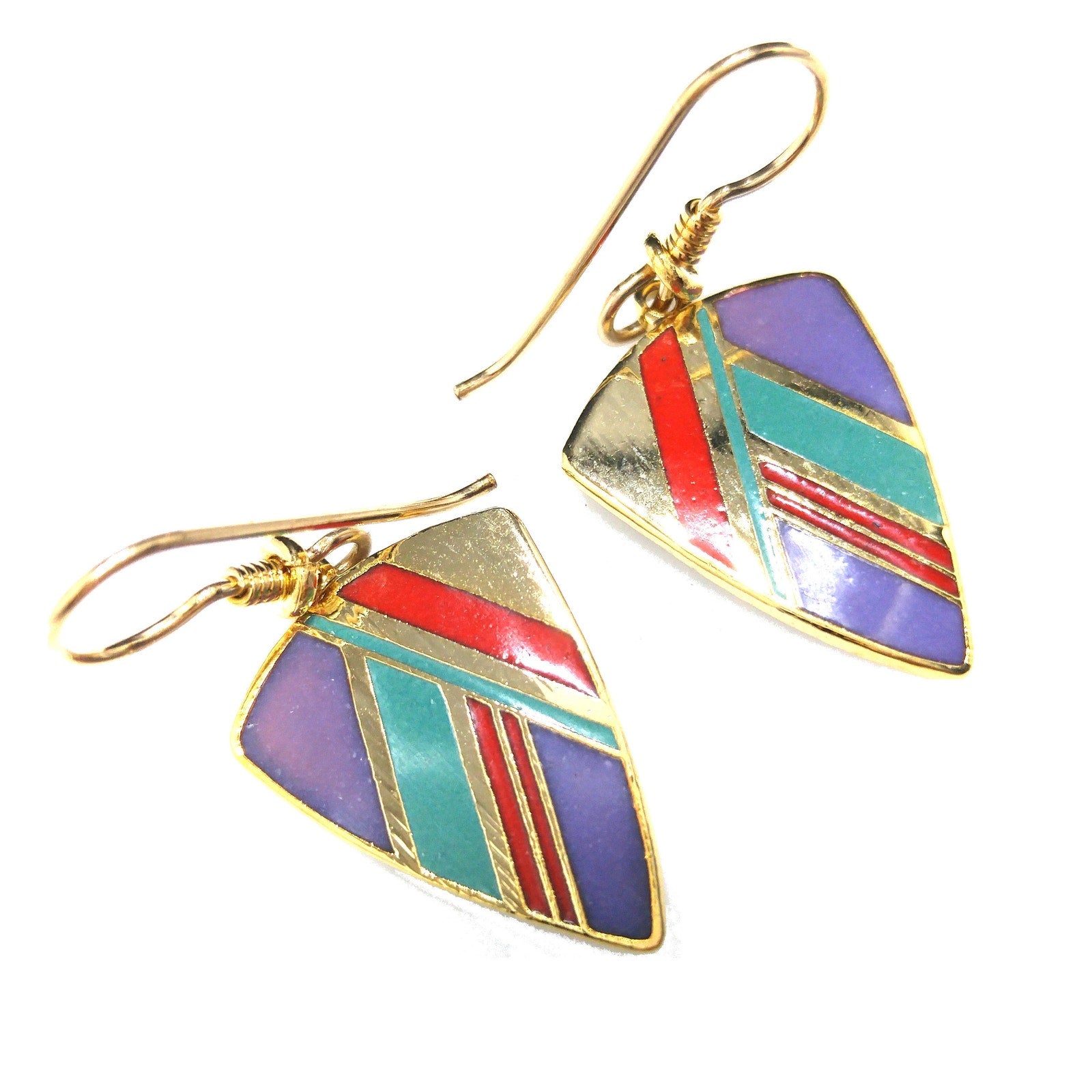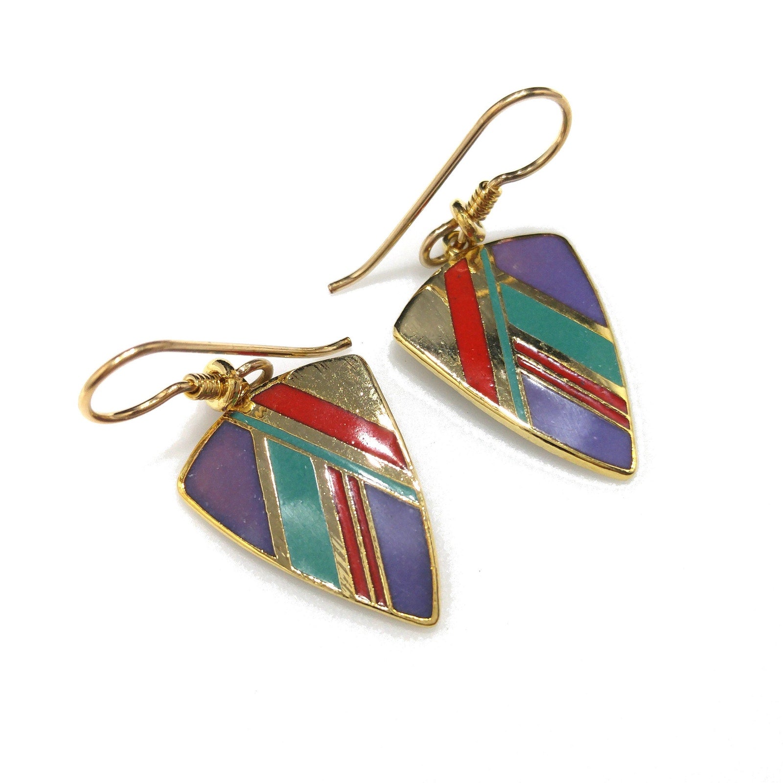 *Description: This is a beautiful pair of Laurel Burch gold plated earrings with cloisonne enamel in teal, purple, and red, in a geometric design from the 1980s. This would be a great addition to your vintage jewelry collection or make a great vintage gift!