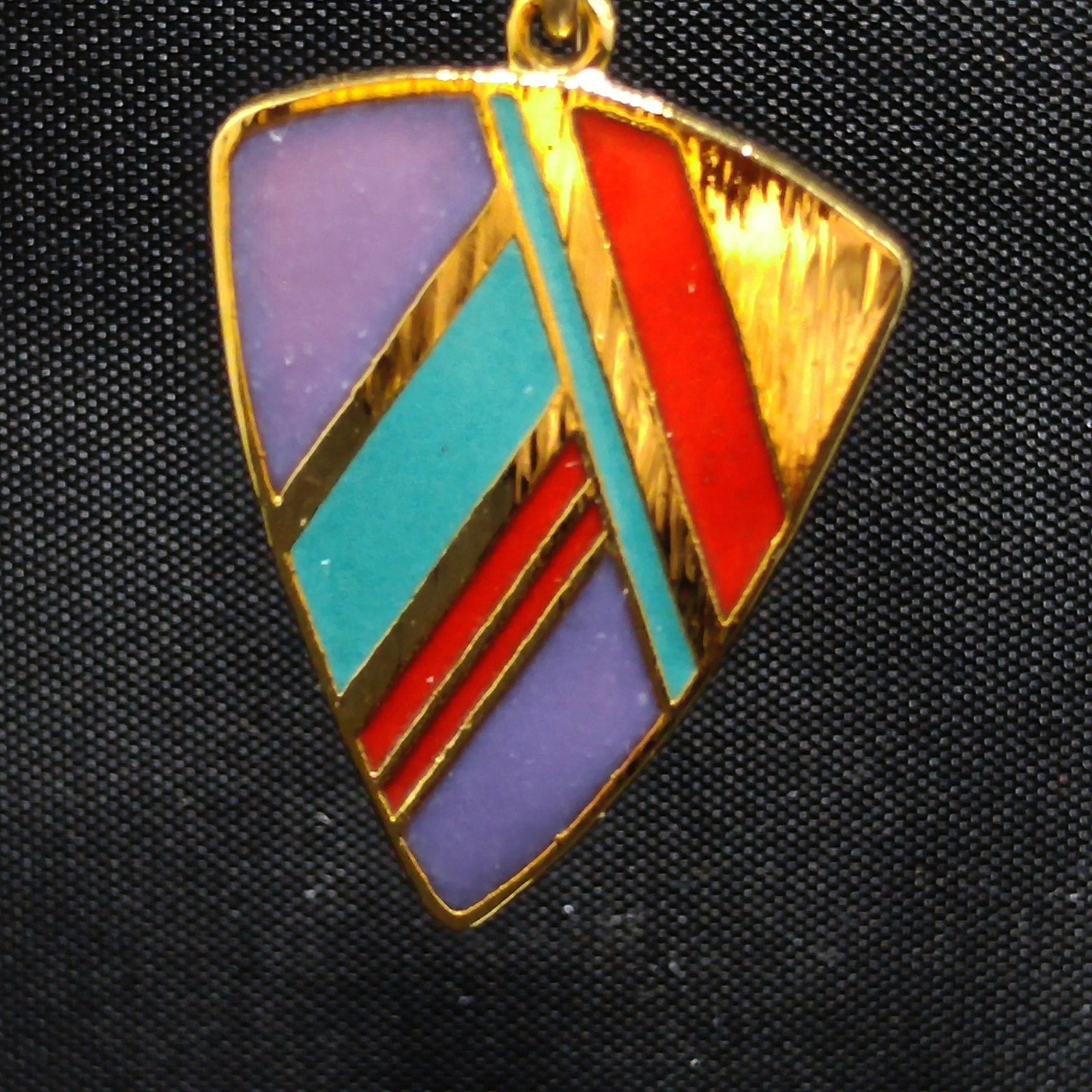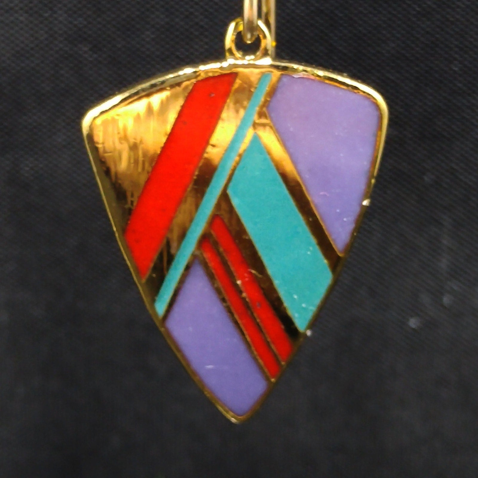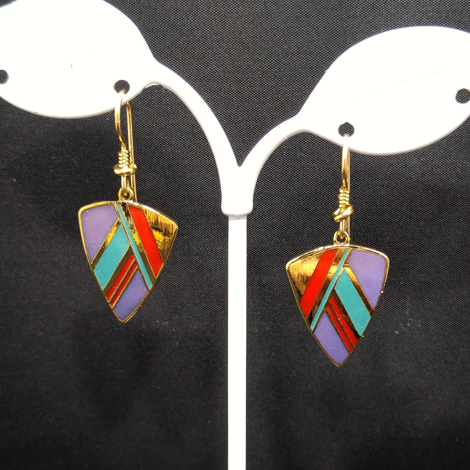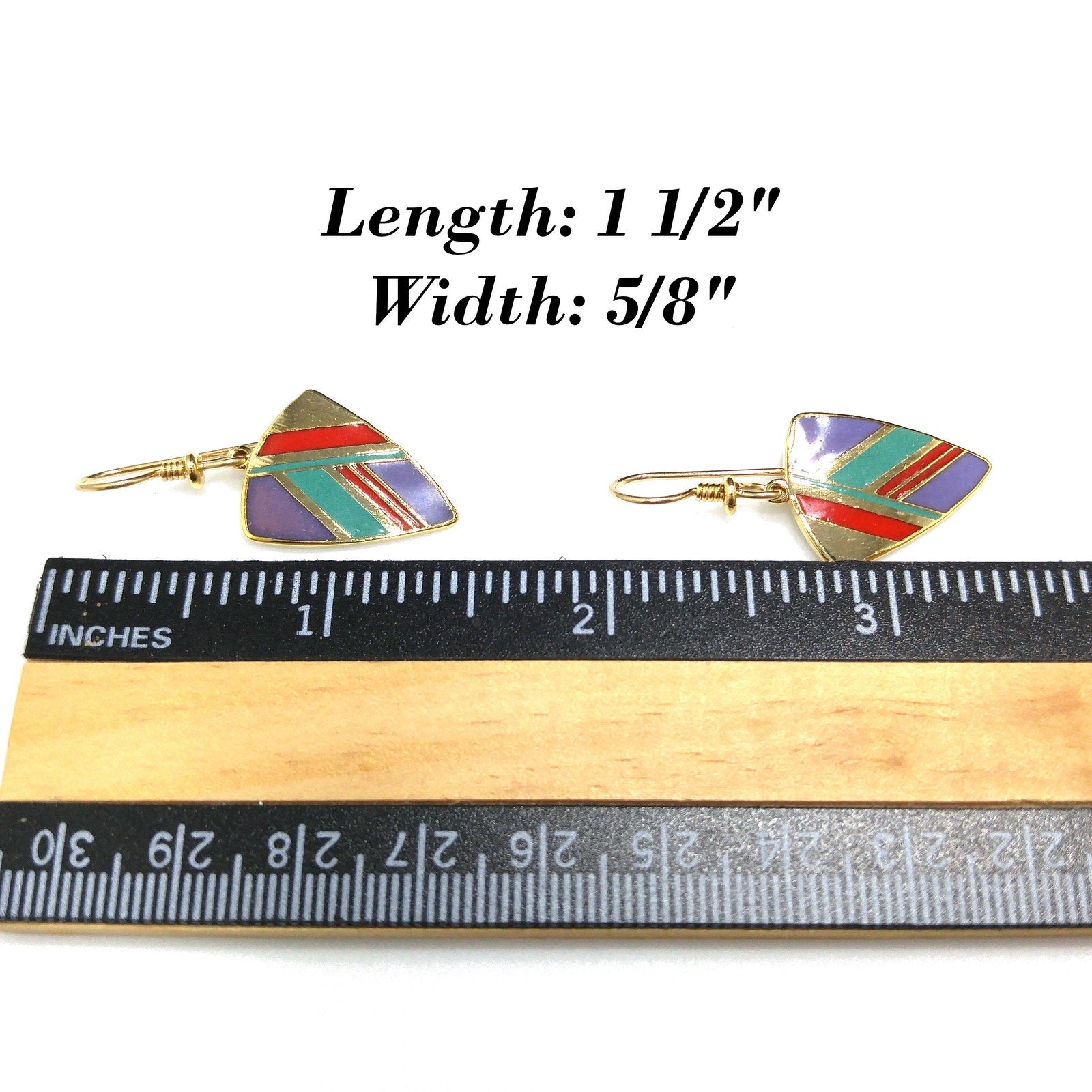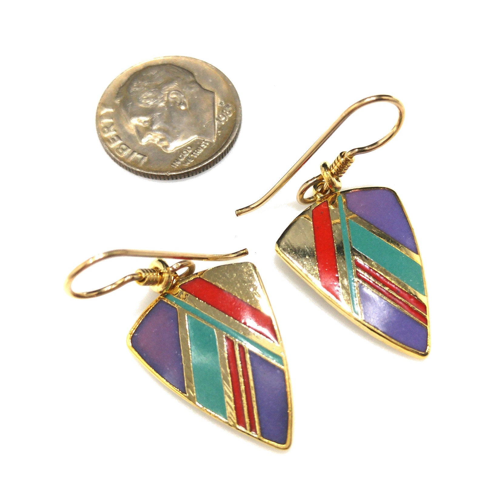 *Description: This is a beautiful pair of Laurel Burch gold plated earrings with cloisonne enamel in teal, purple, and red, in a geometric design from the 1980s. This would be a great addition to your vintage jewelry collection or make a great vintage gift!