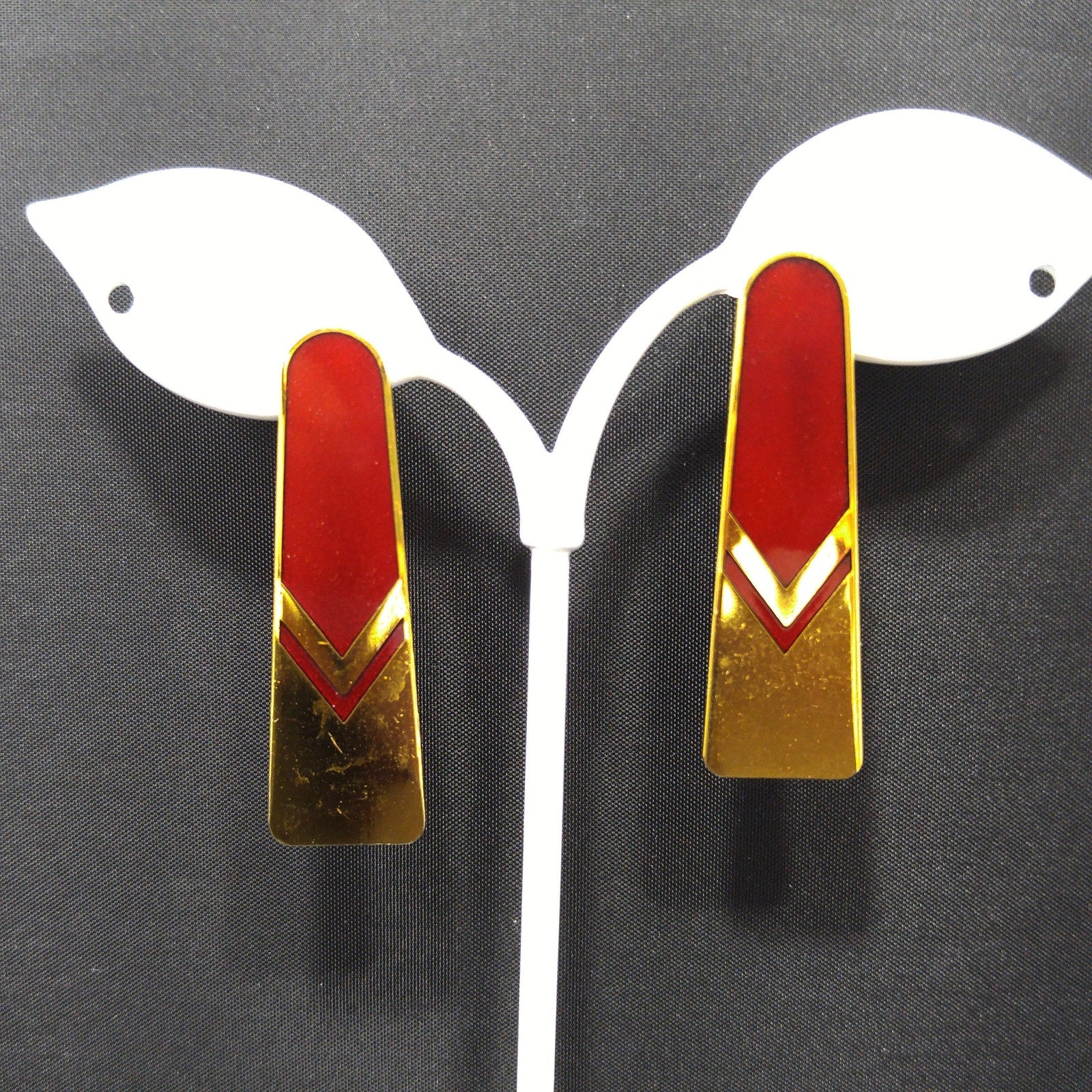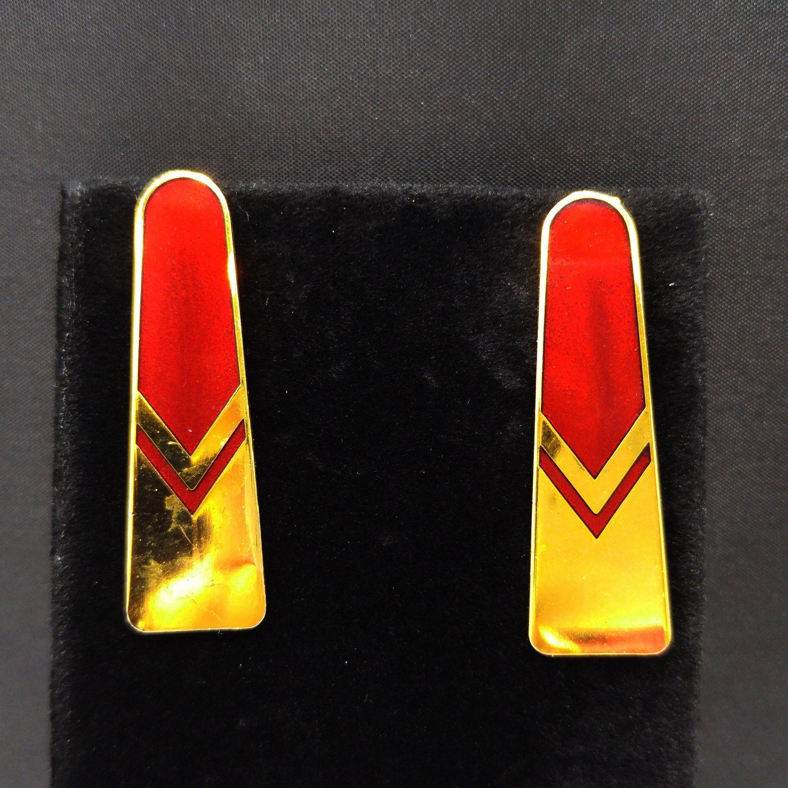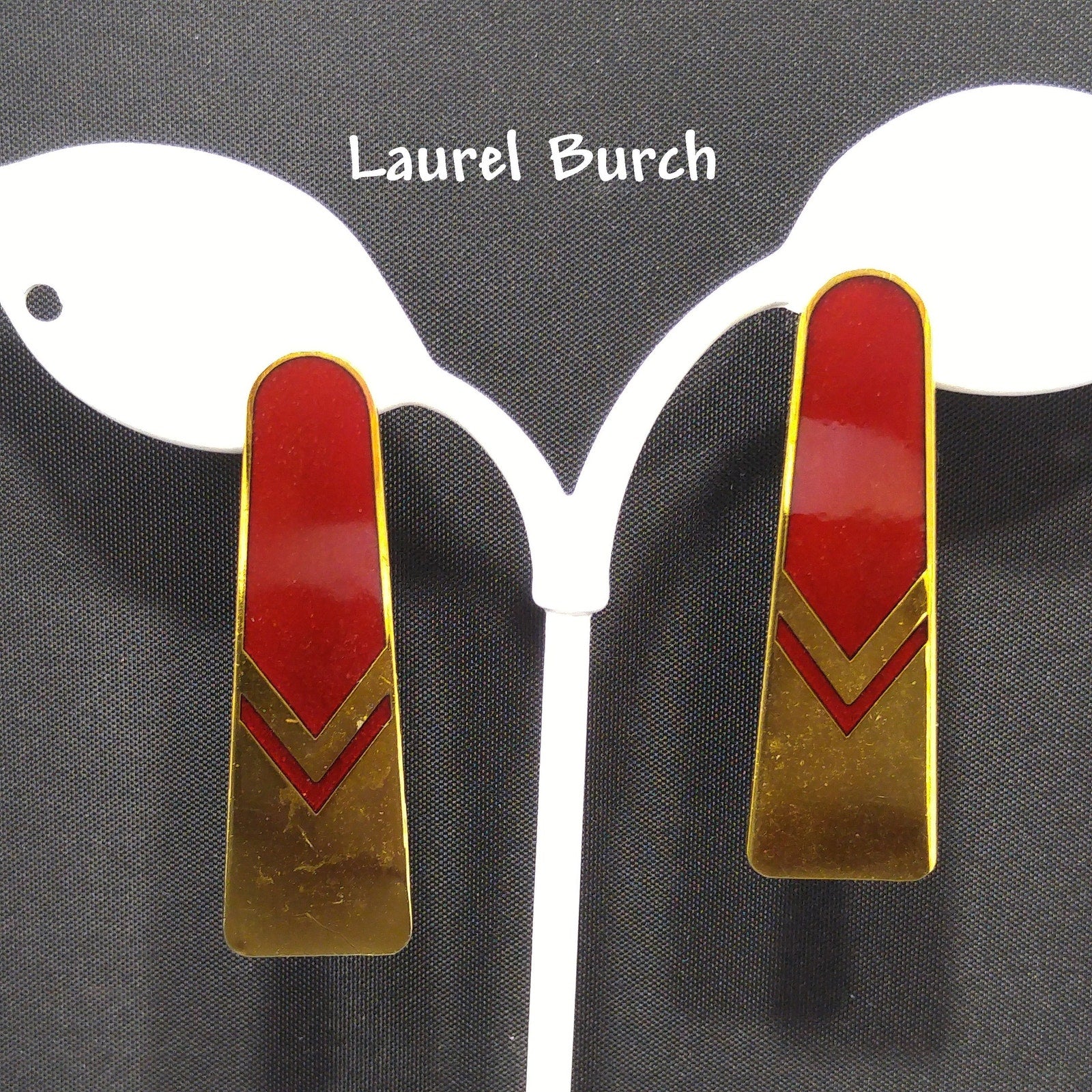 *Description: Beautiful Laurel Burch earrings with a chevron design with the top half a red enamel and the bottom half a very reflective gold plating. Using the cloisonne technique, the red enamel is outlined in a beautiful gold. These earrings have gold-filled posts. They are signed on the back of each earring: Laurel Burch.