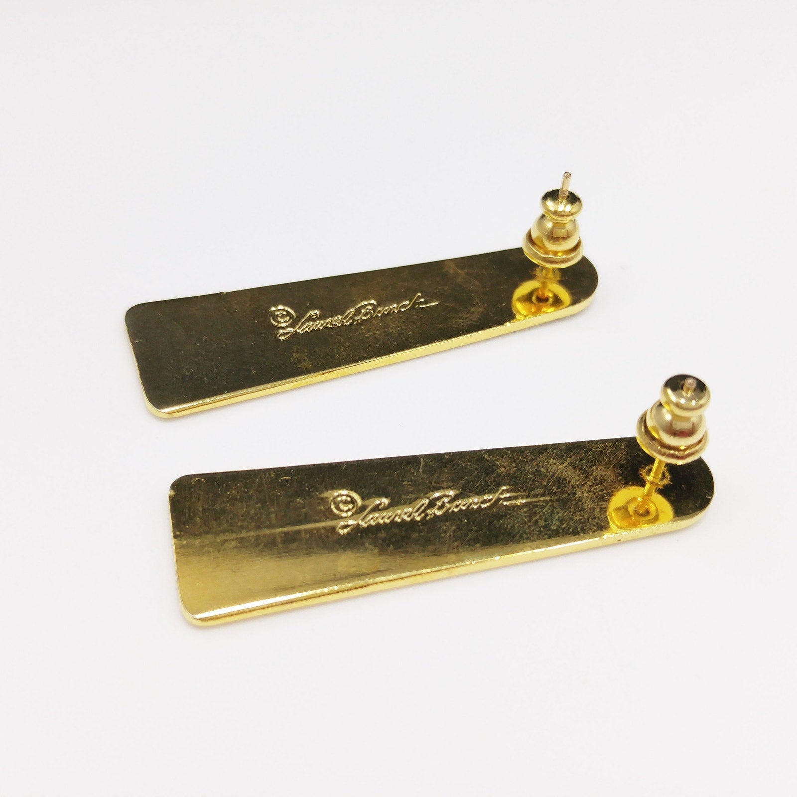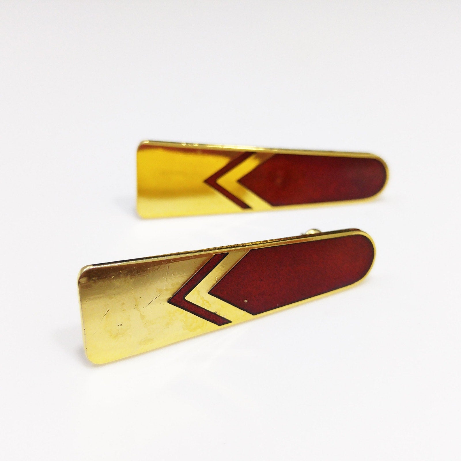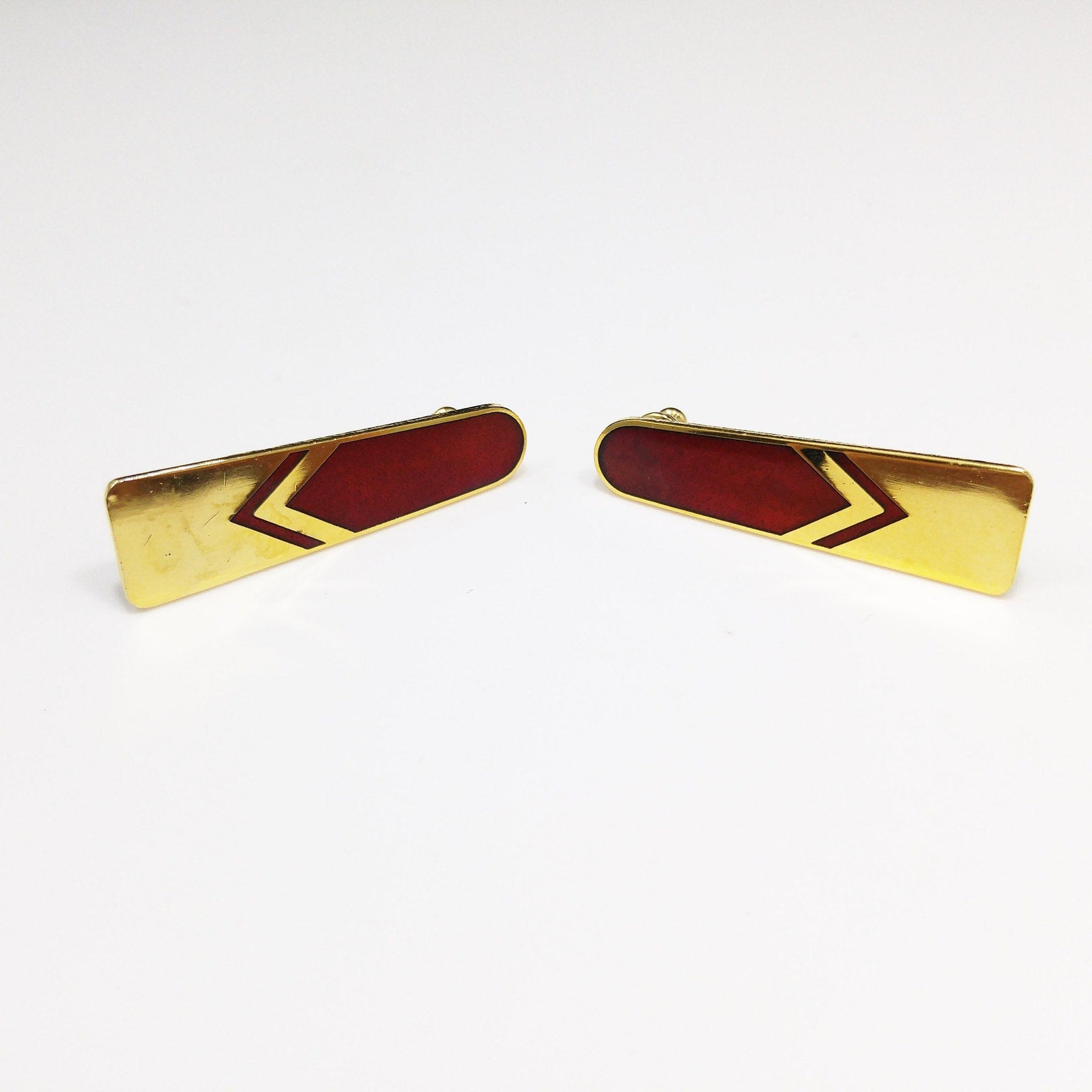 *Description: Beautiful Laurel Burch earrings with a chevron design with the top half a red enamel and the bottom half a very reflective gold plating. Using the cloisonne technique, the red enamel is outlined in a beautiful gold. These earrings have gold-filled posts. They are signed on the back of each earring: Laurel Burch.