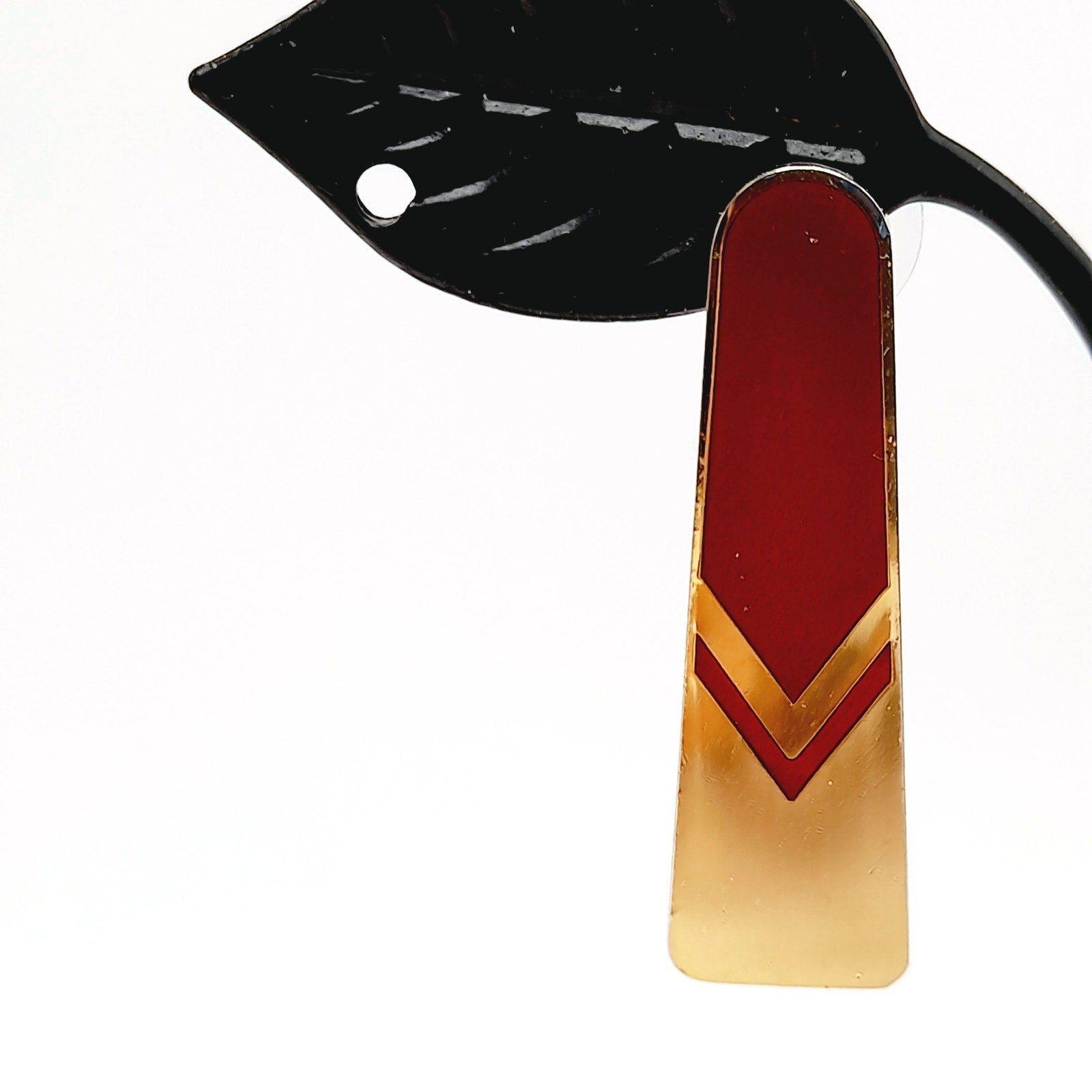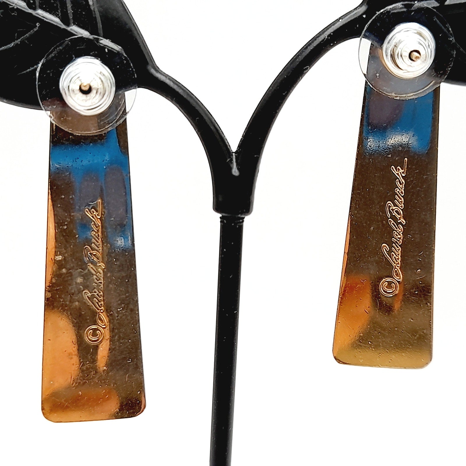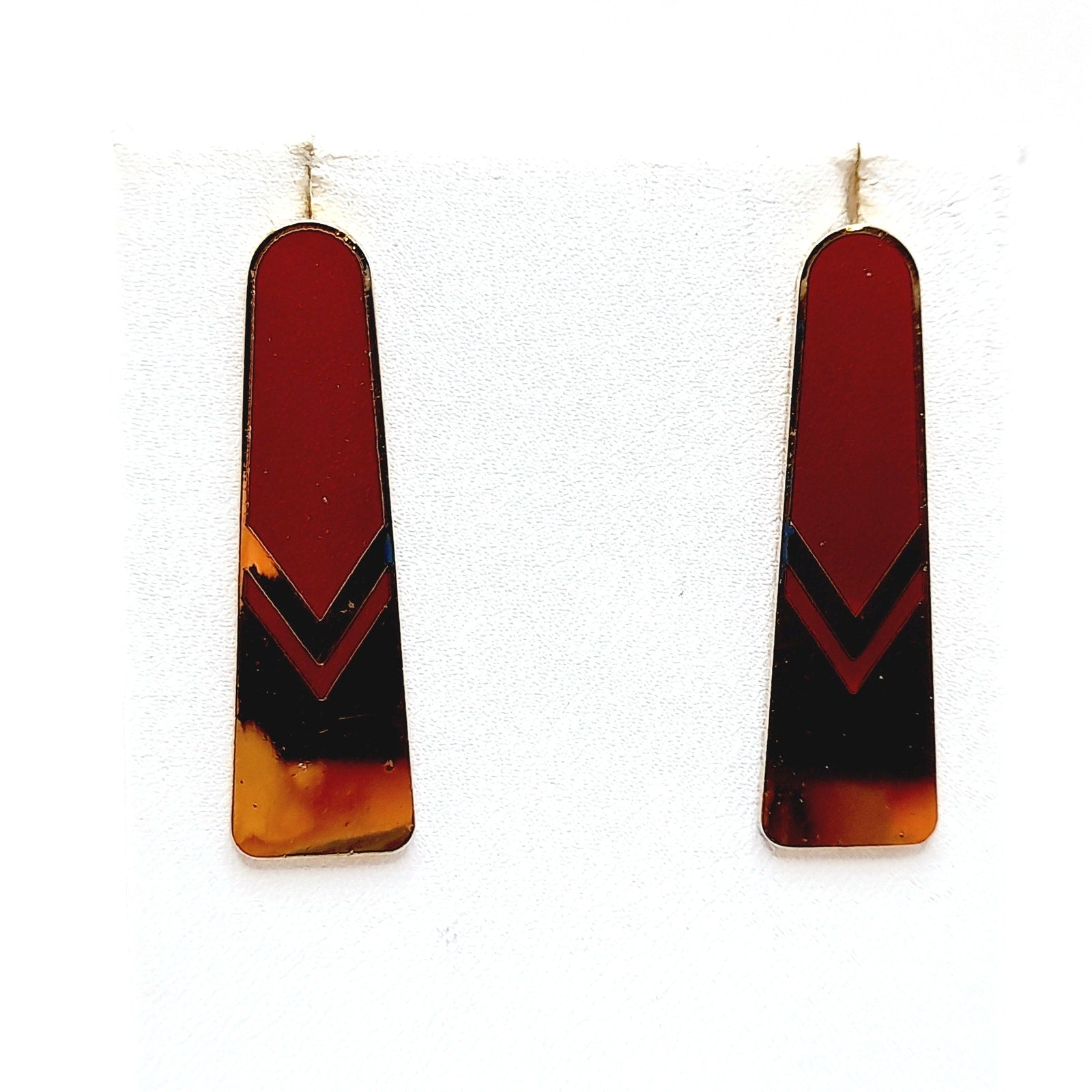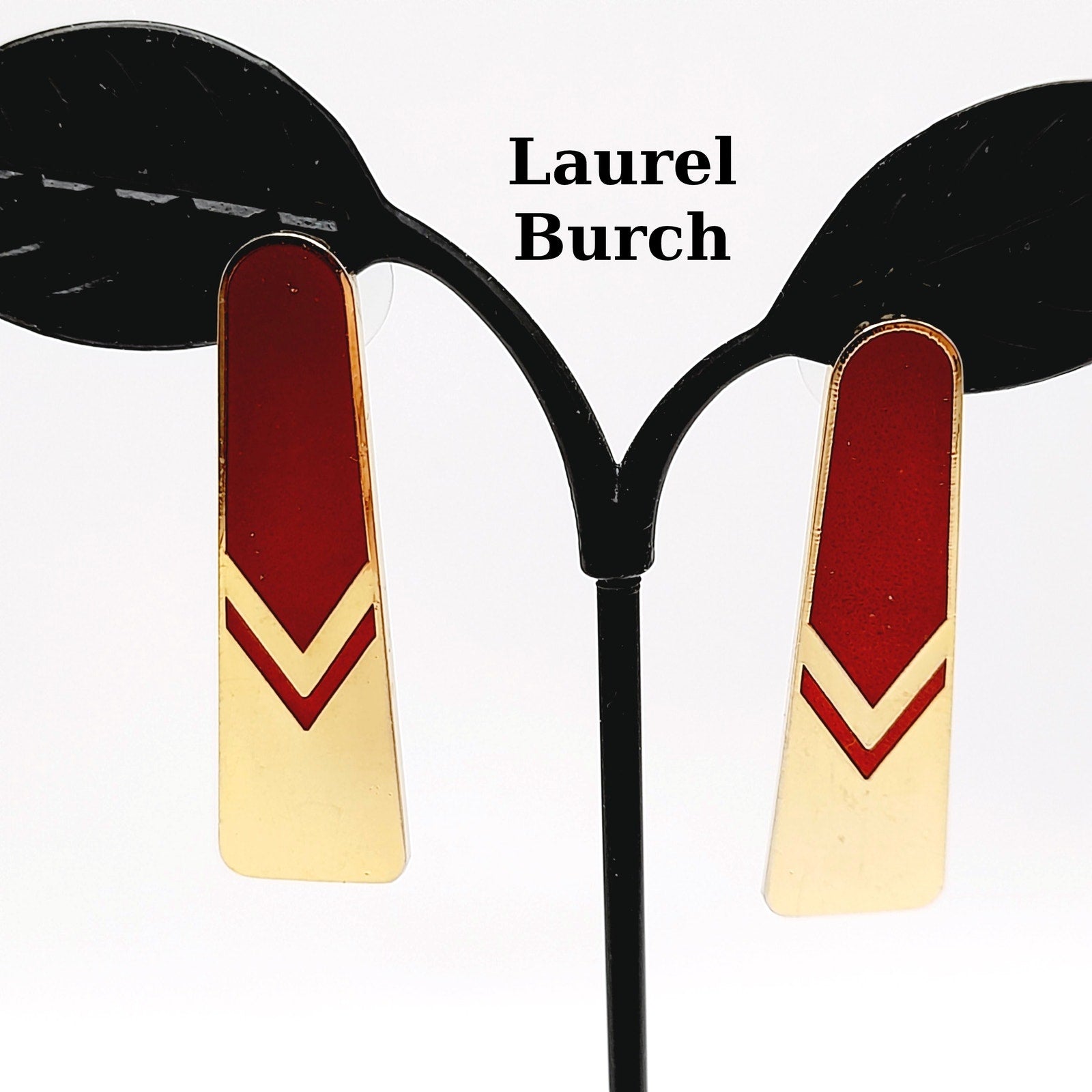 Description: Beautiful Laurel Burch earrings with a chevron design with the top half a red enamel and the bottom half a very reflective gold plating. Using the cloisonne technique, the red enamel is outlined in a beautiful gold. These earrings have gold-filled posts. They are signed on the back of each earring: Laurel Burch.