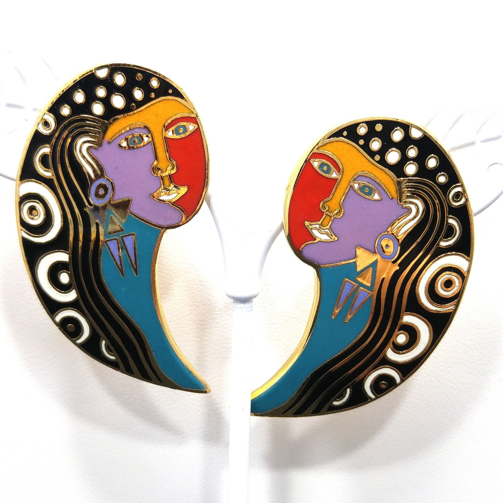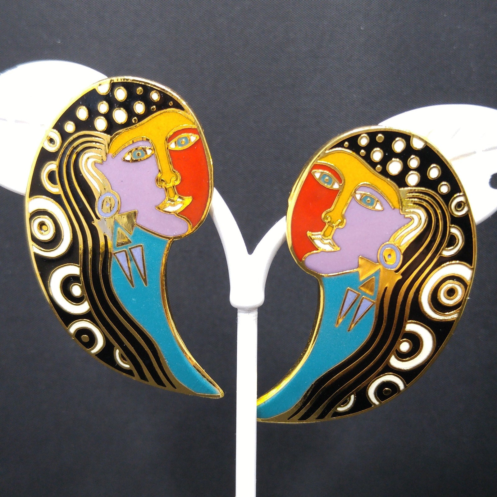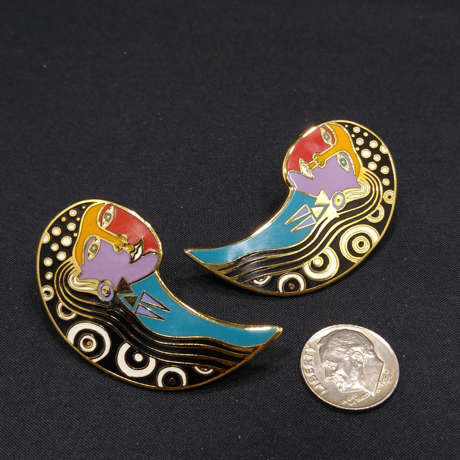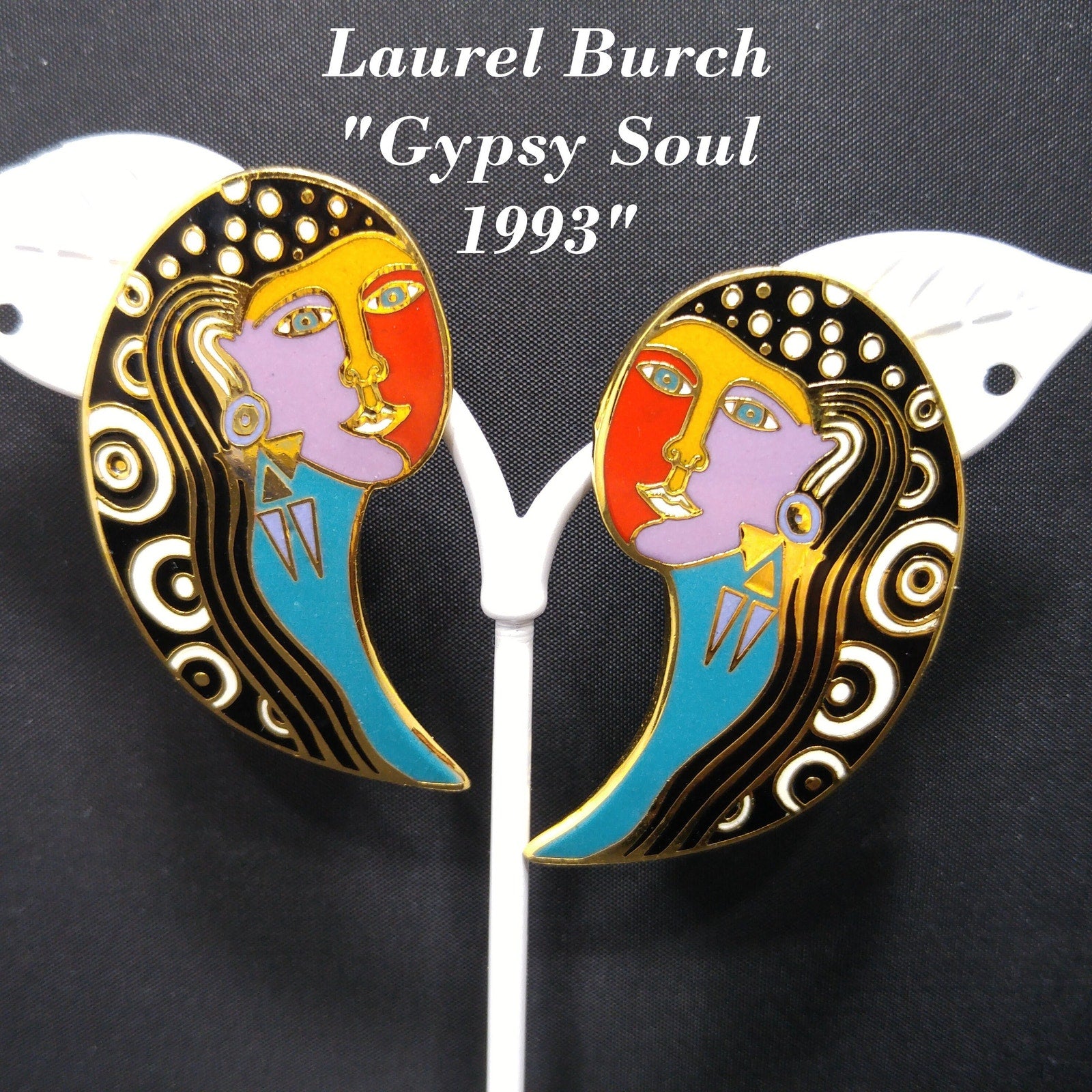*Description: This is a unique pair of Laurel Burch post earrings entitled "Gypsy Soul 1993" in circulation during the 1990s. Each earring has a gypsy face with black, white enamel and gold outlined hair. Her face in red, purple, and yellow enamel with a teal blue blouse. The earring faces look toward each other as a matching pair. The gold plated earrings have the gold cloisonne outlines which accent the design. This would be a great pair of boho earrings for your vintage jewelry collection and would also make a great gift.