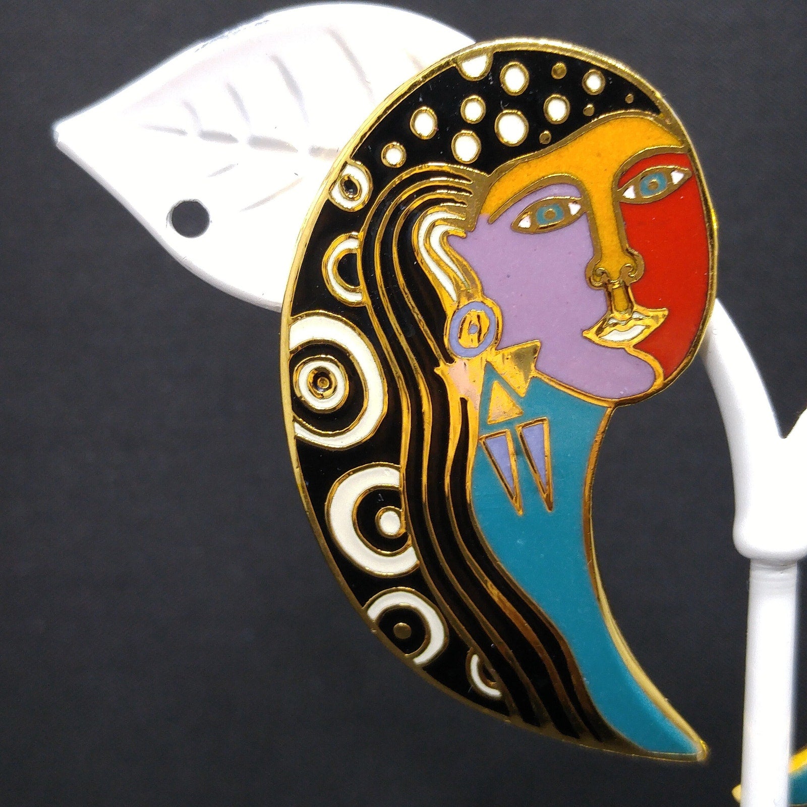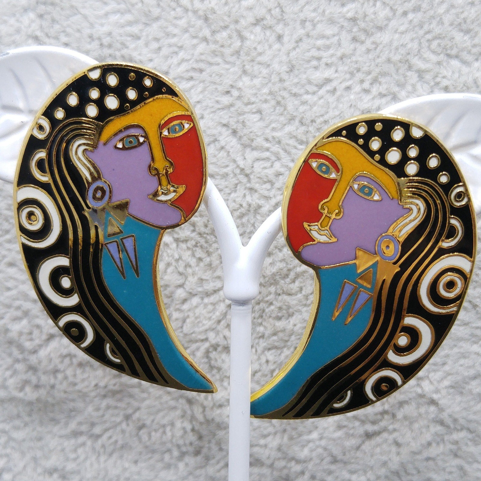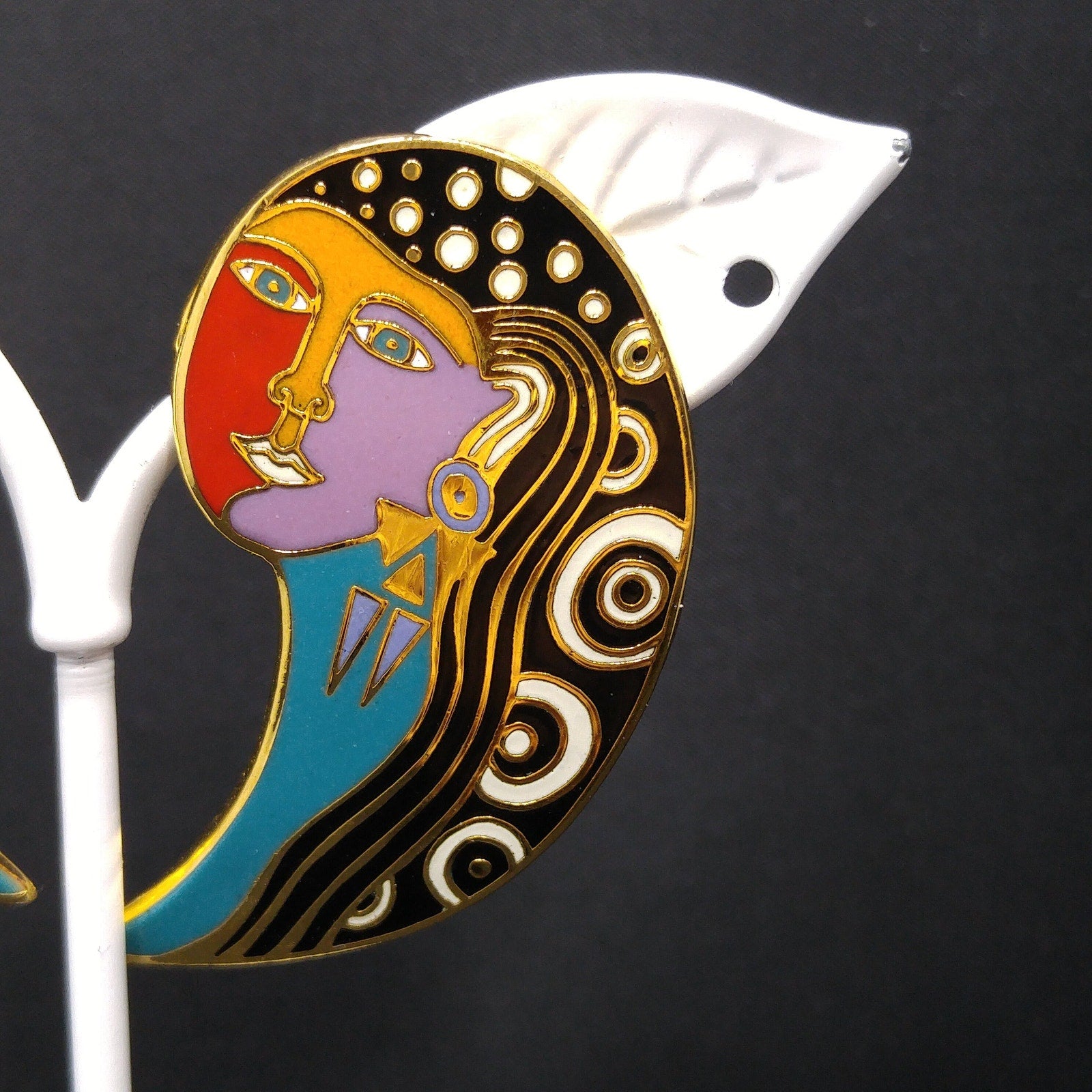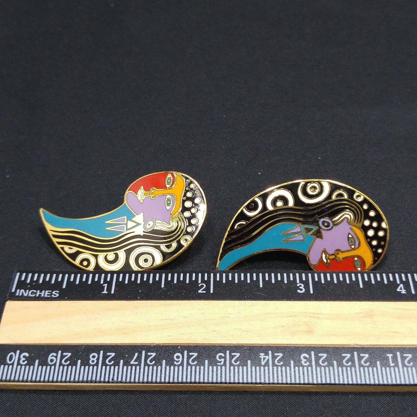 *Description: This is a unique pair of Laurel Burch post earrings entitled "Gypsy Soul 1993" in circulation during the 1990s. Each earring has a gypsy face with black, white enamel and gold outlined hair. Her face in red, purple, and yellow enamel with a teal blue blouse. The earring faces look toward each other as a matching pair. The gold plated earrings have the gold cloisonne outlines which accent the design. This would be a great pair of boho earrings for your vintage jewelry collection and would also make a great gift.