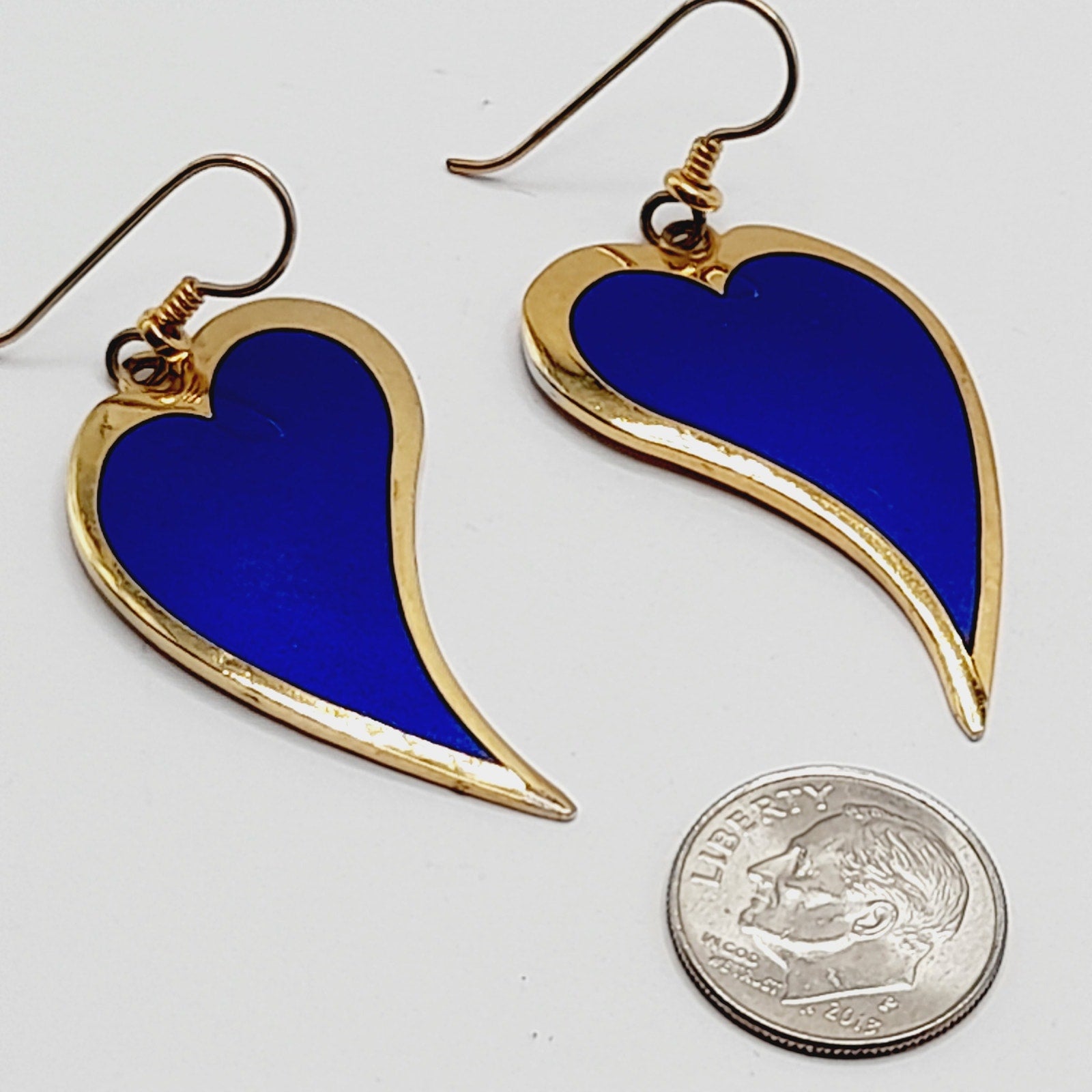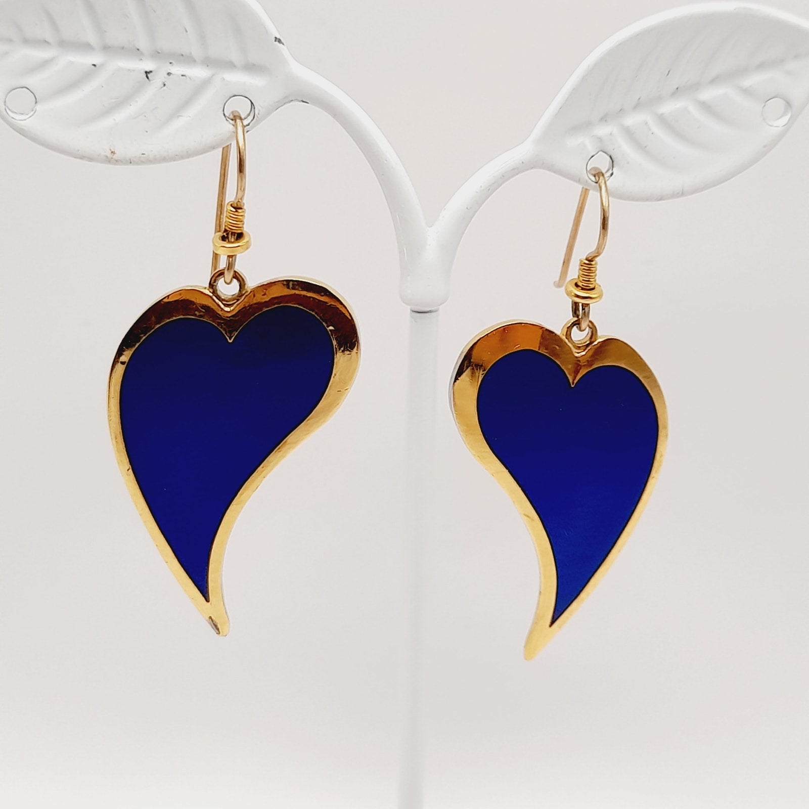 Vintage Laurel Burch Heart Dangle Earrings, Blue Enamel, Gold Plated, 2 Inches