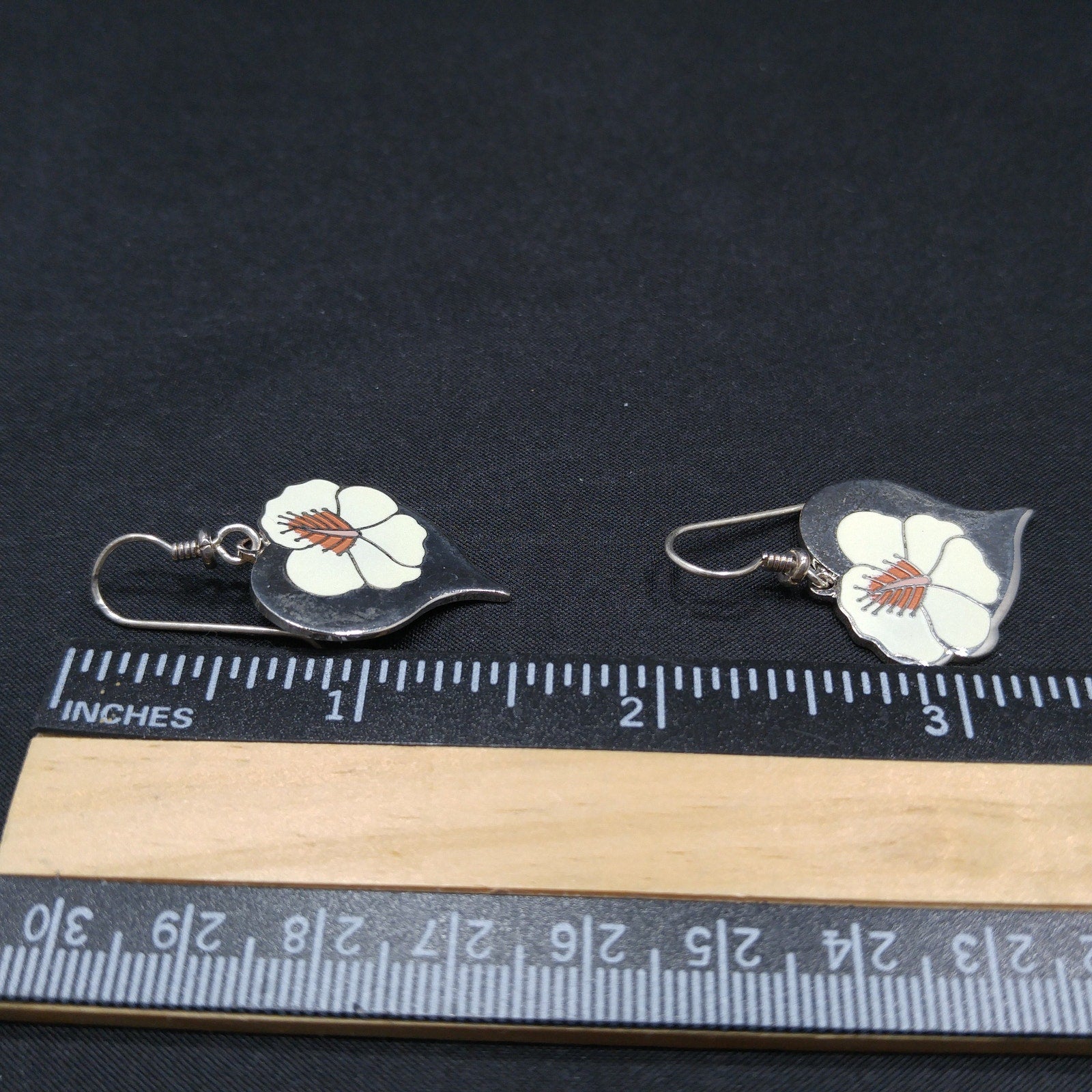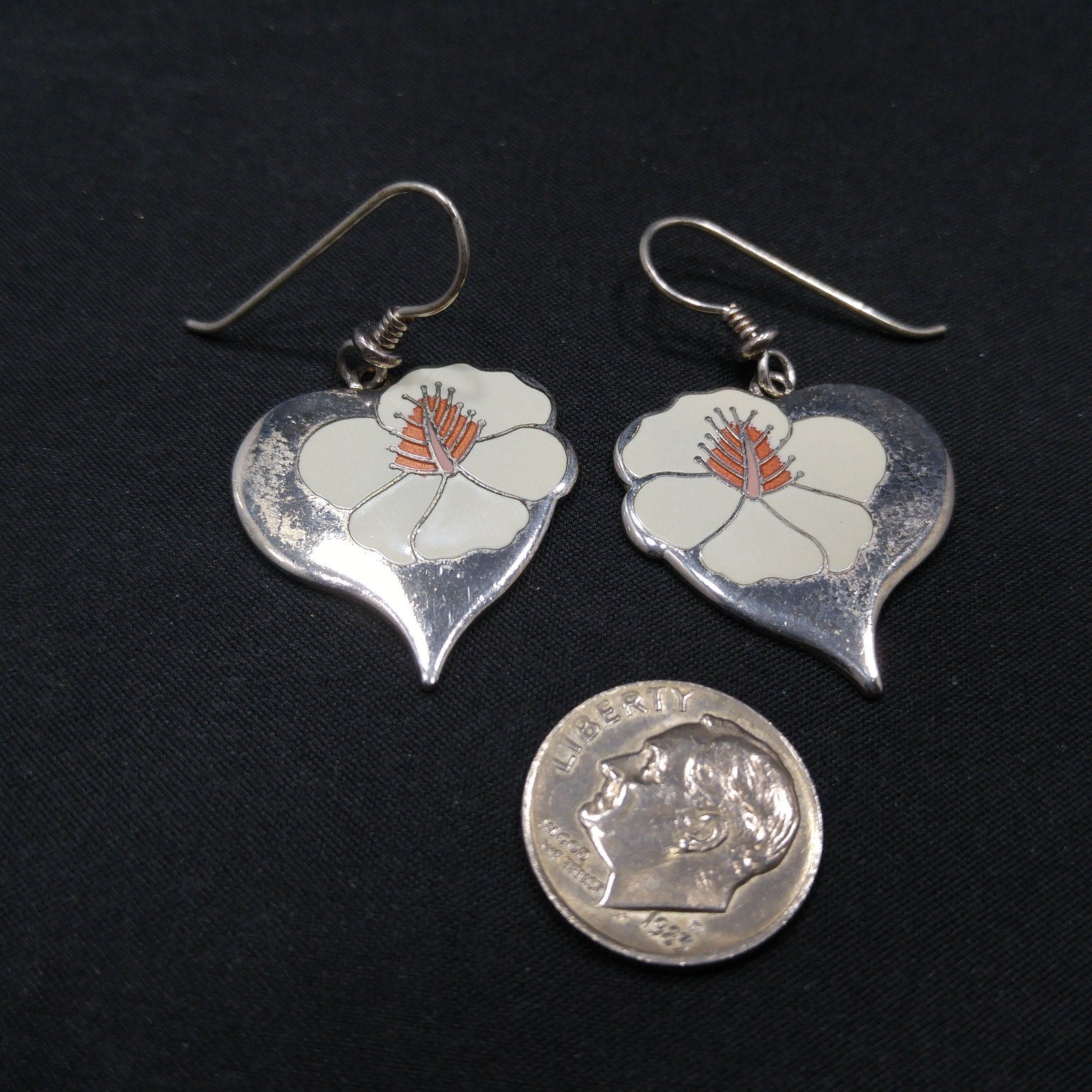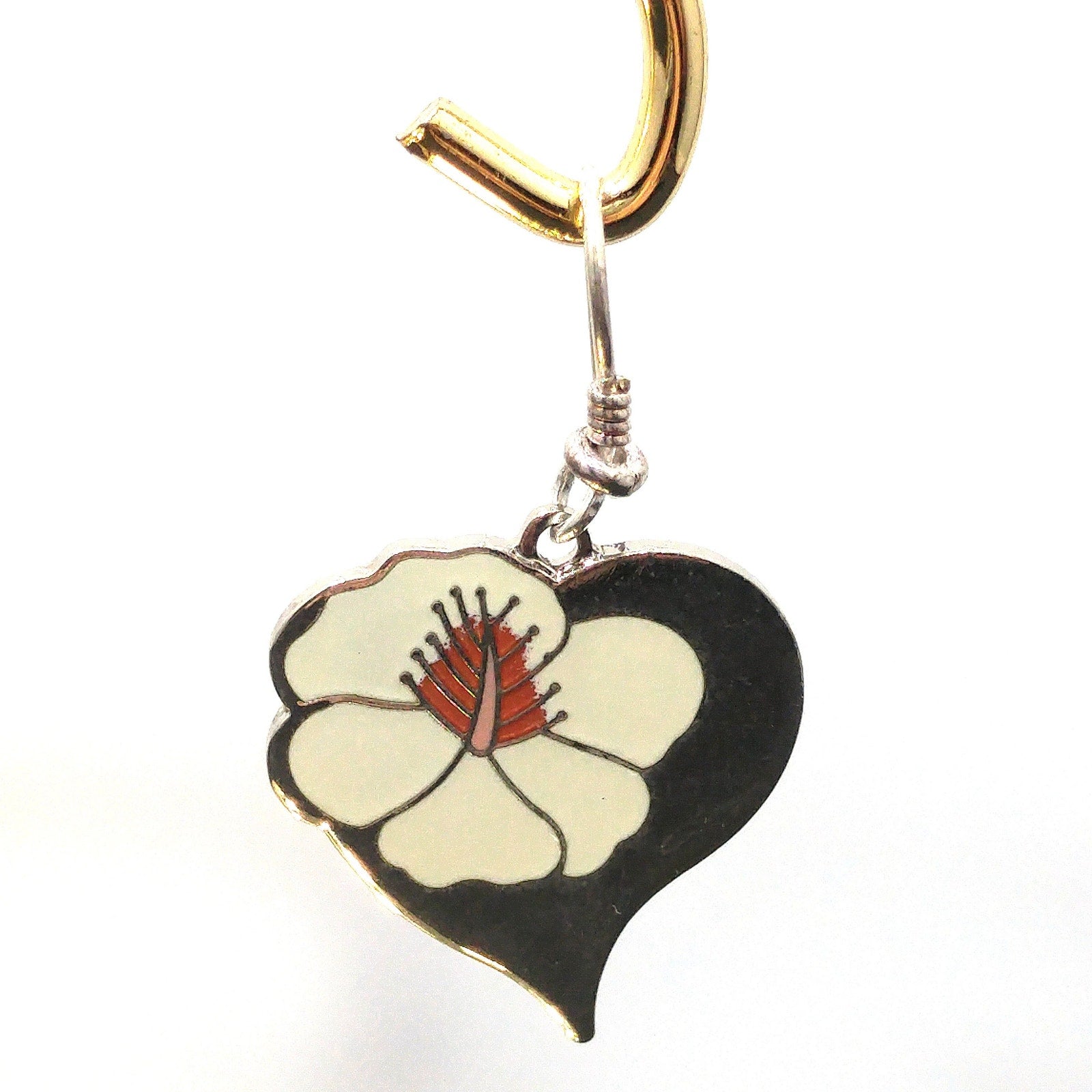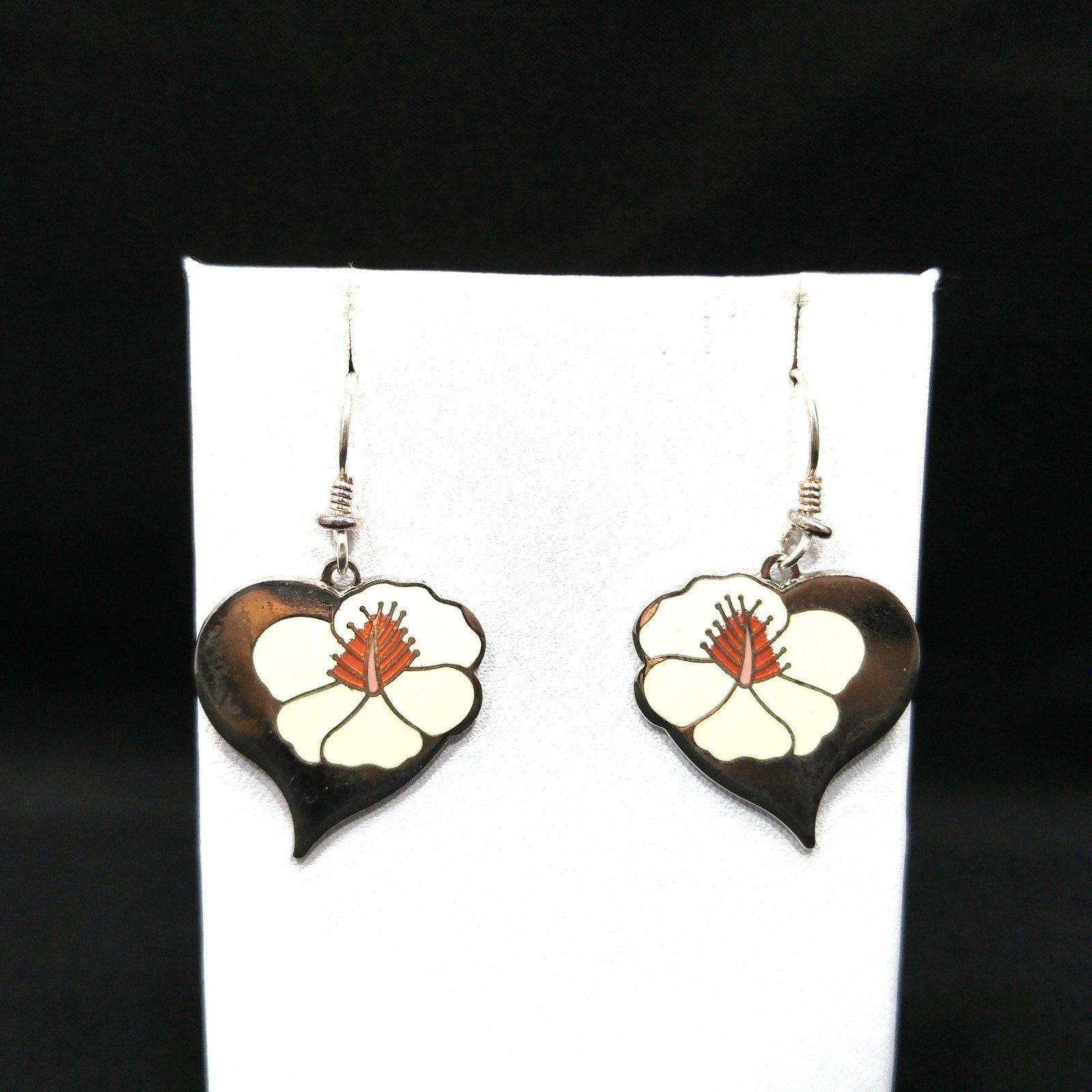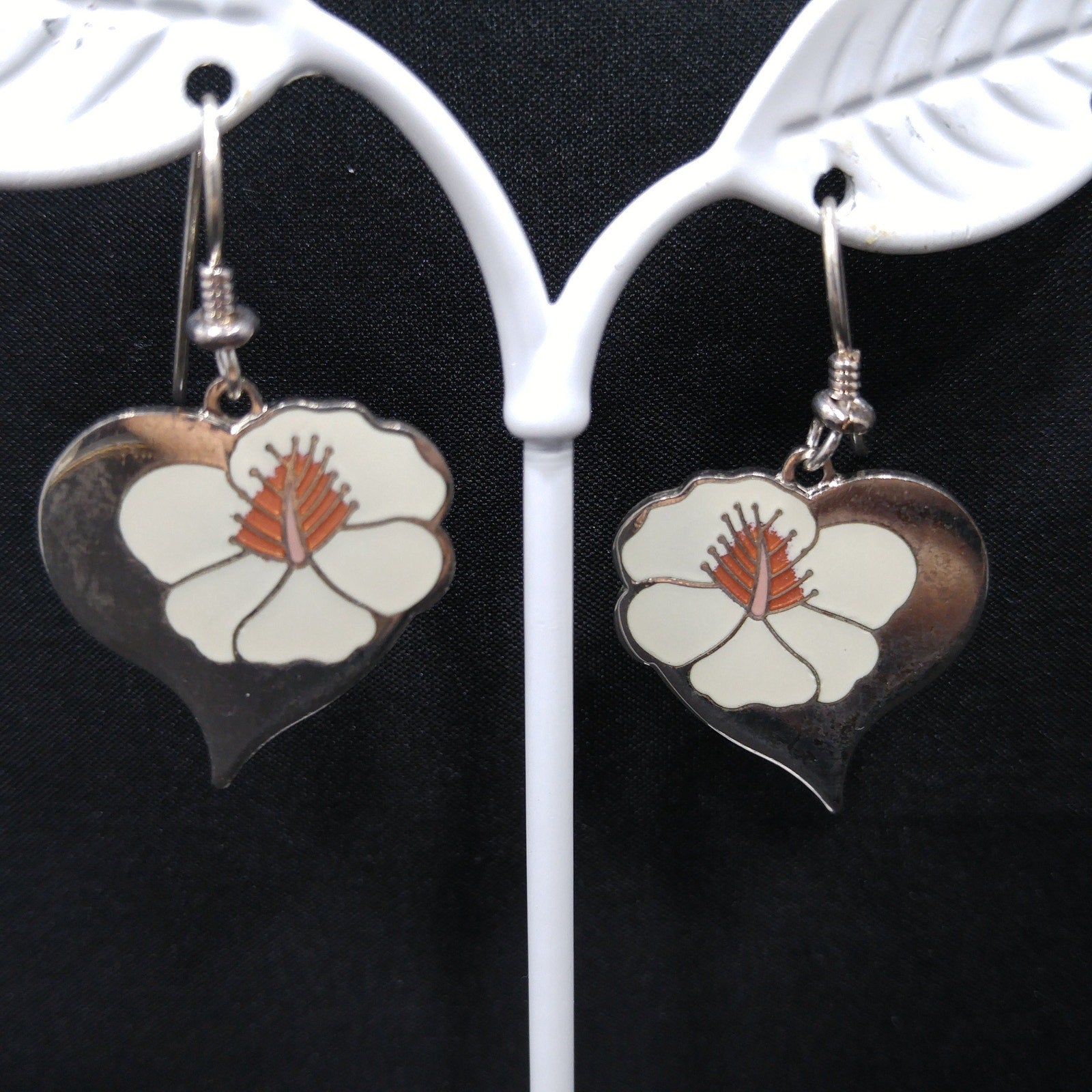 *Description: This is a beautiful pair of Laurel Burch "Hibiscus Heart" dangle earrings in rhodium plating cloisonne and enamel in creamy white, orange, and gold, from the 1980s. The silver tone rhodium is highly reflective. The ear wires are gold filled and each of the earrings are stamped with the designers name and design. This would be a great addition to your vintage jewelry collection or make a great vintage gift!