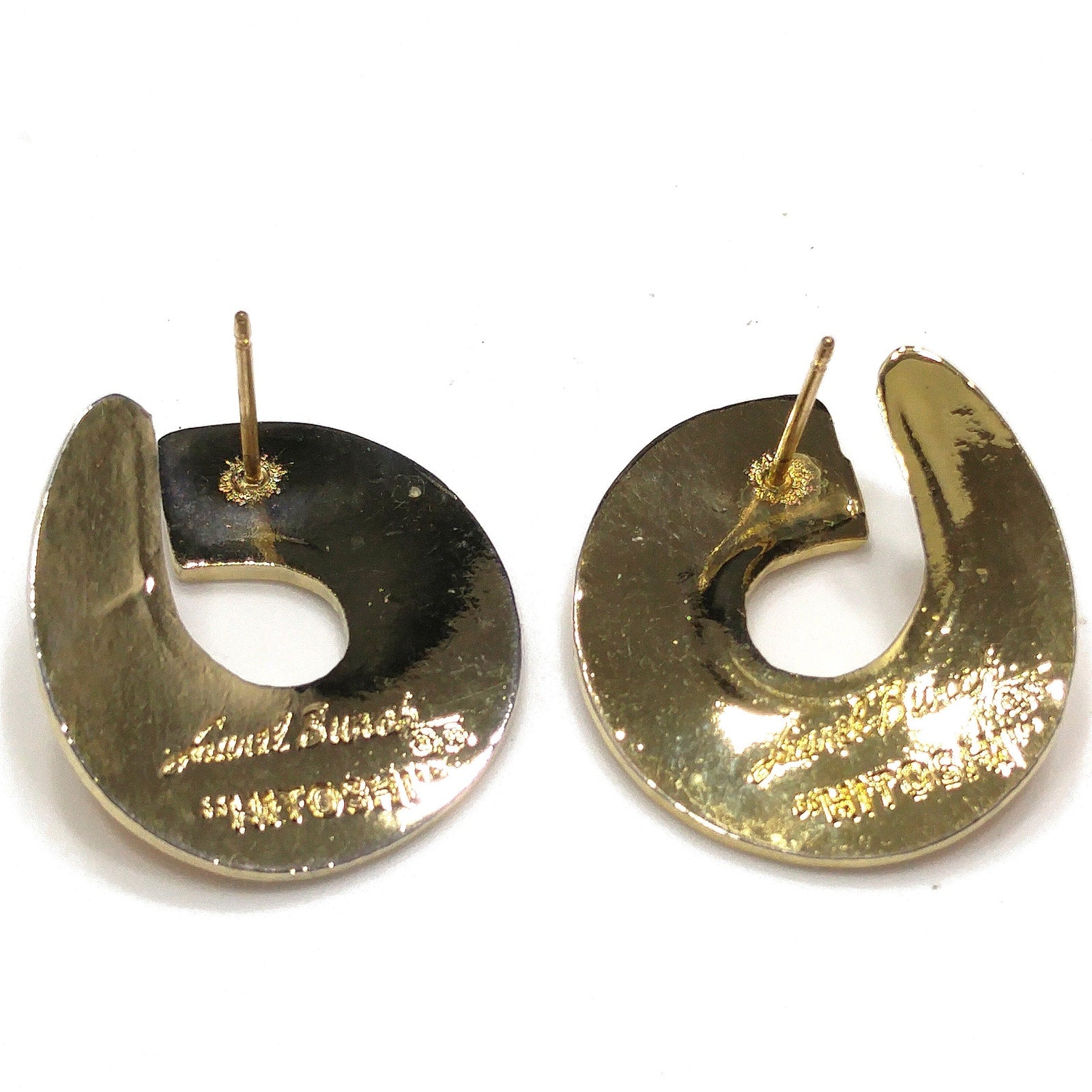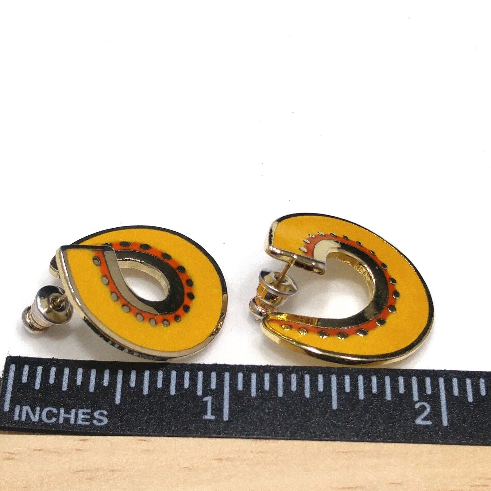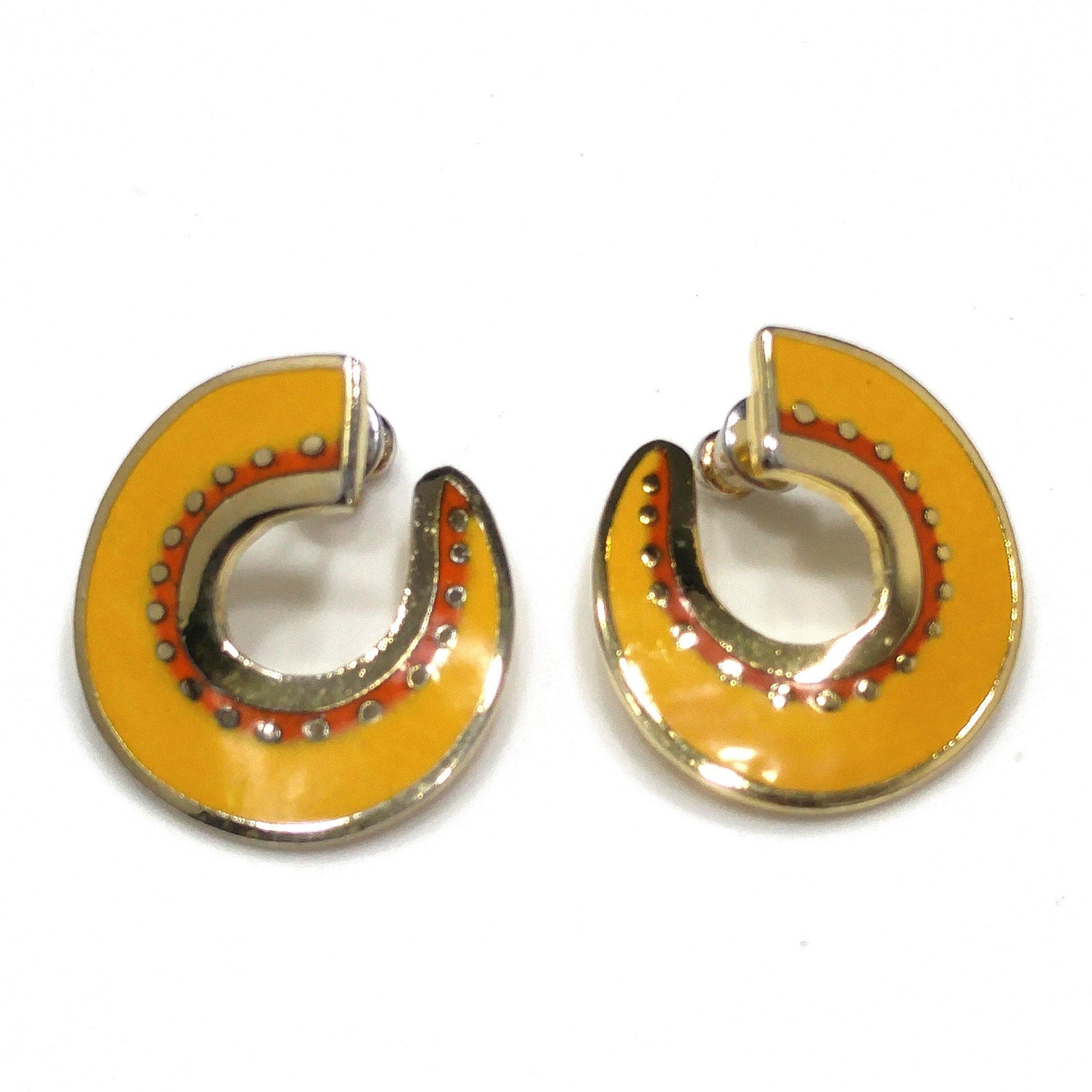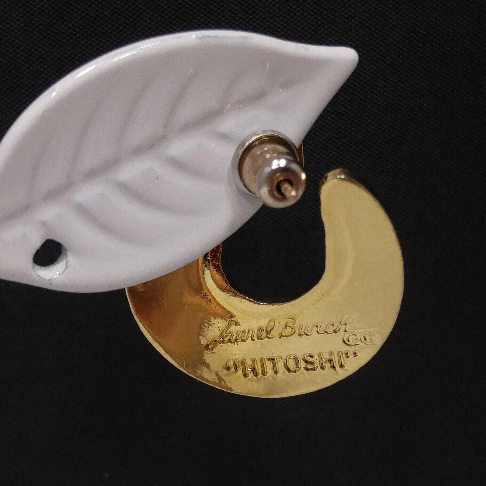 *Description: This is a great pair of Laurel Burch "Hitoshi" post earrings from the 1980s. They are a golden yellow enamel with small traces of red orange and outlined in gold plate. The earrings curve around the ear with the yellow enamel on the top and the gold plated metal outlines and on the back. Each earring is stamped LAUREL BURCH and HITOSHI. This would be a great addition to your vintage jewelry collection or make a great vintage gift!