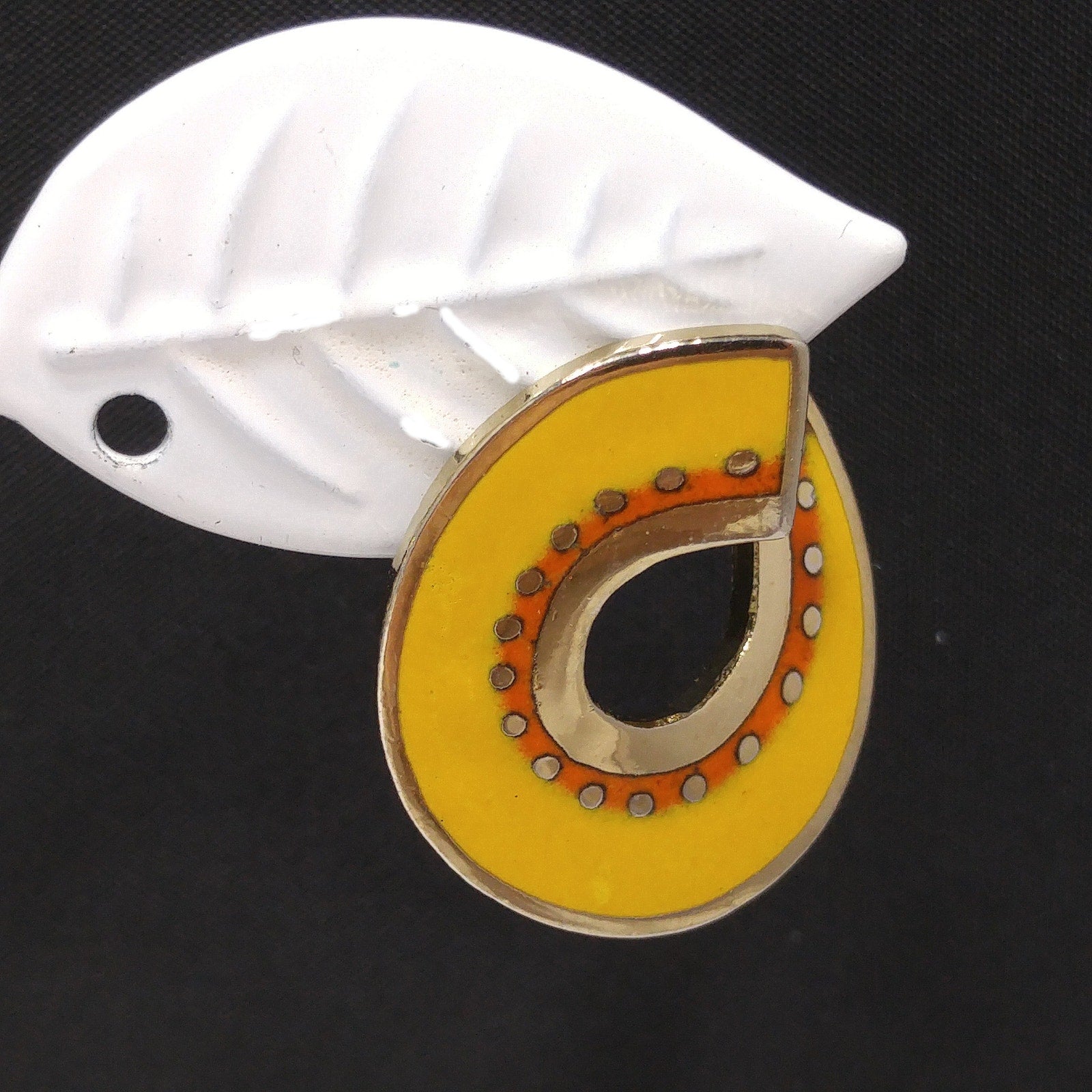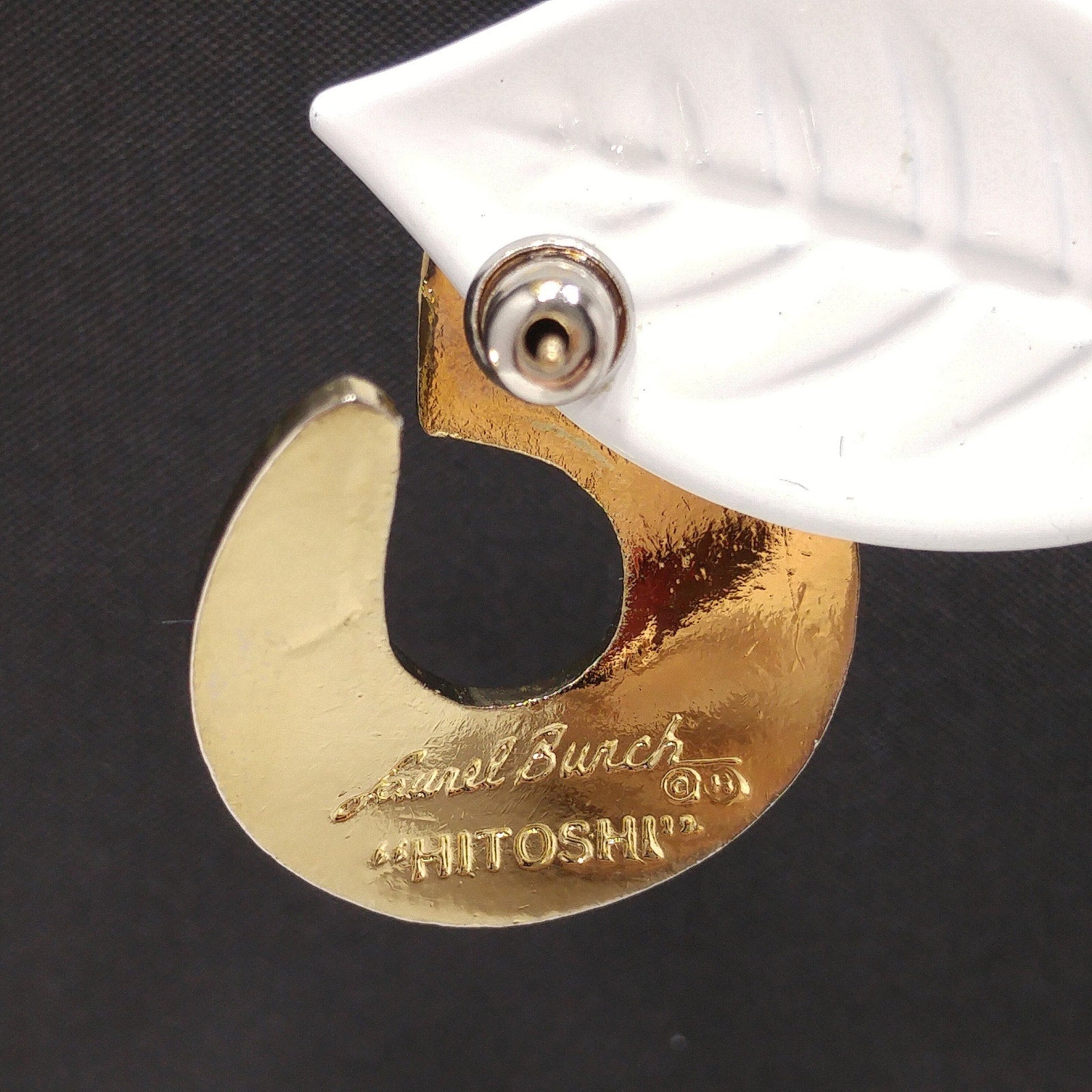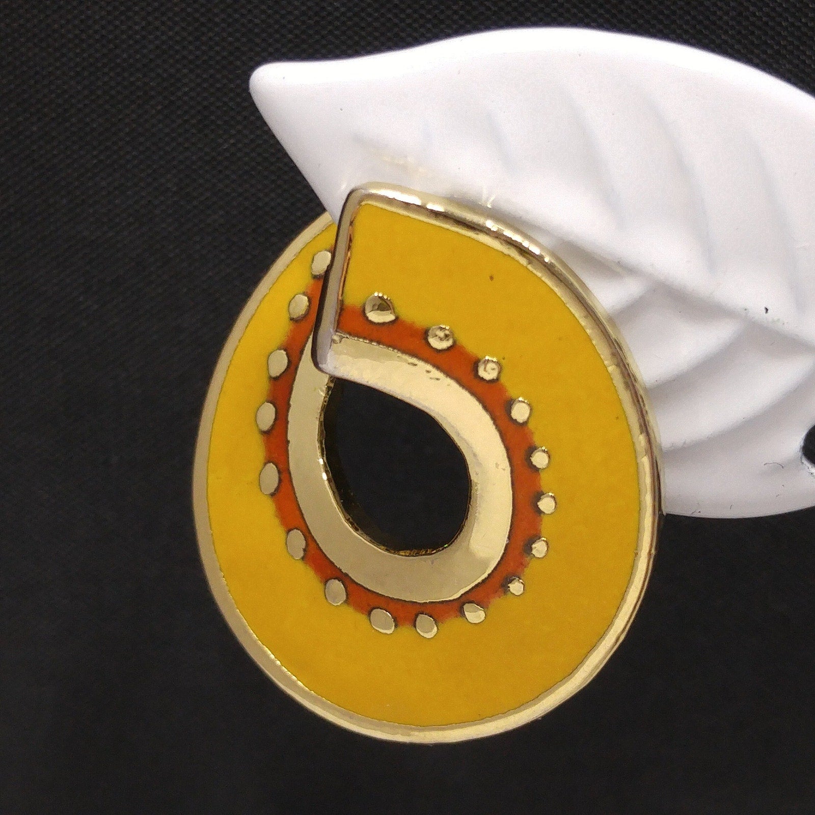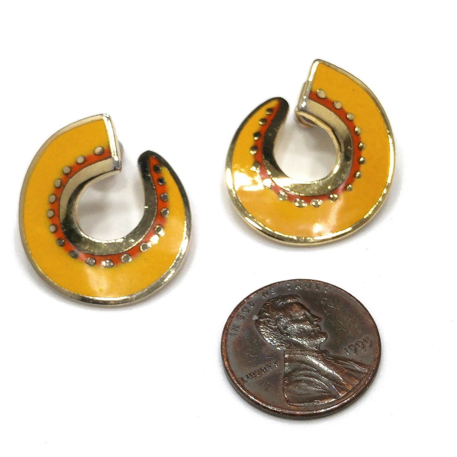 *Description: This is a great pair of Laurel Burch "Hitoshi" post earrings from the 1980s. They are a golden yellow enamel with small traces of red orange and outlined in gold plate. The earrings curve around the ear with the yellow enamel on the top and the gold plated metal outlines and on the back. Each earring is stamped LAUREL BURCH and HITOSHI. This would be a great addition to your vintage jewelry collection or make a great vintage gift!
