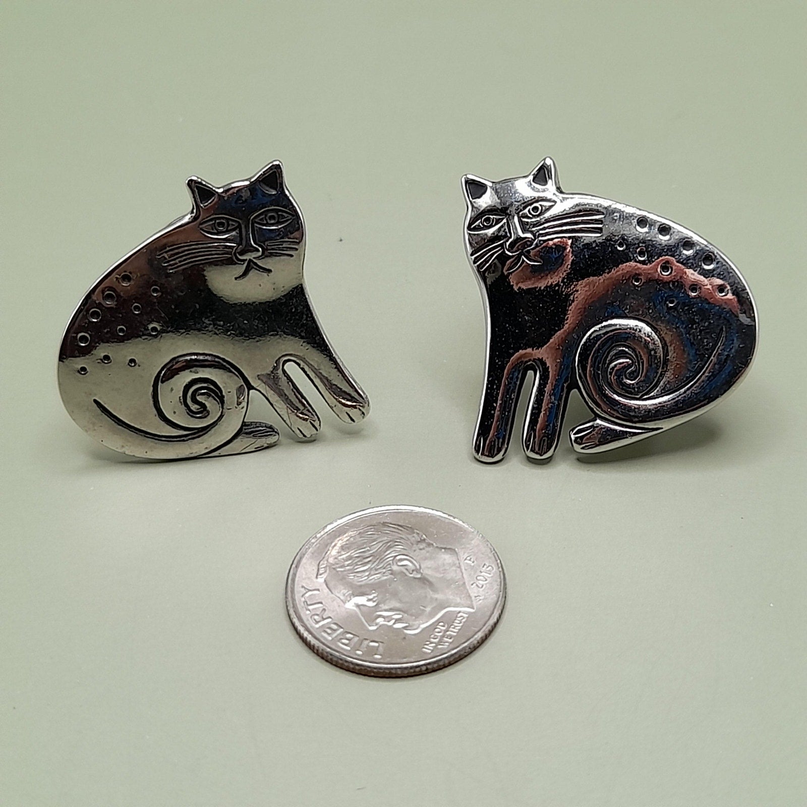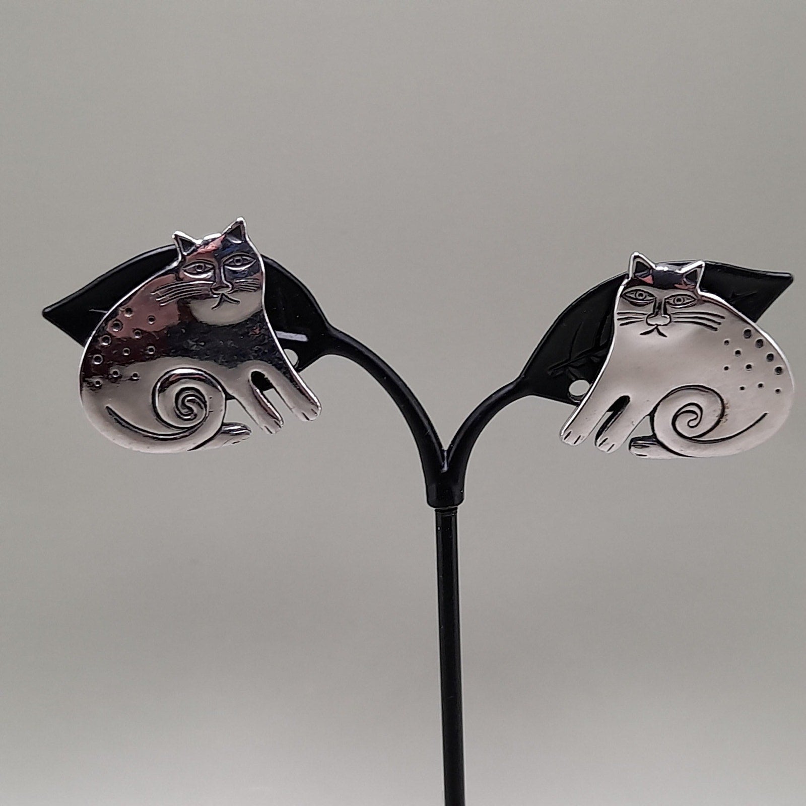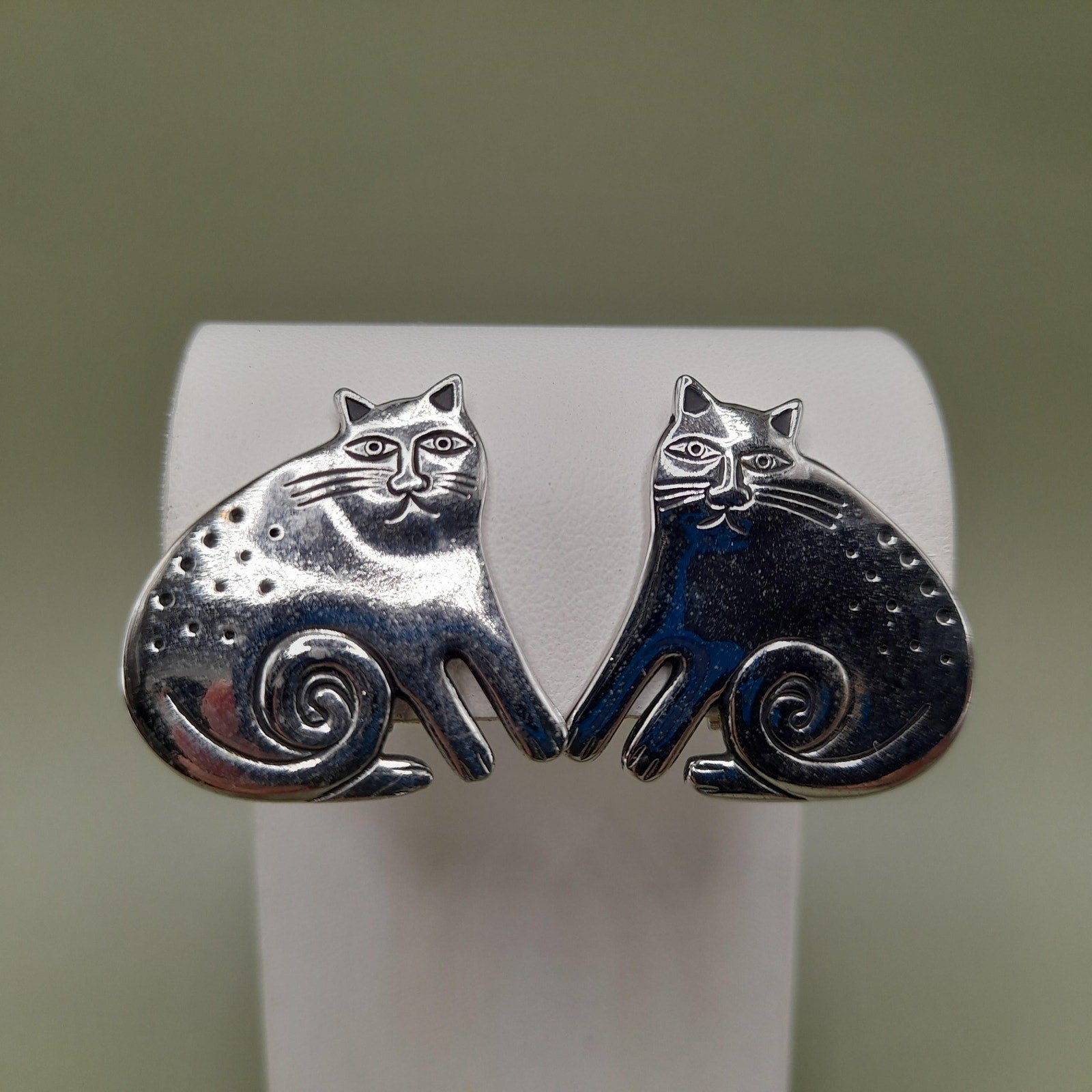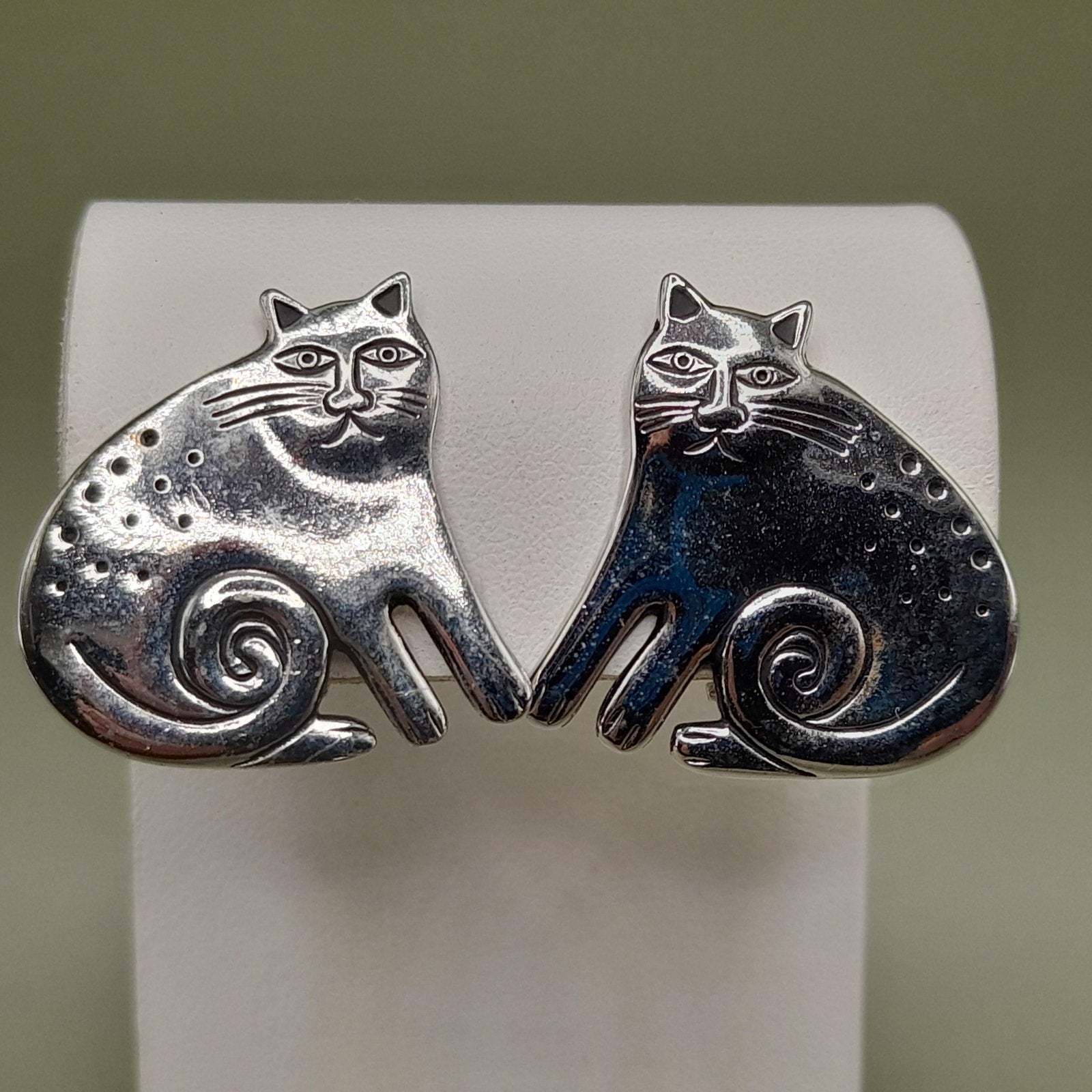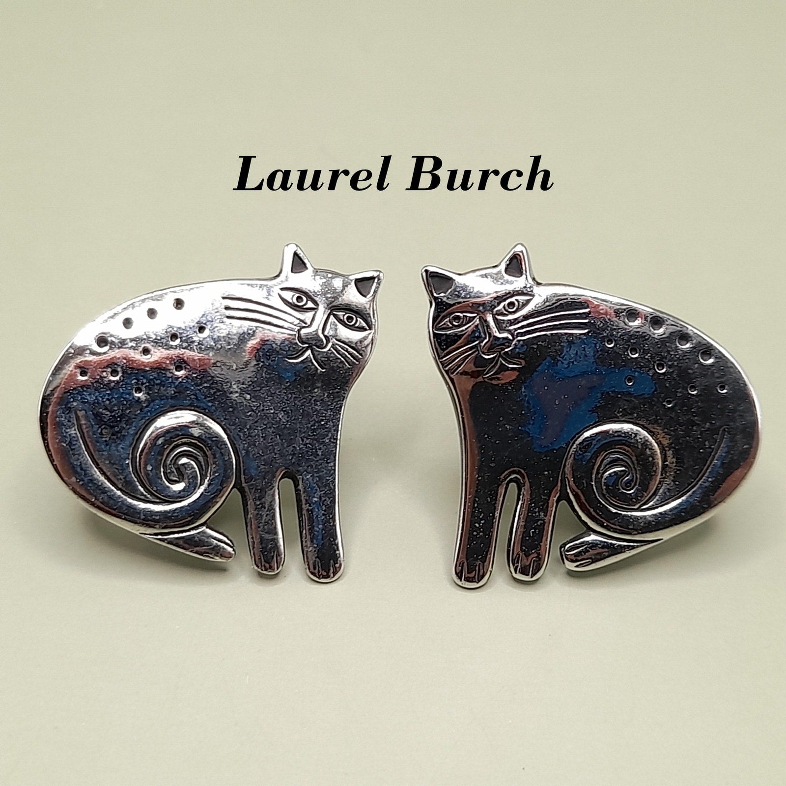 *Description: This is a great pair of vintage Laurel Burch Keshire Cat rhodium plated clip on earrings from the 1980s. The clips are not tight due to their wire construction but stay on my ears successfully; so they would be comfortable to wear for extended periods. These cat earrings are stamped Laurel Burch and no design name is stamped on the back as they were one of the earlier earrings of the Keshire Cat design. There is a small amount of black enamel inside the design lines. This would be a great addition to your vintage jewelry collection or make a great vintage gift!