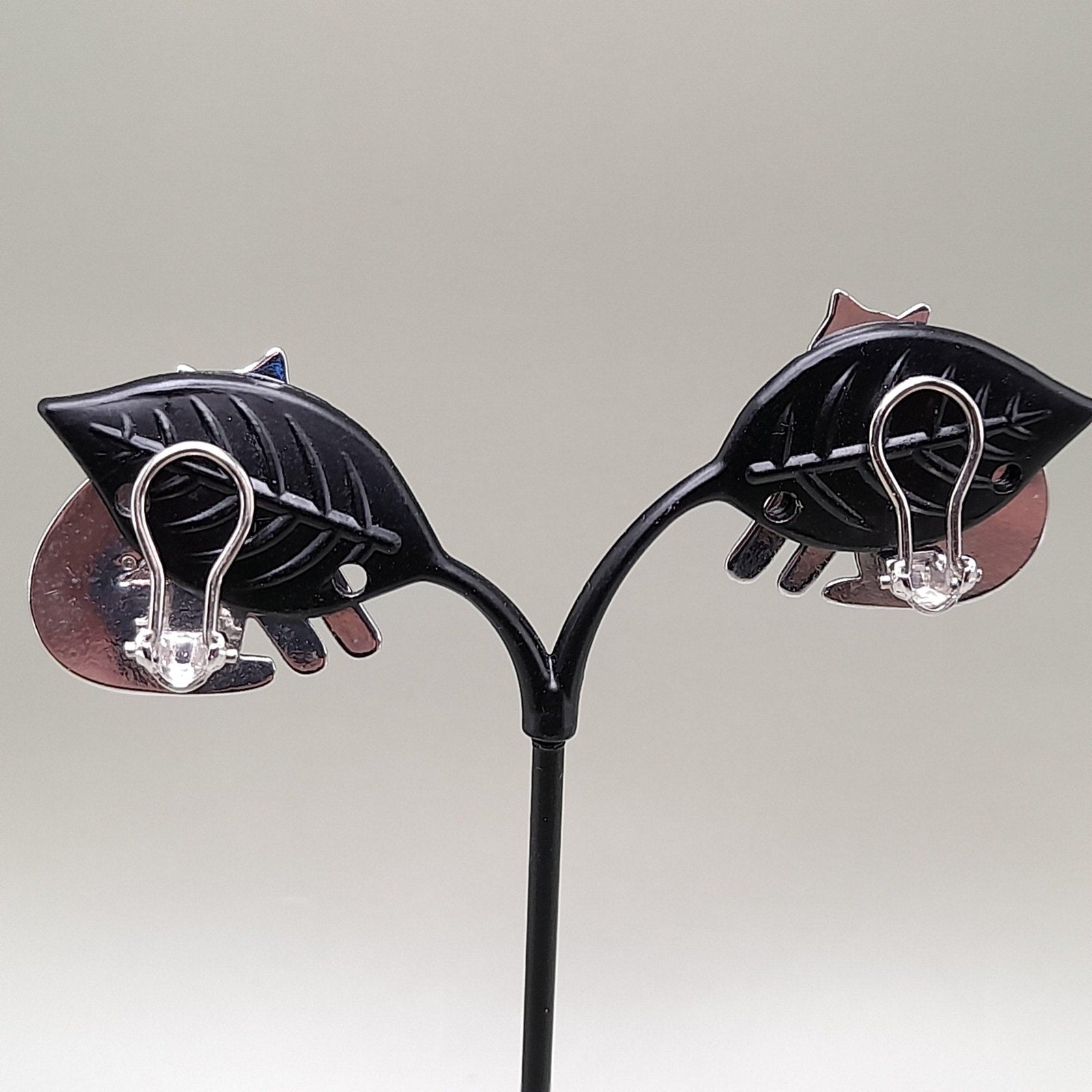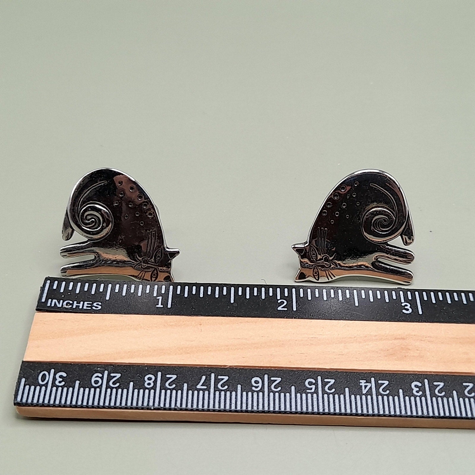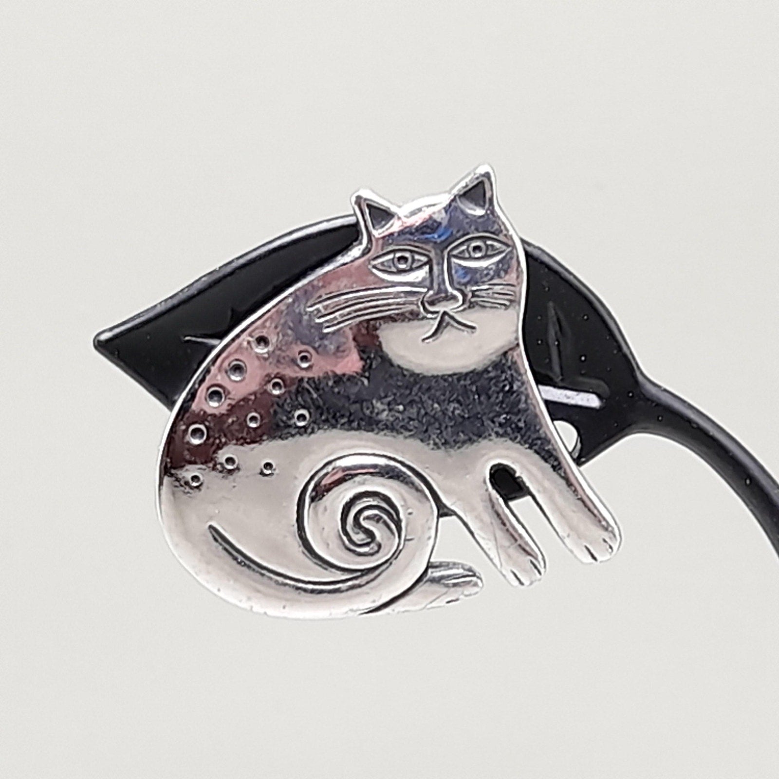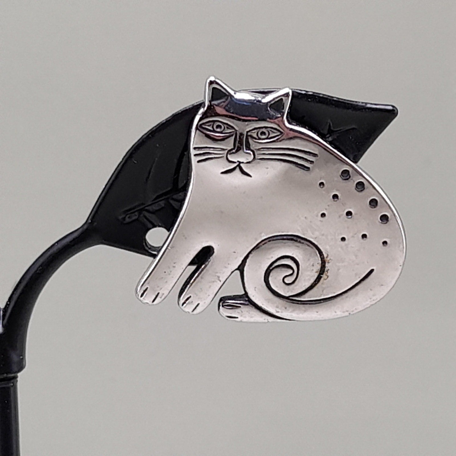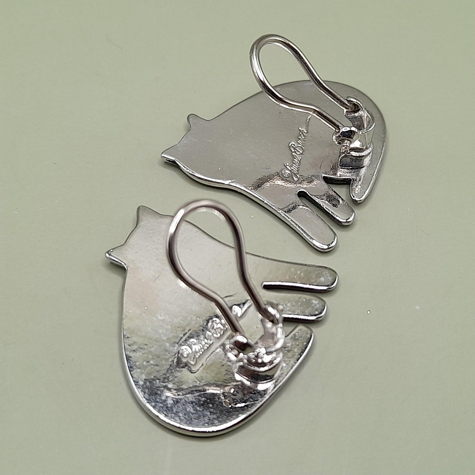 *Description: This is a great pair of vintage Laurel Burch Keshire Cat rhodium plated clip on earrings from the 1980s. The clips are not tight due to their wire construction but stay on my ears successfully; so they would be comfortable to wear for extended periods. These cat earrings are stamped Laurel Burch and no design name is stamped on the back as they were one of the earlier earrings of the Keshire Cat design. There is a small amount of black enamel inside the design lines. This would be a great addition to your vintage jewelry collection or make a great vintage gift!