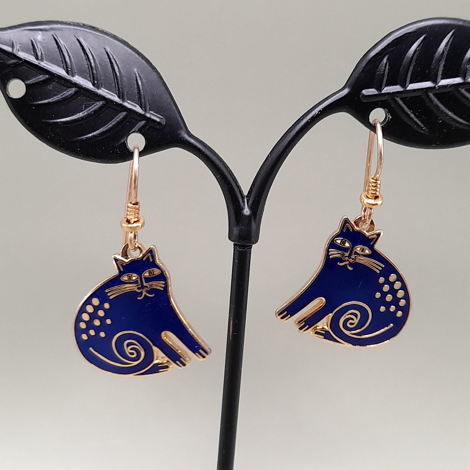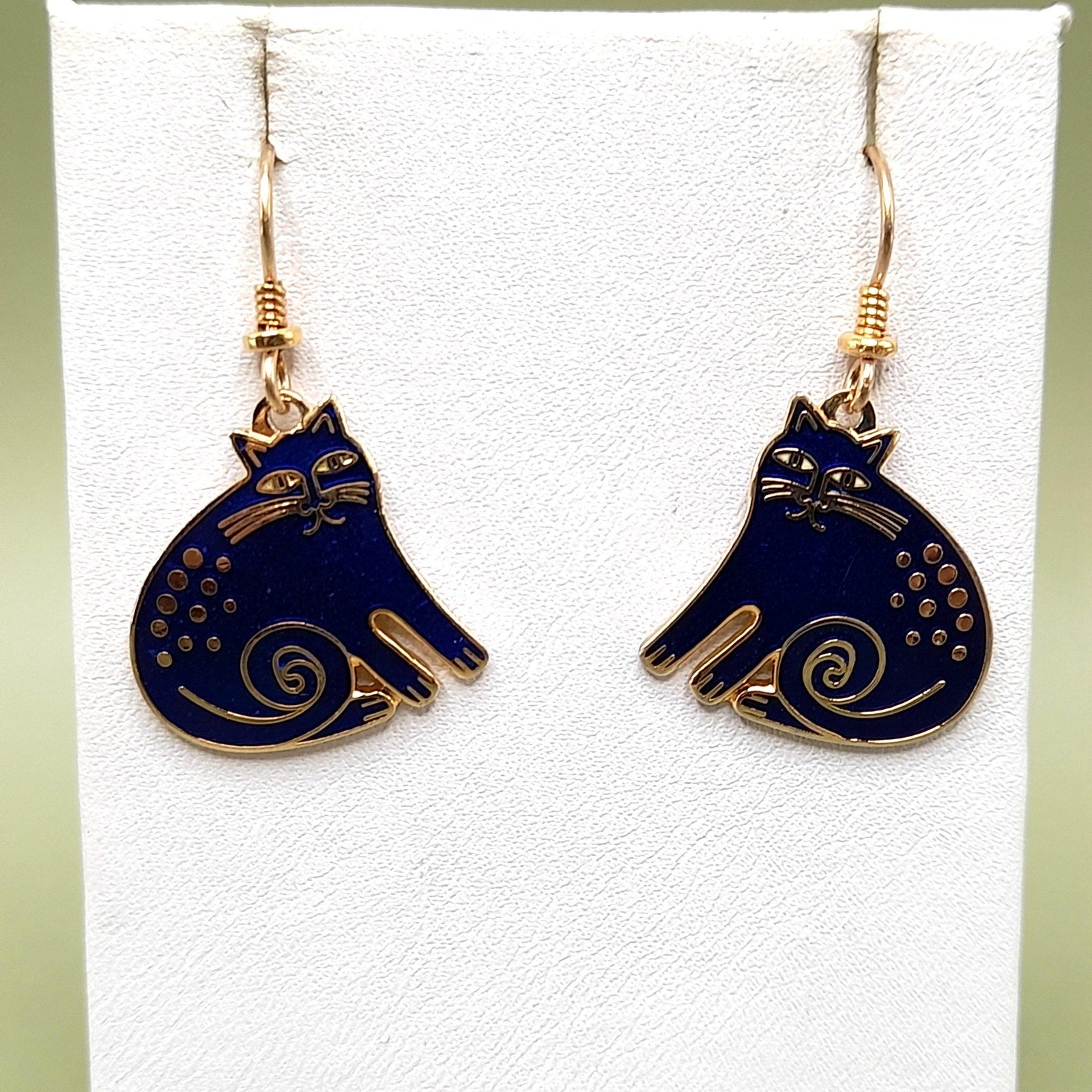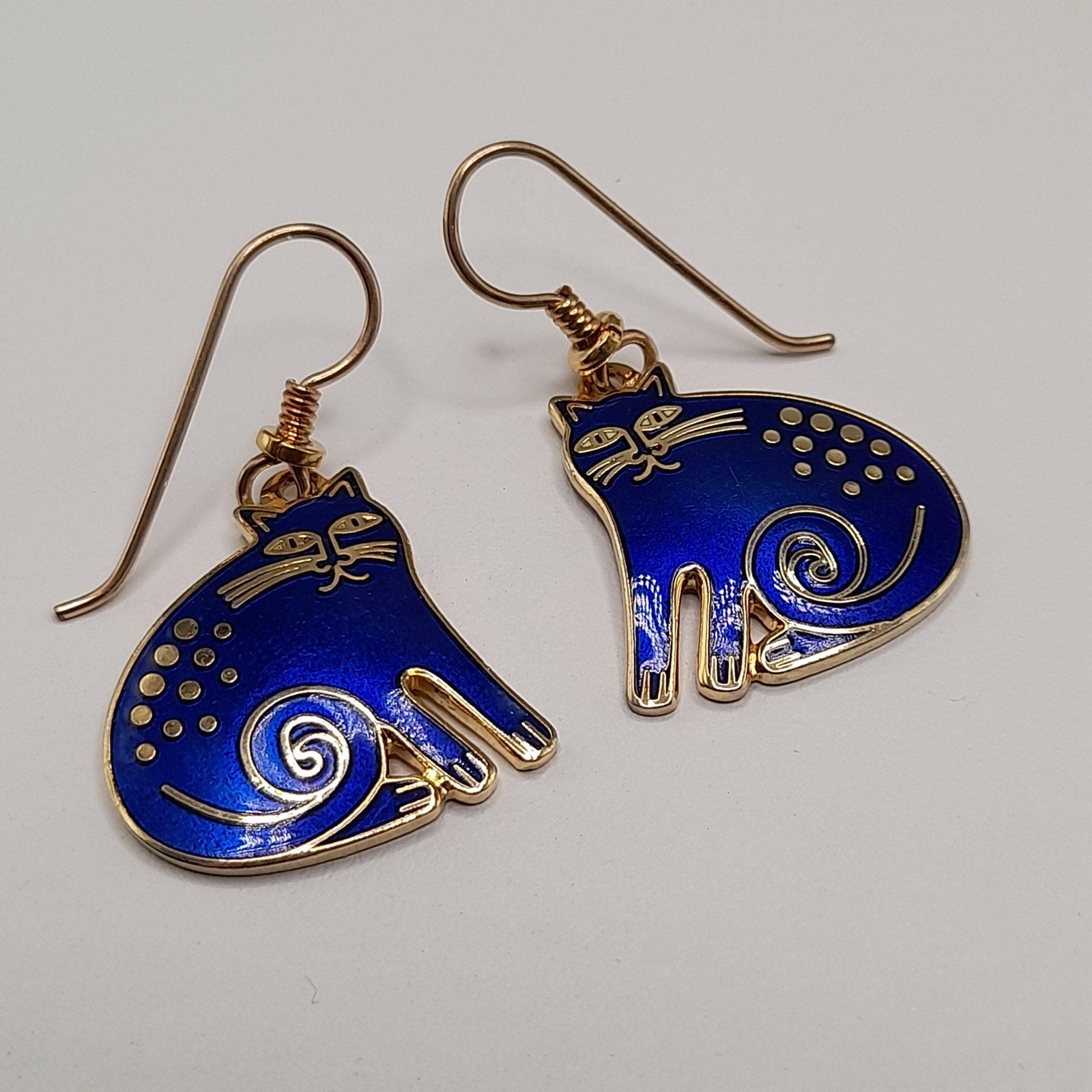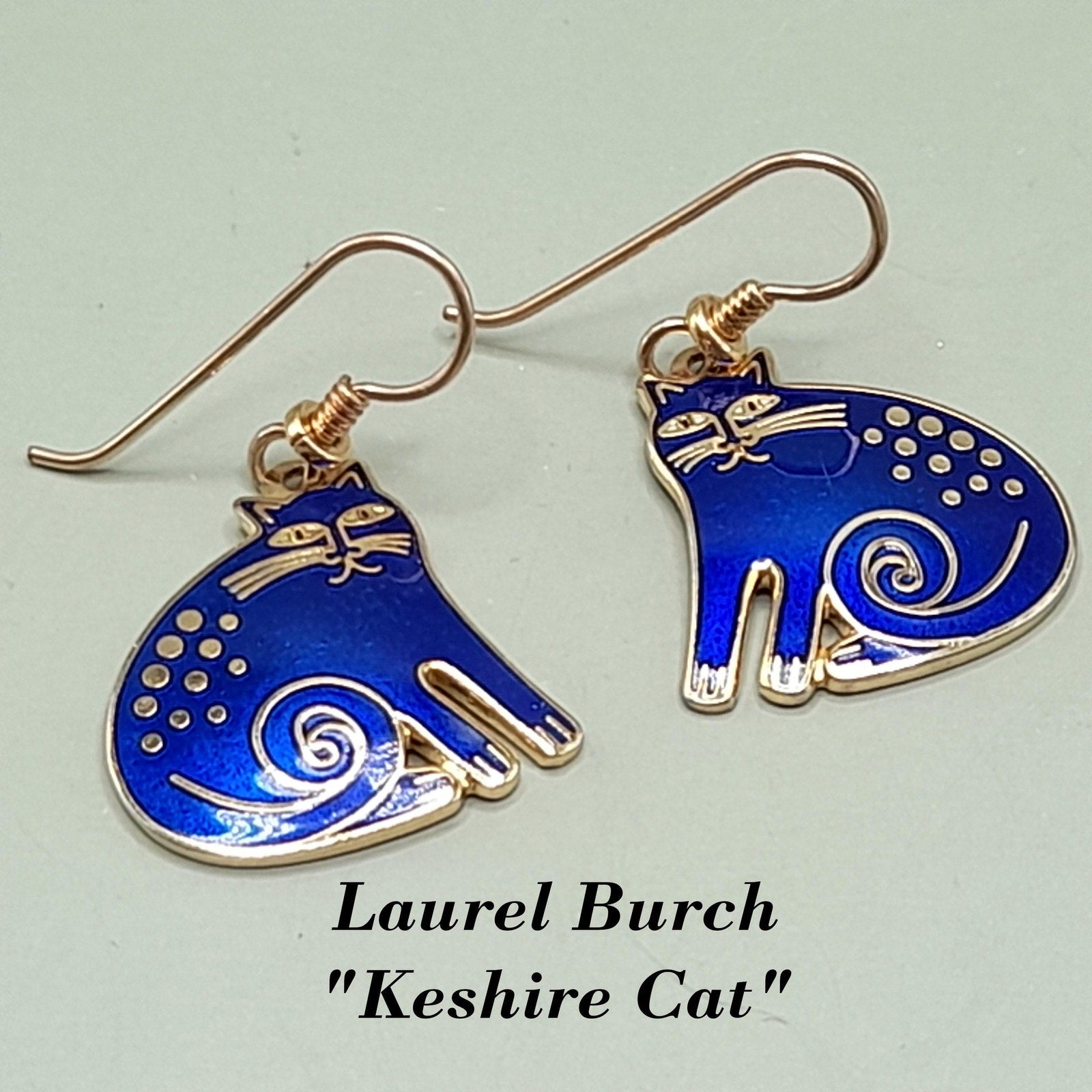 *Description: This is a great vintage design by Laurel Burch entitled "Keshire Cat" from the 1980s. The cats are blue enamel and gold plated cloisonne outlines and backing. Both cats are stamped Laurel Burch and Keshire Cat on the back. The ear wires are gold filled. This would be a great addition to your vintage jewelry collection or make a great vintage gift!
