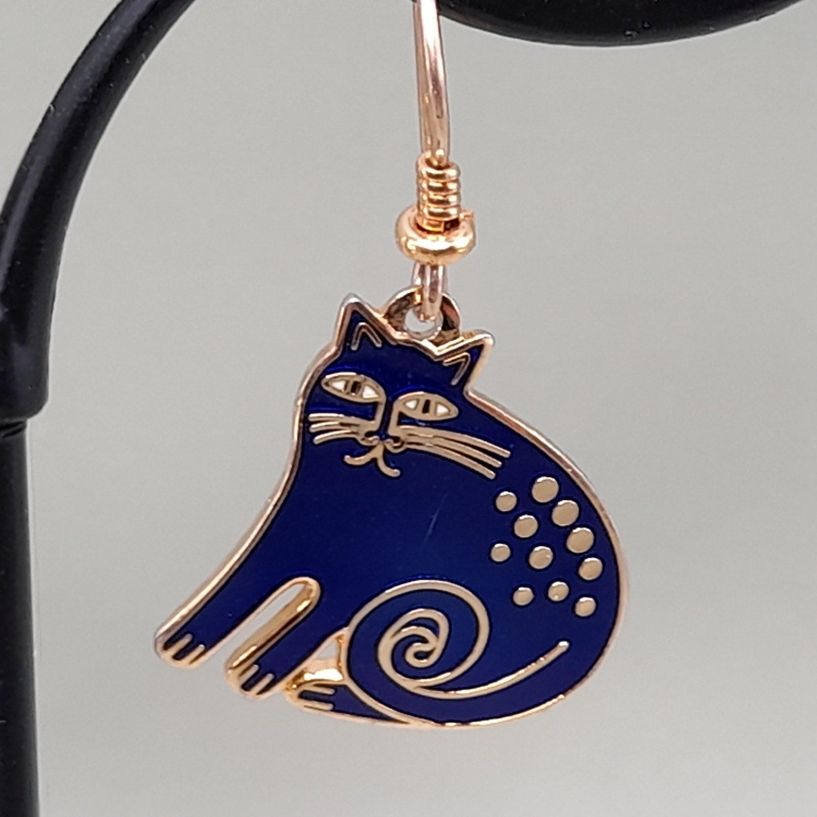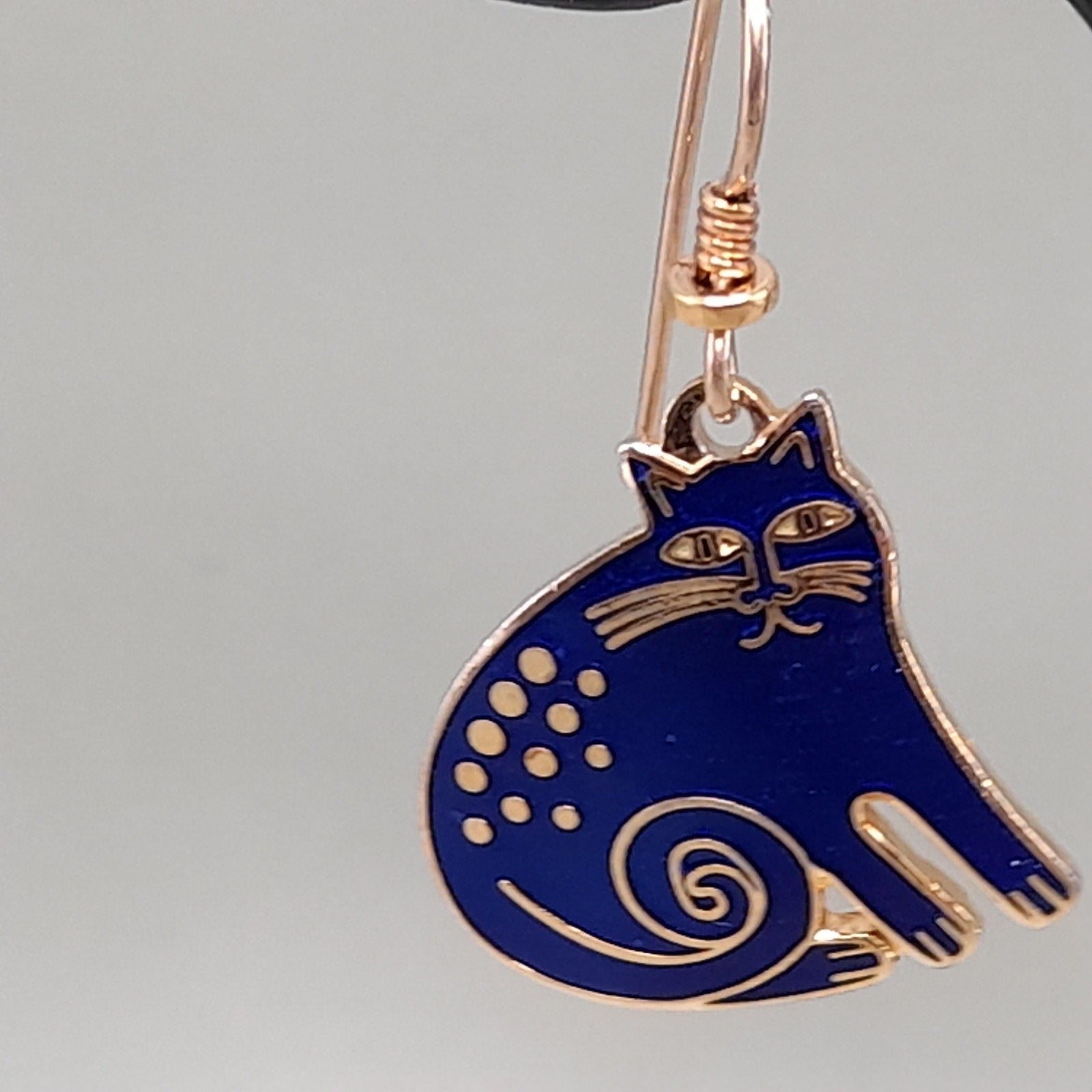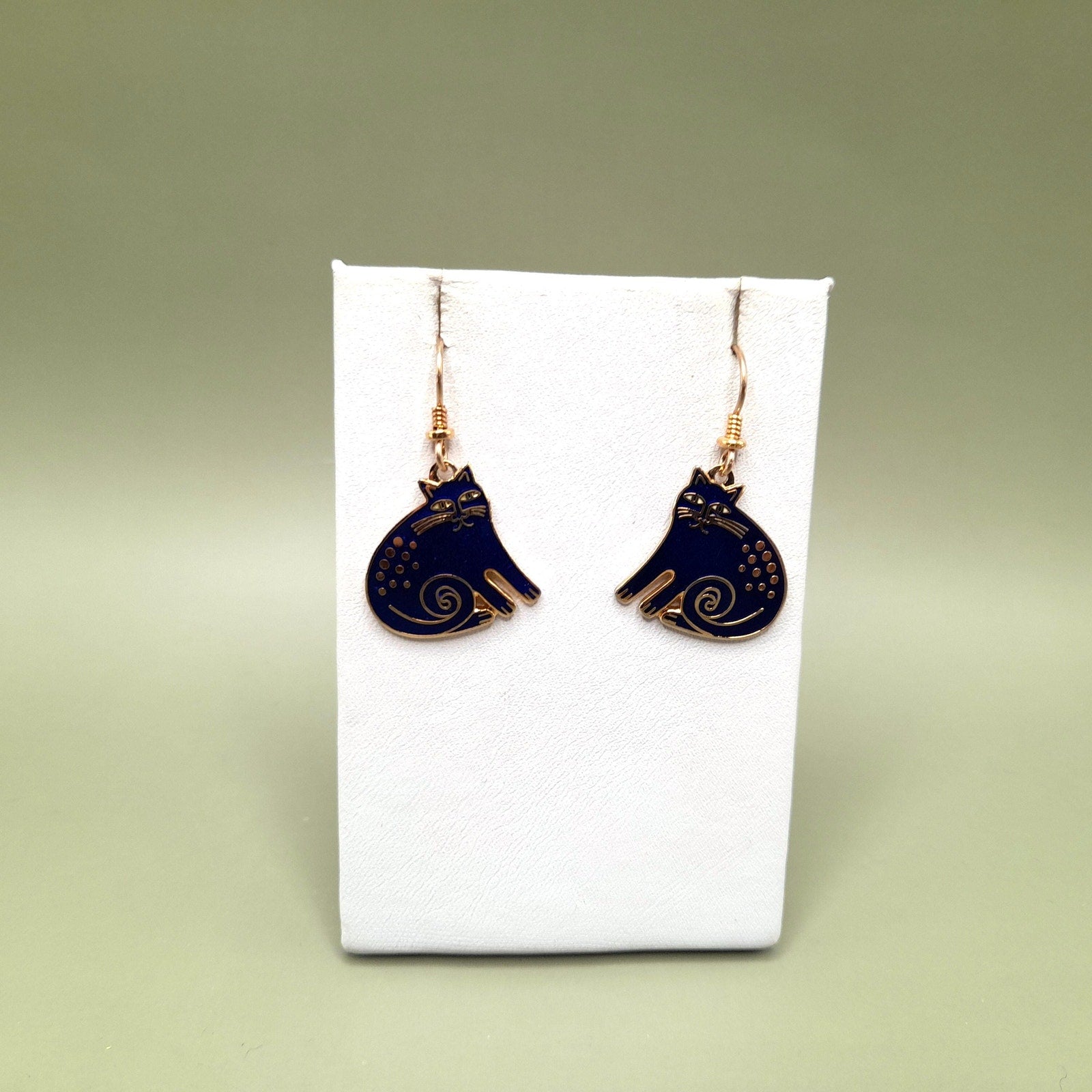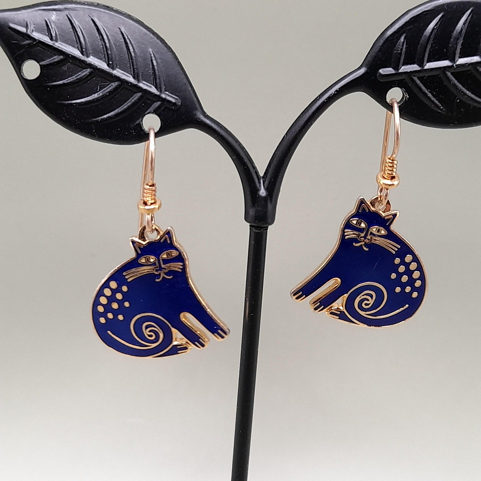 *Description: This is a great vintage design by Laurel Burch entitled "Keshire Cat" from the 1980s. The cats are blue enamel and gold plated cloisonne outlines and backing. Both cats are stamped Laurel Burch and Keshire Cat on the back. The ear wires are gold filled. This would be a great addition to your vintage jewelry collection or make a great vintage gift!