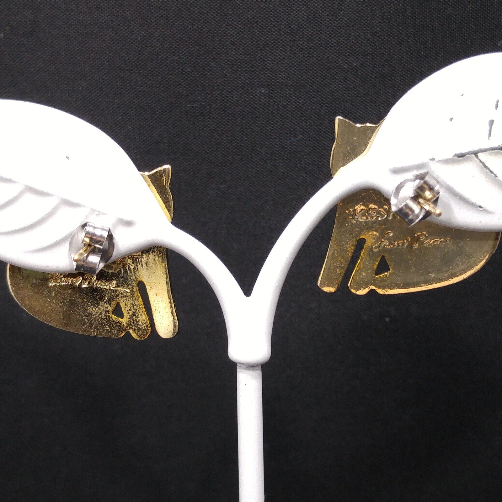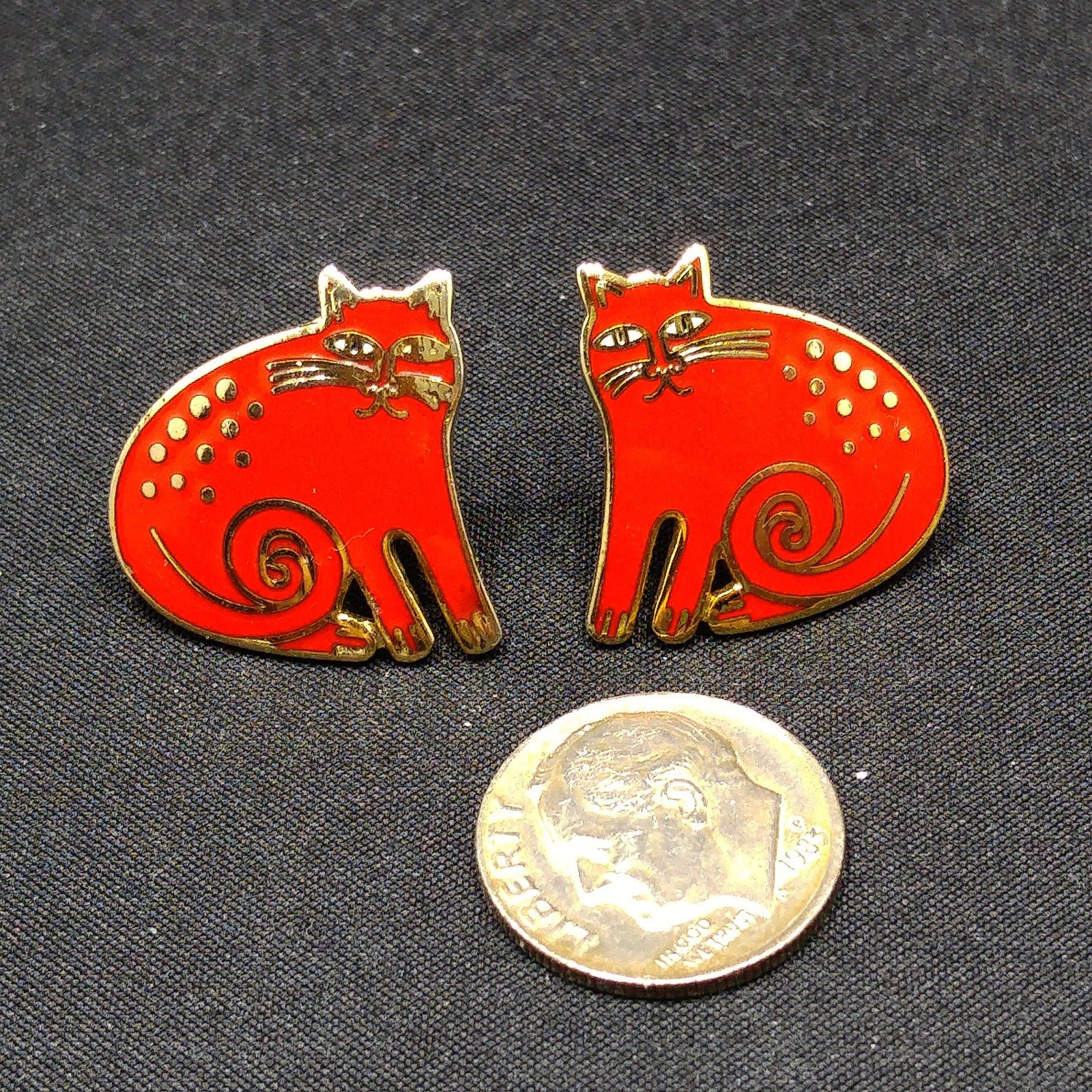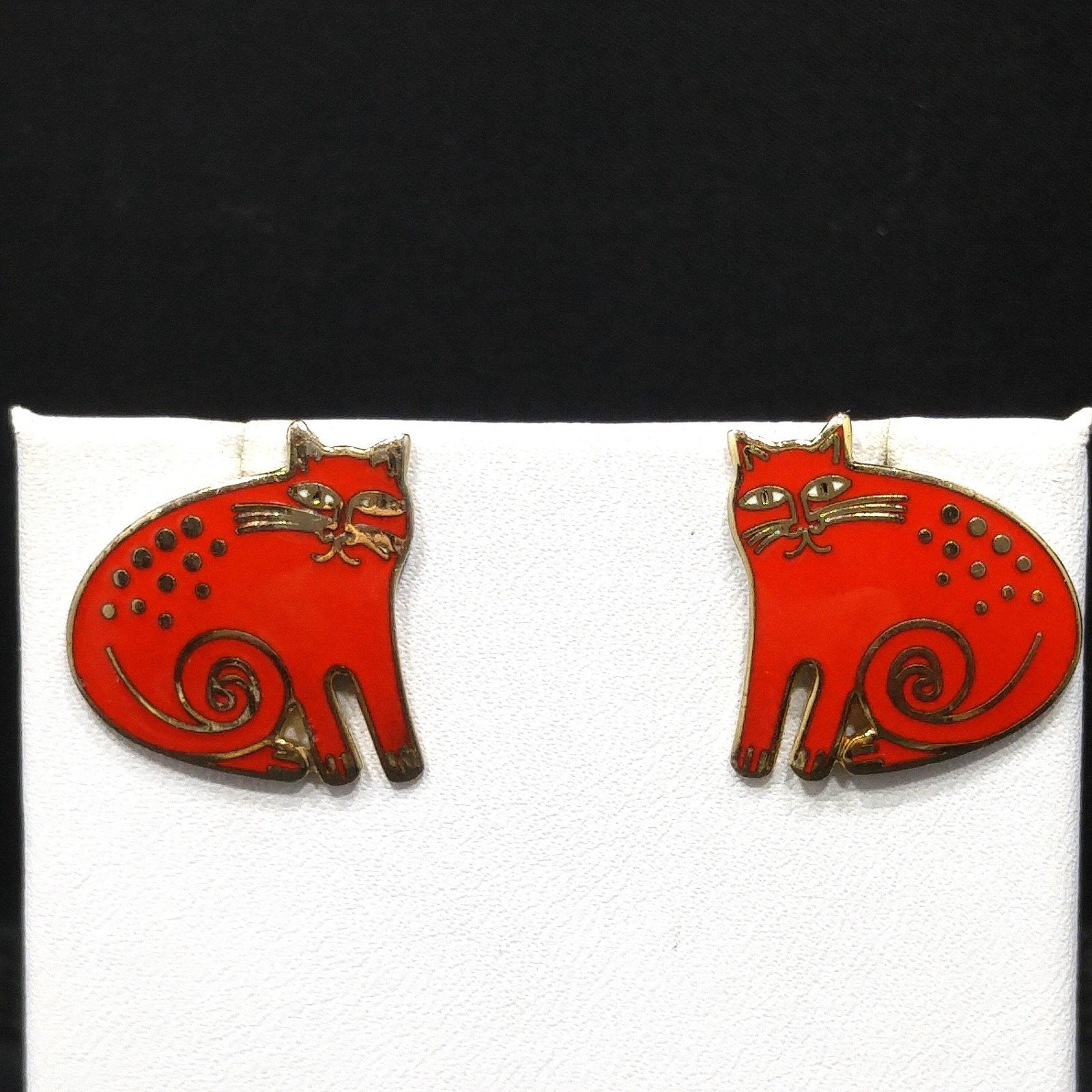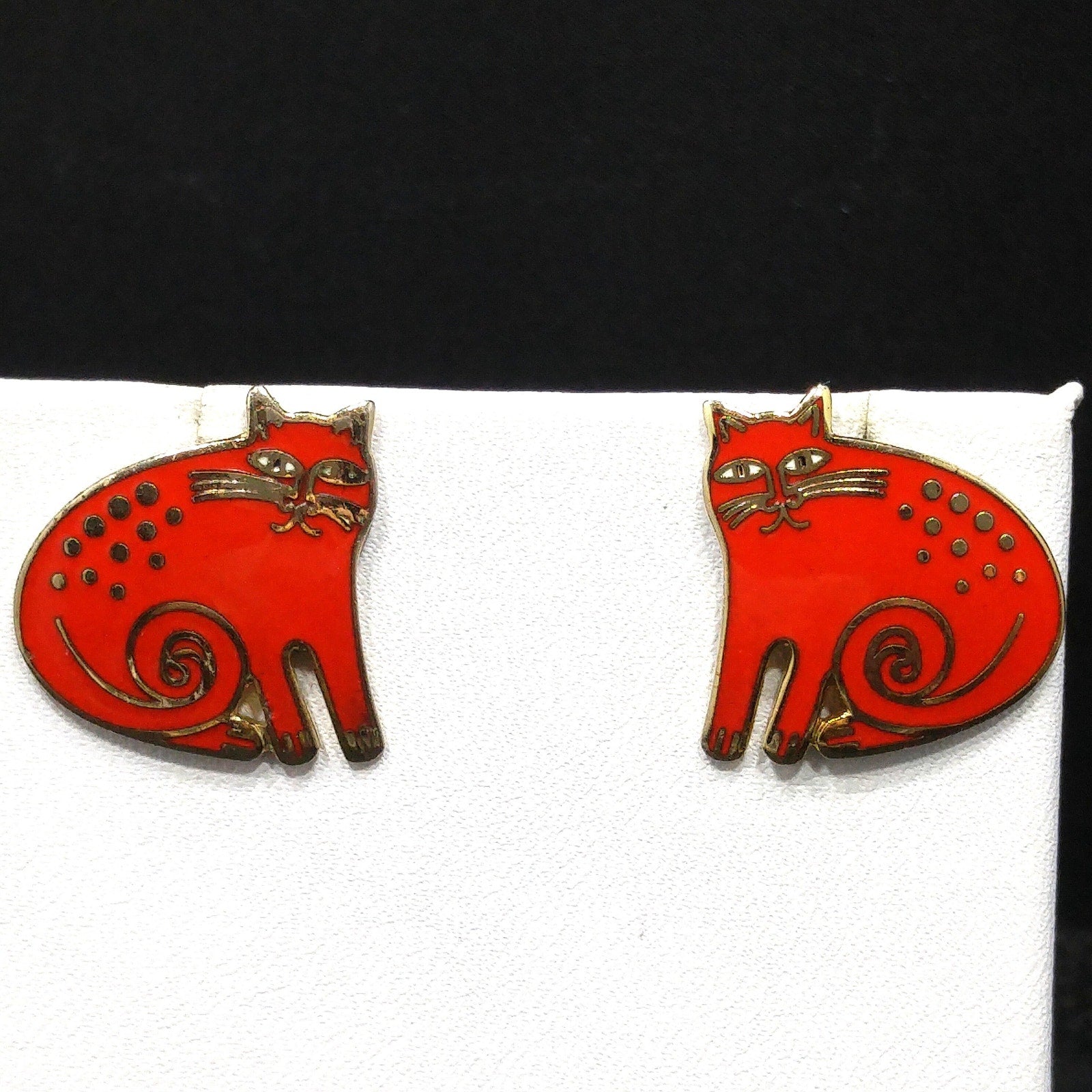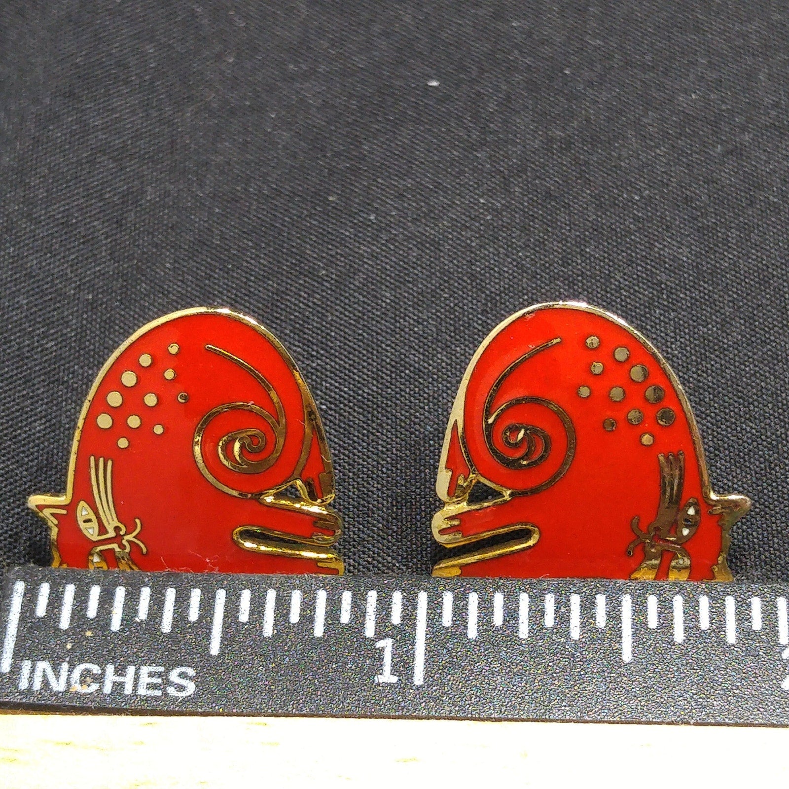 *Description: This is a beautiful pair of red enamel Laurel Burch "Keshire Cat" post earrings from the 1980s. These beautiful earrings are gold plated with gold plated cloisonne outlines and have gold filled posts. They are stamped with the designer, Laurel Burch, and "Keshire Cat" is also stamped on the back of each piece. They are light in weight and in great vintage condition.