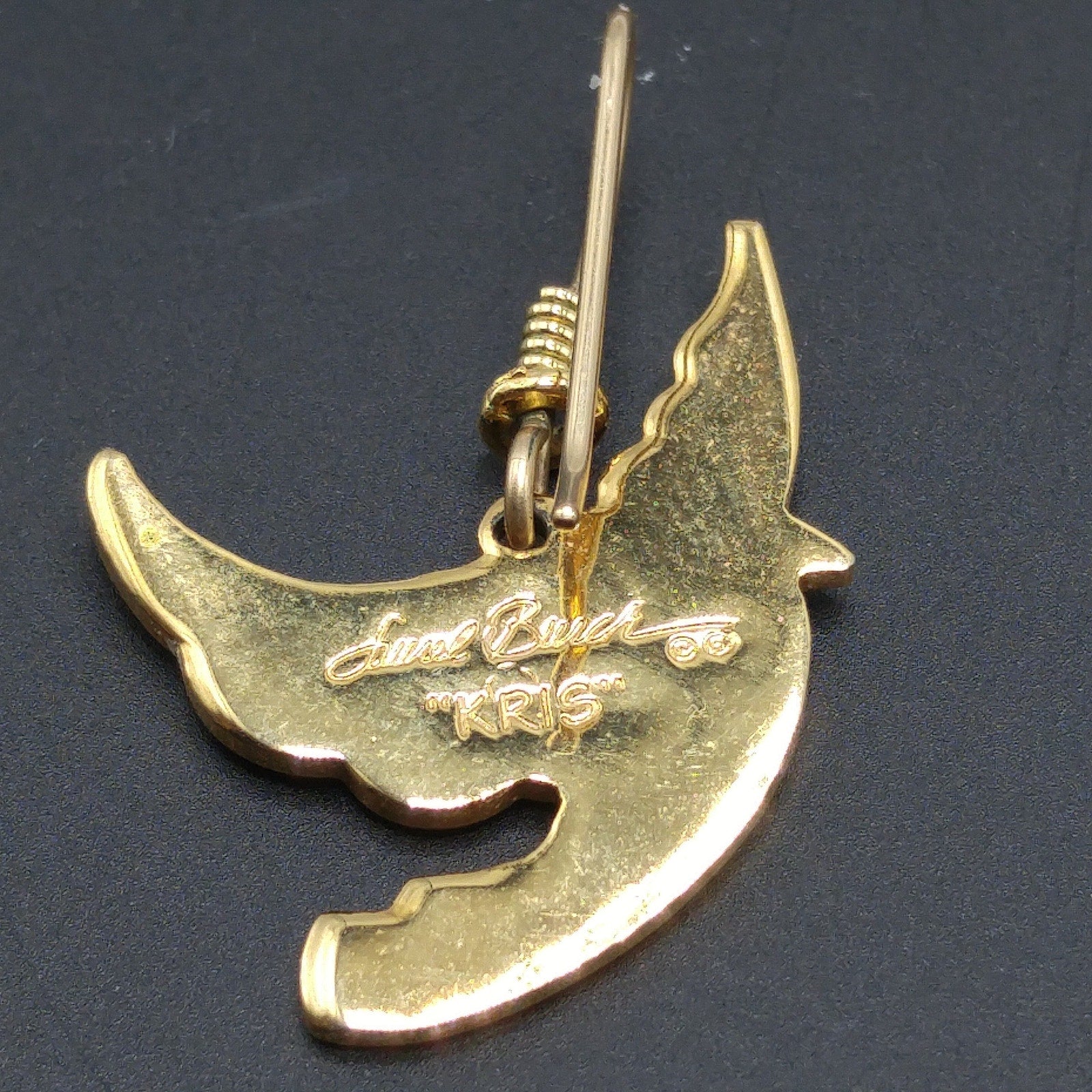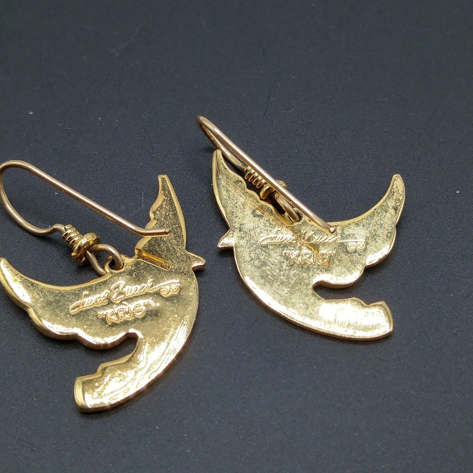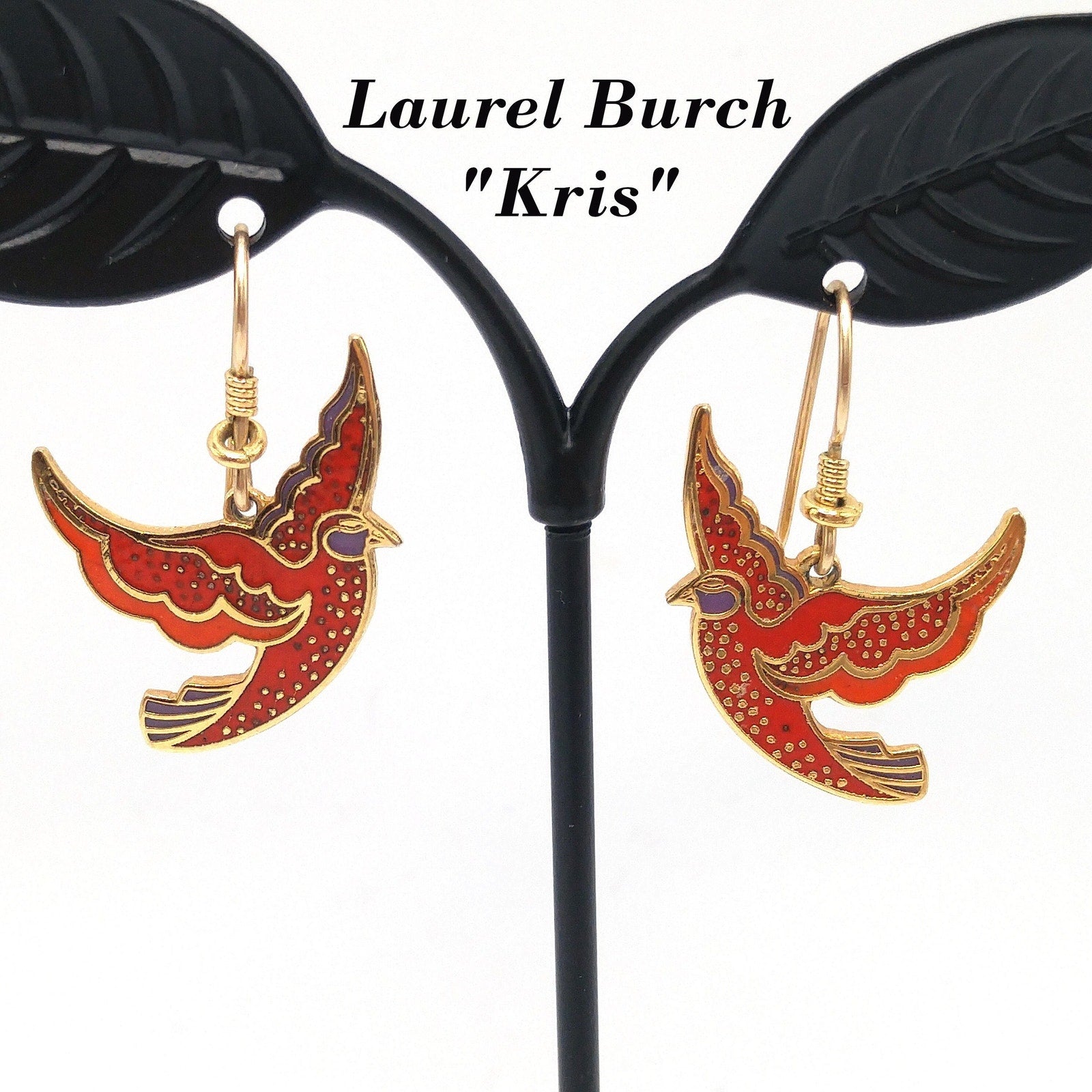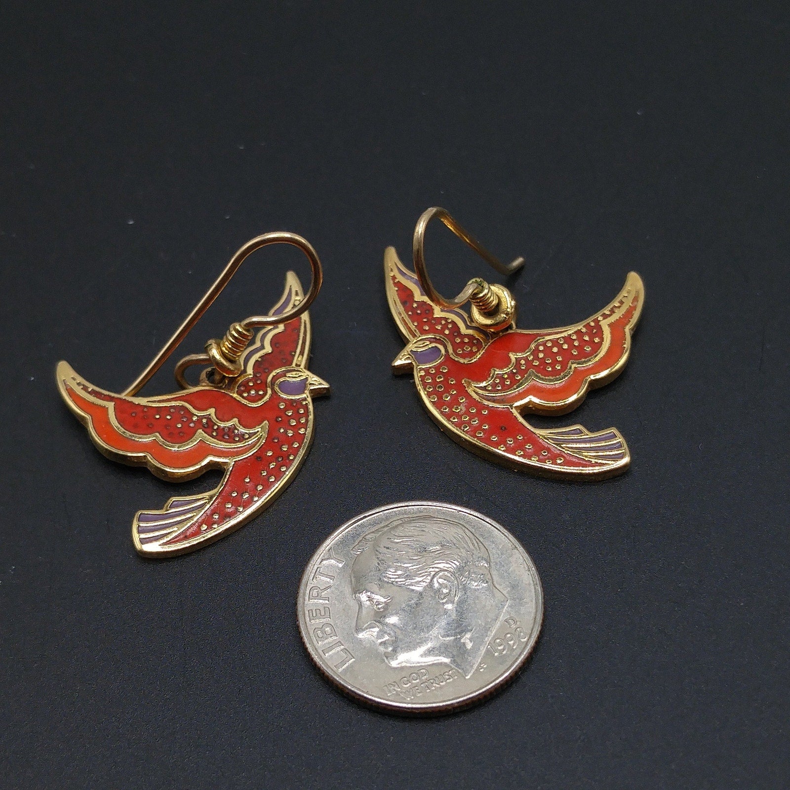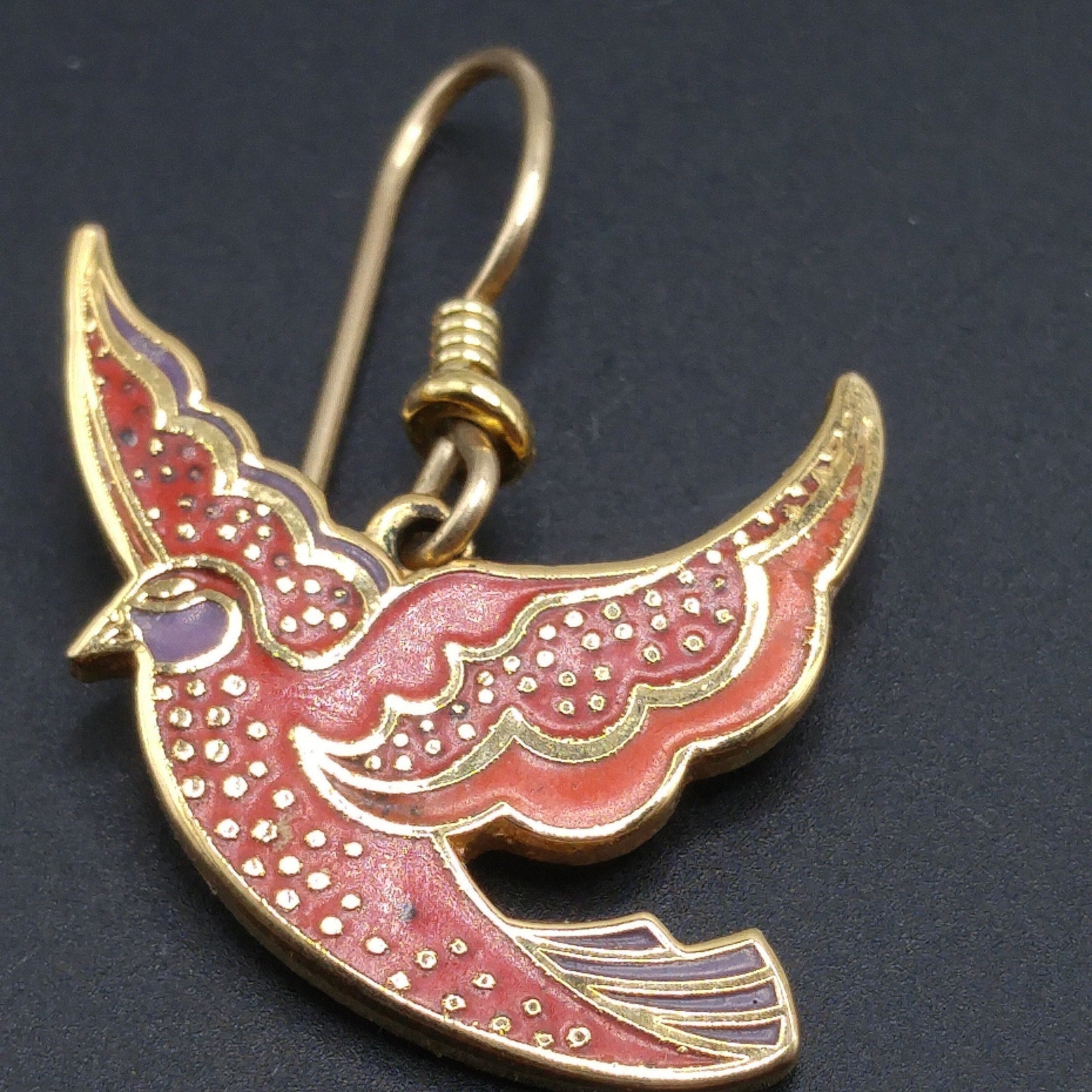 *Description: This is a beautiful pair of Laurel Burch "Kris" cloisonne enamel bird earrings from the 1980s. The birds have several shades of red with lavender accents on a gold plated backing with gold filled ear wires. The bird is in flight and all enamel is outlined in gold. This would be a great addition to your vintage jewelry collection or make a great vintage gift!