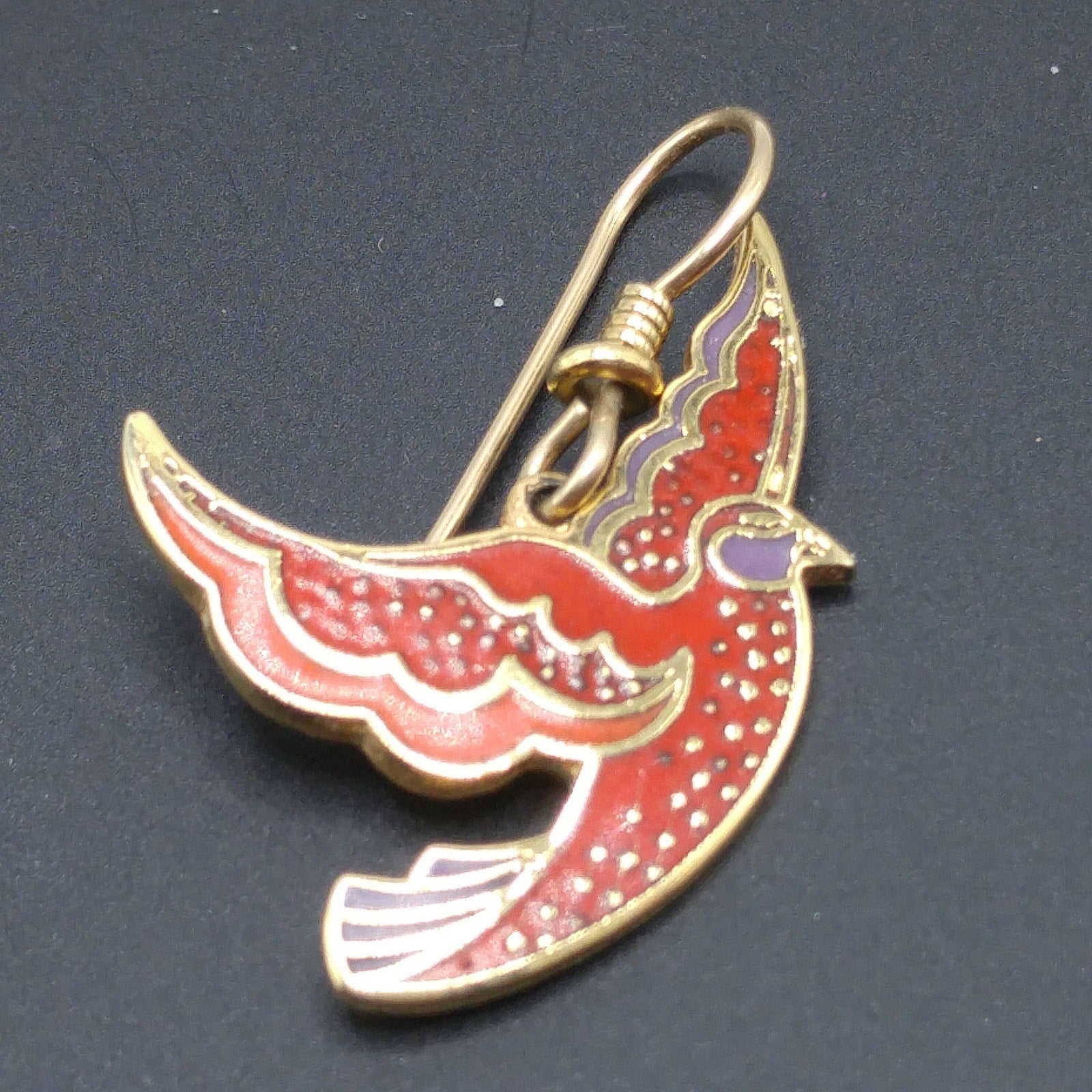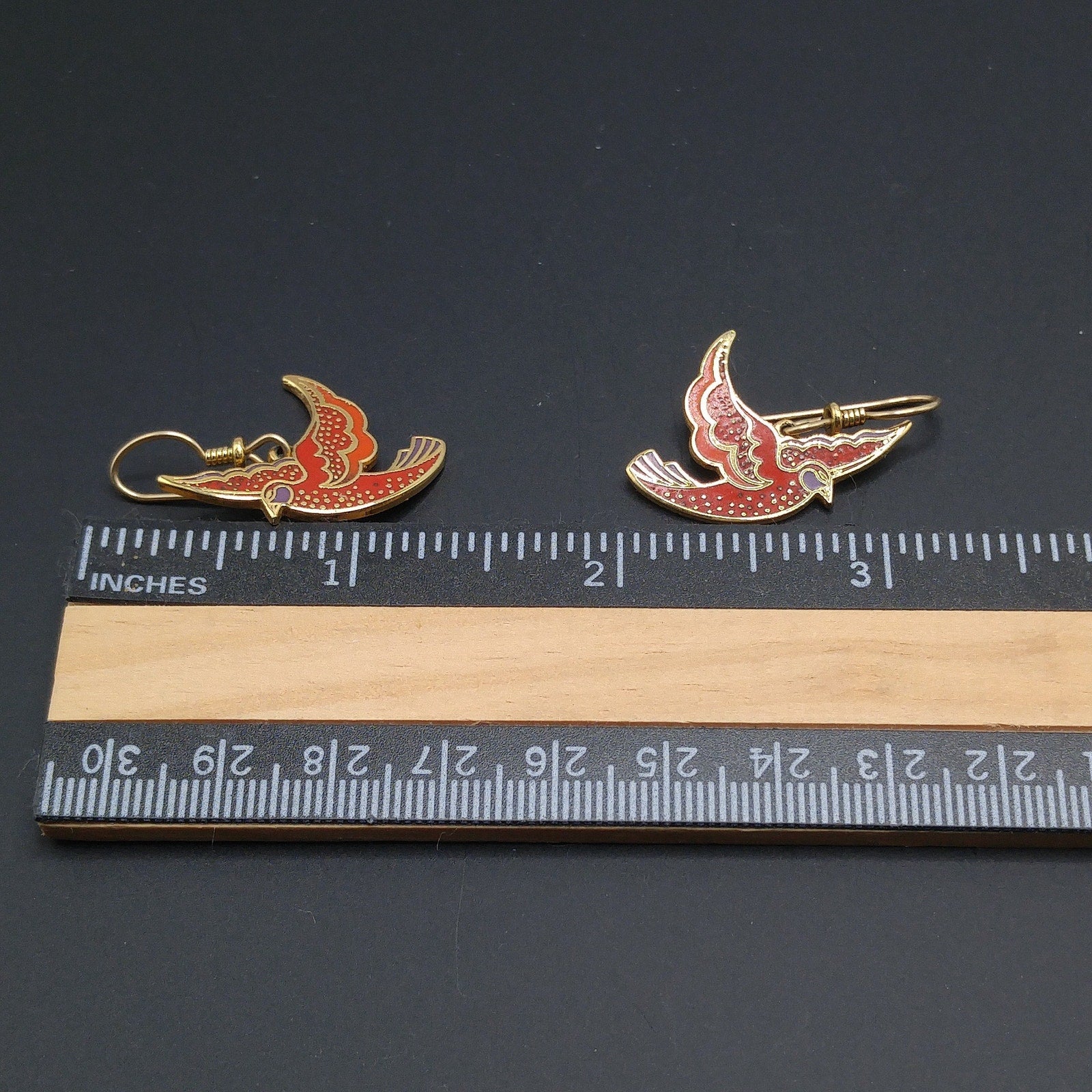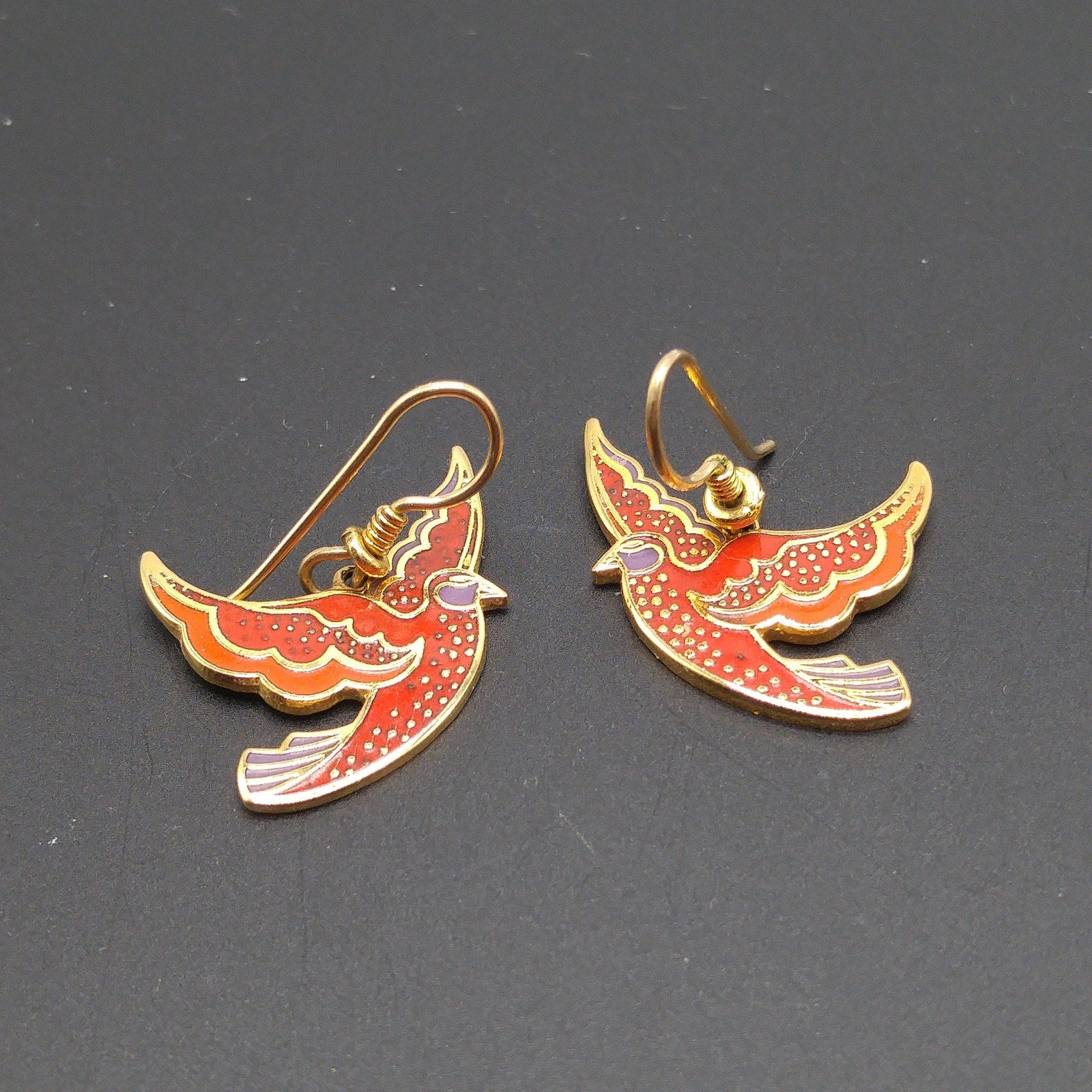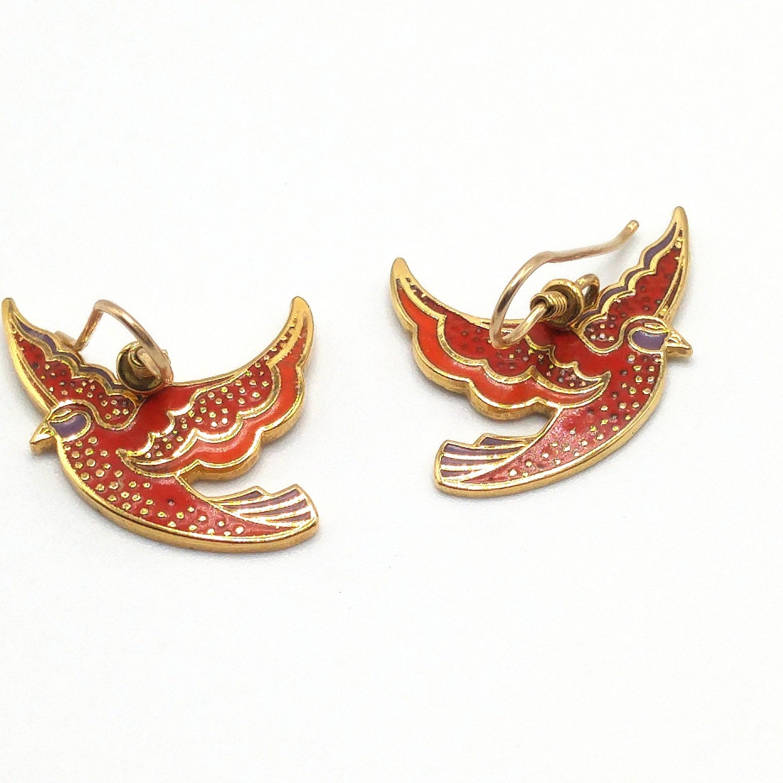 Vintage Laurel Burch "Kris" Red Bird Earrings, Cloisonne Enamel, Gold Plated