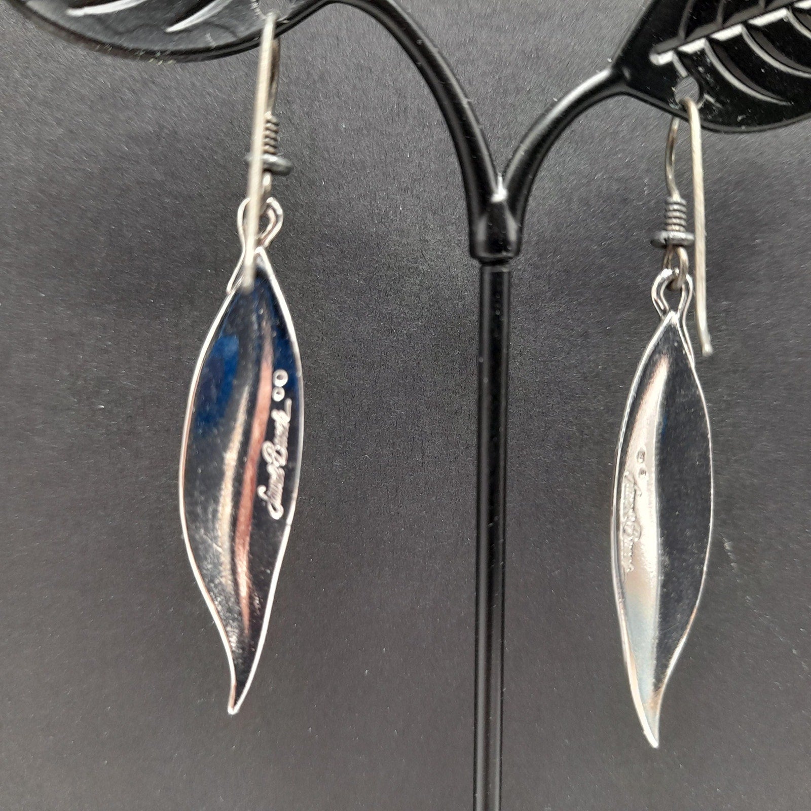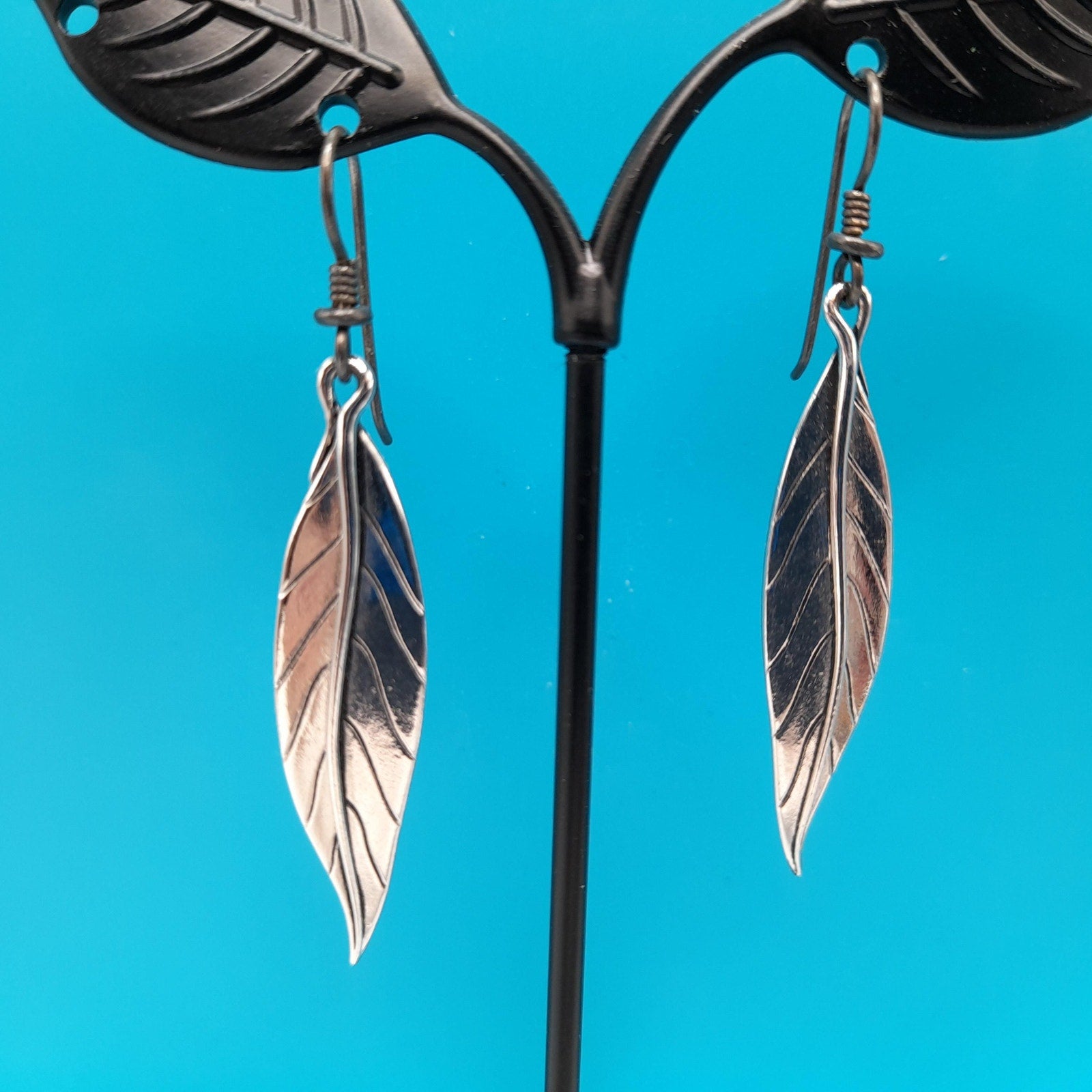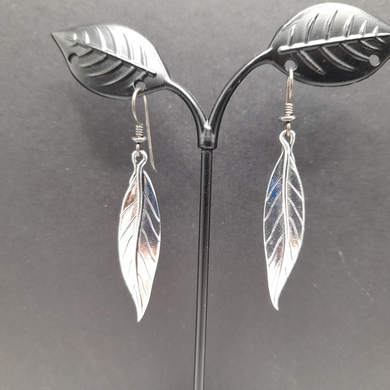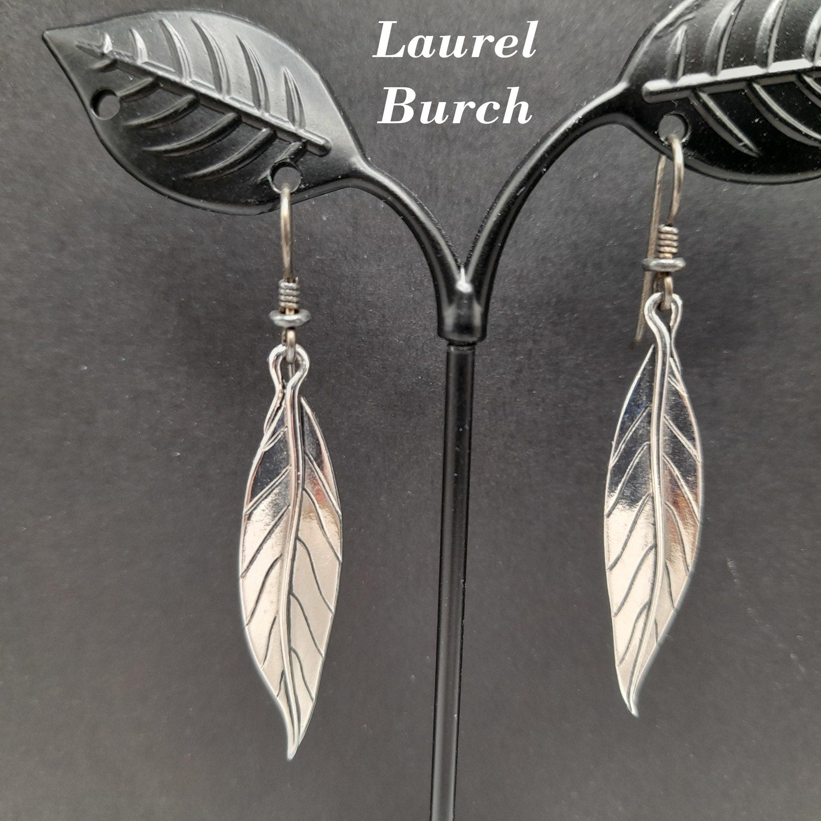*Description: This is a great pair of Laurel Burch Leaf drop earrings from the 1980s. Each leaf is rhodium plated and on silver plated ear wires. Laurel Burch used black enamel in the lines of the design. Each earring is a single long leaf. This would be a great addition to your vintage jewelry collection or make a great vintage gift!