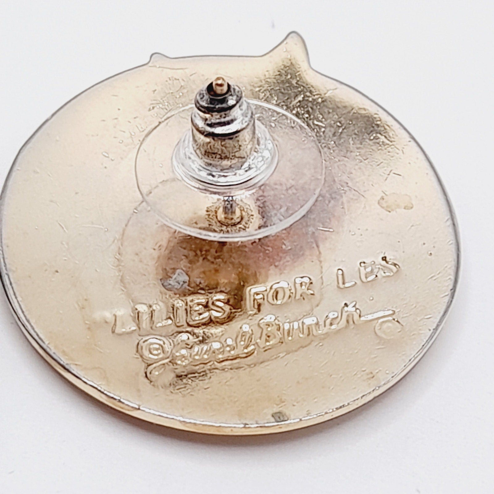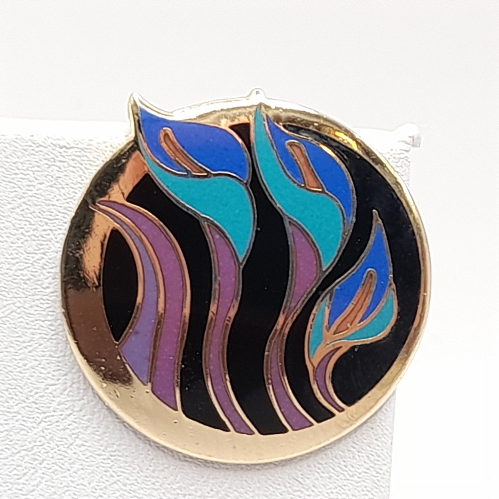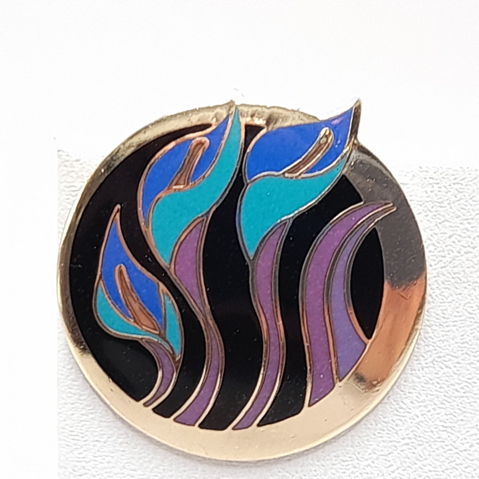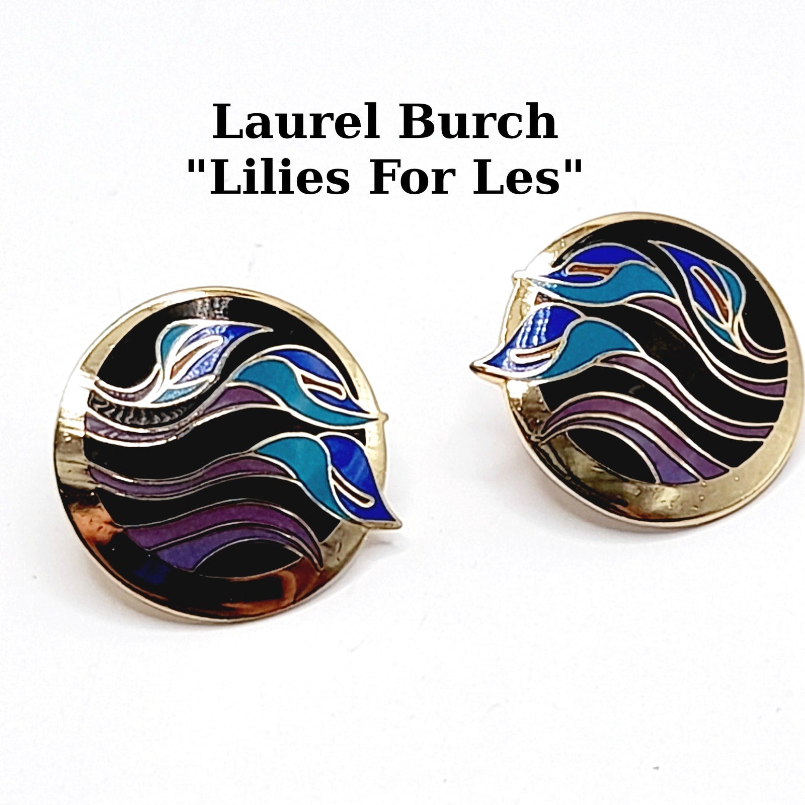 Celebrate the artistry of Laurel Burch with these vintage “Lilies for Les” post earrings, a rare and collectible design from her vibrant enamel jewelry line. Crafted with rich purple and blue enamel over a warm gold-plated base, each earring features a stylized lily motif that captures Burch’s signature blend of bold color and whimsical elegance. Measuring approximately 1 inch, these earrings are the perfect size for everyday wear while still making a statement. Lightweight and comfortable, they are ideal for vintage jewelry collectors, Laurel Burch fans, or anyone who appreciates distinctive, art-inspired accessories.