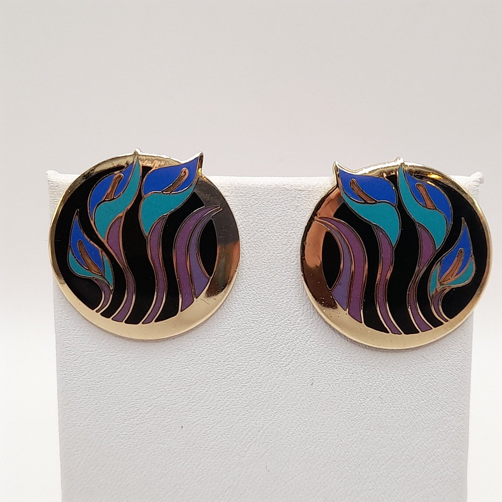 Vintage Laurel Burch "Lilies for Les" Post Earrings - Purple Blue Enamel - Gold Plated - 1 Inch