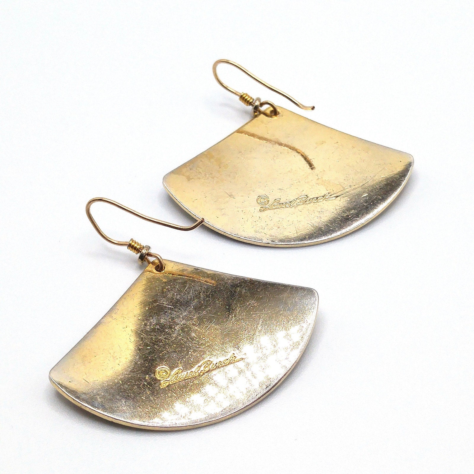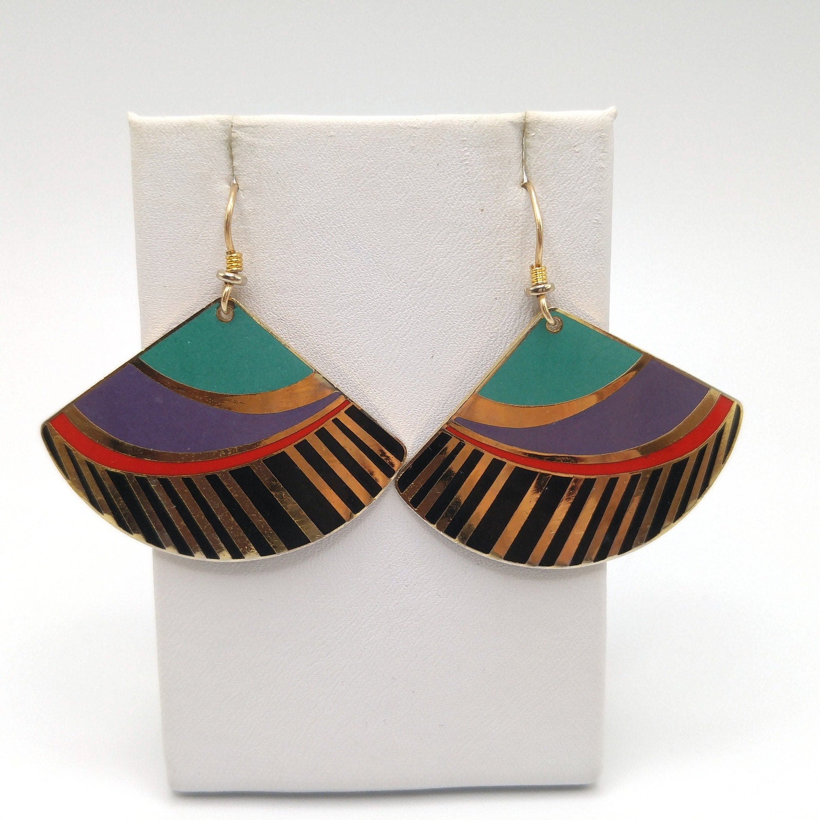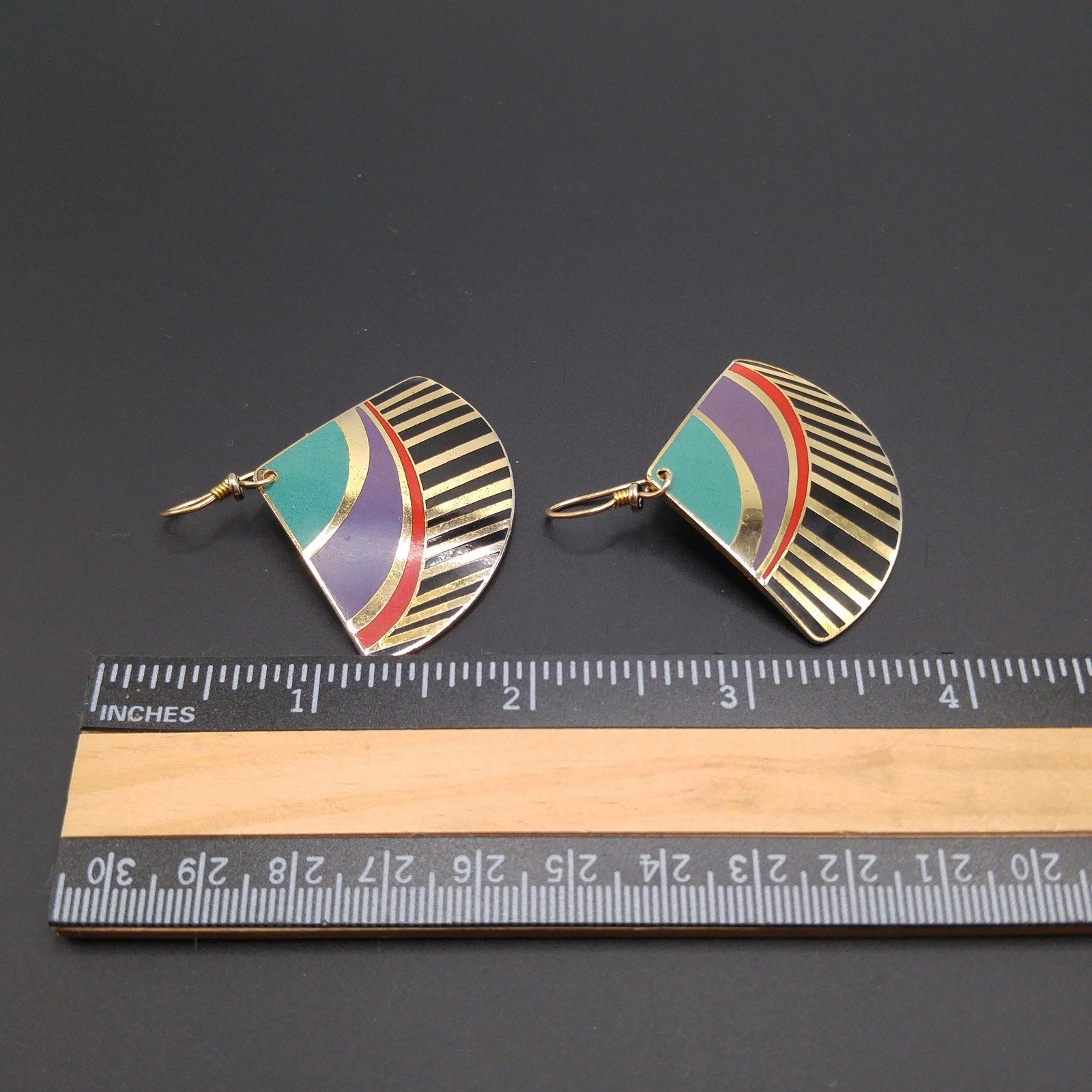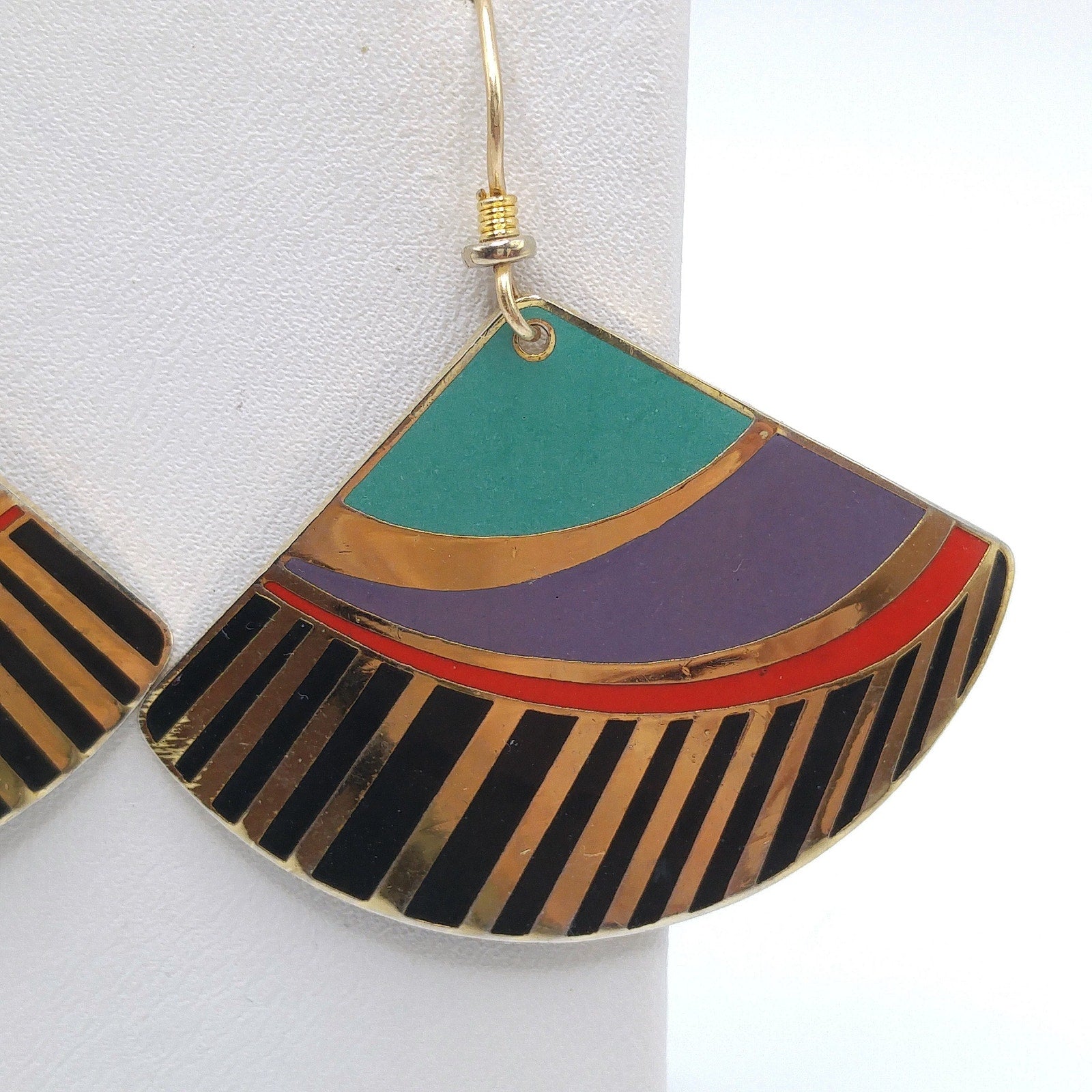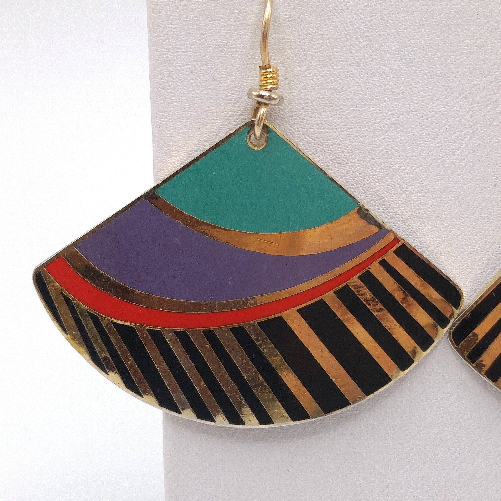 Vintage Laurel Burch Madrid Fan Earrings, Gold Plated, Teal Purple Black Enamel
