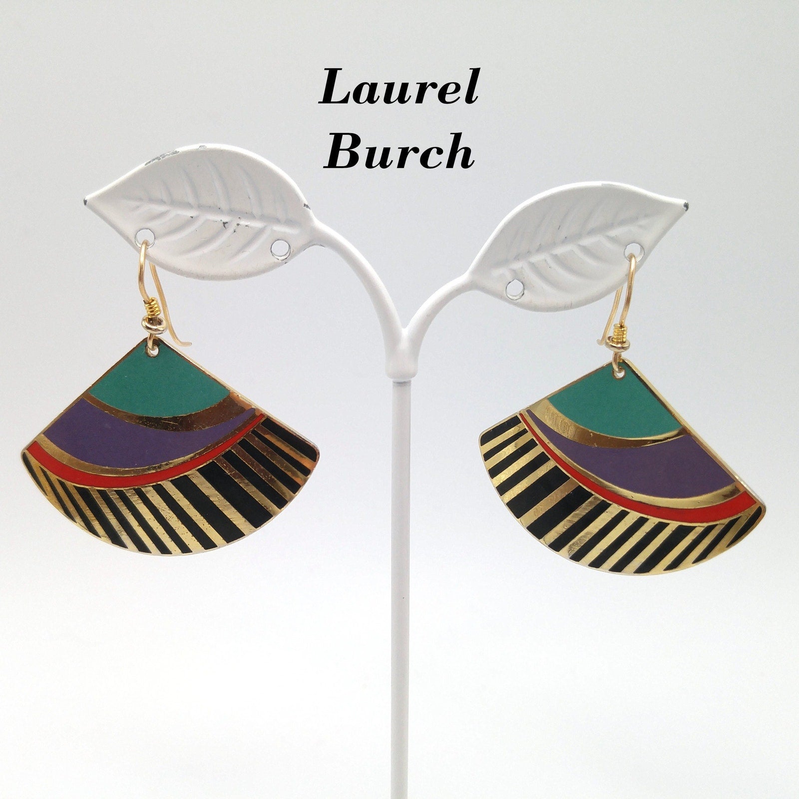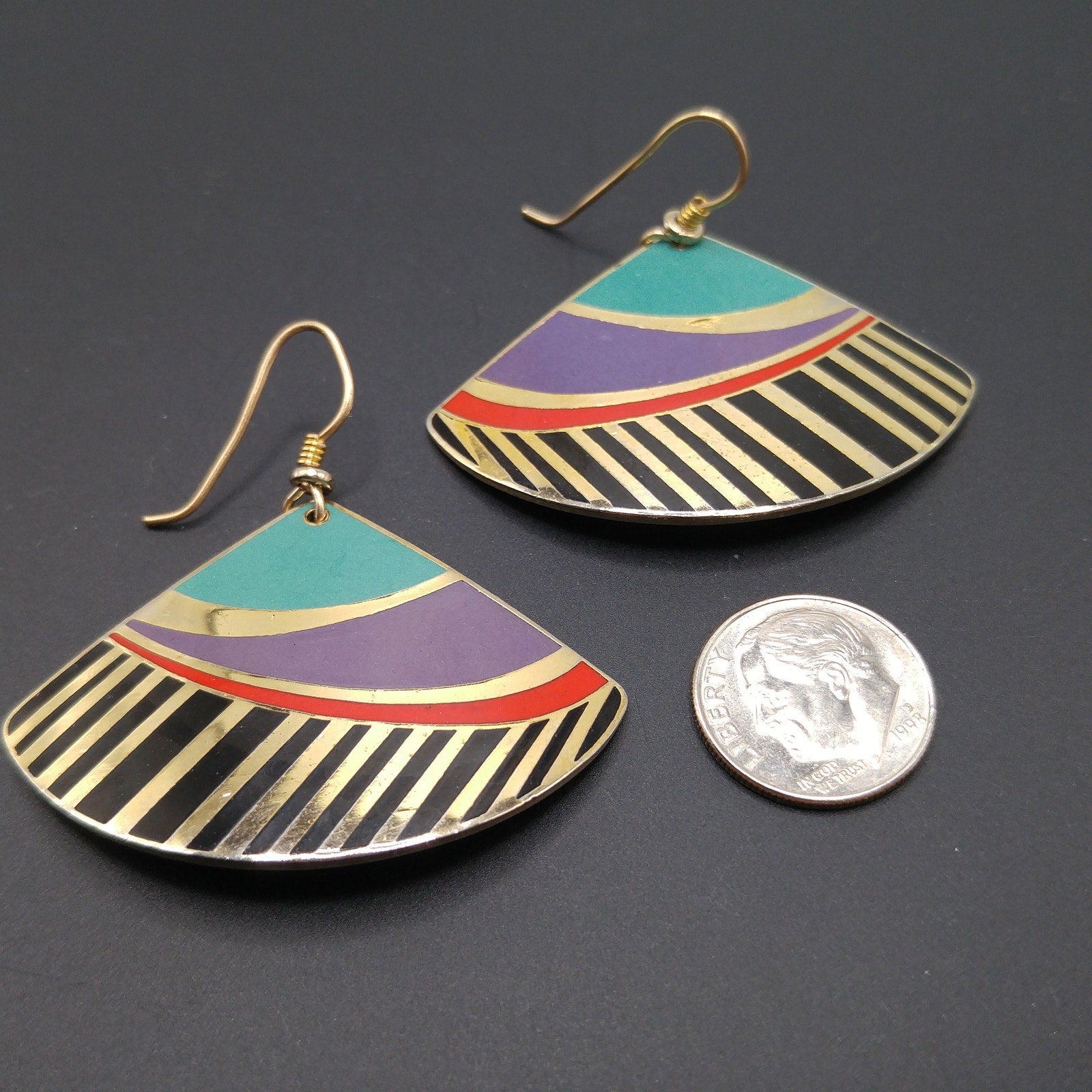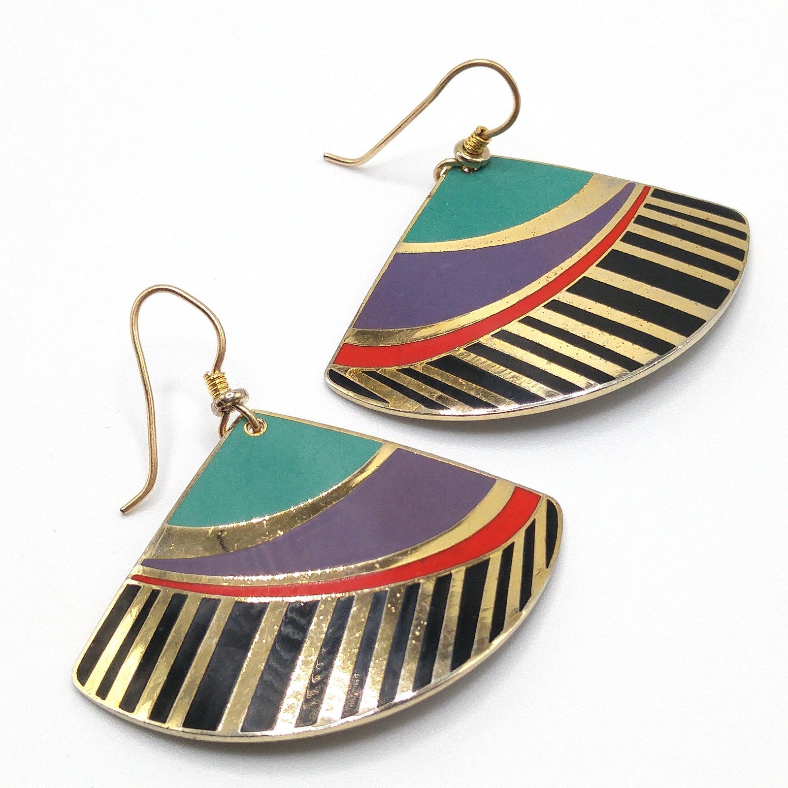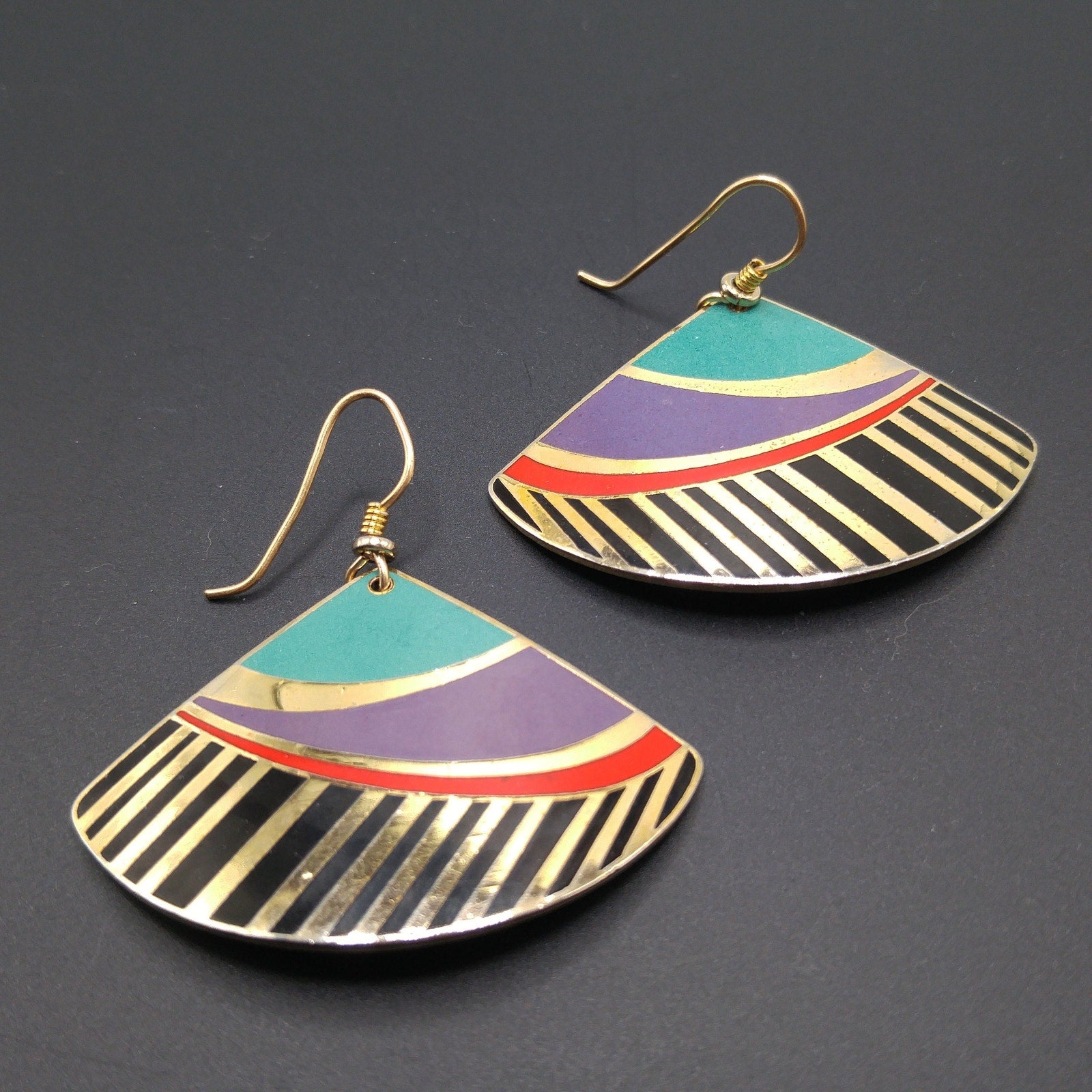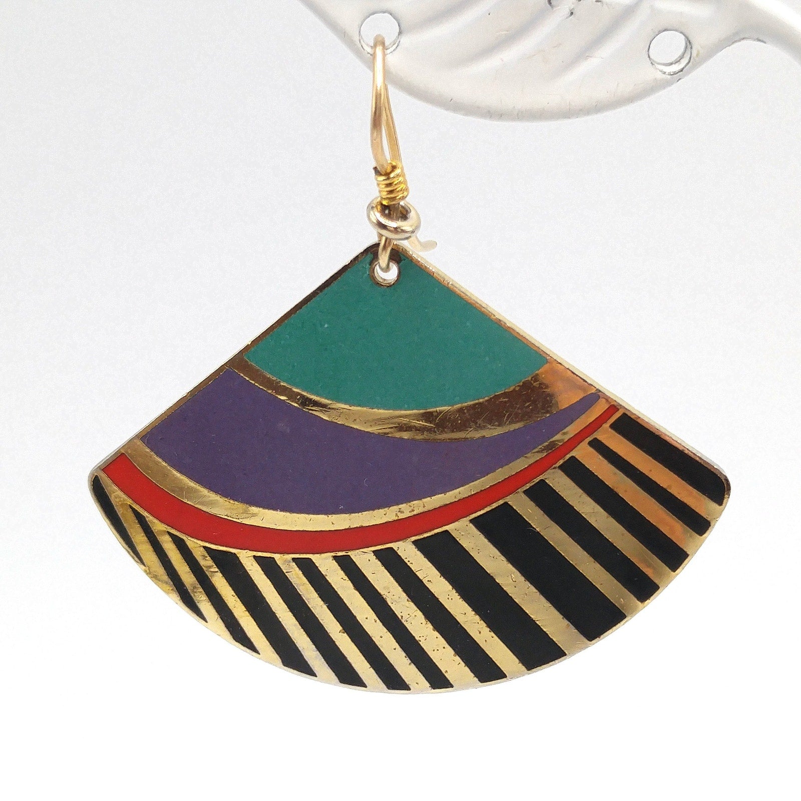 *Description: This is a unique pair of Laurel Burch earrings in the Madrid fan design with gold plated cloisonne and enamel in black, turquoise, purple, and red, from the 1980s. This style is pretty rare and is in a larger fan shape with geometric designs; outlined and filled with gold plate. The ear wires are gold filled. This would be a great addition to your vintage jewelry collection or make a great vintage gift!