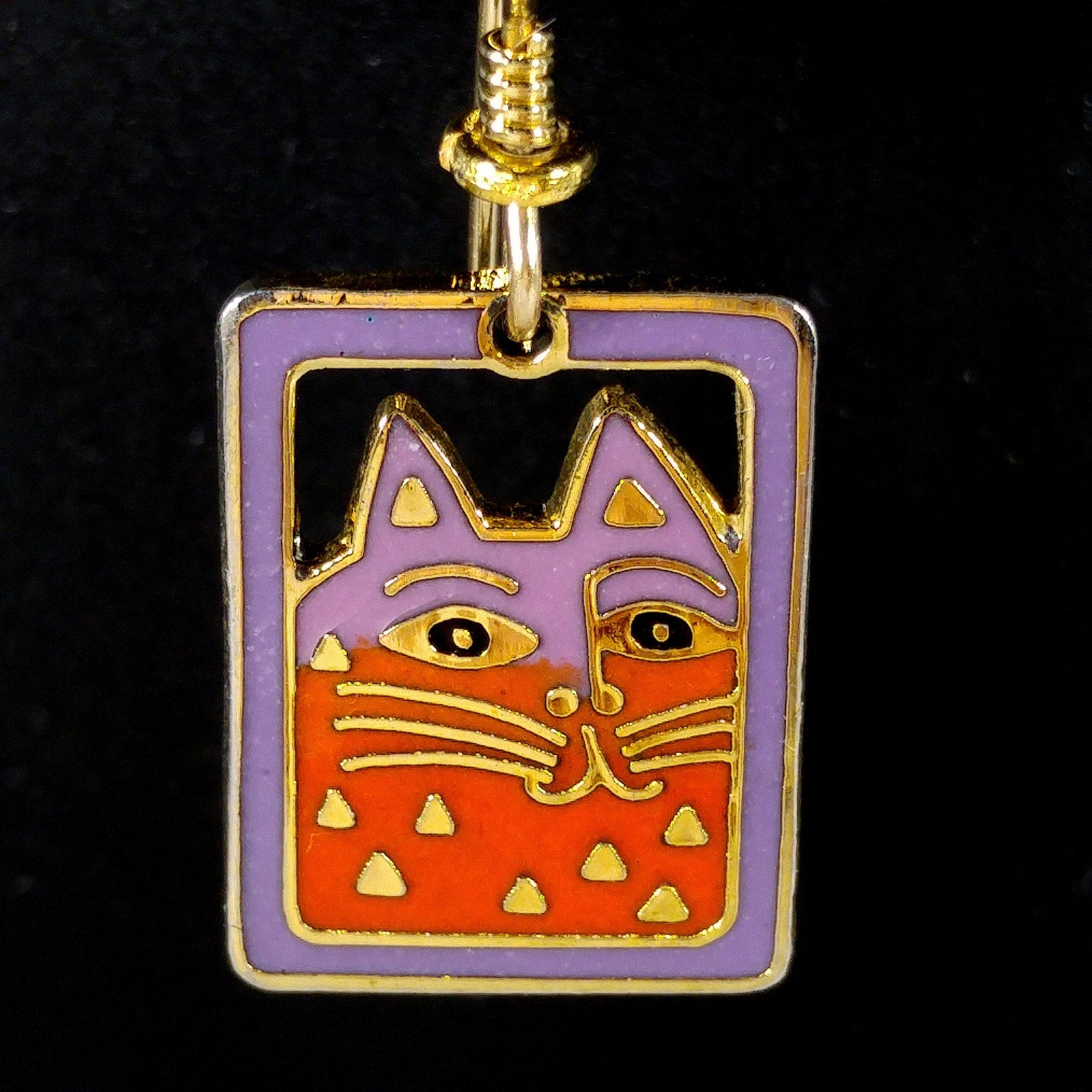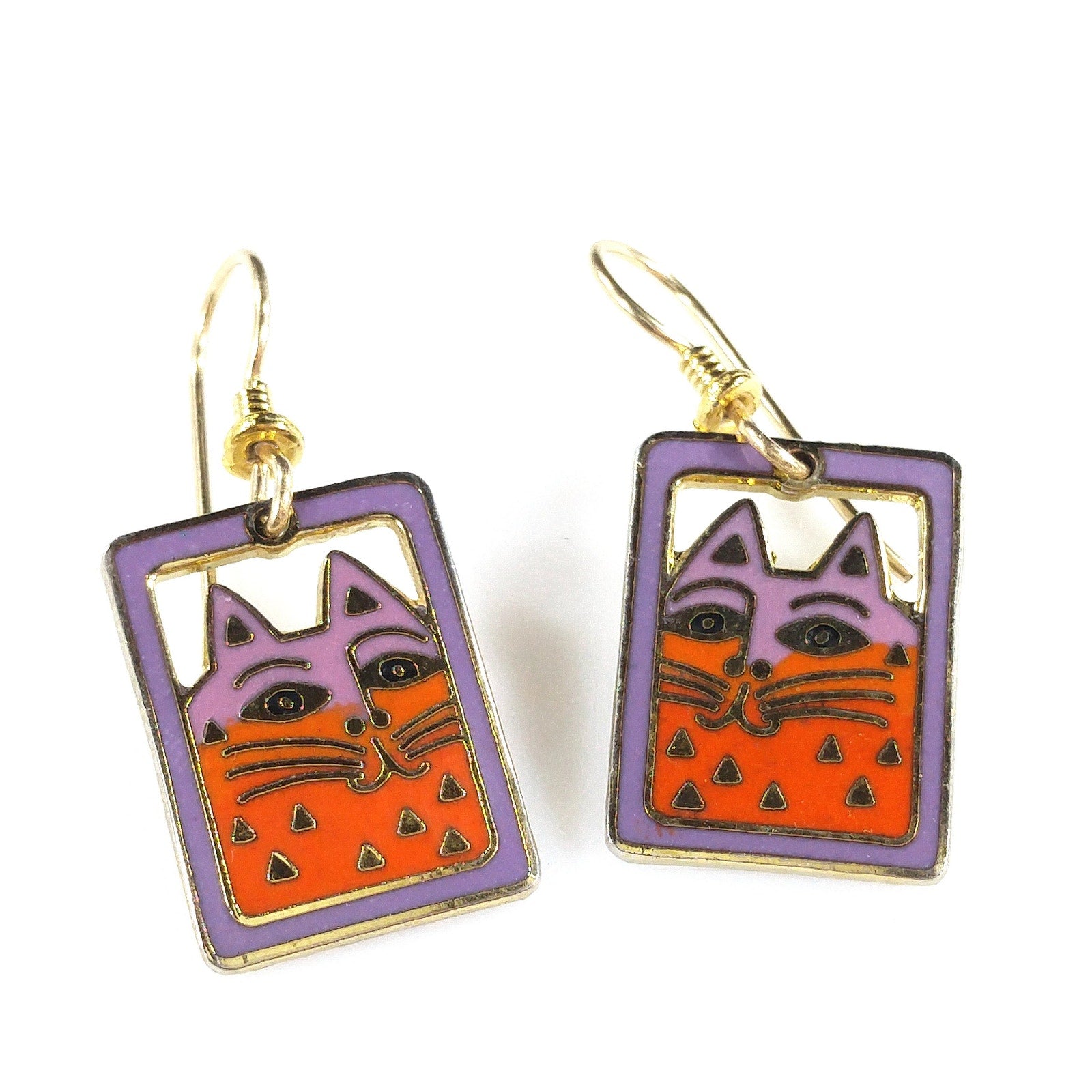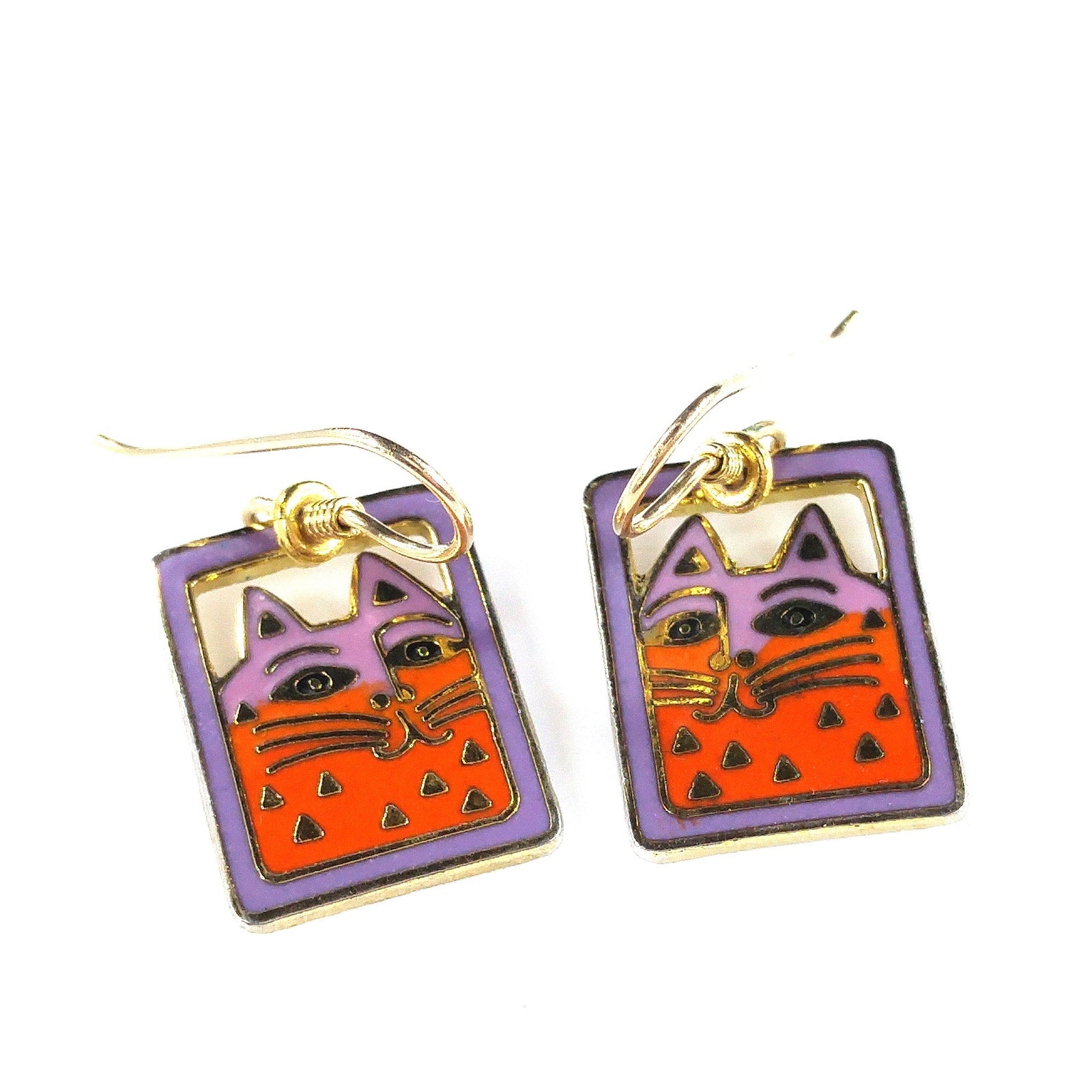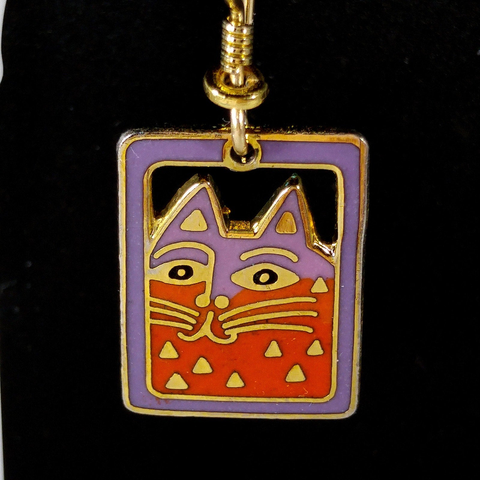 *Description: This is a great design by Laurel Burch entitled "Mallory's Cat" which has open work around the top of the cat from the 1980s. The enamel cat is purple and red with gold plated cloisonné outlines and backing. The cat has gold triangles under its chin. There is a purple frame around the cat earrings. Both earrings are stamped Laurel Burch and Mallory's Cat. The ear wires are gold filled and the earrings are gold plated. This would be a great addition to your vintage jewelry collection or make a great vintage gift!