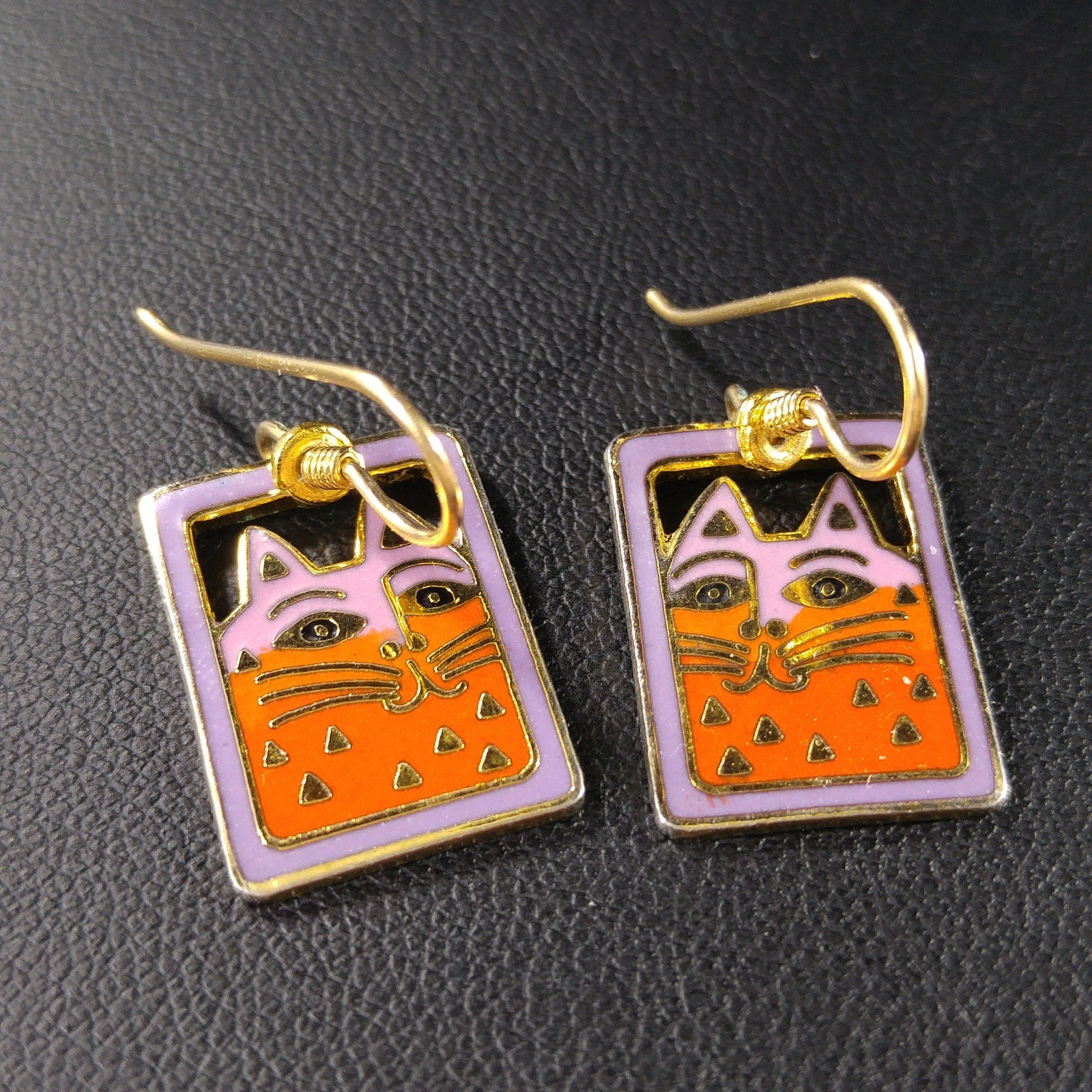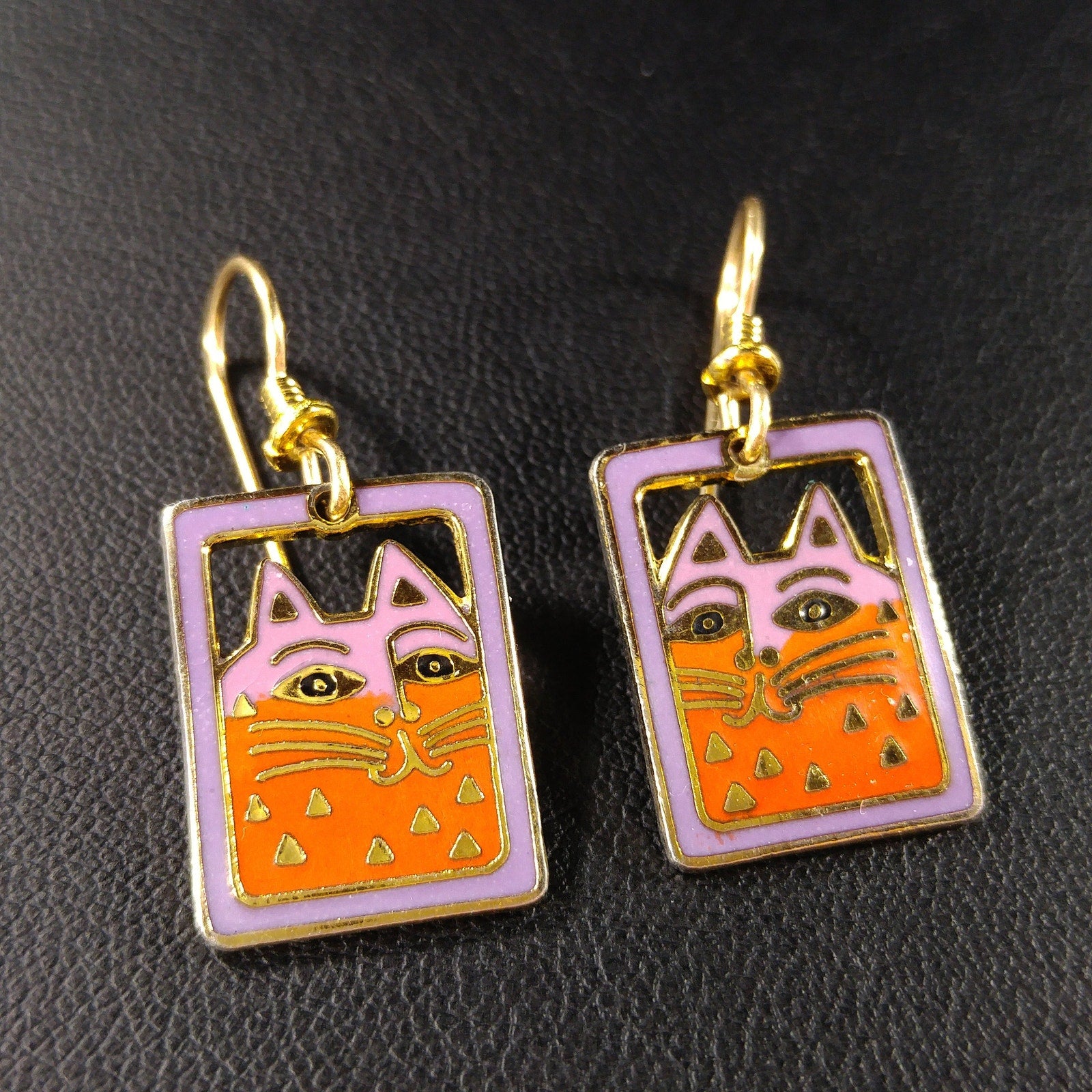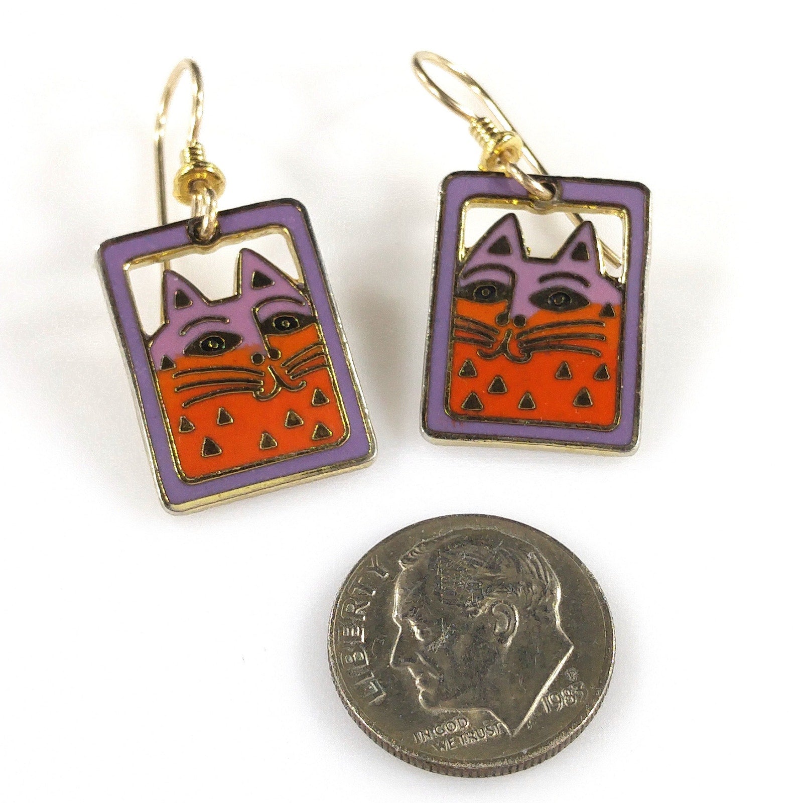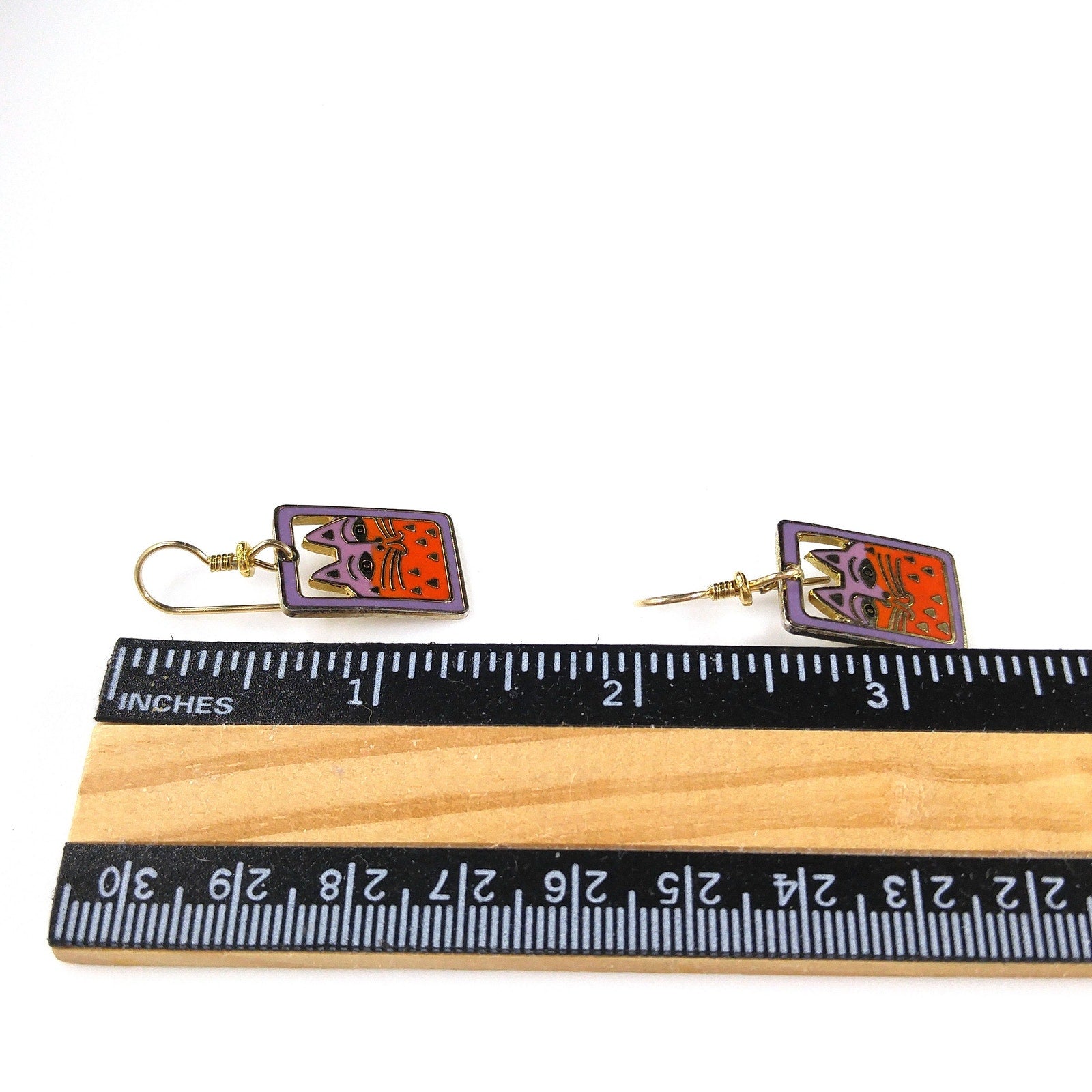 *Description: This is a great design by Laurel Burch entitled "Mallory's Cat" which has open work around the top of the cat from the 1980s. The enamel cat is purple and red with gold plated cloisonné outlines and backing. The cat has gold triangles under its chin. There is a purple frame around the cat earrings. Both earrings are stamped Laurel Burch and Mallory's Cat. The ear wires are gold filled and the earrings are gold plated. This would be a great addition to your vintage jewelry collection or make a great vintage gift!