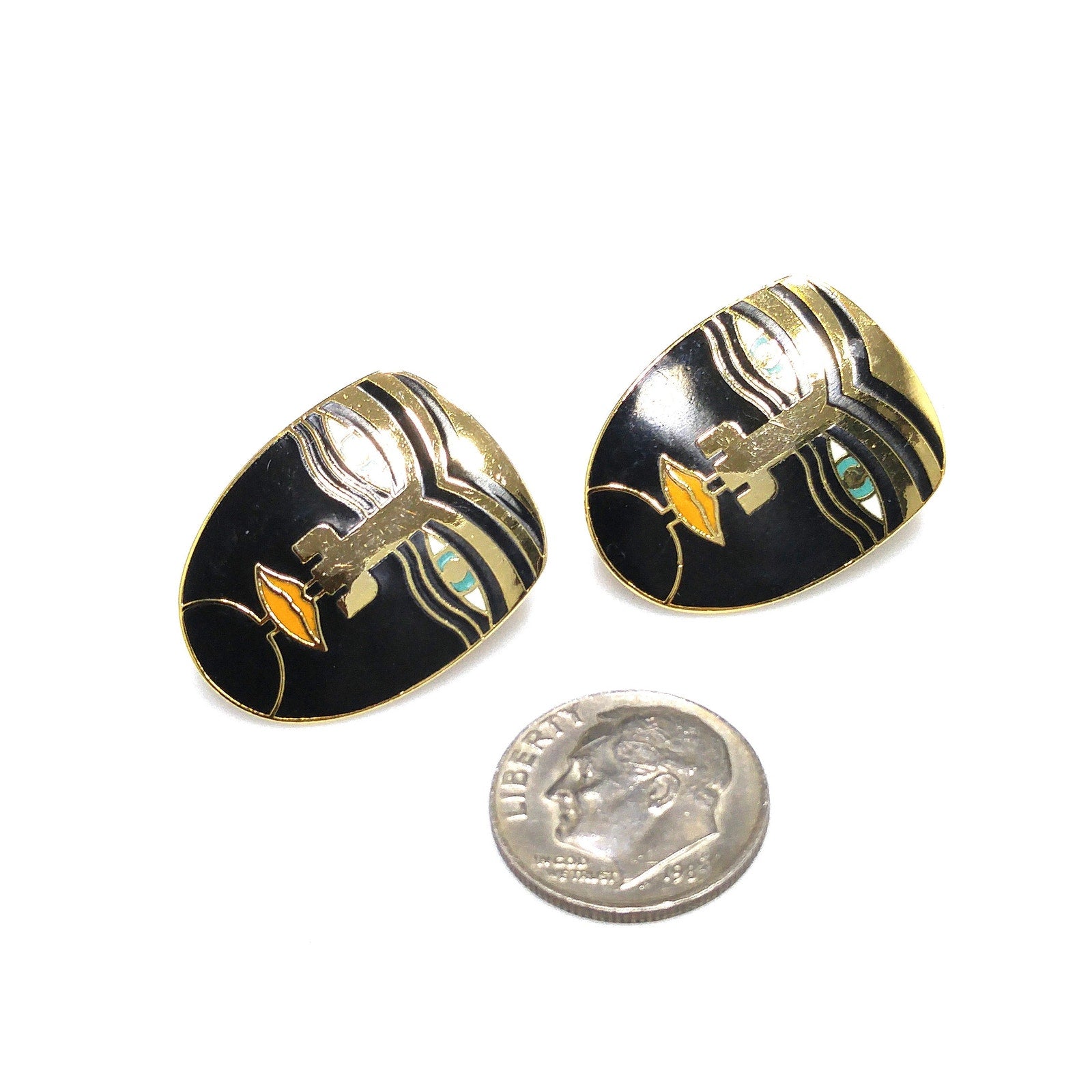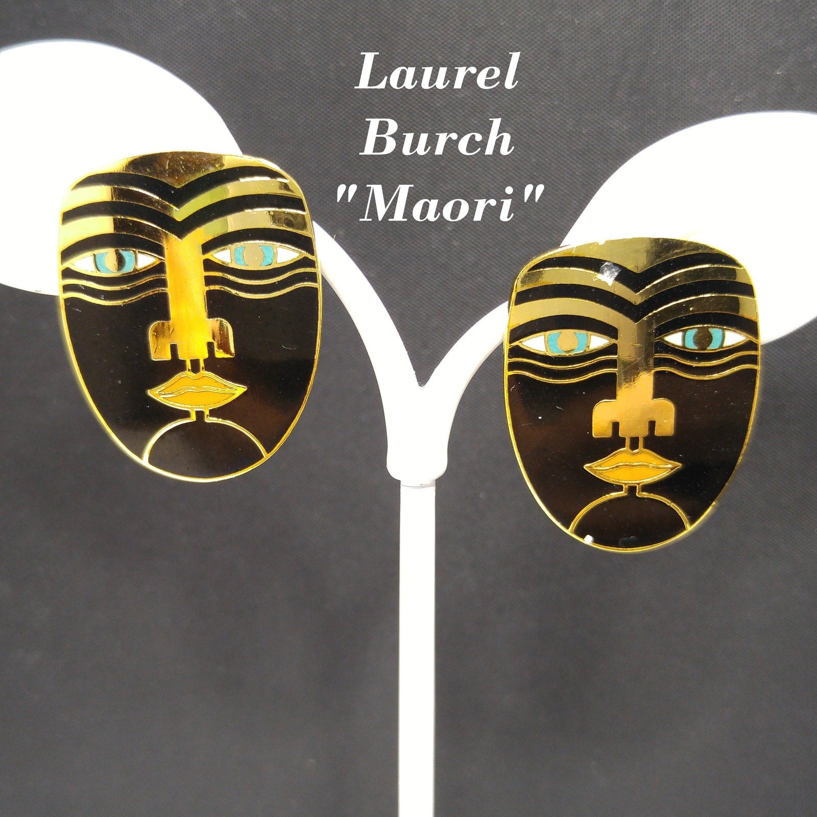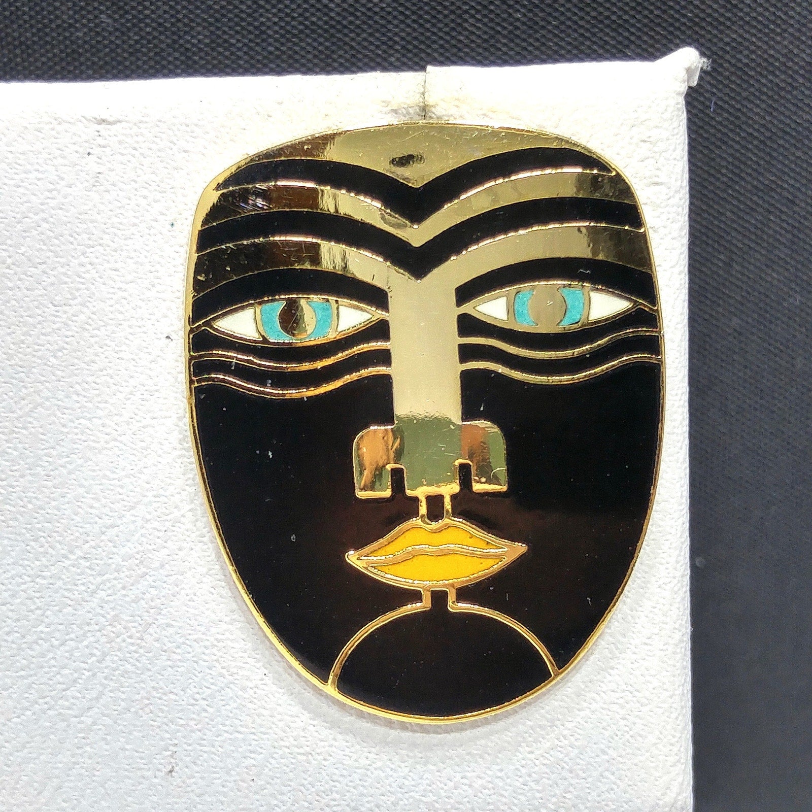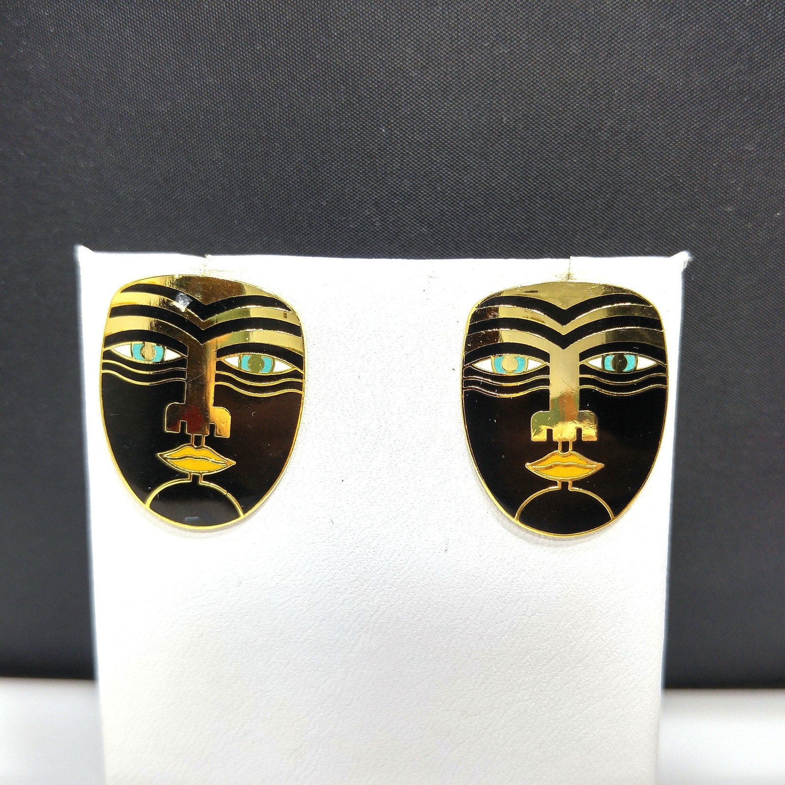 *Description: This is a great pair of Laurel Burch cloisonne post earrings entitled "Maori" from the 1980s. The gold plated cloisonne has a black enamel face with teal and peach accents. The posts are gold filled. Look at the photos closely. There is a little silver mark on one earring on the forehead area. Otherwise, they are in excellent condition. This would be a great addition to your vintage jewelry collection or make a great vintage gift!