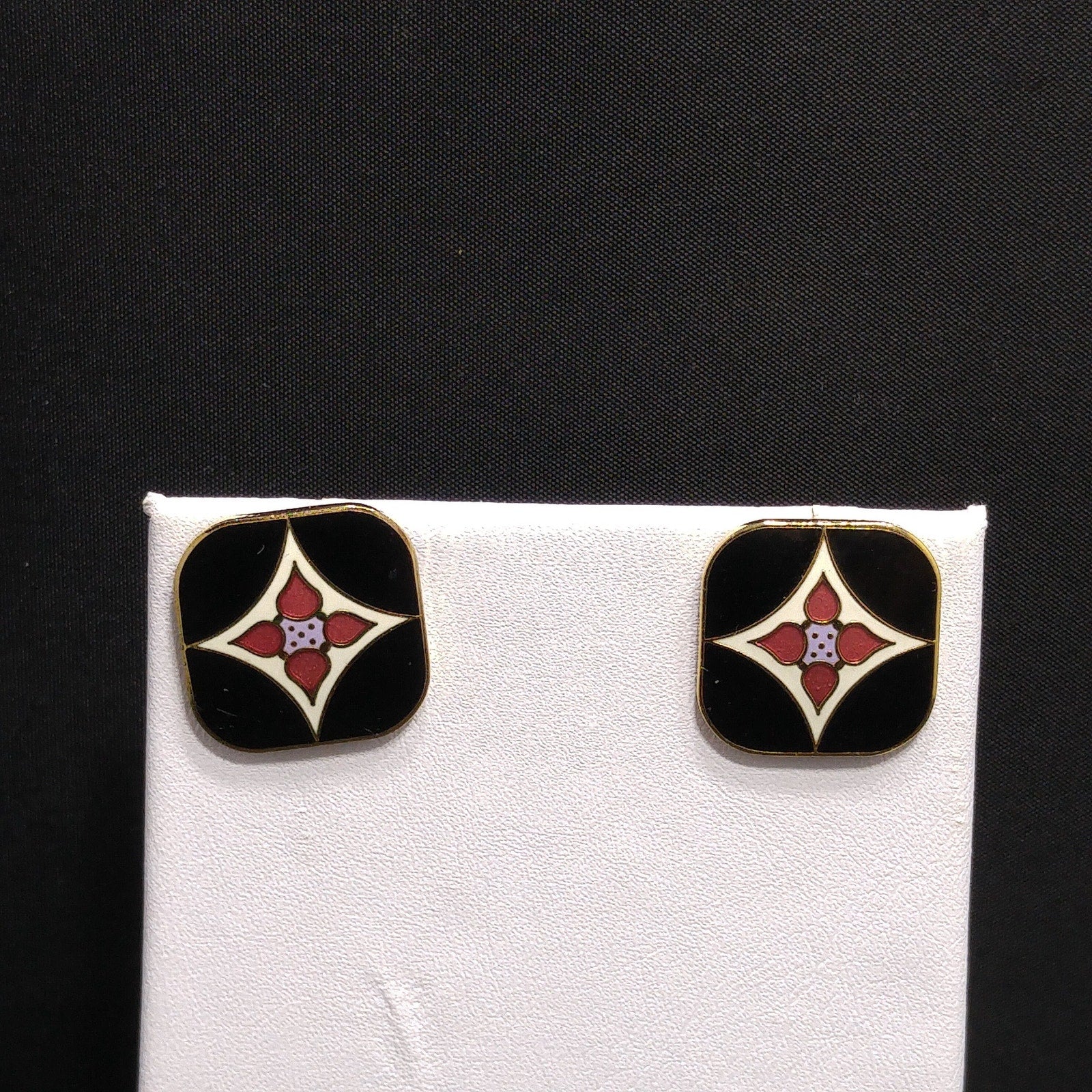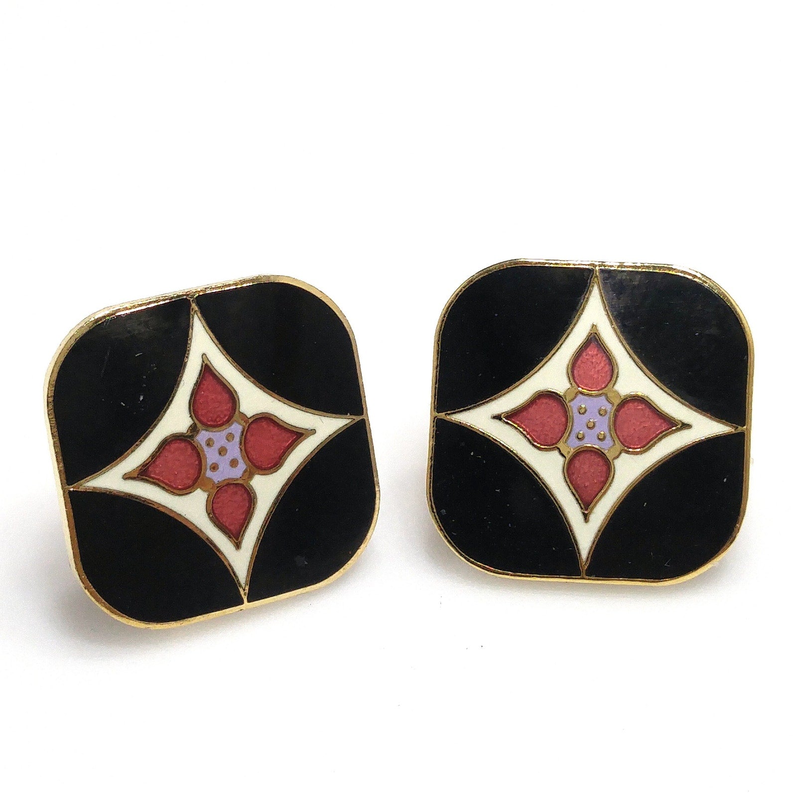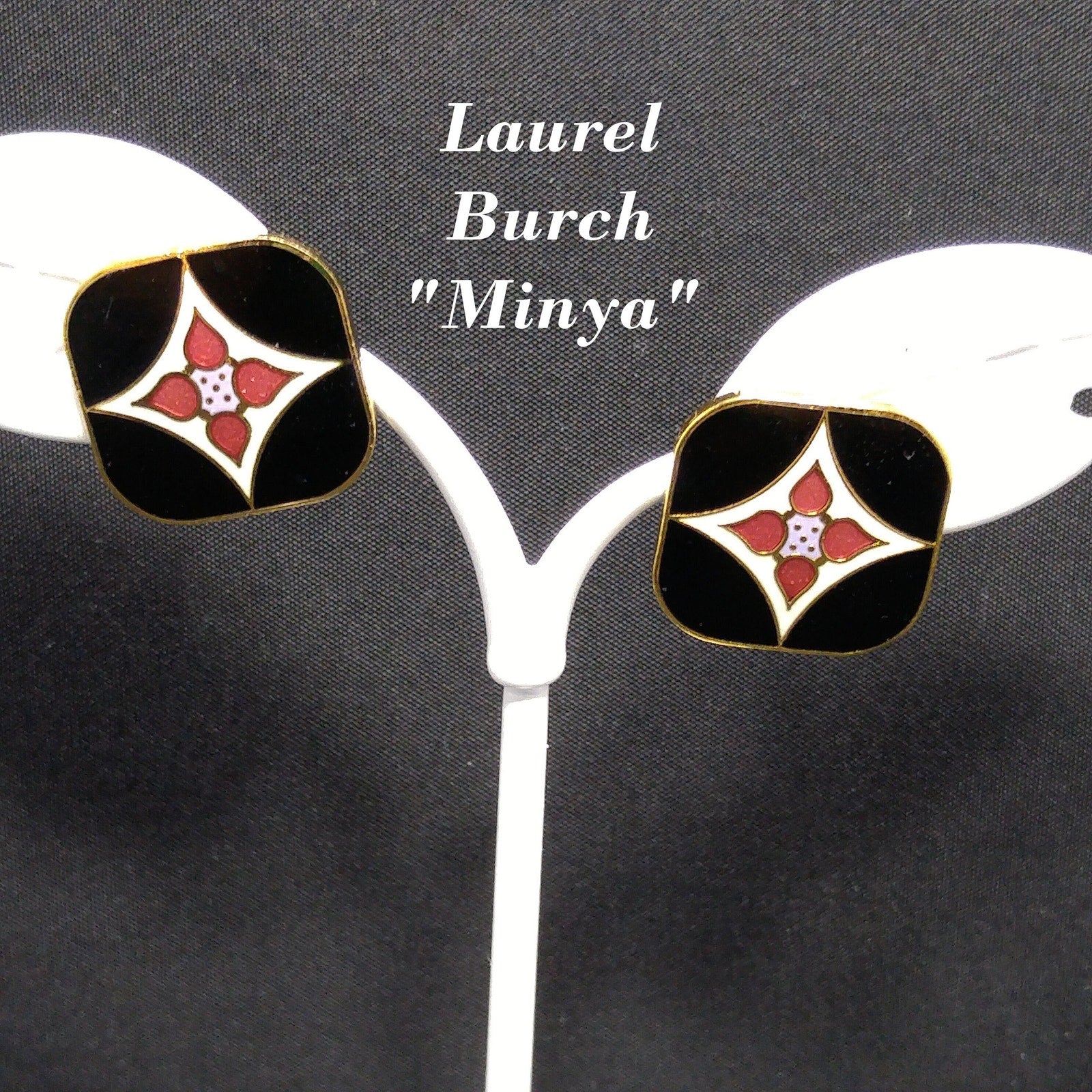 *Description: This is a pair of Laurel Burch vintage floral post earrings in the Minya design, gold plated, cloisonne enamel in black, white, and red from the 1980s. The earrings are both stamped Laurel Burch and Minya on the backs. The posts are gold filled. There are some knicks in the plating on the back along the edges and one plating chip which is more visible in the video. The front of the earrings are great. This would be a great addition to your vintage jewelry collection or make a great vintage gift!