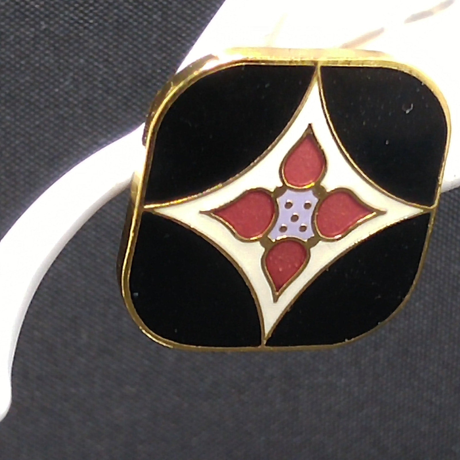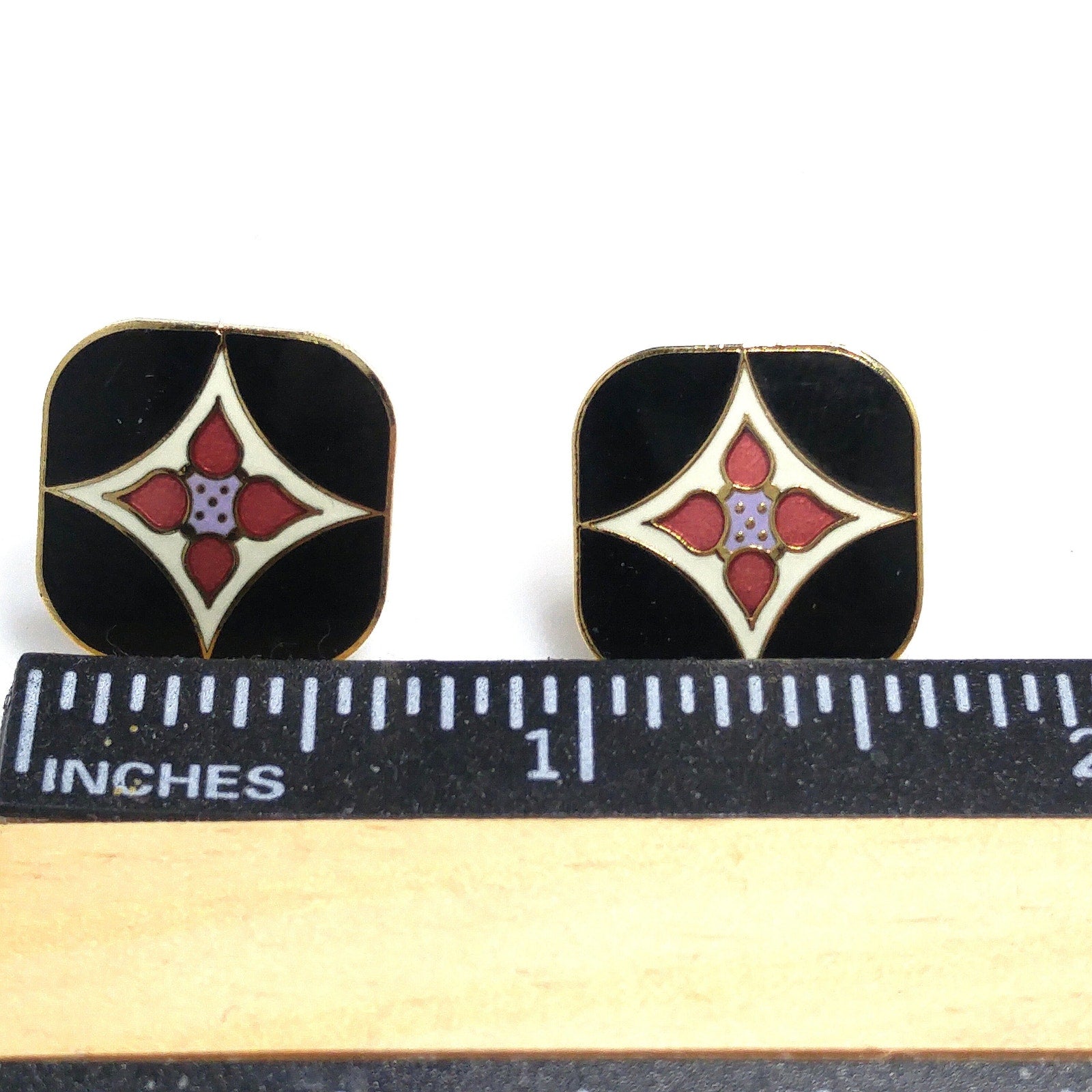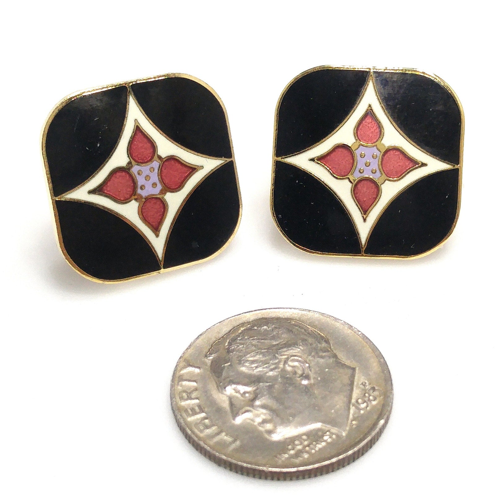 *Description: This is a pair of Laurel Burch vintage floral post earrings in the Minya design, gold plated, cloisonne enamel in black, white, and red from the 1980s. The earrings are both stamped Laurel Burch and Minya on the backs. The posts are gold filled. There are some knicks in the plating on the back along the edges and one plating chip which is more visible in the video. The front of the earrings are great. This would be a great addition to your vintage jewelry collection or make a great vintage gift!