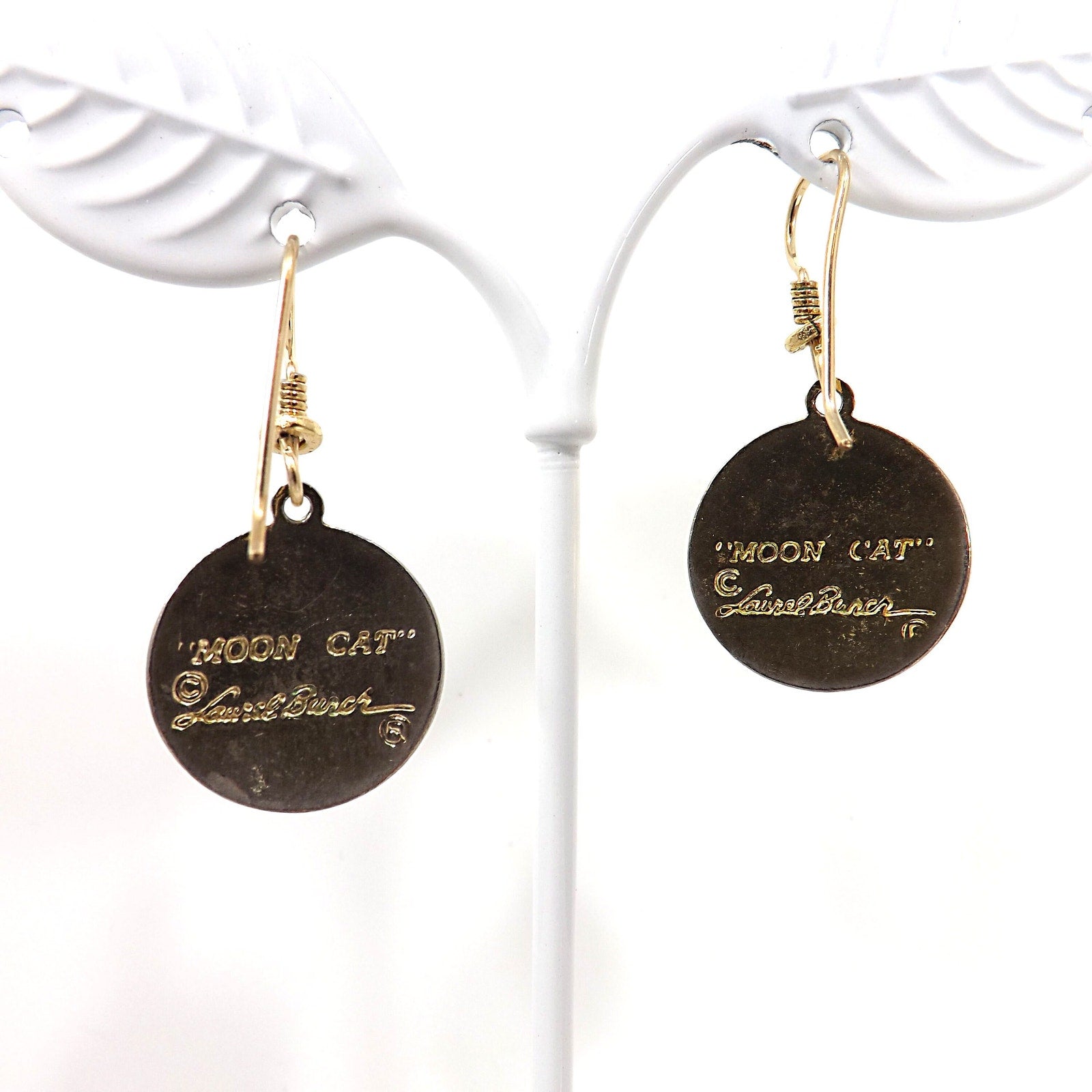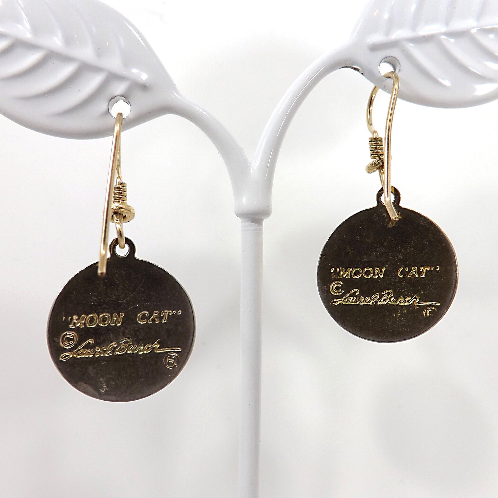 *Description: This is a 1980's pair of Laurel Burch earrings entitled "Moon Cat". They are on a very reflective gold tone round earring with a precious teal cat with pink under its eyes. These earring have been worn so you may see some wear under magnification, however, they are great earrings and this is expected from enamel earrings. I love all of Laurel Burch cat earrings and this pair is no exception. They are smaller than many of her earrings as you can see by the comparison to a penny.