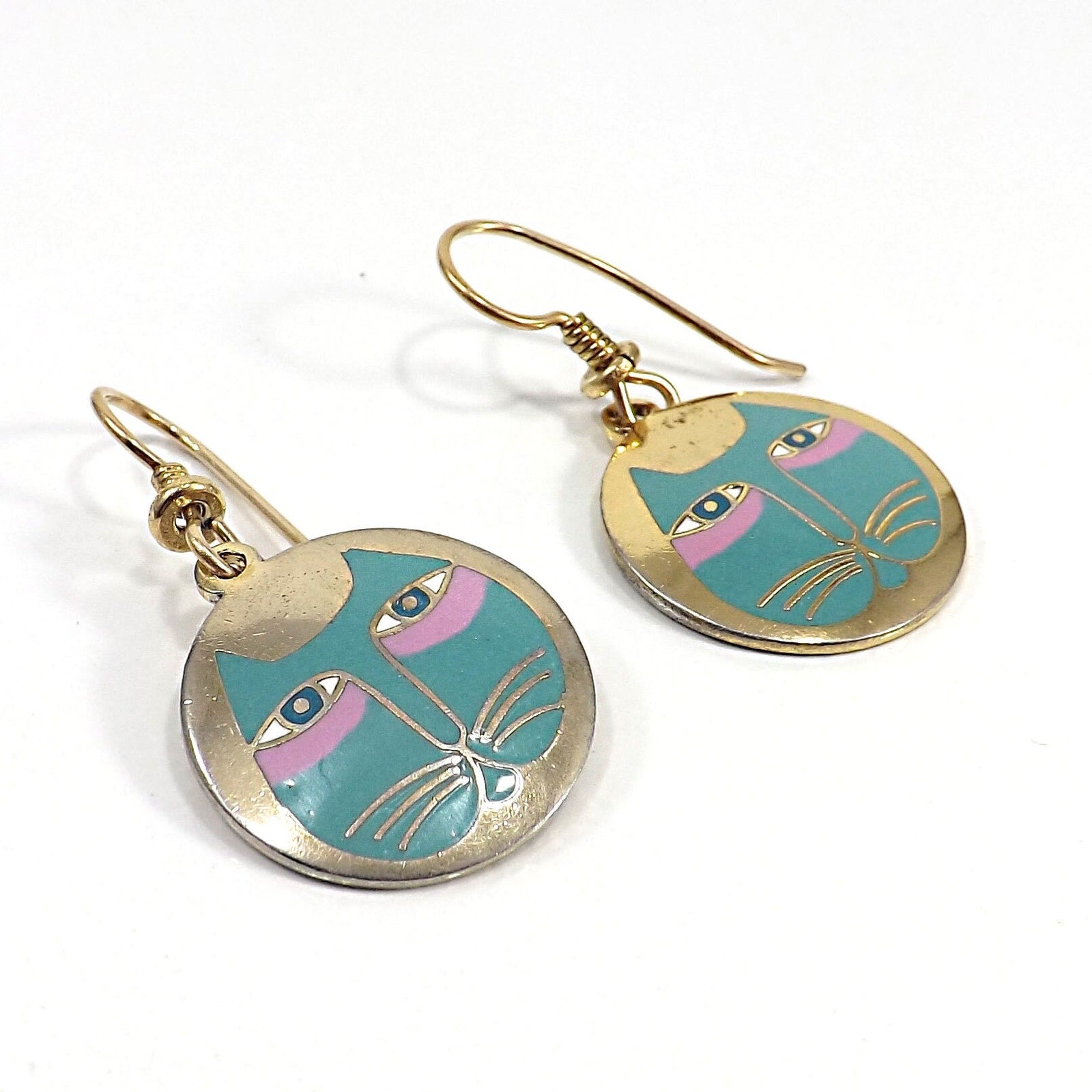 Vintage Laurel Burch "Moon Cat" Teal with Pink & Gold Cats Gold Filled Ear Wires 1980s Laurel Burch Vintage Jewelry