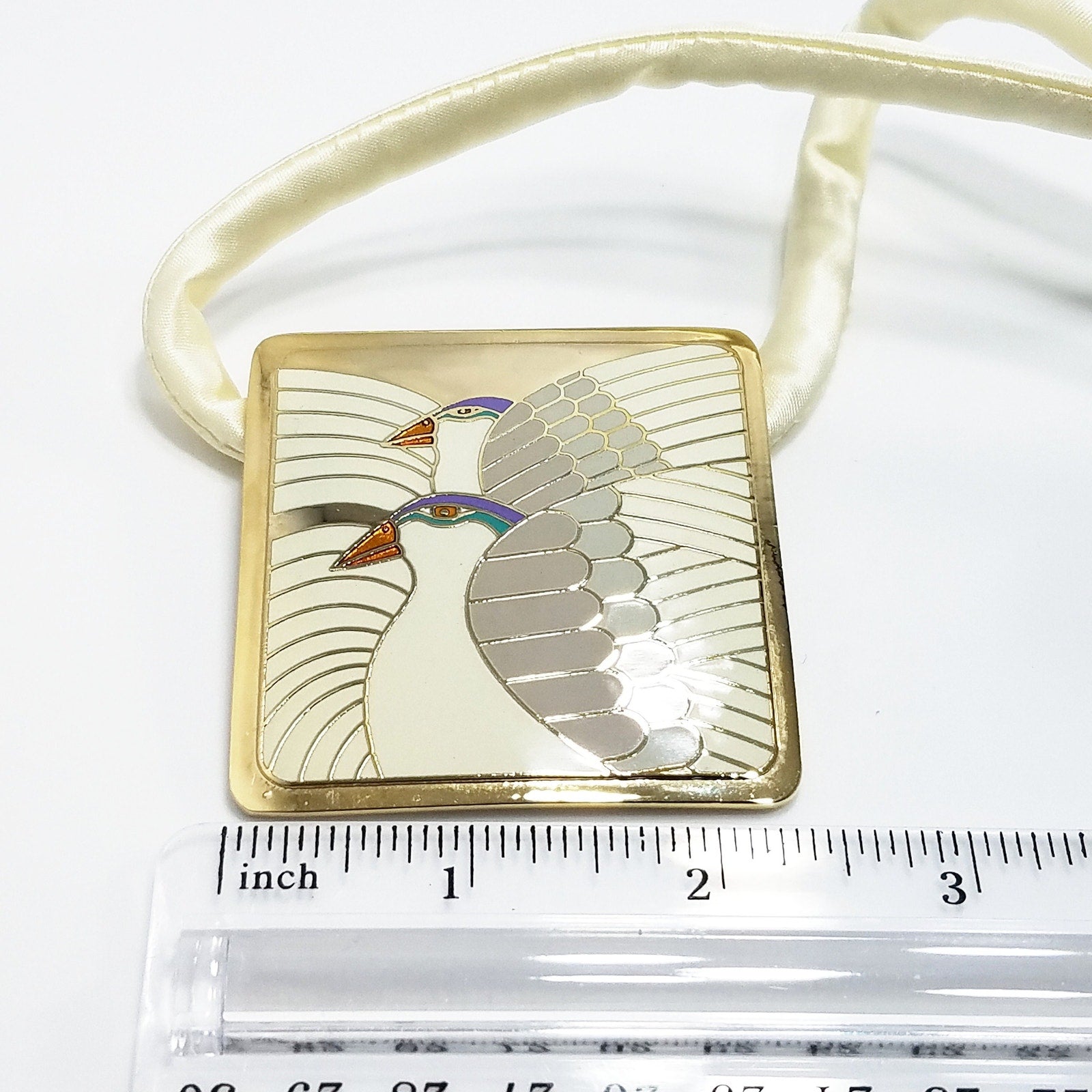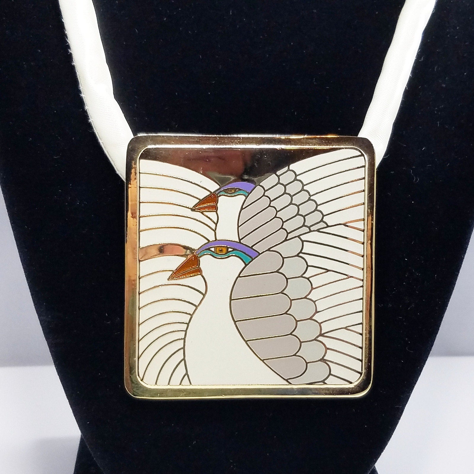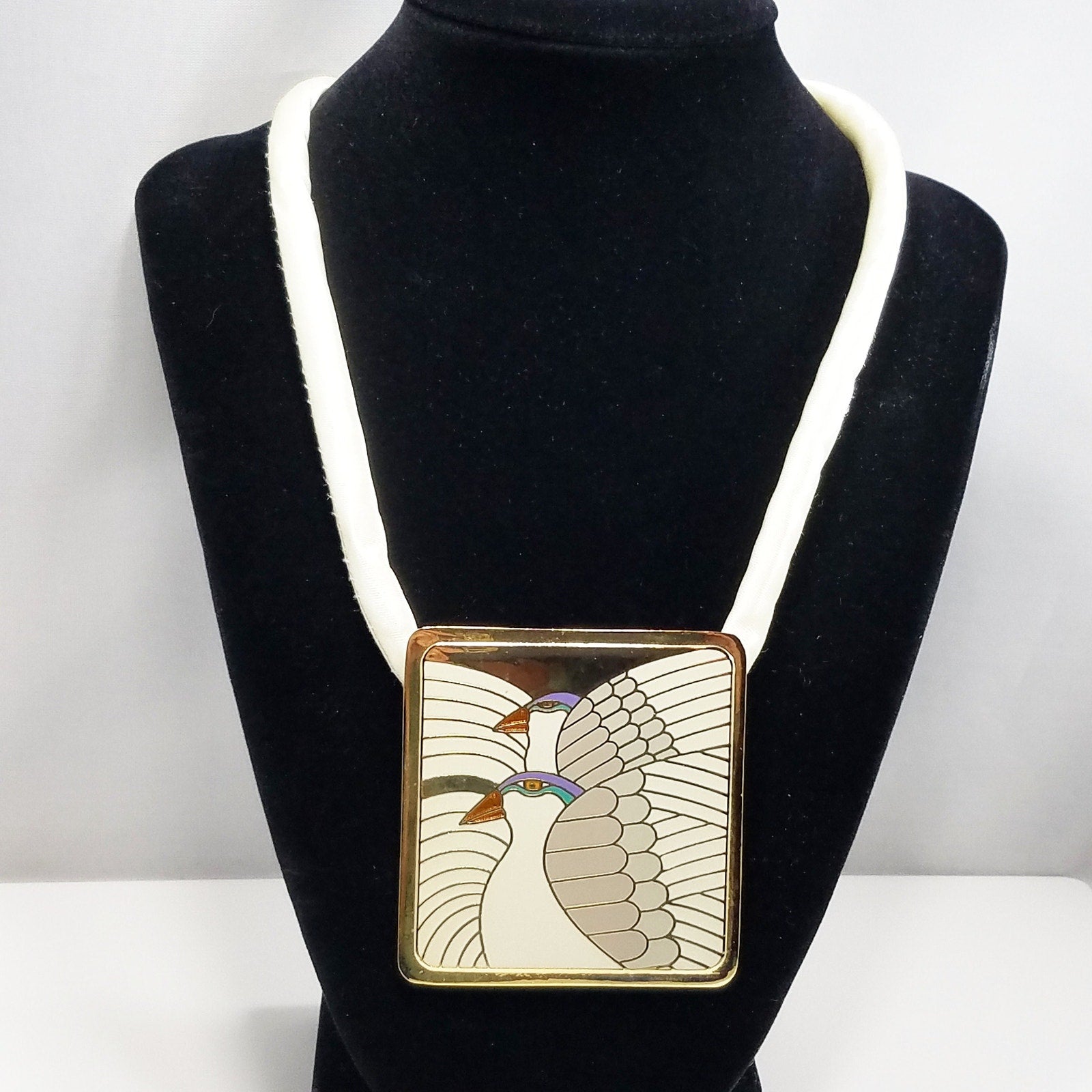 *Description: Beautiful Laurel Burch rare pendant necklace in her "Moon Doves" design. The necklace is 38 inches of silk white cording, approximately 3/8 inches thick. The cord can be tied to the desired length. The pendant is large at 2 1/2 Inches in length and has the exquisite artistry of Laurel Burch with the two Moon Doves in white with a light lavender feathered wings. The birds have purple and teal on their heads with a muted orange eyes with gold center and shiny orange beaks. The bird pendant is outline in gold plate as are all of the cloisonne design outlines. The back of the pendant is signed LAUREL BURCH and "moon doves". This is a great vintage necklace of a wonderful artist. It would be a wonderful addition to your Laurel Burch collection.