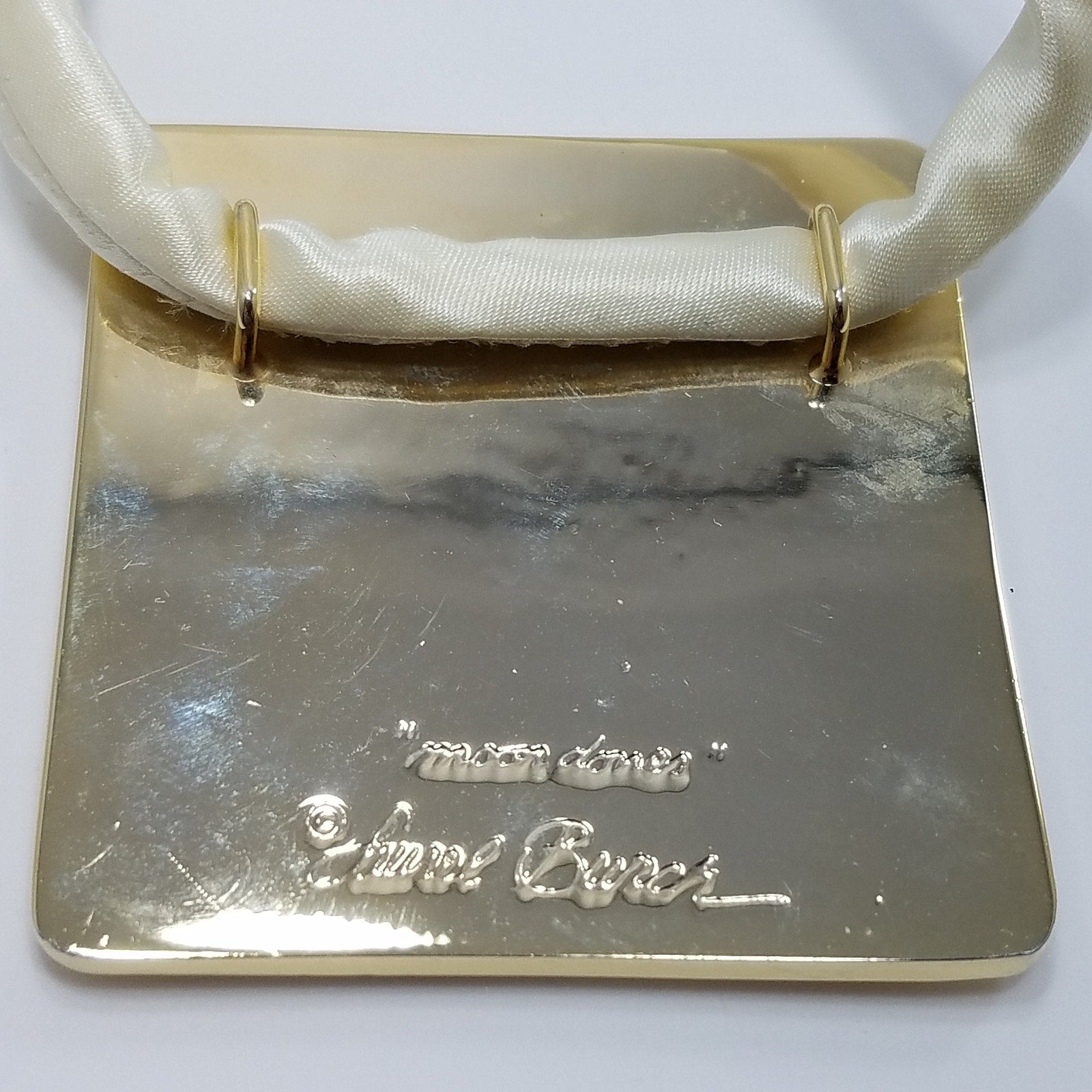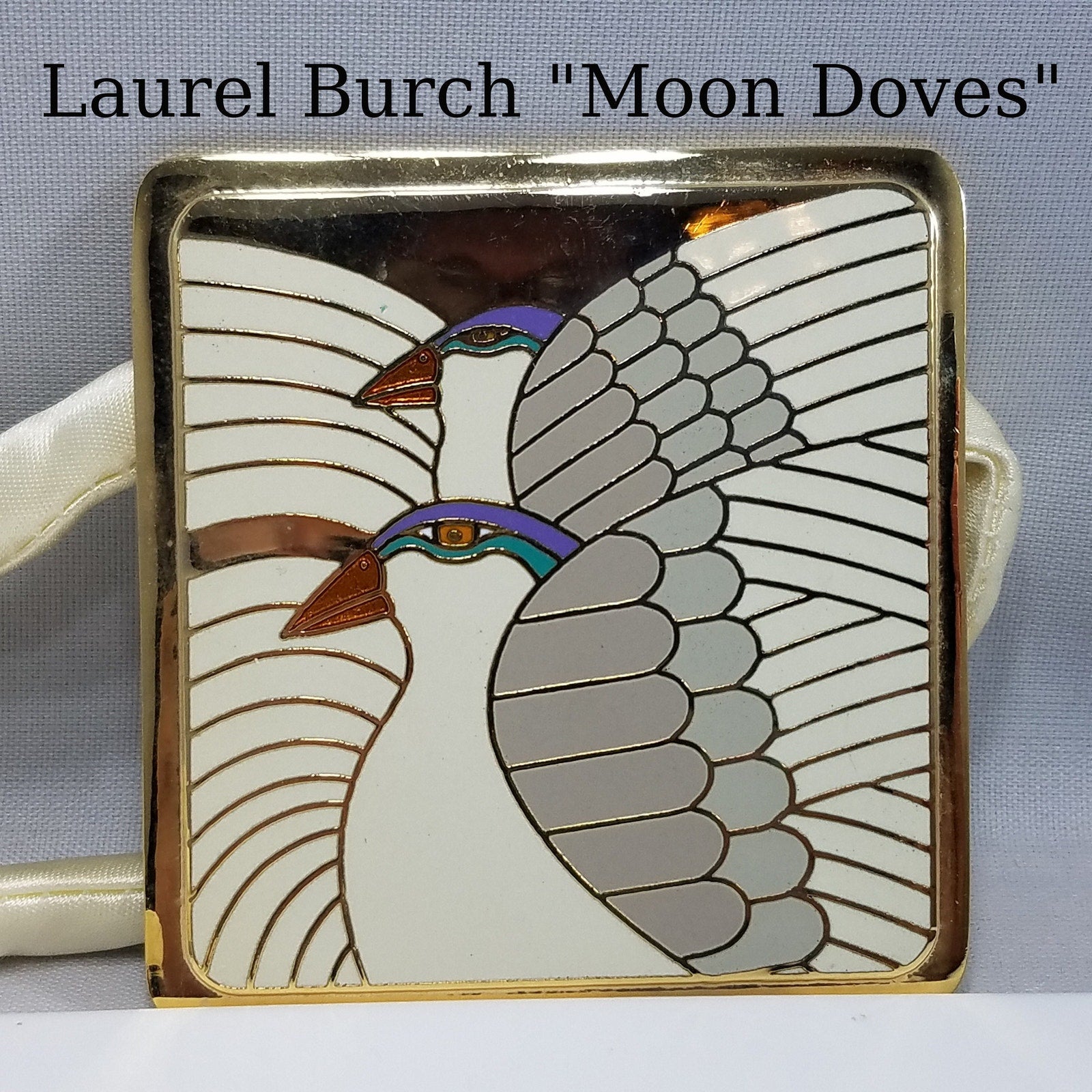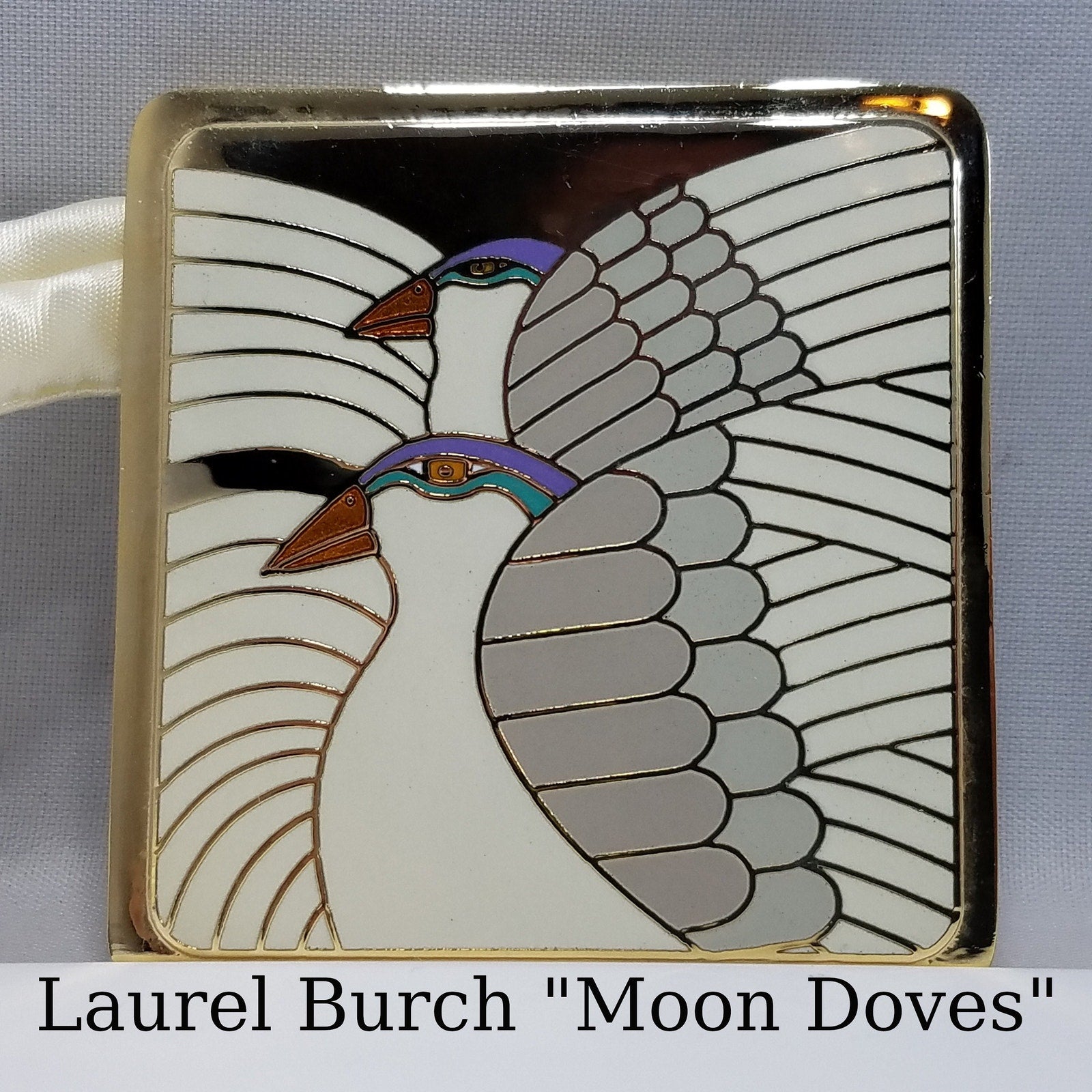 *Description: Beautiful Laurel Burch rare pendant necklace in her "Moon Doves" design. The necklace is 38 inches of silk white cording, approximately 3/8 inches thick. The cord can be tied to the desired length. The pendant is large at 2 1/2 Inches in length and has the exquisite artistry of Laurel Burch with the two Moon Doves in white with a light lavender feathered wings. The birds have purple and teal on their heads with a muted orange eyes with gold center and shiny orange beaks. The bird pendant is outline in gold plate as are all of the cloisonne design outlines. The back of the pendant is signed LAUREL BURCH and "moon doves". This is a great vintage necklace of a wonderful artist. It would be a wonderful addition to your Laurel Burch collection.