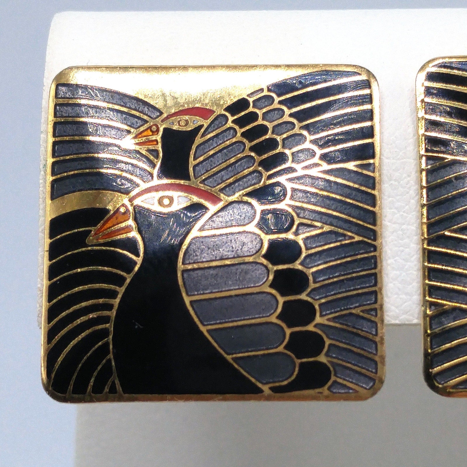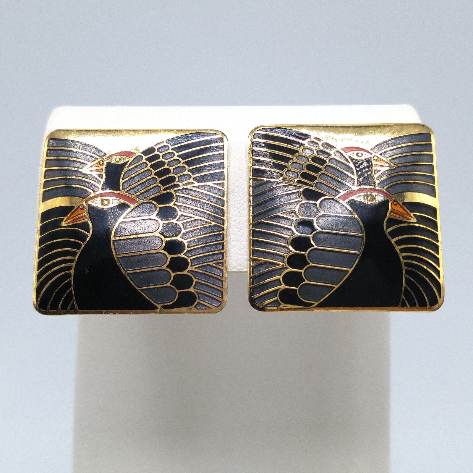*Description: This is a beautiful pair of Laurel Burch clip-on vintage earrings entitled "Moondoves" from the 1980s. This pair of earrings have gold plated cloisonne outlines with enamel in black, silver gray, red, and orange. The earrings have two moondoves facing the same directions with their wings open and beautifully showing each feather. This is a great design by Laurel Burch and wonderful earrings for the bird or nature lover. The gold tone is very reflective and it is difficult to get a true photo of that portion of the earrings. Each earring may show slight dings on the back. They are a great pair of earrings for your Laurel Burch collection.