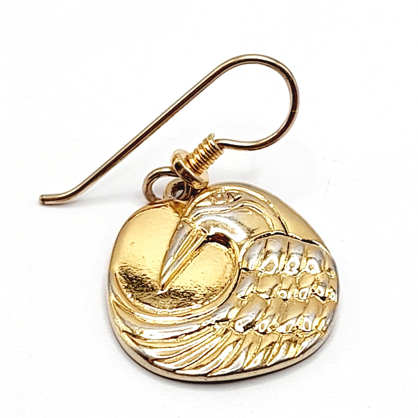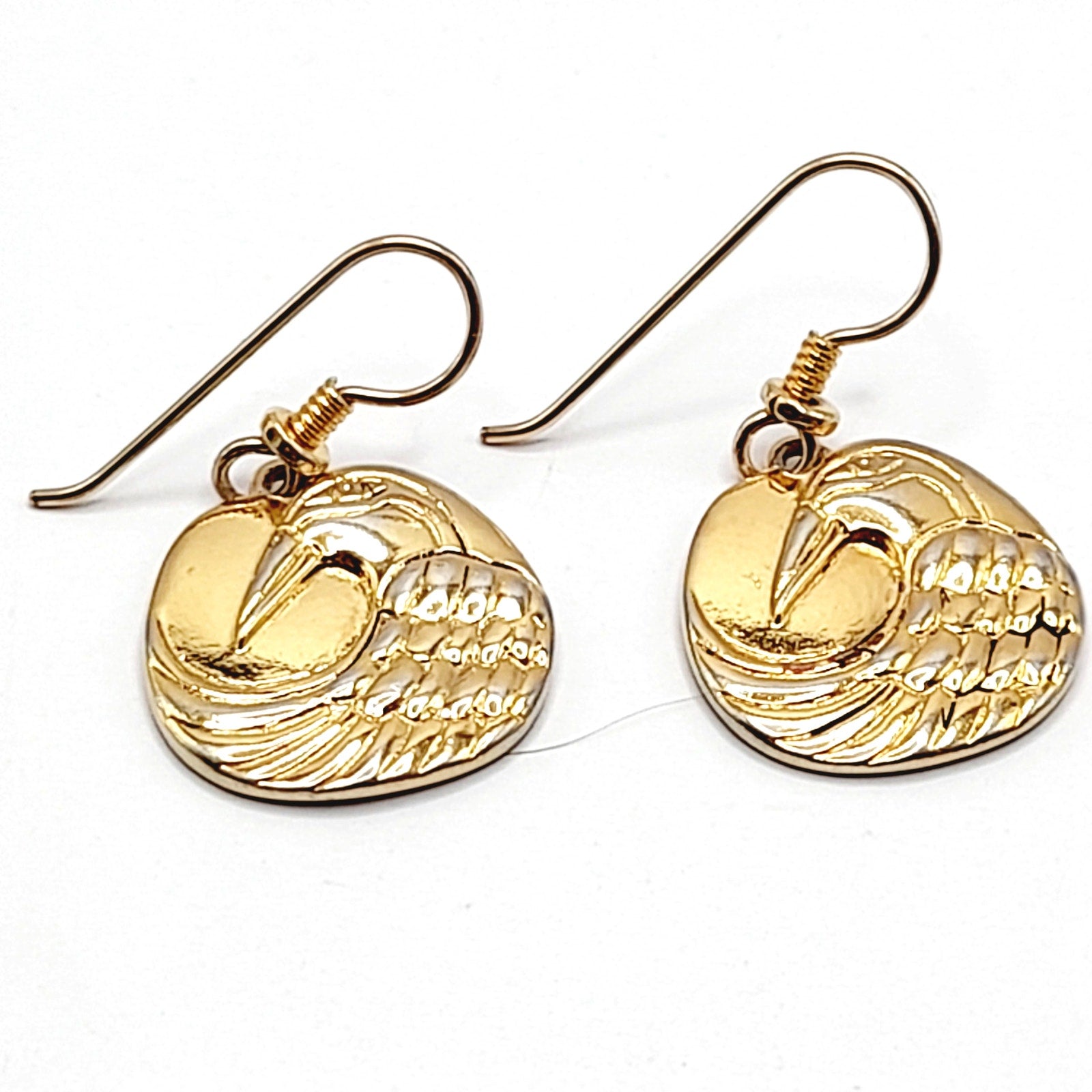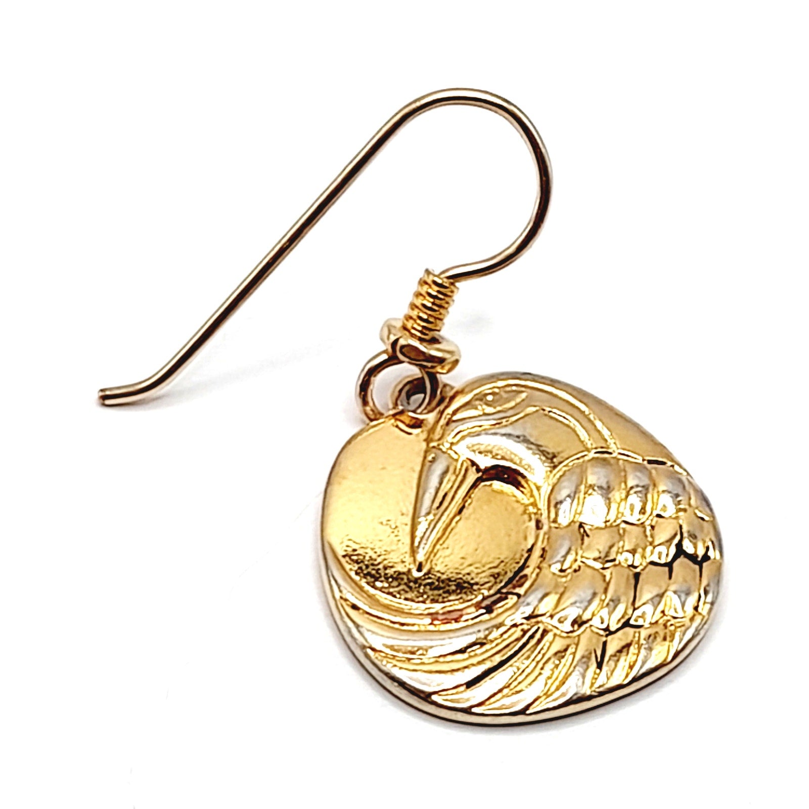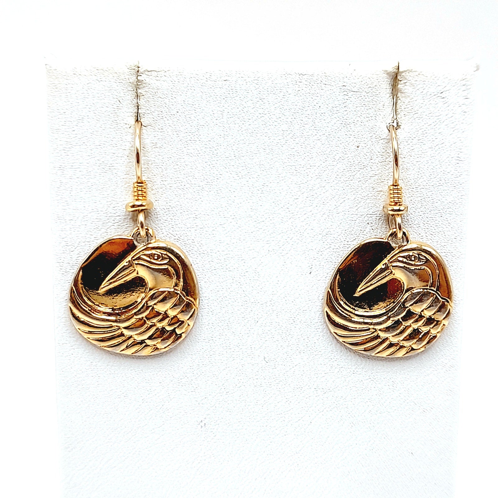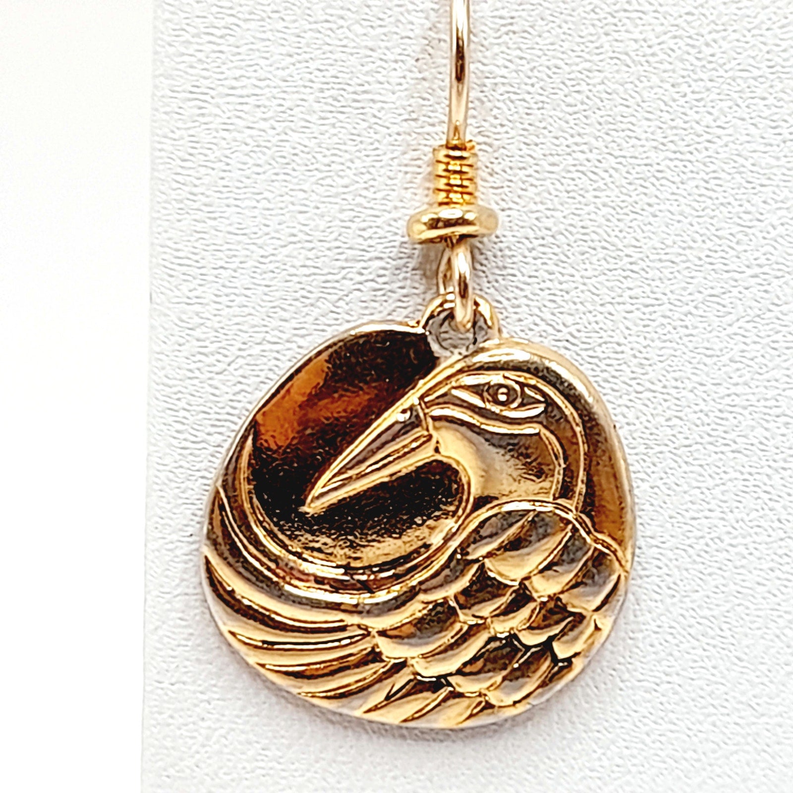 These gorgeous gold-plated earrings showcase Laurel Burch's beloved bird motif in her signature mystical style. The Mynah bird design features her characteristic flowing lines and artistic interpretation that transforms a simple bird into a magical, almost mythical creature. The warm gold plating gives these earrings a luxurious finish that catches the light beautifully.