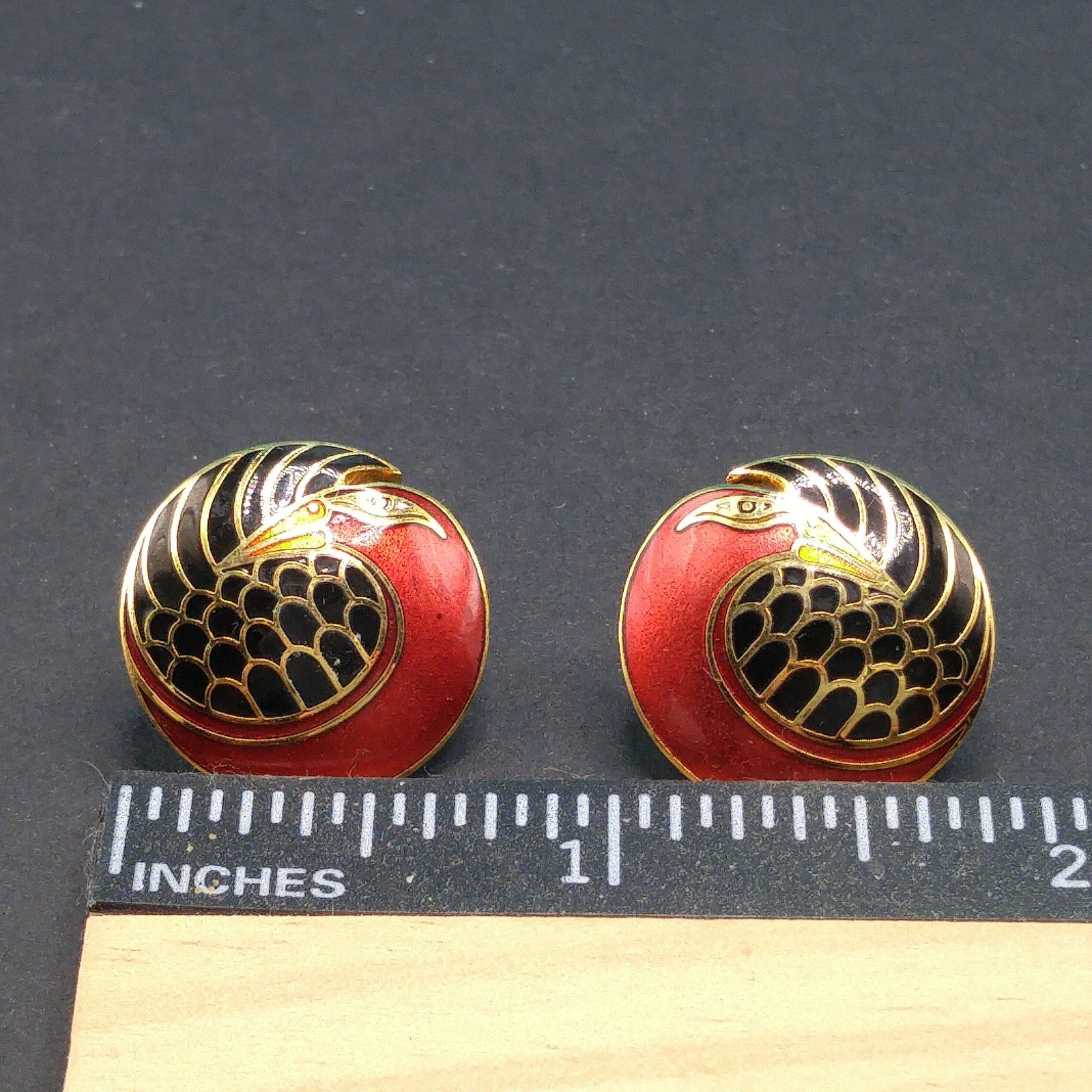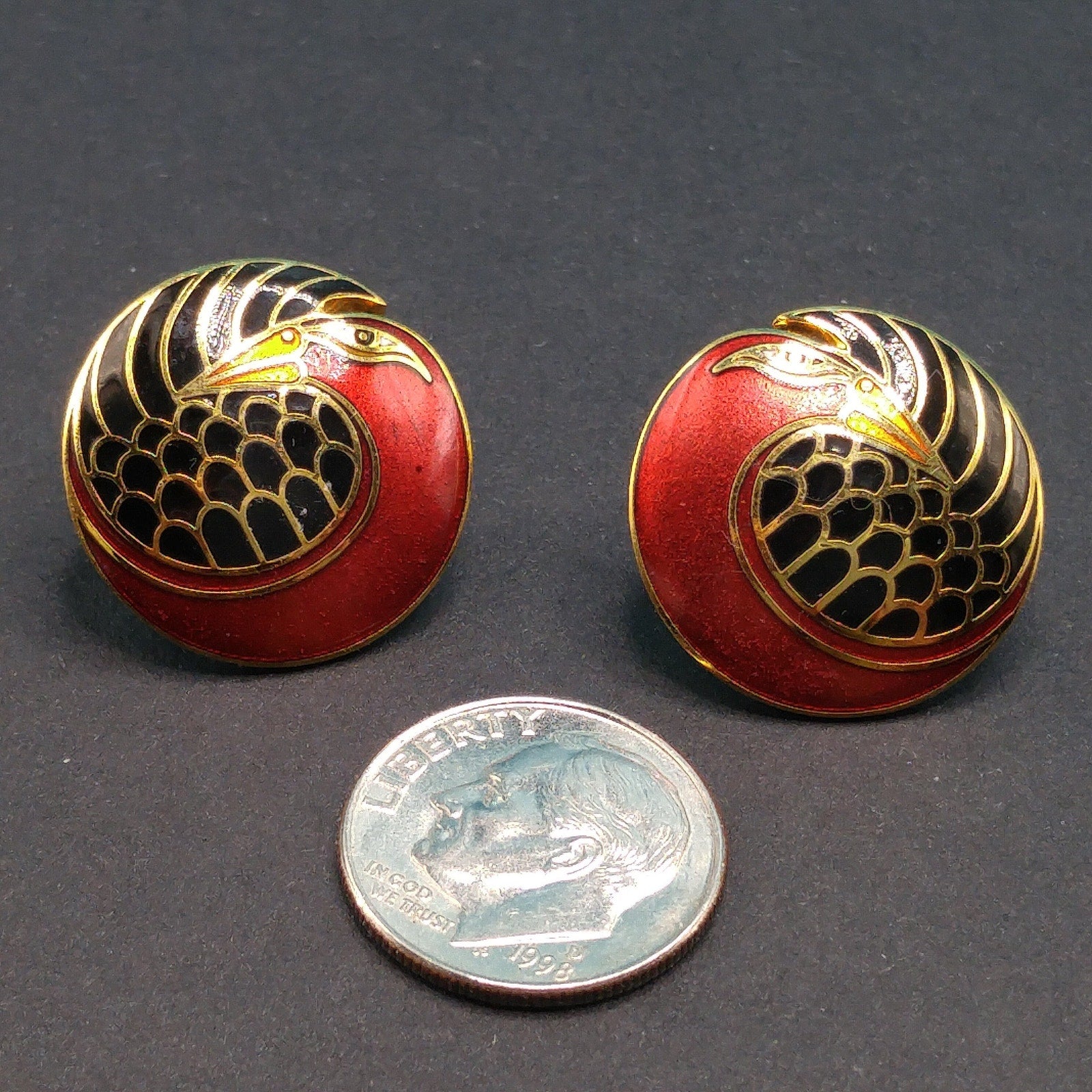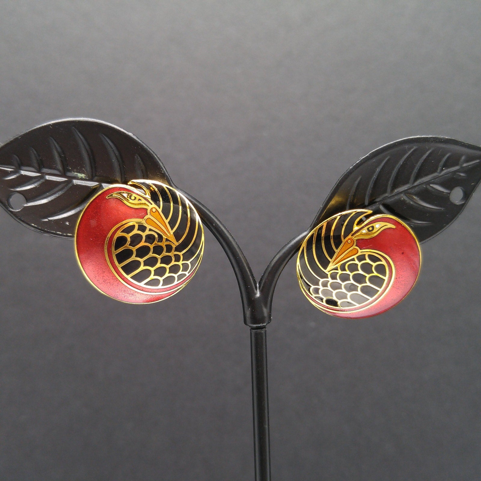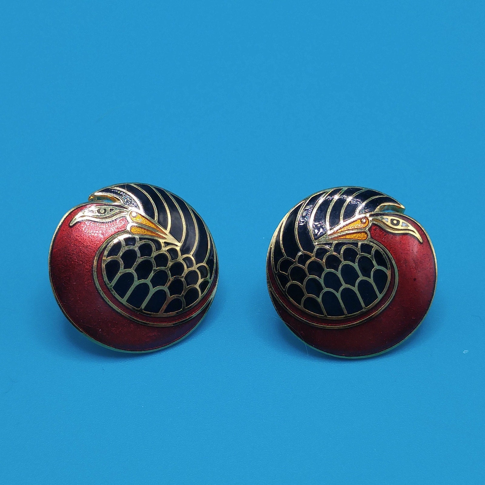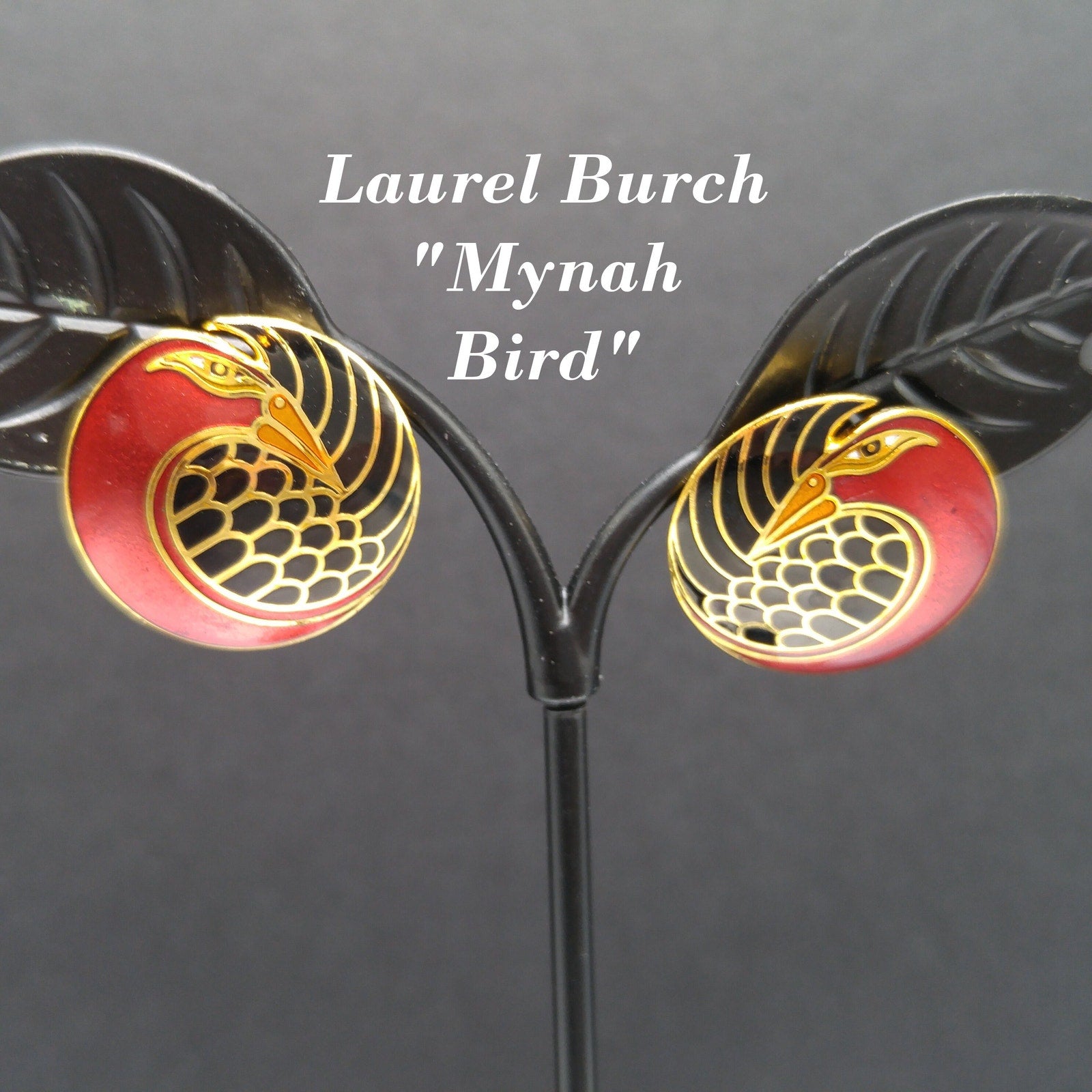 *Description: This is a beautiful pair of vintage cloisonné metallic red and black enamel & gold plated post earrings by Laurel Burch from the 1980s. The earrings are entitled "Mynah Bird" and are designed on a circle with a little cut out between the bird's head and feathers. This is the smaller size of this design, measuring 3/4 Inch across. Each earring is stamped "MYNAH BIRD" and Laurel Burch. The post is gold filled. This would be a great addition to your vintage jewelry collection or make a great vintage gift!