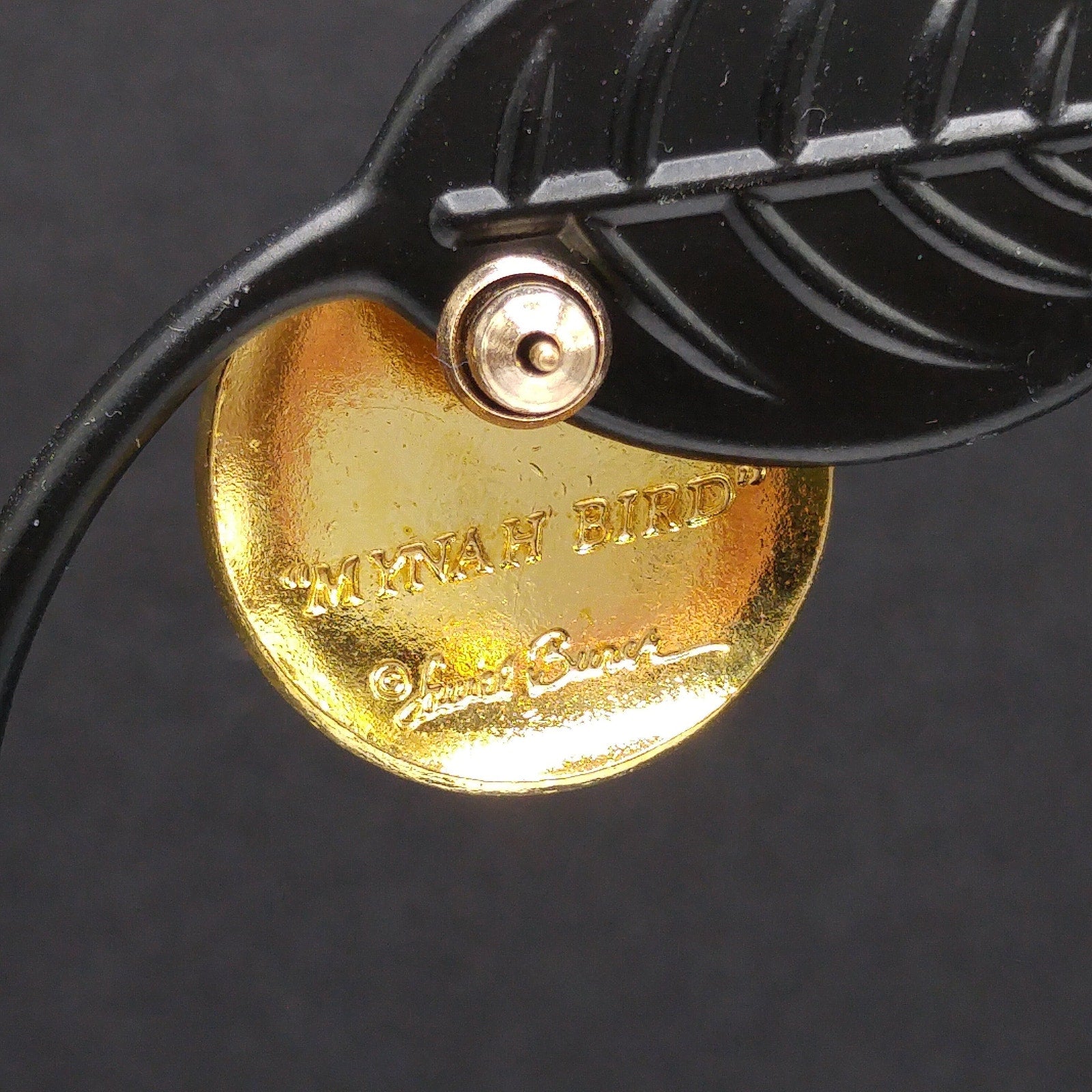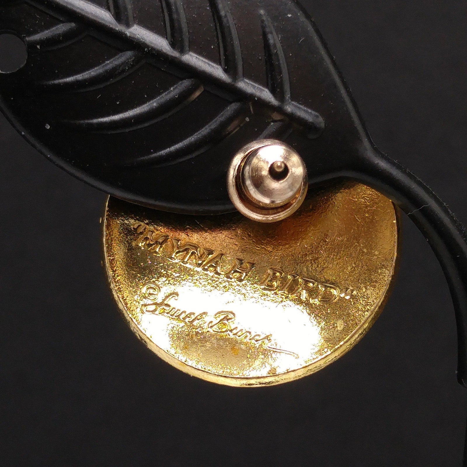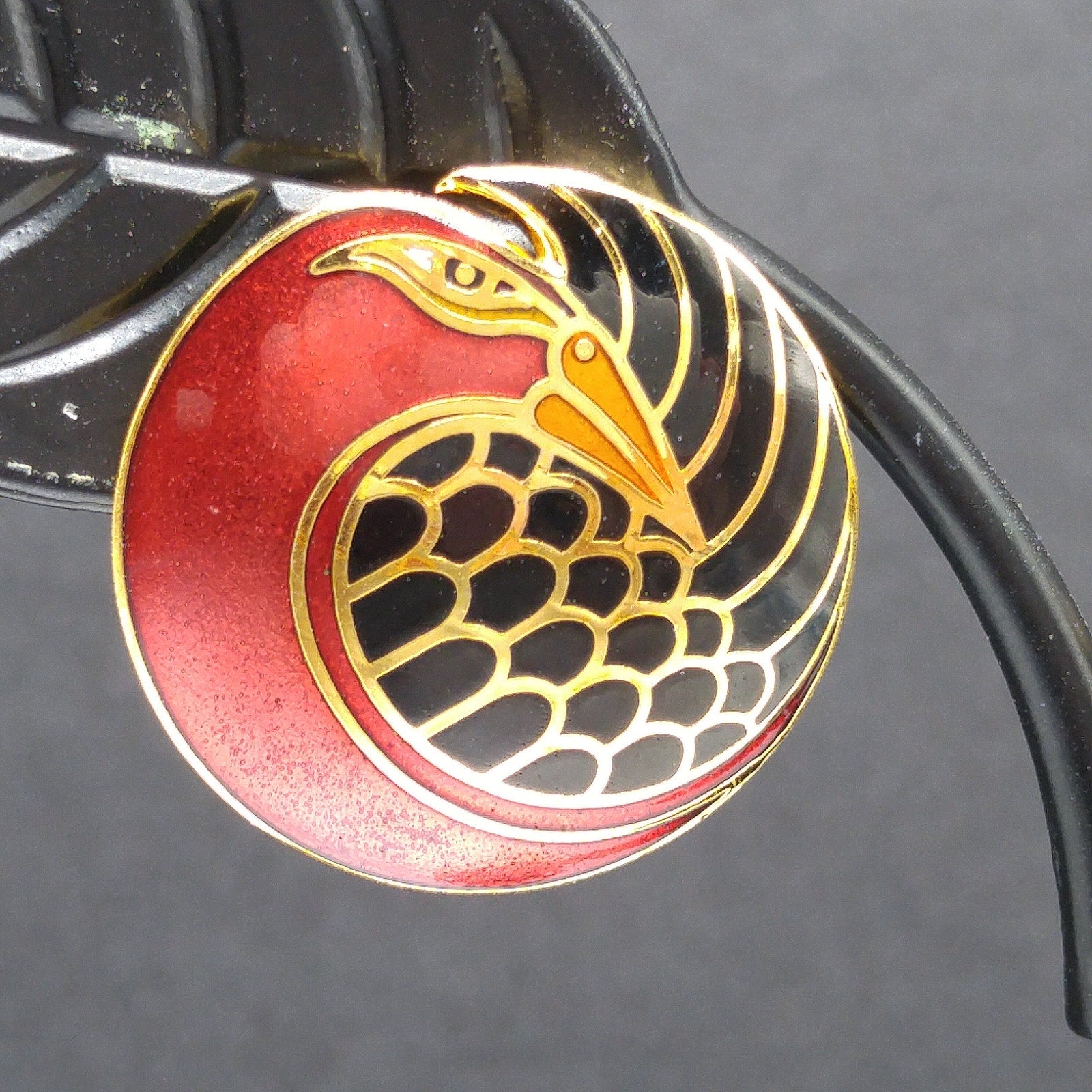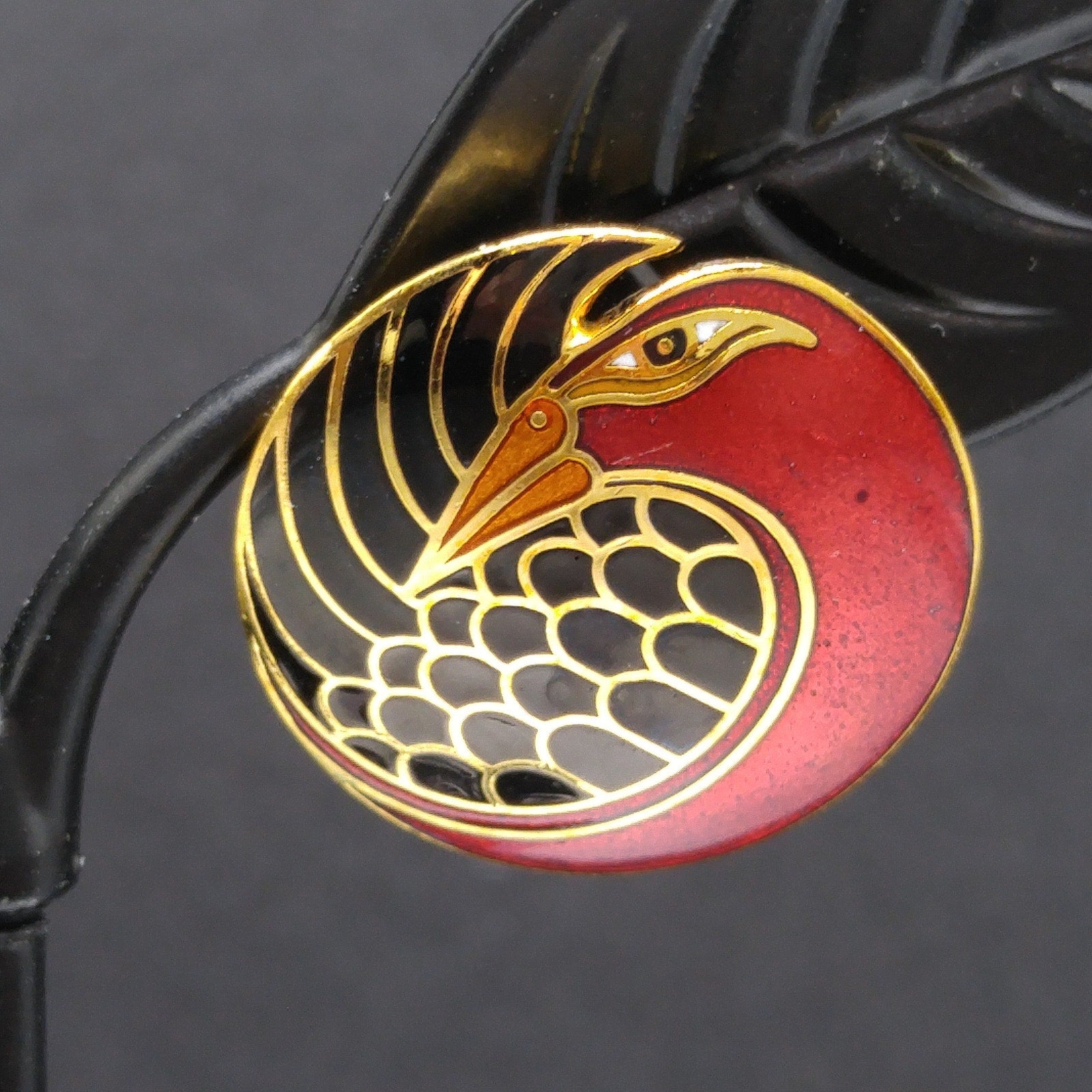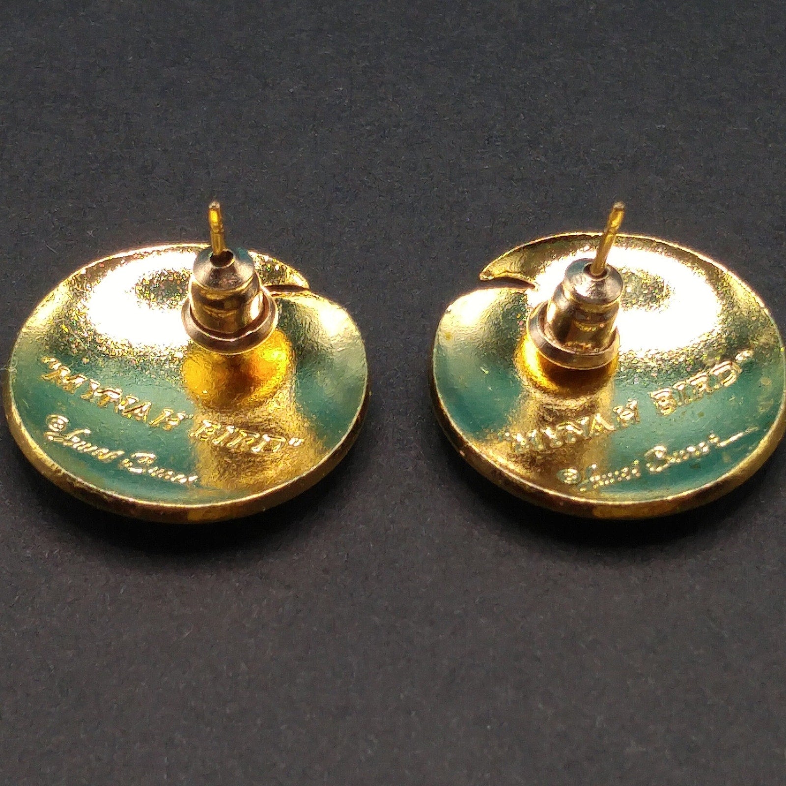 *Description: This is a beautiful pair of vintage cloisonné metallic red and black enamel & gold plated post earrings by Laurel Burch from the 1980s. The earrings are entitled "Mynah Bird" and are designed on a circle with a little cut out between the bird's head and feathers. This is the smaller size of this design, measuring 3/4 Inch across. Each earring is stamped "MYNAH BIRD" and Laurel Burch. The post is gold filled. This would be a great addition to your vintage jewelry collection or make a great vintage gift!