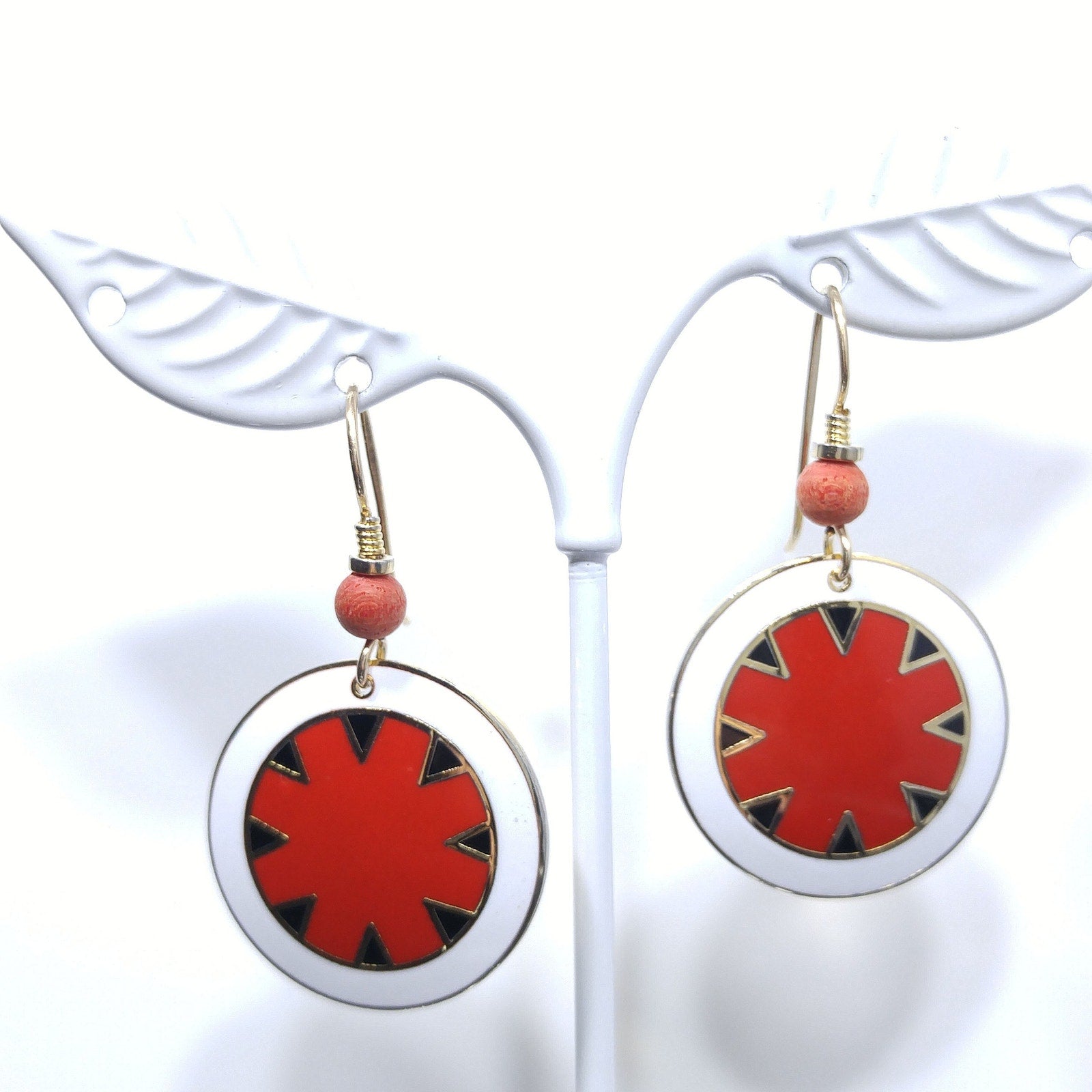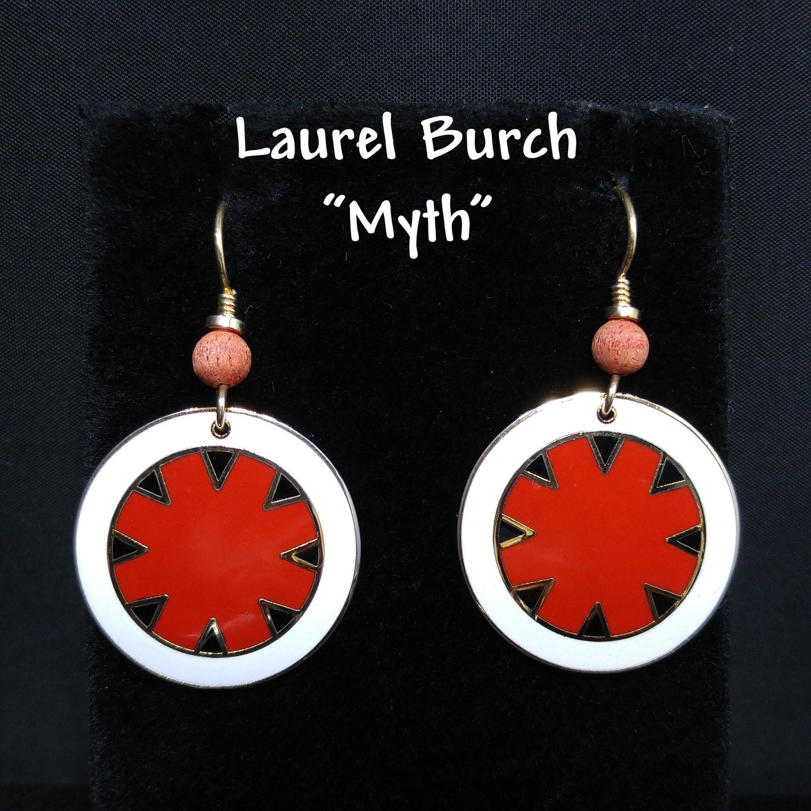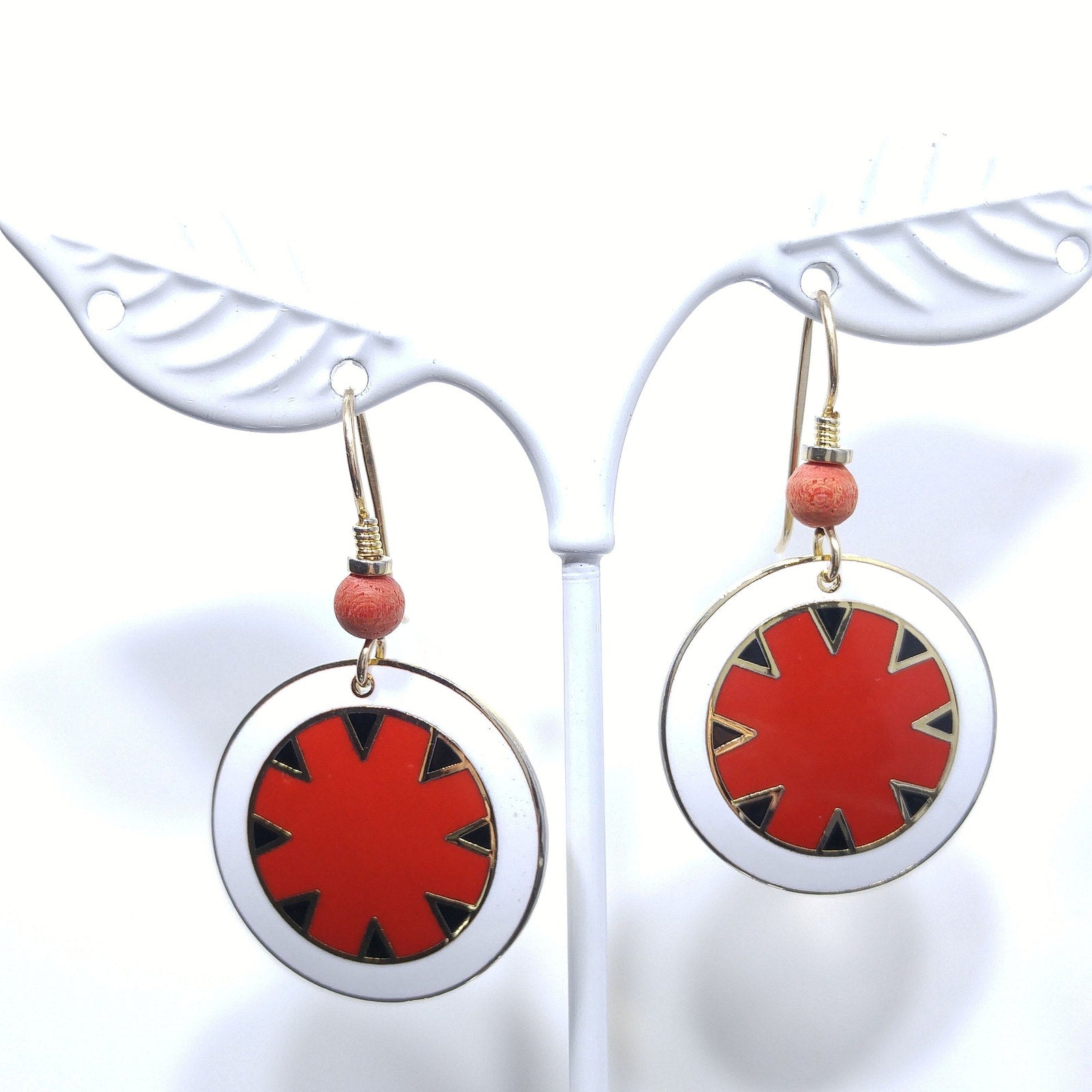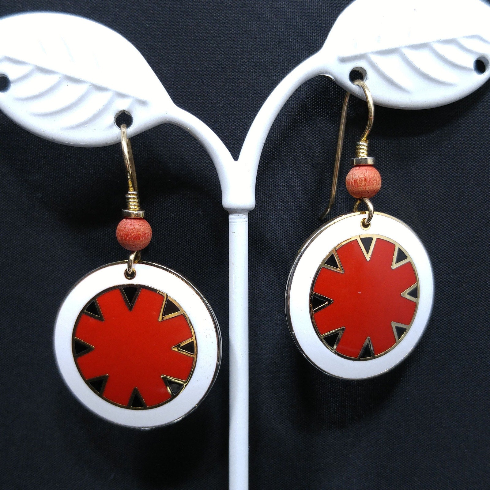 *Description: This is a beautiful pair of Laurel Burch earrings entitled "Myth" from the 1980s. This gold plated cloisonne pair of earrings have a red enamel center with geometric triangles in black and a white circle frame around the edges. The gold filled ear wires have a red wooden bead on the drop portion. This is a great pair of Laurel Burch earrings to wear with many outfits or give as a vintage gift.