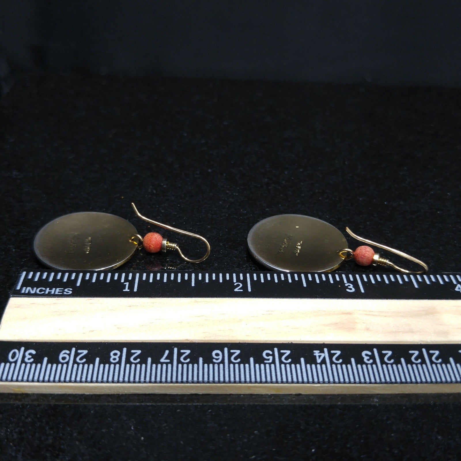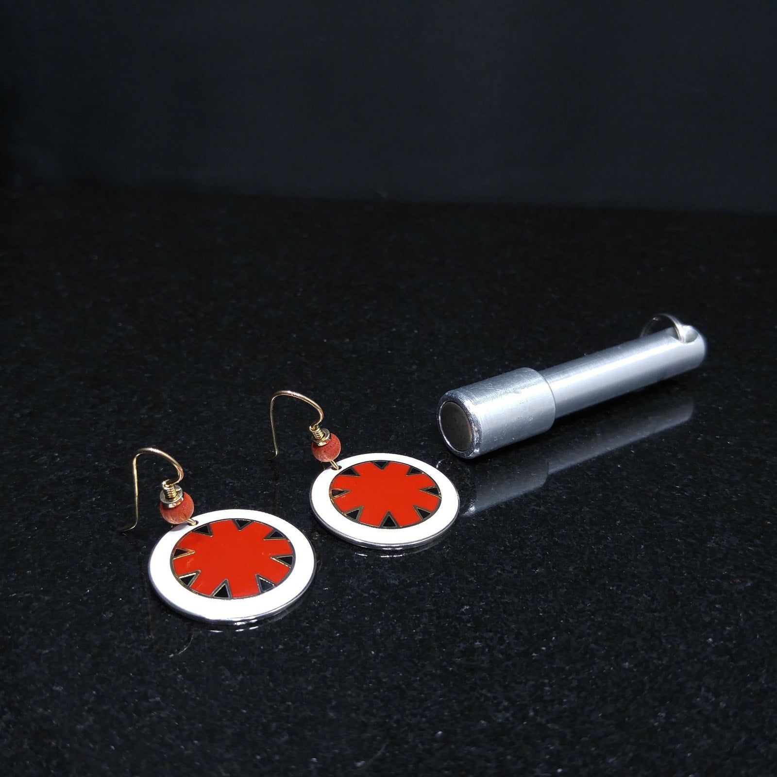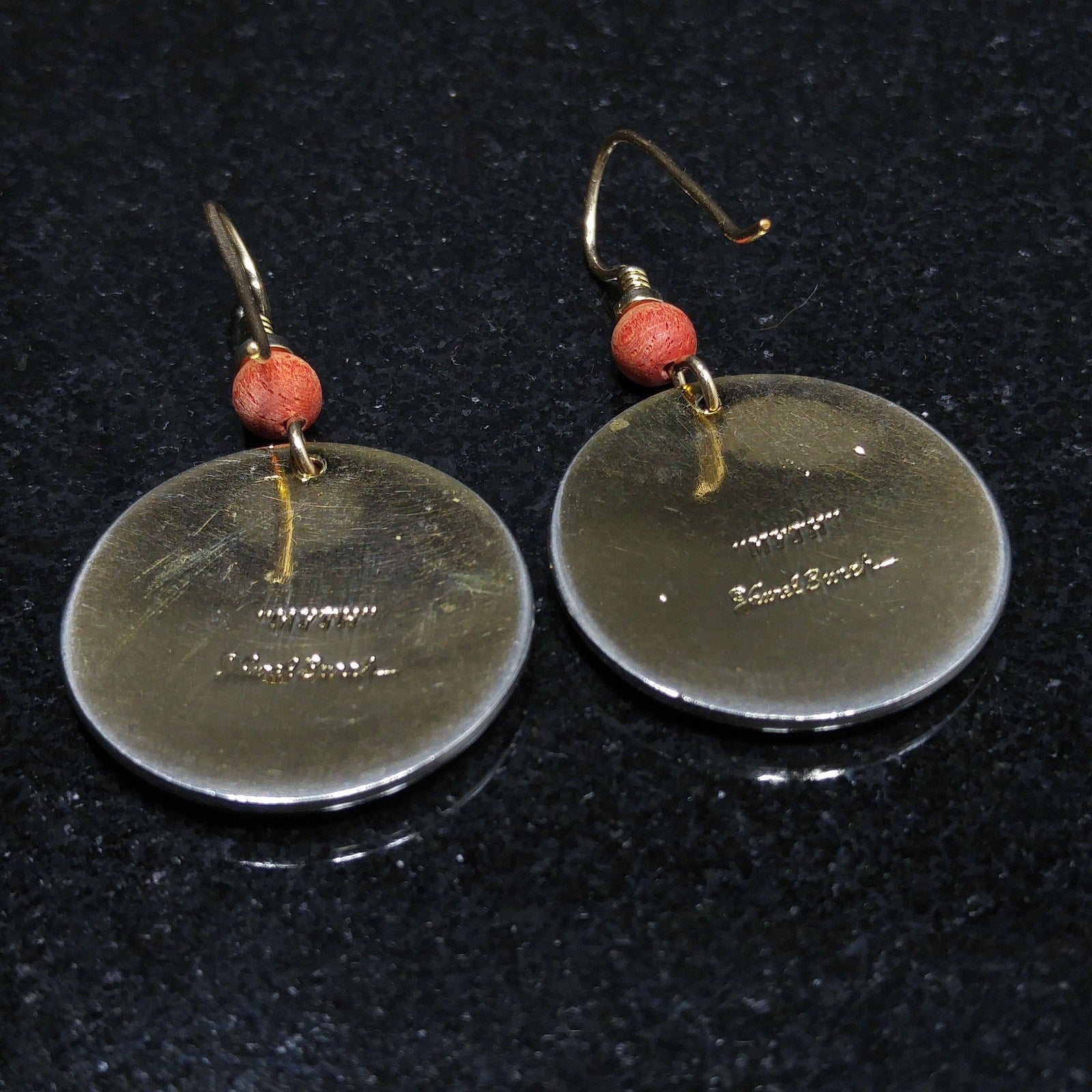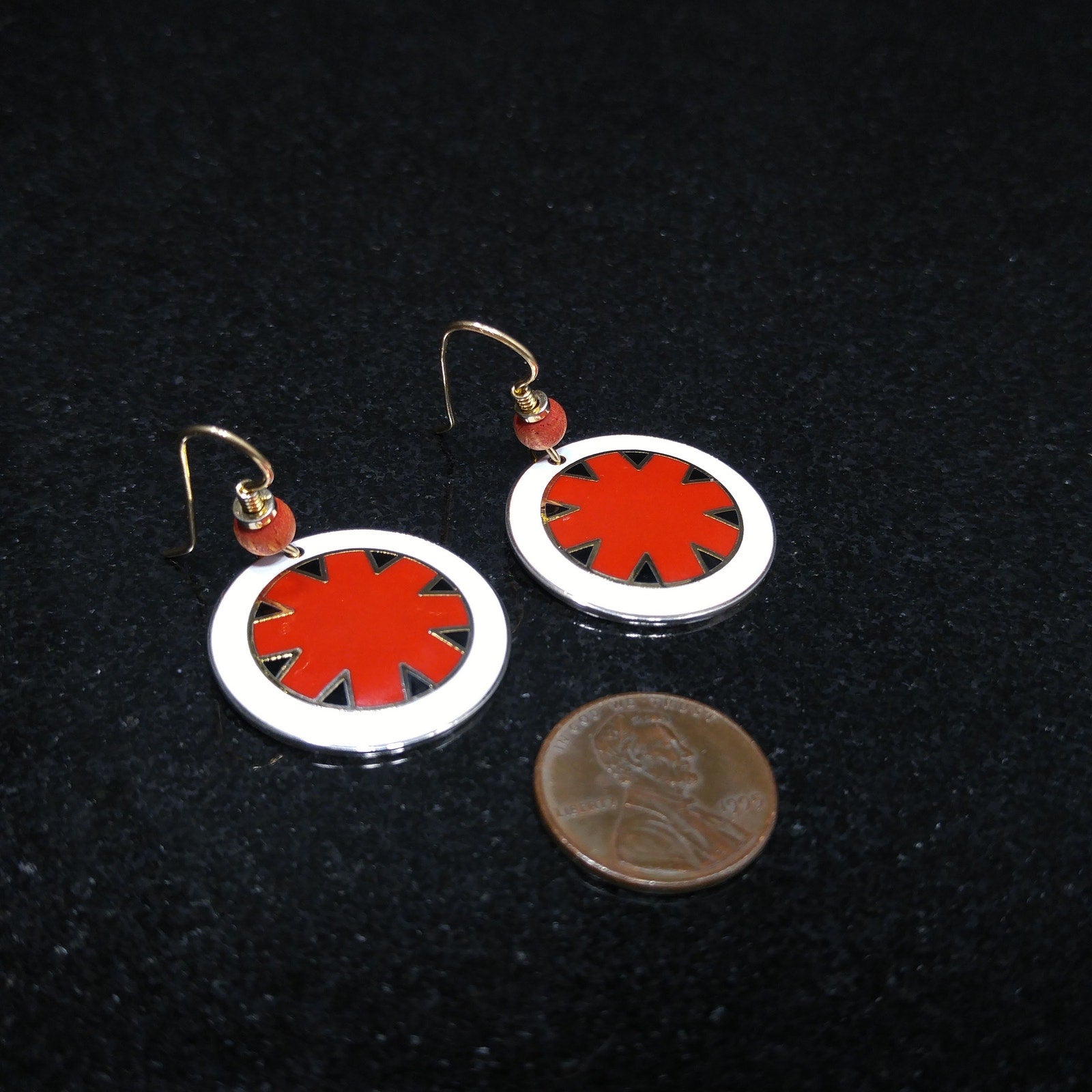 *Description: This is a beautiful pair of Laurel Burch earrings entitled "Myth" from the 1980s. This gold plated cloisonne pair of earrings have a red enamel center with geometric triangles in black and a white circle frame around the edges. The gold filled ear wires have a red wooden bead on the drop portion. This is a great pair of Laurel Burch earrings to wear with many outfits or give as a vintage gift.