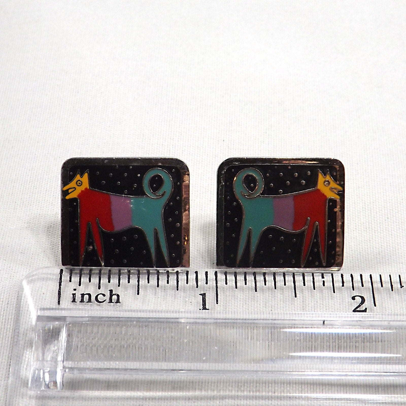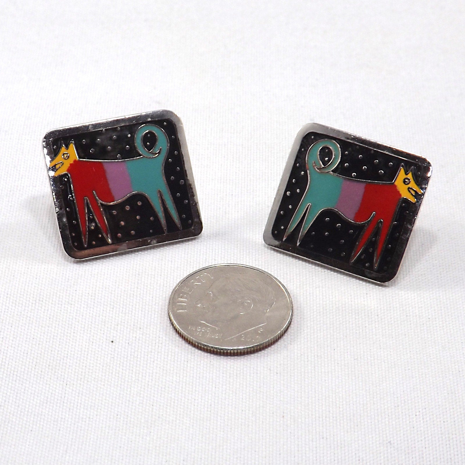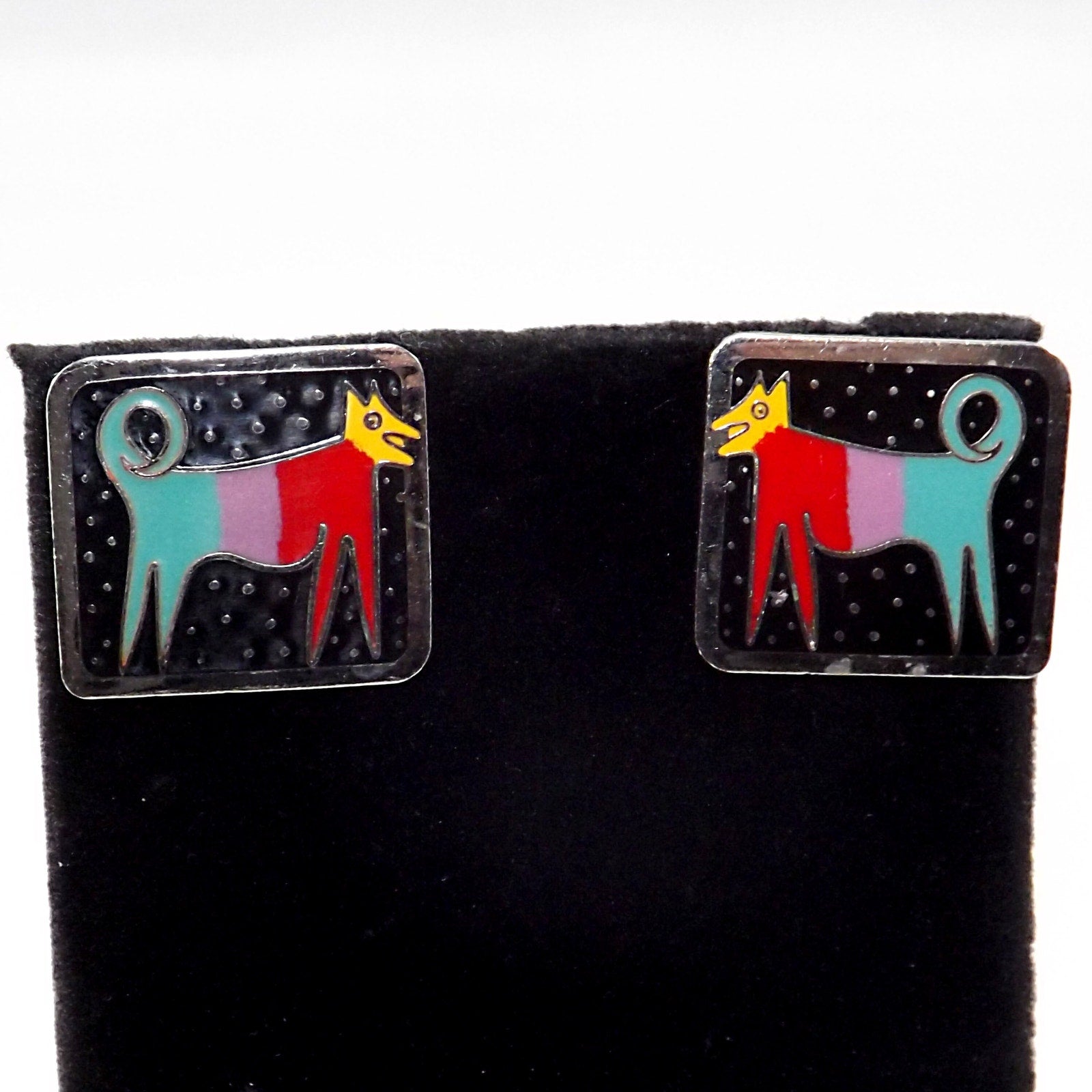 Vintage Laurel Burch "Night Dog" Post Earrings Cloisonne Enamel in Black Red Lavender Teal & Yellow Silver Tone 1980s Vintage Jewelry